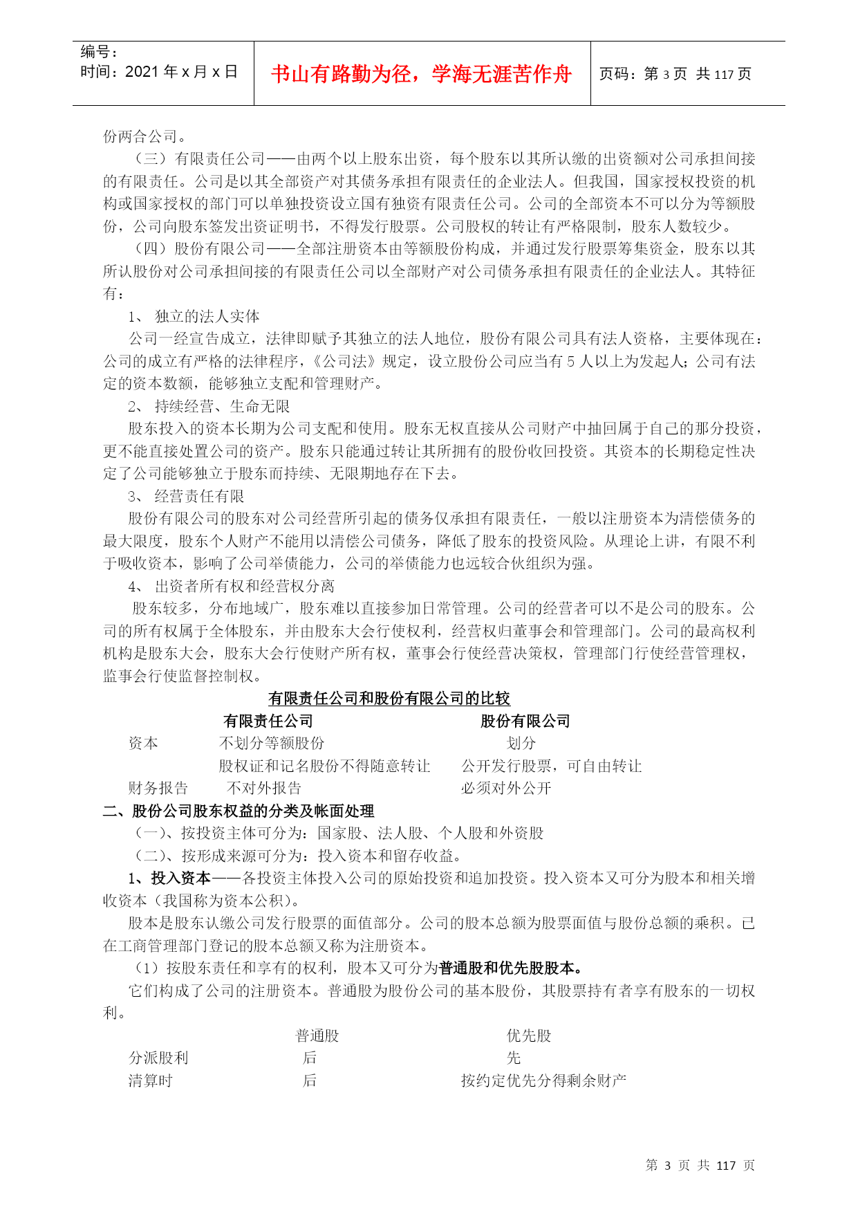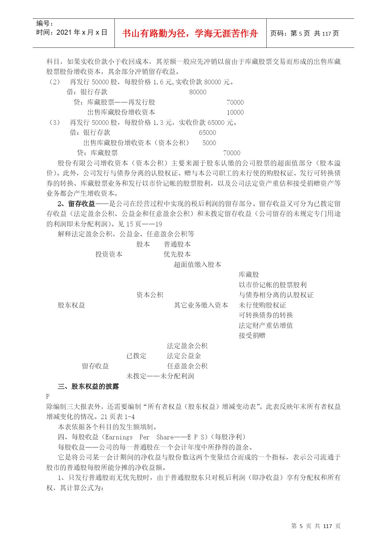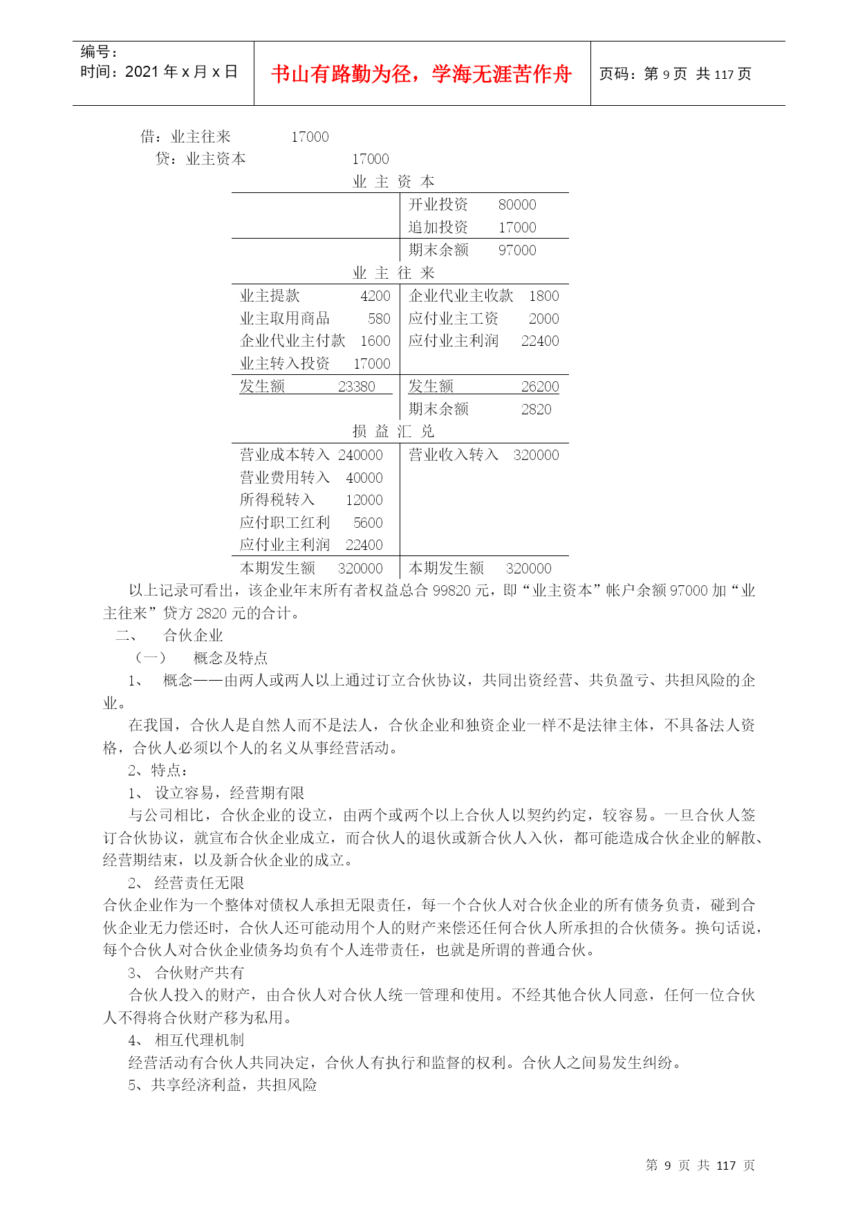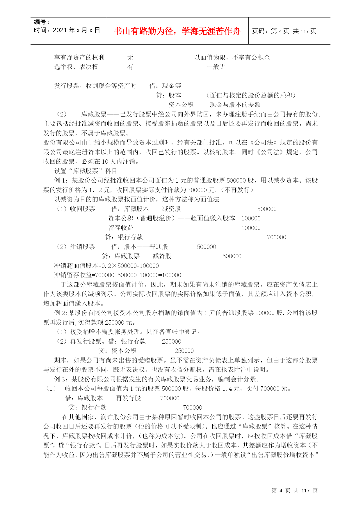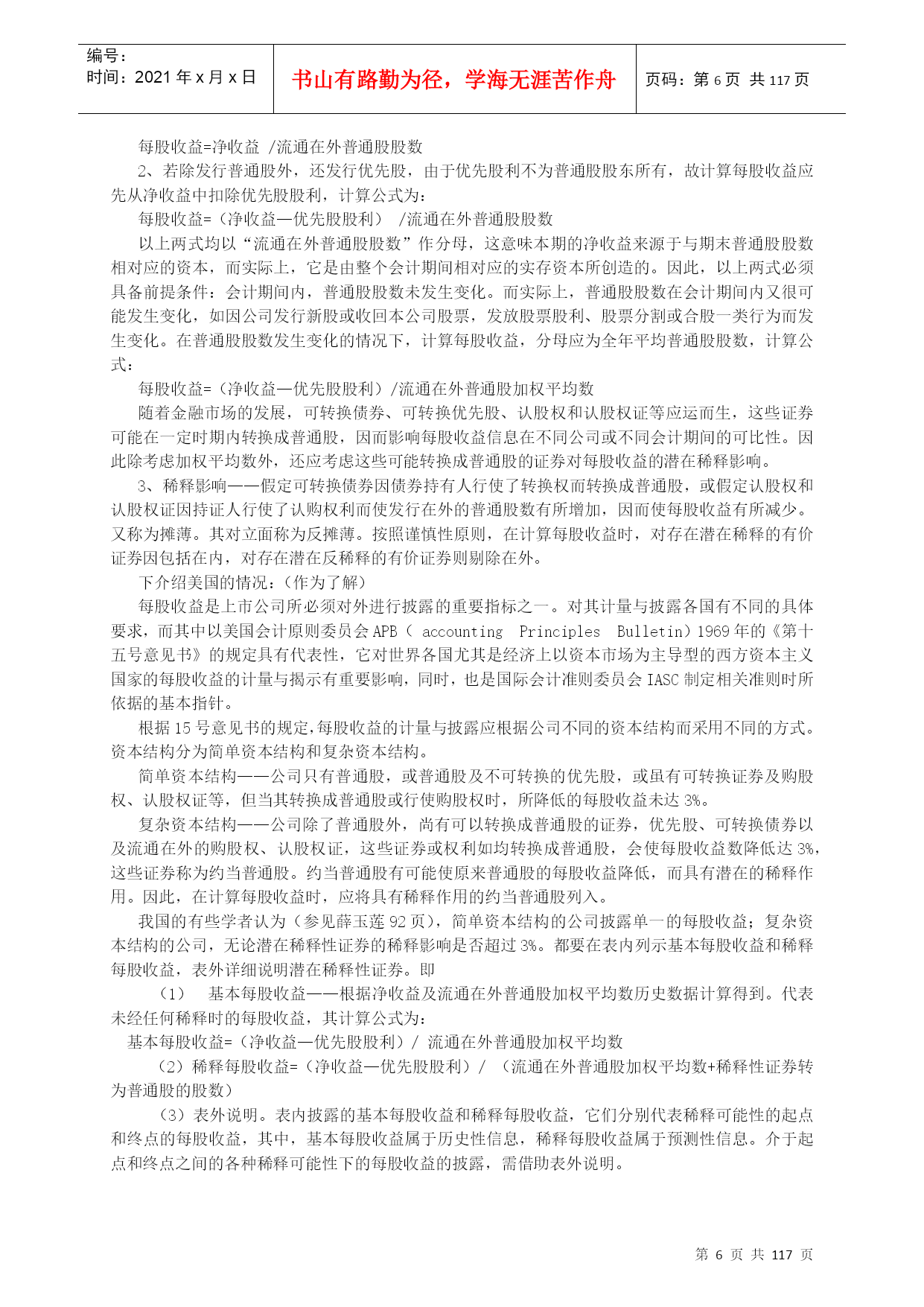 编号:时间:2021年x月x日书山有路勤为径,学海无涯苦作舟页码:第PAGE117页共NUMPAGES117页第PAGE\*MERGEFORMAT117页共NUMPAGES\*MERGEFORMAT117页高级财务会计讲义高级财务会计的产生限于20世纪40年代以前社会经济的规模和水平,国际经济交流发展的程度以及市场物价长期处于较为稳定的水平等条件,使得20世纪40年代后期所成型的财务会计的主体,一般为控制一定经济资源进行经济活动并独立进行会计核算的单一经济实体,资产的计价也是建立在币值不变的历史成本原则基础之上;又由于国际交流的局限性使会计核算的内容主要是国内生产经营活动,商品进出口业务的比重不大,因此,我们对当时成型的这种财务会计称为“一般财务会计”或“传统财务会计”——中级财务会计。二战后,特别是从20世纪60年代开始,由于西方世界科技技术领域取得的突破性进展,以及由此而带动的全球经济迅速发展,使世界经济环境发生了巨大的变化。股份公司的兴起和发展,使集团公司大量涌现,使财务会计的目标更主要地转向外部报告;国际贸易、国际投资、跨国经营迅速发展,西方国家不仅推行商品资本和货币资本的国际化,而且大规模实行生产资本的国际化,从而促使国际间贸易和投资的不断扩大,突破了企业经济活动以国内为主的特征,产生了大量的跨国公司,从而使国际金融市场也得以形成和发展;20世纪70年代西方国家和拉美各国经历了严重的通货膨胀,使得货币持续大幅贬值。当以传统财务会计理论和方法不足以核算和监督这些特殊会计业务充分提供必需的会计信息时,就要通过不断的会计实践和总结,建立新的会计理论和方法,因而使会计这一经济管理活动在传统财务会计的基础上进一步发展,产生了高级财务会计。高级财务会计是运用传统的财务会计理论与方法,对在新的经济条件下出现的一般财务会计中不予包括或不经常发生的企业特殊经济业务进行核算和监督,向与企业有经济利害关系着提供有用的决策会计信息的经济管理活动。从高级财务会计的产生可以看出,它主要是核算和监督那些在新的社会经济条件下出现的,传统财务会计中不予涉及或未广泛深入涉及的各种“特殊经济业务”。权益会计主要权益理论一主要的几种观点权益理论——解释权益的性质,说明对权益的不同认识,以及与之相联系的资本和利润不同概念的差异等等,一般视为权益理论。目前,主要有四种理论观点业主权益论(所有者权益论)产生与18世纪及以前的,以私有制和合伙企业为主导地位的经济环境中,企业经营以业主为中心,经营的目的在于为业主增加财富,追求利润最大化。企业的资产是业主所拥有的财产,企业负债是业主必须用资产清偿的义务;企业的任何收入或收益都是业主权益的增加,所有的费用(成本)开支,都是业主权益的减少,缴纳任何税金,包括交纳的所得税也都列作费用支出,减少业主权益。此理论认为所有者权益是“净资产”,是一个净财富概念,体现在会计等式是资产—负债=业主权益或所有者权益我国现行会计实物中,将发放股利认为是收益的分配,但是,支付债务利息和缴纳所得税,由于他们减少了所有者的财富而被认为是费用,以及投资核算中的权益法。这些观点就是基于上理论。主体论(以公司兴起为背景)认为企业是经营主体,企业与所有者是分离的,所有者与企业债权人同样是企业持续经营所需资本的提供者。企业经营的资产是企业本身的资产,企业持有法人财产权,企业经营的负债是企业本身的债务,都相对独立于所有者的个人财产;所有者不居于企业经营和权益的中心,只是与企业债权人一样,是权益持有人。此理论认为企业是具有自己独立人格的存在主体,在法律上对其资产持有法人财产权,在其持续经营过程中,实行自主经营和自负盈亏。其基本观点是:企业是所有权益持有人的权益监护人,企业对其权益负有经管责任(AccountabilIlty)。权益持有人所有人所得到的收益均应作为收益分配,包括债务利息和股利等。表现在资产负债表上是:资产=权益=负债+所有者权益企业论——社会论认为企业是为许多群体的利益而从事经营活动的社会机构。特拉凯(Drucker)最早提出,他认为,许多大企业是一个负有社会责任的机构。企业理论中的群体,不仅包括股东和债权人,而且包括雇员、客户、征税和管理机构以及一般的社会公众;因此,有人把广义的企业理论理解为会计的社会理论。企业既然是为群体的利益而从事经营活动,那么,企业就应当向所有构成群体的对象提供财务信息,而不是只给股东和债权人提供财务信息。基金论此理论认为会计的基础是一组特定来源和特定用途的一定资本或收入的经济活动领域,由于运用复式记帐,形成一套自行平衡的帐户体系。在这个经济活动领域中,拥有为未来服务潜力的经济资源即资产是中心,所有的权益都代表来自法律、合同、管理、财