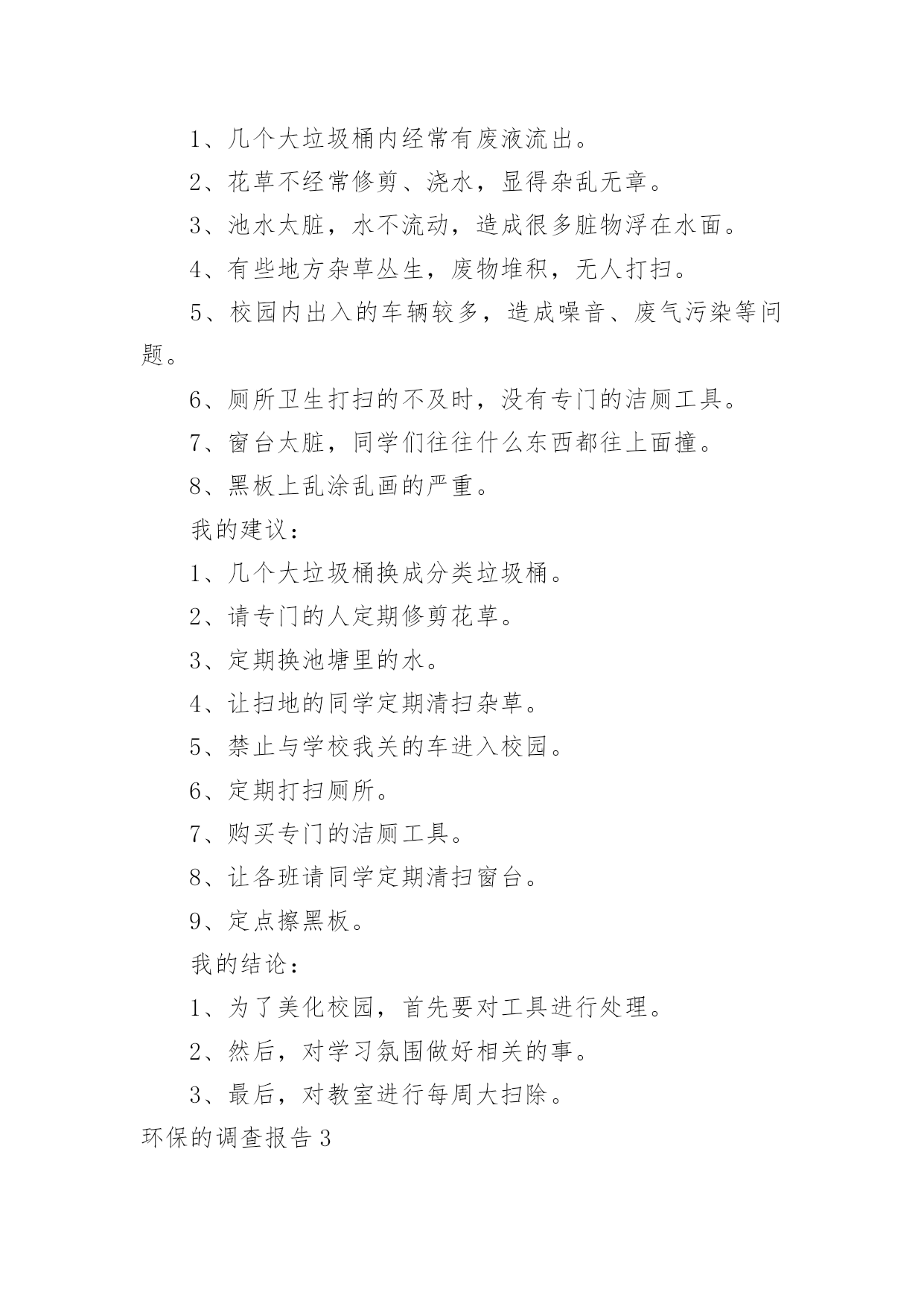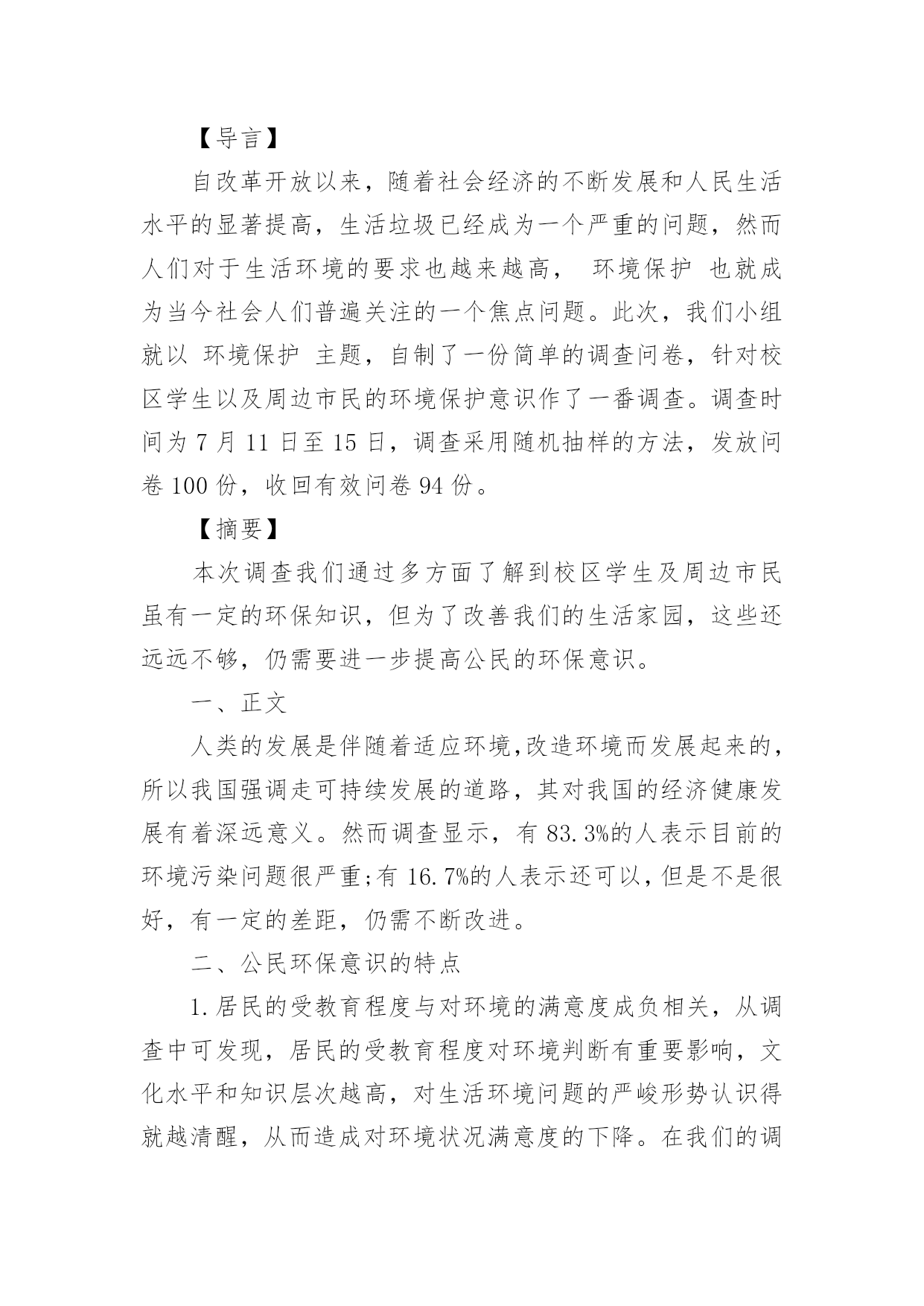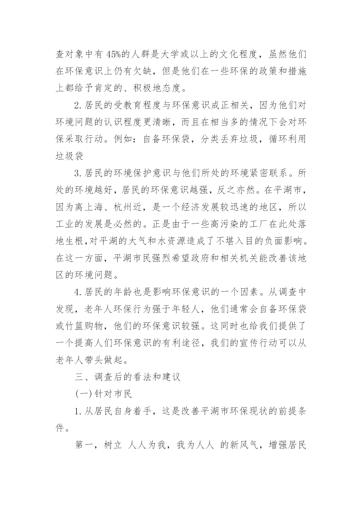 环保的调查报告环保的调查报告在当下社会,接触并使用报告的人越来越多,我们在写报告的时候要注意语言要准确、简洁。那么报告应该怎么写才合适呢?下面是小编为大家整理的环保的调查报告,希望能够帮助到大家。环保的调查报告1调查时间:20xx年xx月调查方法:电脑查阅资料和实地观察收集资料:中国有近14亿人口,城市的运转每年将产生上亿吨的垃圾。我省日前已出台城市生活垃圾处理新政,全面实行生活垃圾收集、处置。近百年来,由于煤炭和石油的使用,不知多少的黑烟毒气排入了空气之中,即使后来被电能和核能部分代替,但那些黑烟毒气并不是从此消失。一次性餐具、电池等不可再生物也不可避免地污染了我们赖以生存的家园。我们的家园本是绿色的,可现在却乌烟瘴气的,笼罩在废气之中。据数据看来:大众对环境保护还是很关注的,但是很多人并不明白保护环境的重大意义,认为乱扔垃圾这样的行为还不至于会对环境产生多大的影响。调查结果街道上形形色色的汽车在行驶着,汽车的尾气使呼吸不顺畅。有的人乱吐痰,使地上变得很脏。我的建议1、首先先要改变人们的观点,增强他们的环保意识。多组织宣传活动,对于年龄较小的孩子则可以举办环保知识有奖抢答活动,吊起孩子的积极性。2、组织学生利用周末空闲时间到街上捡垃圾,保持环境整洁,并且能起一个较好的带头作用。3、扩大绿化面积,防治大气污染。植物有过滤各种有害大气污染和净化空气的效果。4、减少污染物排放,强化节约能源,提高能源利用率,控制尾气排放等等。总结大自然赋予我们美丽的环境,是让我们去维护的,并不是让我们去破坏的。所以,我们要从我做起,从身边的小事做起,在平常的生活中注意节约自愿,回收废电池这类会污染环境的物品,做一个环保的有心人,多参加环保活动,种一棵树。保护我们的绿色家园是我们每一个人的责任和义务,我们中学生义不容辞!环保的调查报告2调查地点:校园调查时间:xx年xx月xx日根据老师的要求,我对校园的环境进行了调查。调查情况如下:1、几个大垃圾桶内经常有废液流出。2、花草不经常修剪、浇水,显得杂乱无章。3、池水太脏,水不流动,造成很多脏物浮在水面。4、有些地方杂草丛生,废物堆积,无人打扫。5、校园内出入的车辆较多,造成噪音、废气污染等问题。6、厕所卫生打扫的不及时,没有专门的洁厕工具。7、窗台太脏,同学们往往什么东西都往上面撞。8、黑板上乱涂乱画的严重。我的建议:1、几个大垃圾桶换成分类垃圾桶。2、请专门的人定期修剪花草。3、定期换池塘里的水。4、让扫地的同学定期清扫杂草。5、禁止与学校我关的车进入校园。6、定期打扫厕所。7、购买专门的洁厕工具。8、让各班请同学定期清扫窗台。9、定点擦黑板。我的结论:1、为了美化校园,首先要对工具进行处理。2、然后,对学习氛围做好相关的事。3、最后,对教室进行每周大扫除。环保的调查报告3【导言】自改革开放以来,随着社会经济的不断发展和人民生活水平的显著提高,生活垃圾已经成为一个严重的问题,然而人们对于生活环境的要求也越来越高,环境保护也就成为当今社会人们普遍关注的一个焦点问题。此次,我们小组就以环境保护主题,自制了一份简单的调查问卷,针对校区学生以及周边市民的环境保护意识作了一番调查。调查时间为7月11日至15日,调查采用随机抽样的方法,发放问卷100份,收回有效问卷94份。【摘要】本次调查我们通过多方面了解到校区学生及周边市民虽有一定的环保知识,但为了改善我们的生活家园,这些还远远不够,仍需要进一步提高公民的环保意识。一、正文人类的发展是伴随着适应环境,改造环境而发展起来的,所以我国强调走可持续发展的道路,其对我国的经济健康发展有着深远意义。然而调查显示,有83.3%的人表示目前的环境污染问题很严重;有16.7%的人表示还可以,但是不是很好,有一定的差距,仍需不断改进。二、公民环保意识的特点1.居民的受教育程度与对环境的满意度成负相关,从调查中可发现,居民的受教育程度对环境判断有重要影响,文化水平和知识层次越高,对生活环境问题的严峻形势认识得就越清醒,从而造成对环境状况满意度的下降。在我们的调查对象中有45%的人群是大学或以上的文化程度,虽然他们在环保意识上仍有欠缺,但是他们在一些环保的政策和措施上都给予肯定的、积极地态度。2.居民的受教育程度与环保意识成正相关,因为他们对环境问题的认识程度更清晰,而且在相当多的情况下会对环保采取行动。例如:自备环保袋,分类丢弃垃圾,循环利用垃圾袋3.居民的环境保护意识与他们所处的环境紧密联系。所处的环境越好,居民的环保意识越强,反之亦然。在平湖市,因为离上海、杭州近,是一个经济发展较迅速的地区,所以工业的发展是必然的。正是由于一些高污染的工厂在此处落地生根,对平湖的大气和水资源造成了不堪入目的负面影响。在这一方面,平湖市民强烈希望政府和相关机关能改善该地区的环境问题。4.居