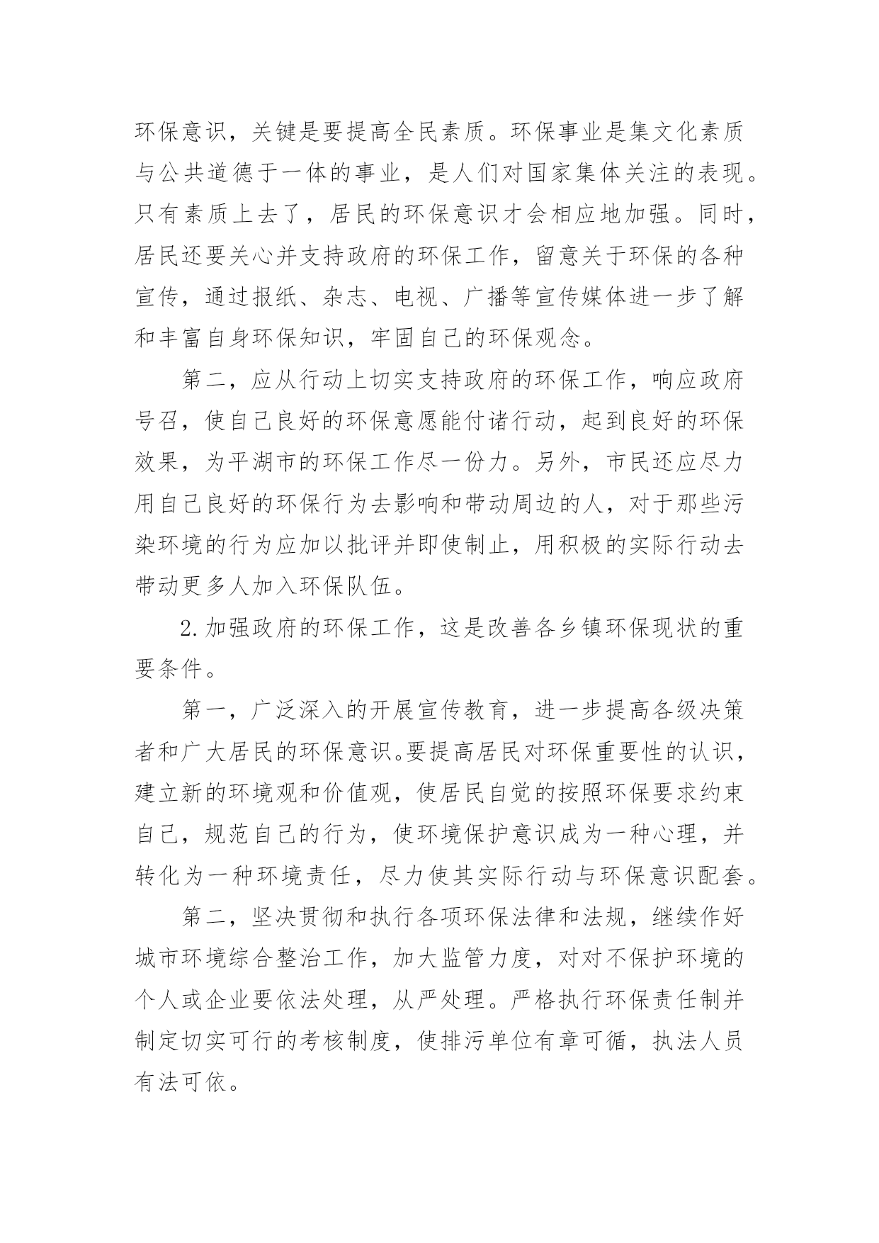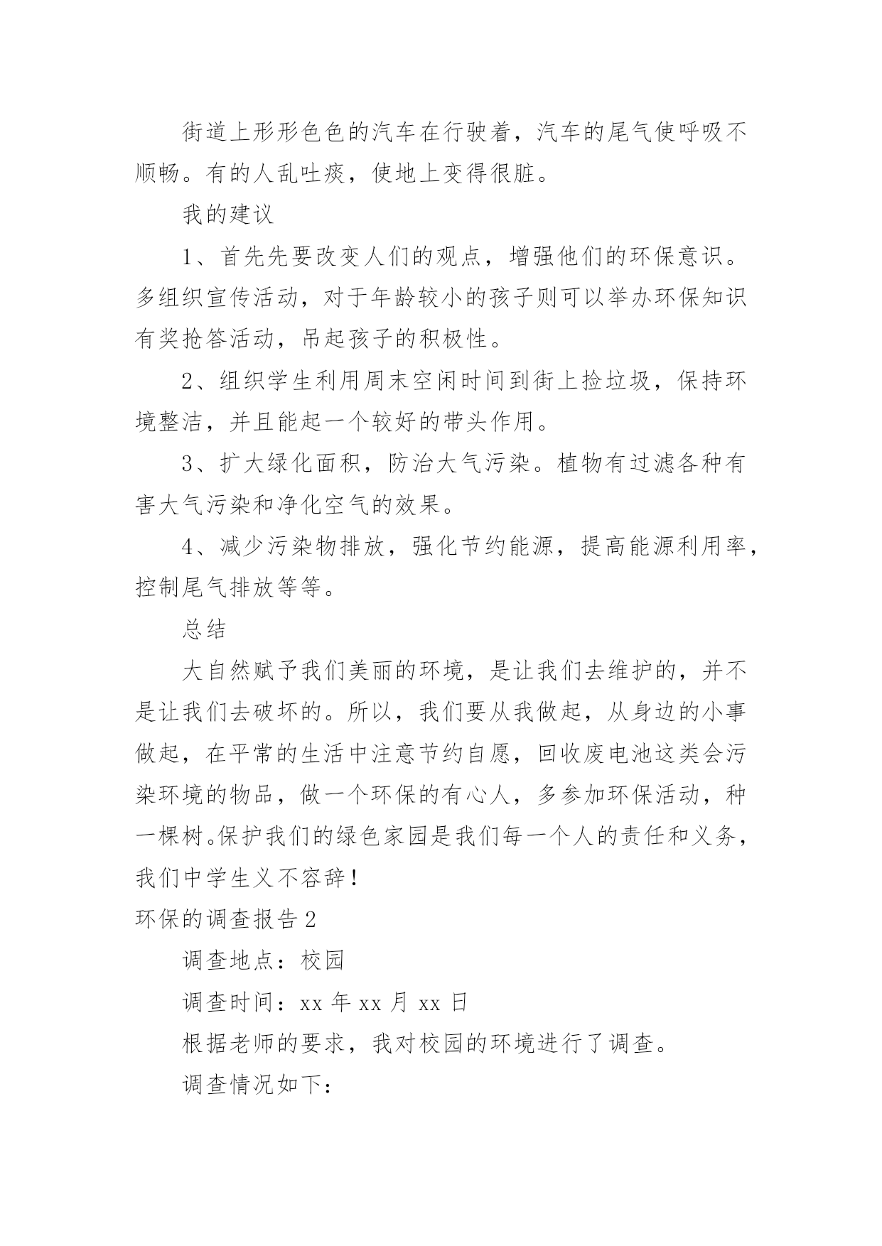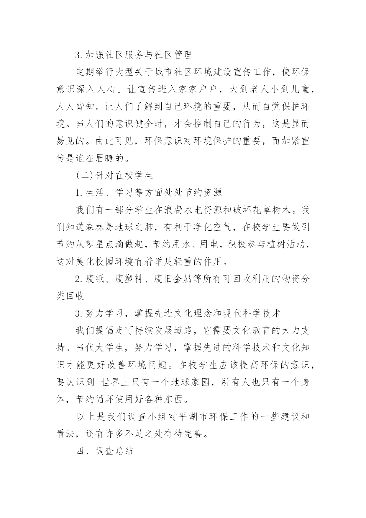 环保的调查报告环保的调查报告在当下社会,接触并使用报告的人越来越多,我们在写报告的时候要注意语言要准确、简洁。那么报告应该怎么写才合适呢?下面是小编为大家整理的环保的调查报告,希望能够帮助到大家。环保的调查报告1调查时间:20xx年xx月调查方法:电脑查阅资料和实地观察收集资料:中国有近14亿人口,城市的运转每年将产生上亿吨的垃圾。我省日前已出台城市生活垃圾处理新政,全面实行生活垃圾收集、处置。近百年来,由于煤炭和石油的使用,不知多少的黑烟毒气排入了空气之中,即使后来被电能和核能部分代替,但那些黑烟毒气并不是从此消失。一次性餐具、电池等不可再生物也不可避免地污染了我们赖以生存的家园。我们的家园本是绿色的,可现在却乌烟瘴气的,笼罩在废气之中。据数据看来:大众对环境保护还是很关注的,但是很多人并不明白保护环境的重大意义,认为乱扔垃圾这样的行为还不至于会对环境产生多大的影响。调查结果街道上形形色色的汽车在行驶着,汽车的尾气使呼吸不顺畅。有的人乱吐痰,使地上变得很脏。我的建议1、首先先要改变人们的观点,增强他们的环保意识。多组织宣传活动,对于年龄较小的孩子则可以举办环保知识有奖抢答活动,吊起孩子的积极性。2、组织学生利用周末空闲时间到街上捡垃圾,保持环境整洁,并且能起一个较好的带头作用。3、扩大绿化面积,防治大气污染。植物有过滤各种有害大气污染和净化空气的效果。4、减少污染物排放,强化节约能源,提高能源利用率,控制尾气排放等等。总结大自然赋予我们美丽的环境,是让我们去维护的,并不是让我们去破坏的。所以,我们要从我做起,从身边的小事做起,在平常的生活中注意节约自愿,回收废电池这类会污染环境的物品,做一个环保的有心人,多参加环保活动,种一棵树。保护我们的绿色家园是我们每一个人的责任和义务,我们中学生义不容辞!环保的调查报告2调查地点:校园调查时间:xx年xx月xx日根据老师的要求,我对校园的环境进行了调查。调查情况如下:1、几个大垃圾桶内经常有废液流出。2、花草不经常修剪、浇水,显得杂乱无章。3、池水太脏,水不流动,造成很多脏物浮在水面。4、有些地方杂草丛生,废物堆积,无人打扫。5、校园内出入的车辆较多,造成噪音、废气污染等问题。6、厕所卫生打扫的不及时,没有专门的洁厕工具。7、窗台太脏,同学们往往什么东西都往上面撞。8、黑板上乱涂乱画的严重。我的建议:1、几个大垃圾桶换成分类垃圾桶。2、请专门的人定期修剪花草。3、定期换池塘里的水。4、让扫地的同学定期清扫杂草。5、禁止与学校我关的车进入校园。6、定期打扫厕所。7、购买专门的洁厕工具。8、让各班请同学定期清扫窗台。9、定点擦黑板。我的结论:1、为了美化校园,首先要对工具进行处理。2、然后,对学习氛围做好相关的事。3、最后,对教室进行每周大扫除。环保的调查报告3【导言】自改革开放以来,随着社会经济的不断发展和人民生活水平的显著提高,生活垃圾已经成为一个严重的问题,然而人们对于生活环境的要求也越来越高,环境保护也就成为当今社会人们普遍关注的一个焦点问题。此次,我们小组就以环境保护主题,自制了一份简单的调查问卷,针对校区学生以及周边市民的环境保护意识作了一番调查。调查时间为7月11日至15日,调查采用随机抽样的方法,发放问卷100份,收回有效问卷94份。【摘要】本次调查我们通过多方面了解到校区学生及周边市民虽有一定的环保知识,但为了改善我们的生活家园,这些还远远不够,仍需要进一步提高公民的环保意识。一、正文人类的发展是伴随着适应环境,改造环境而发展起来的,所以我国强调走可持续发展的道路,其对我国的经济健康发展有着深远意义。然而调查显示,有83.3%的人表示目前的环境污染问题很严重;有16.7%的人表示还可以,但是不是很好,有一定的差距,仍需不断改进。二、公民环保意识的特点1.居民的受教育程度与对环境的满意度成负相关,从调查中可发现,居民的受教育程度对环境判断有重要影响,文化水平和知识层次越高,对生活环境问题的严峻形势认识得就越清醒,从而造成对环境状况满意度的下降。在我们的调查对象中有45%的人群是大学或以上的文化程度,虽然他们在环保意识上仍有欠缺,但是他们在一些环保的政策和措施上都给予肯定的、积极地态度。2.居民的受教育程度与环保意识成正相关,因为他们对环境问题的认识程度更清晰,而且在相当多的情况下会对环保采取行动。例如:自备环保袋,分类丢弃垃圾,循环利用垃圾袋3.居民的环境保护意识与他们所处的环境紧密联系。所处的环境越好,居民的环保意识越强,反之亦然。在平湖市,因为离上海、杭州近,是一个经济发展较迅速的地区,所以工业的发展是必然的。正是由于一些高污染的工厂在此处落地生根,对平湖的大气和水资源造成了不堪入目的负面影响。在这一方面,平湖市民强烈希望政府和相关机关能改善该地区的环境问题。4.居
