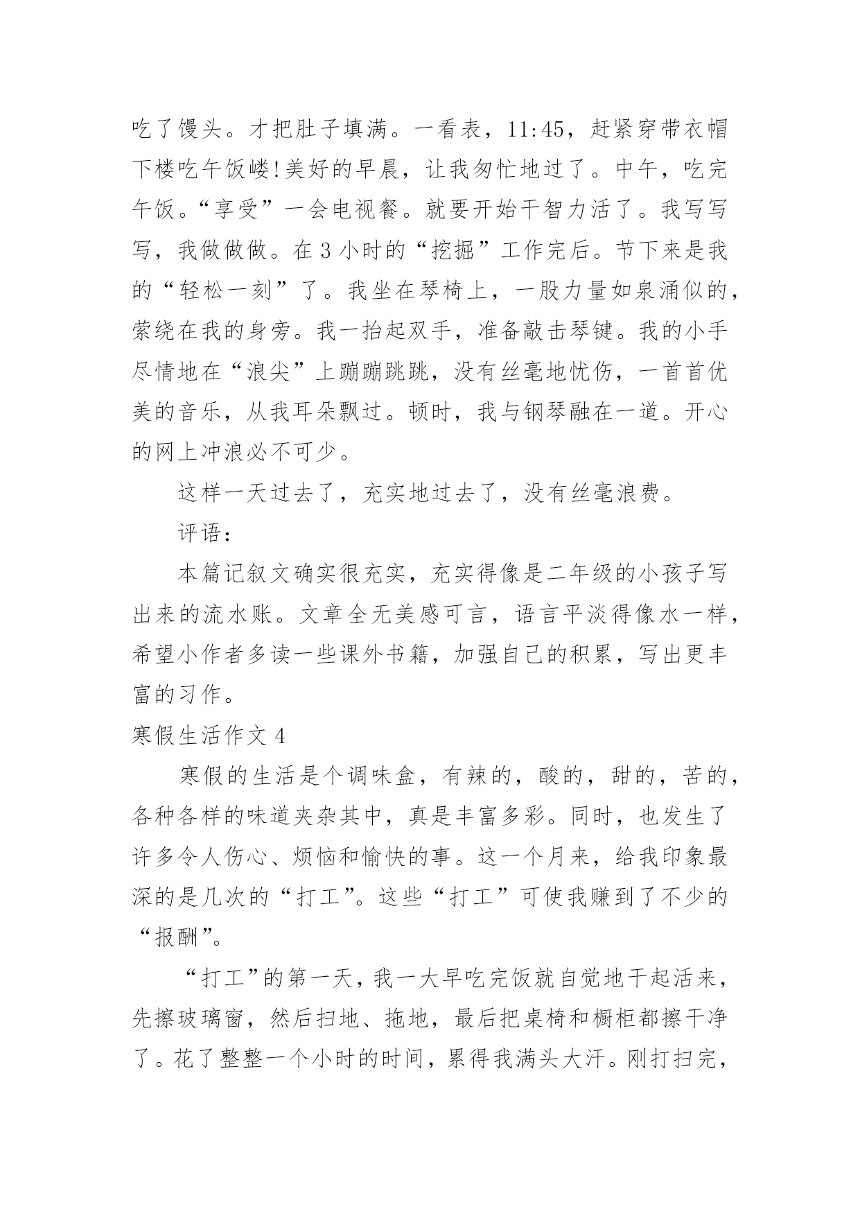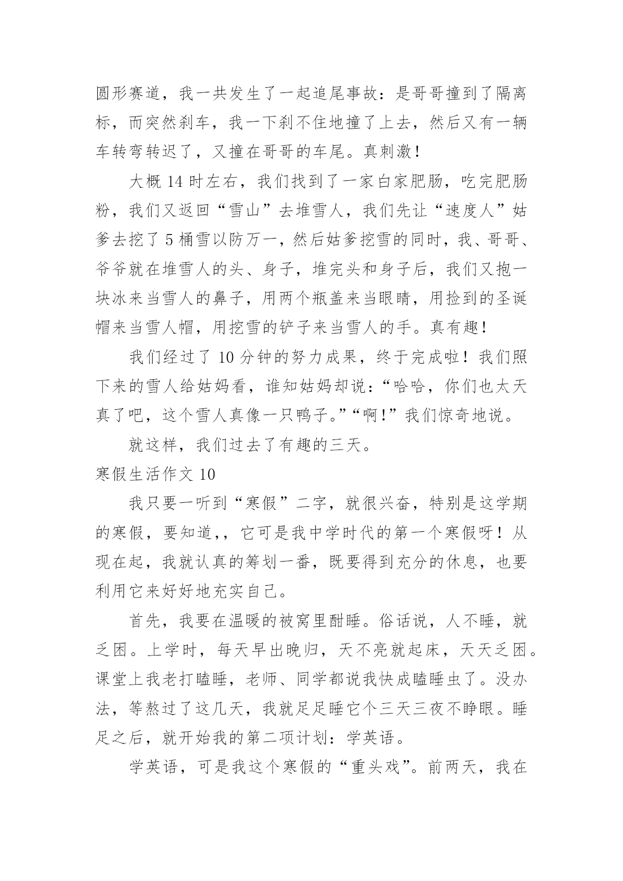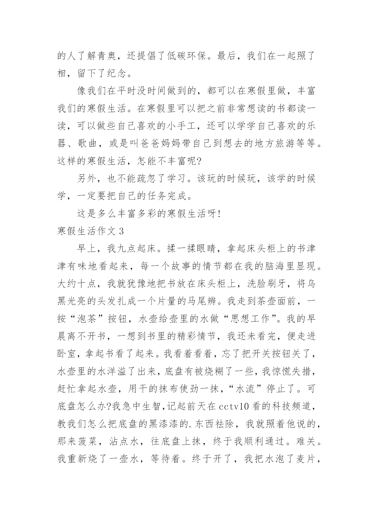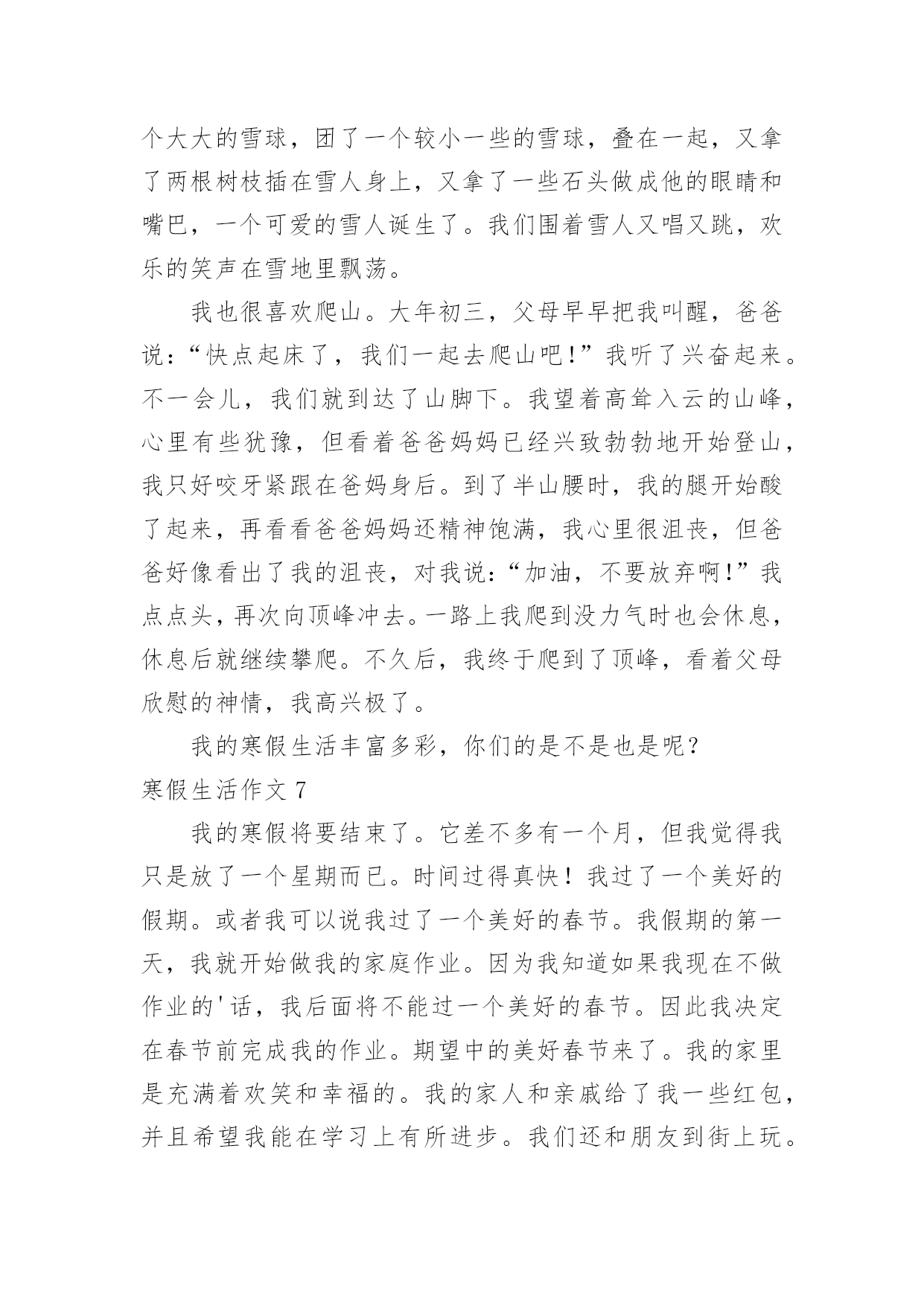 寒假生活作文寒假生活作文大全[15篇]在平时的学习、工作或生活中,许多人都有过写作文的经历,对作文都不陌生吧,借助作文人们可以反映客观事物、表达思想感情、传递知识信息。相信许多人会觉得作文很难写吧,下面是小编为大家收集的寒假生活作文,供大家参考借鉴,希望可以帮助到有需要的朋友。寒假生活作文1寒假期间,因为春节和其他原因我很开心。假期期间,我父母和我回到河北的乡下老家。我已经好几年没回去了,所以看到过去这些年这座小村庄发生的巨大变化我感到很惊讶。几乎村里的每一户人家都有彩电,有的还有了电脑。很多家庭都有了新建的或重建的房子。以前,老式瓦房随处可见,但是现在它们看上去完全是一幅新的'景象。摩托车或者甚至是私家车也已不再是奢侈品了。一位村民骄傲地告诉我他和其他一些村民跟团出国旅游了。以前,村民们一整年都忙于农活,但是现在它们有更多时间和钱去放松娱乐。旅游已经成为在村民当中已经成为一种新潮流了。看到这些惊人的变化,我爸爸说他一退休就想回到家乡。而我也强烈支持他的观点。我度过了一个很快乐的寒假,因为我不仅玩得开心,也完成了我的学习任务。众所周知,春节是寒假的重头戏,我们会花很多的时间去庆祝新年。因此,我首先要完成作业,这样才不会让它们影响我过节的快乐心情。我用一个星期完成了寒假作业,期间也和爸爸妈妈一起出去购物,我们买了很多东西,特别是零食和水果。接下来,就是过春节了,我们吃了一顿丰盛的年夜饭。爸爸妈妈制作这顿大餐,而我只能帮忙打下手。年夜饭很好吃,我吃得很饱。接下来的几天,我们和亲人朋友互相串门拜年,有时候也一起出去游玩,我们小孩子是最兴奋的。现在,寒假马上就要结束了,我也要去上学了。度过了一个这么快乐而充实的假期让我很开心。寒假生活作文2一个学期的努力学习,同学们都有些疲倦。但期末考试之后,迎来了这个同学们期盼已久的寒假。寒假的生活是丰富多彩的。其中最有趣的活动就属过春节了。辞旧迎新,家家户户放鞭炮、吃饺子或是全家团圆在家里温温馨馨和和睦睦地一起看春节晚会……孩子们牵着大人的手,一蹦一跳地跟着大人们串门,还装模作样地磕头,要红包。我也不例外。这春节过得好不热闹!在寒假里,我参加了社会里、家里或学校里的很多有趣的'活动,也从中受益。例如有一天,我和妹妹在家玩了穿针的游戏,练习了我的专注能力。我还做了环保手抄报和小制作,提倡低碳环保。在家里,我还经常帮助做一些力所能及的家务……多么丰富多彩的假期!学校组织了寒假假日小队。同学们商量来商量去,总算凑在了一天,来到了公园。我们在街上分发传单,鼓励更多的人了解青奥,还提倡了低碳环保。最后,我们在一起照了相,留下了纪念。像我们在平时没时间做到的,都可以在寒假里做,丰富我们的寒假生活。在寒假里可以把之前非常想读的书都读一读,可以做些自己喜欢的小手工,还可以学学自己喜欢的乐器、歌曲,或是叫爸爸妈妈带自己到想去的地方旅游等等。这样的寒假生活,怎能不丰富呢?另外,也不能疏忽了学习。该玩的时候玩,该学的时候学,一定要把自己的任务完成。这是多么丰富多彩的寒假生活呀!寒假生活作文3早上,我九点起床。揉一揉眼睛,拿起床头柜上的书津津有味地看起来,每一个故事的情节都在我的脑海里显现。大约十点,我就犹豫地把书放在床头柜上,洗脸刷牙,将乌黑光亮的头发扎成一个片量的马尾辨。我走到茶壶面前,一按“泡茶”按钮,水壶给壶里的水做“思想工作”。我的早晨离不开书,一想到书里的精彩情节,我还未看完,便走进卧室,拿起书看了起来。我看着看着,忘了把开关按钮关了,水壶里的水洋溢了出来,底盘有被烧糊了一些,我惊慌失措,赶忙拿起水壶,用干的抹布使劲一抹,“水流”停止了。可底盘怎么办?我急中生智,记起前天在cctv10看的科技频道,教我们怎么把底盘的黑漆漆的.东西祛除,我就照着他说的,那来菠菜,沾点水,往底盘上抹,终于我顺利通过。难关。我重新烧了一壶水,等待着。终于开了,我把水泡了麦片,吃了馒头。才把肚子填满。一看表,11:45,赶紧穿带衣帽下楼吃午饭嵝!美好的早晨,让我匆忙地过了。中午,吃完午饭。“享受”一会电视餐。就要开始干智力活了。我写写写,我做做做。在3小时的“挖掘”工作完后。节下来是我的“轻松一刻”了。我坐在琴椅上,一股力量如泉涌似的,萦绕在我的身旁。我一抬起双手,准备敲击琴键。我的小手尽情地在“浪尖”上蹦蹦跳跳,没有丝毫地忧伤,一首首优美的音乐,从我耳朵飘过。顿时,我与钢琴融在一道。开心的网上冲浪必不可少。这样一天过去了,充实地过去了,没有丝毫浪费。评语:本篇记叙文确实很充实,充实得像是二年级的小孩子写出来的流水账。文章全无美感可言,语言平淡得像水一样,希望小作者多读一些课外书籍,加强自己的积累,写出更丰富的习作。寒假生活作文4寒假的生活是个调味盒,有辣的,酸的,甜的,苦的,各种各样的味道夹杂其中,真是丰富多彩。同时,也发生了