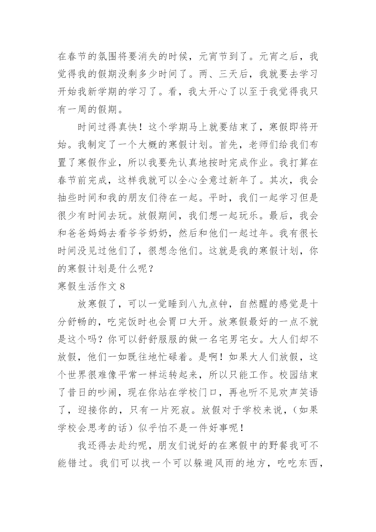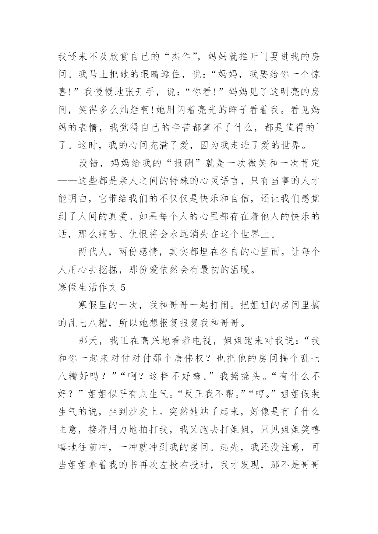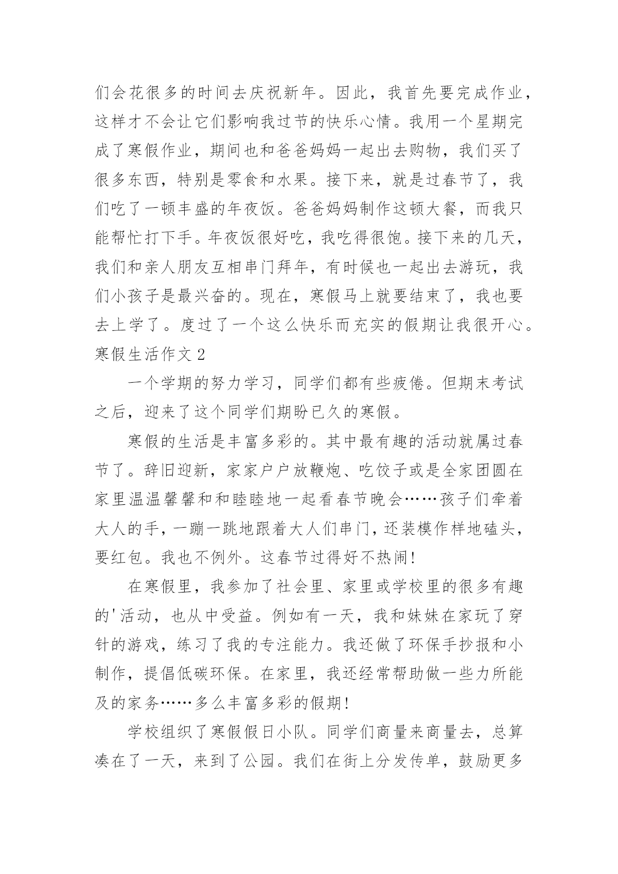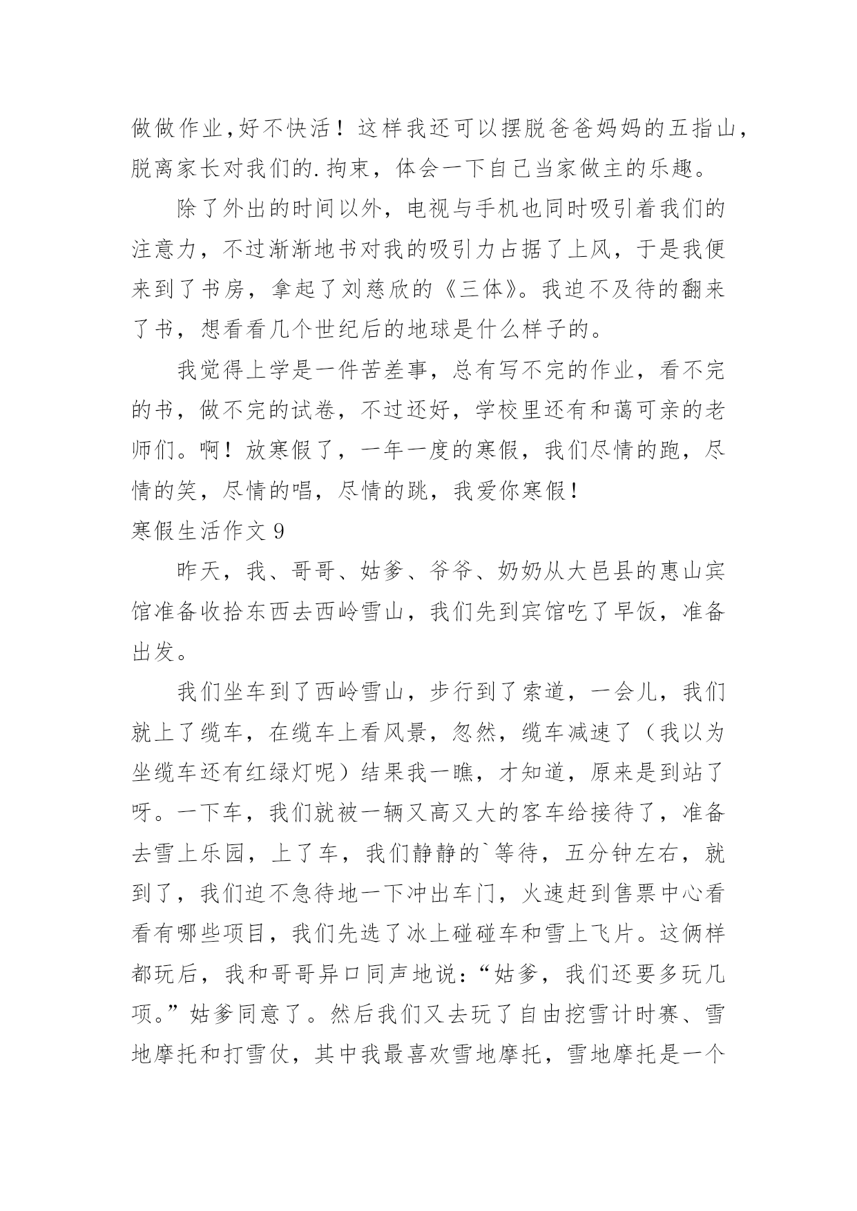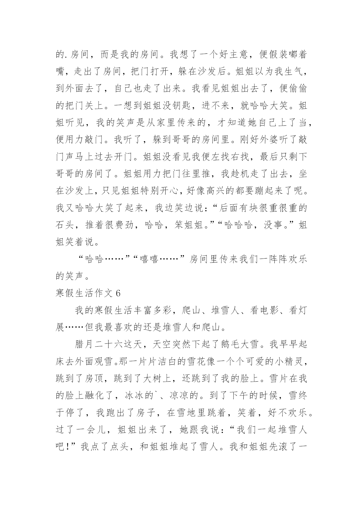 寒假生活作文寒假生活作文大全[15篇]在平时的学习、工作或生活中,许多人都有过写作文的经历,对作文都不陌生吧,借助作文人们可以反映客观事物、表达思想感情、传递知识信息。相信许多人会觉得作文很难写吧,下面是小编为大家收集的寒假生活作文,供大家参考借鉴,希望可以帮助到有需要的朋友。寒假生活作文1寒假期间,因为春节和其他原因我很开心。假期期间,我父母和我回到河北的乡下老家。我已经好几年没回去了,所以看到过去这些年这座小村庄发生的巨大变化我感到很惊讶。几乎村里的每一户人家都有彩电,有的还有了电脑。很多家庭都有了新建的或重建的房子。以前,老式瓦房随处可见,但是现在它们看上去完全是一幅新的'景象。摩托车或者甚至是私家车也已不再是奢侈品了。一位村民骄傲地告诉我他和其他一些村民跟团出国旅游了。以前,村民们一整年都忙于农活,但是现在它们有更多时间和钱去放松娱乐。旅游已经成为在村民当中已经成为一种新潮流了。看到这些惊人的变化,我爸爸说他一退休就想回到家乡。而我也强烈支持他的观点。我度过了一个很快乐的寒假,因为我不仅玩得开心,也完成了我的学习任务。众所周知,春节是寒假的重头戏,我们会花很多的时间去庆祝新年。因此,我首先要完成作业,这样才不会让它们影响我过节的快乐心情。我用一个星期完成了寒假作业,期间也和爸爸妈妈一起出去购物,我们买了很多东西,特别是零食和水果。接下来,就是过春节了,我们吃了一顿丰盛的年夜饭。爸爸妈妈制作这顿大餐,而我只能帮忙打下手。年夜饭很好吃,我吃得很饱。接下来的几天,我们和亲人朋友互相串门拜年,有时候也一起出去游玩,我们小孩子是最兴奋的。现在,寒假马上就要结束了,我也要去上学了。度过了一个这么快乐而充实的假期让我很开心。寒假生活作文2一个学期的努力学习,同学们都有些疲倦。但期末考试之后,迎来了这个同学们期盼已久的寒假。寒假的生活是丰富多彩的。其中最有趣的活动就属过春节了。辞旧迎新,家家户户放鞭炮、吃饺子或是全家团圆在家里温温馨馨和和睦睦地一起看春节晚会……孩子们牵着大人的手,一蹦一跳地跟着大人们串门,还装模作样地磕头,要红包。我也不例外。这春节过得好不热闹!在寒假里,我参加了社会里、家里或学校里的很多有趣的'活动,也从中受益。例如有一天,我和妹妹在家玩了穿针的游戏,练习了我的专注能力。我还做了环保手抄报和小制作,提倡低碳环保。在家里,我还经常帮助做一些力所能及的家务……多么丰富多彩的假期!学校组织了寒假假日小队。同学们商量来商量去,总算凑在了一天,来到了公园。我们在街上分发传单,鼓励更多的人了解青奥,还提倡了低碳环保。最后,我们在一起照了相,留下了纪念。像我们在平时没时间做到的,都可以在寒假里做,丰富我们的寒假生活。在寒假里可以把之前非常想读的书都读一读,可以做些自己喜欢的小手工,还可以学学自己喜欢的乐器、歌曲,或是叫爸爸妈妈带自己到想去的地方旅游等等。这样的寒假生活,怎能不丰富呢?另外,也不能疏忽了学习。该玩的时候玩,该学的时候学,一定要把自己的任务完成。这是多么丰富多彩的寒假生活呀!寒假生活作文3早上,我九点起床。揉一揉眼睛,拿起床头柜上的书津津有味地看起来,每一个故事的情节都在我的脑海里显现。大约十点,我就犹豫地把书放在床头柜上,洗脸刷牙,将乌黑光亮的头发扎成一个片量的马尾辨。我走到茶壶面前,一按“泡茶”按钮,水壶给壶里的水做“思想工作”。我的早晨离不开书,一想到书里的精彩情节,我还未看完,便走进卧室,拿起书看了起来。我看着看着,忘了把开关按钮关了,水壶里的水洋溢了出来,底盘有被烧糊了一些,我惊慌失措,赶忙拿起水壶,用干的抹布使劲一抹,“水流”停止了。可底盘怎么办?我急中生智,记起前天在cctv10看的科技频道,教我们怎么把底盘的黑漆漆的.东西祛除,我就照着他说的,那来菠菜,沾点水,往底盘上抹,终于我顺利通过。难关。我重新烧了一壶水,等待着。终于开了,我把水泡了麦片,吃了馒头。才把肚子填满。一看表,11:45,赶紧穿带衣帽下楼吃午饭嵝!美好的早晨,让我匆忙地过了。中午,吃完午饭。“享受”一会电视餐。就要开始干智力活了。我写写写,我做做做。在3小时的“挖掘”工作完后。节下来是我的“轻松一刻”了。我坐在琴椅上,一股力量如泉涌似的,萦绕在我的身旁。我一抬起双手,准备敲击琴键。我的小手尽情地在“浪尖”上蹦蹦跳跳,没有丝毫地忧伤,一首首优美的音乐,从我耳朵飘过。顿时,我与钢琴融在一道。开心的网上冲浪必不可少。这样一天过去了,充实地过去了,没有丝毫浪费。评语:本篇记叙文确实很充实,充实得像是二年级的小孩子写出来的流水账。文章全无美感可言,语言平淡得像水一样,希望小作者多读一些课外书籍,加强自己的积累,写出更丰富的习作。寒假生活作文4寒假的生活是个调味盒,有辣的,酸的,甜的,苦的,各种各样的味道夹杂其中,真是丰富多彩。同时,也发生了