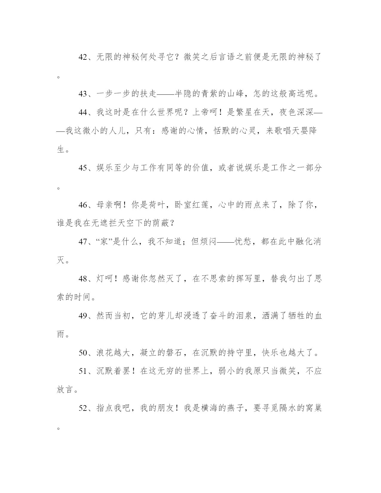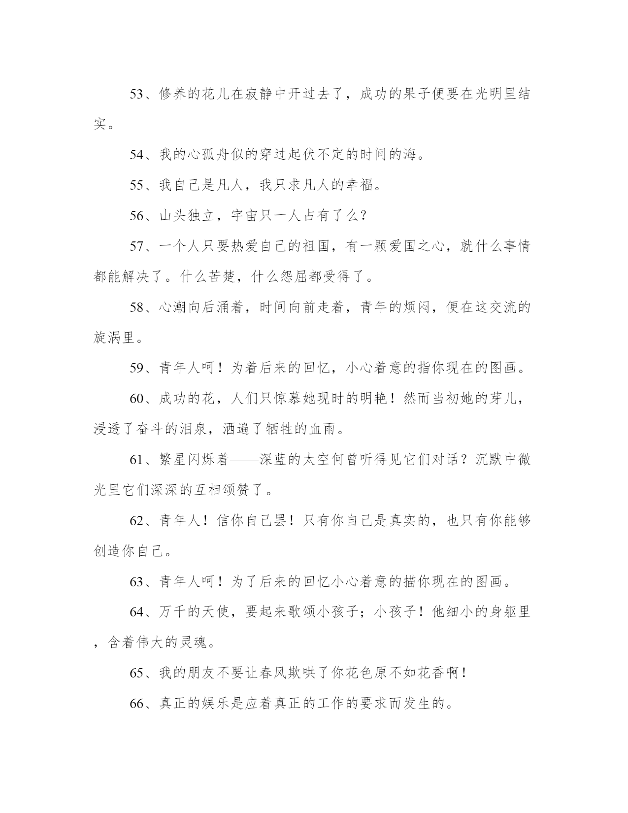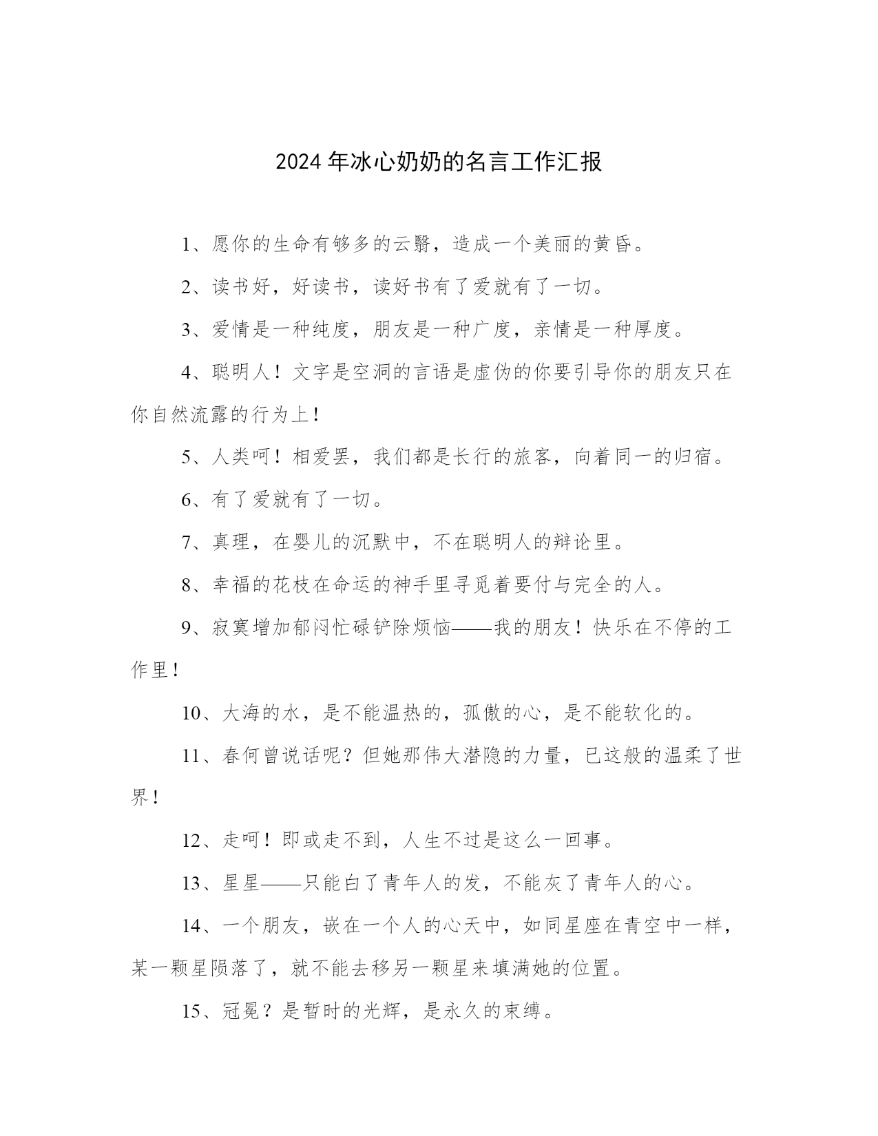 2024年冰心奶奶的名言工作汇报1、愿你的生命有够多的云翳,造成一个美丽的黄昏。2、读书好,好读书,读好书有了爱就有了一切。3、爱情是一种纯度,朋友是一种广度,亲情是一种厚度。4、聪明人!文字是空洞的言语是虚伪的你要引导你的朋友只在你自然流露的行为上!5、人类呵!相爱罢,我们都是长行的旅客,向着同一的归宿。6、有了爱就有了一切。7、真理,在婴儿的沉默中,不在聪明人的辩论里。8、幸福的花枝在命运的神手里寻觅着要付与完全的人。9、寂寞增加郁闷忙碌铲除烦恼——我的朋友!快乐在不停的工作里!10、大海的水,是不能温热的,孤傲的心,是不能软化的。11、春何曾说话呢?但她那伟大潜隐的力量,已这般的温柔了世界!12、走呵!即或走不到,人生不过是这么一回事。13、星星——只能白了青年人的发,不能灰了青年人的心。14、一个朋友,嵌在一个人的心天中,如同星座在青空中一样,某一颗星陨落了,就不能去移另一颗星来填满她的位置。15、冠冕?是暂时的光辉,是永久的束缚。16、世界上若没有女人,这世界至少要失去十分之五的真、十分之六的善、十分之七的美。17、墙角的花!你孤芳自赏时天地便小了。18、生命从八十岁开始。19、红墙衰草上的夕阳呵!快些落下去罢你使许多的青年人颓老了!20、我的问题——我的心在光明中沉默不答。我的梦却在黑暗里替我解明了!21、高峻的山颠深阔的海上——是冰冷的心是热烈的泪可怜微小的人呵!22、家么?我不知道,但烦闷一一忧愁,都在此中融化消灭。23、母亲呵!这零碎的篇儿,你能看一看么?这些字,在没有我以前,已隐藏在你的心怀里。24、父亲呵!我怎样的爱你,也怎样爱你的海。25、青年人,珍重的描写罢,时间正翻着书页,请你着笔!26、只是一颗孤星罢了!在无边的黑暗里已写尽了宇宙的寂寞。27、沉默着罢!在这无穷的世界上弱小的我原只当微笑不应放言。28、世界上充满了光和爱,等着青年自己去找,不要走那条悲惨的道路!29、我们要感谢生命,在痛苦中,我们也要感谢生命,因为快乐、兴奋、痛苦又何尝不是美丽呢?30、青年人!你不能像风般飞扬,便应当像山般静止。31、无精打彩的娱乐,绝不能使人生润泽,事业进步。娱乐至少与工作有同等的价值,或者说娱乐是工作之一部分!32、成功之花,人们往往惊慕它现时的明艳,然而当初,它的芽儿却浸透了奋斗的泪泉,洒满了牺牲的血雨。33、浪花愈大,凝立的磐石在沉默的持守里,快乐也愈大。34、先驱者!你要为众生开辟前途呵束紧了你的心带罢!35、假如生命是乏味的,我怕有来生!假如生命是有趣的,今生已是满足的了。36、爱在左,情在右,走在生命路的两旁,随时撒种,随时开花,将这一径长途点缀得香花弥漫,使穿枝拂叶的行人,踏着荆棘,不觉痛苦;有泪可落,也不觉是悲哀。37、青春活泼的心,决不作悲哀的留滞。38、愿你的生命中有够多的云翳,来造成一个美丽的黄昏。39、片片的云影,也似零碎的思想么,然而难将记忆的本儿,将他写起。40、当我浮云般自来自去的时候真觉得宇宙太寂寞了!41、白的花胜似绿的叶,浓的酒不如淡的茶。42、无限的神秘何处寻它?微笑之后言语之前便是无限的神秘了。43、一步一步的扶走——半隐的青紫的山峰,怎的这般高远呢。44、我这时是在什么世界呢?上帝呵!是繁星在天,夜色深深——我这微小的人儿,只有:感谢的心情,恬默的心灵,来歌唱天婴降生。45、娱乐至少与工作有同等的价值,或者说娱乐是工作之一部分。46、母亲啊!你是荷叶,卧室红莲,心中的雨点来了,除了你,谁是我在无遮拦天空下的荫蔽?47、“家”是什么,我不知道;但烦闷——忧愁,都在此中融化消灭。48、灯呵!感谢你忽然灭了,在不思索的挥写里,替我匀出了思索的时间。49、然而当初,它的芽儿却浸透了奋斗的泪泉,洒满了牺牲的血雨。50、浪花越大,凝立的磐石,在沉默的持守里,快乐也越大了。51、沉默着罢!在这无穷的世界上,弱小的我原只当微笑,不应放言。52、指点我吧,我的朋友!我是横海的燕子,要寻觅隔水的窝巢。53、修养的花儿在寂静中开过去了,成功的果子便要在光明里结实。54、我的心孤舟似的穿过起伏不定的时间的海。55、我自己是凡人,我只求凡人的幸福。56、山头独立,宇宙只一人占有了么?57、一个人只要热爱自己的祖国,有一颗爱国之心,就什么事情都能解决了。什么苦楚,什么怨屈都受得了。58、心潮向后涌着,时间向前走着,青年的烦闷,便在这交流的旋涡里。59、青年人呵!为着后来的回忆,小心着意的指你现在的图画。60、成功的花,人们只惊慕她现时的明艳!然而当初她的芽儿,浸透了奋斗的泪泉,洒遍了牺牲的血雨。61、繁星闪烁着——深蓝的太空何曾听得见它们对话?沉默中微光里它们深深的互相颂赞了