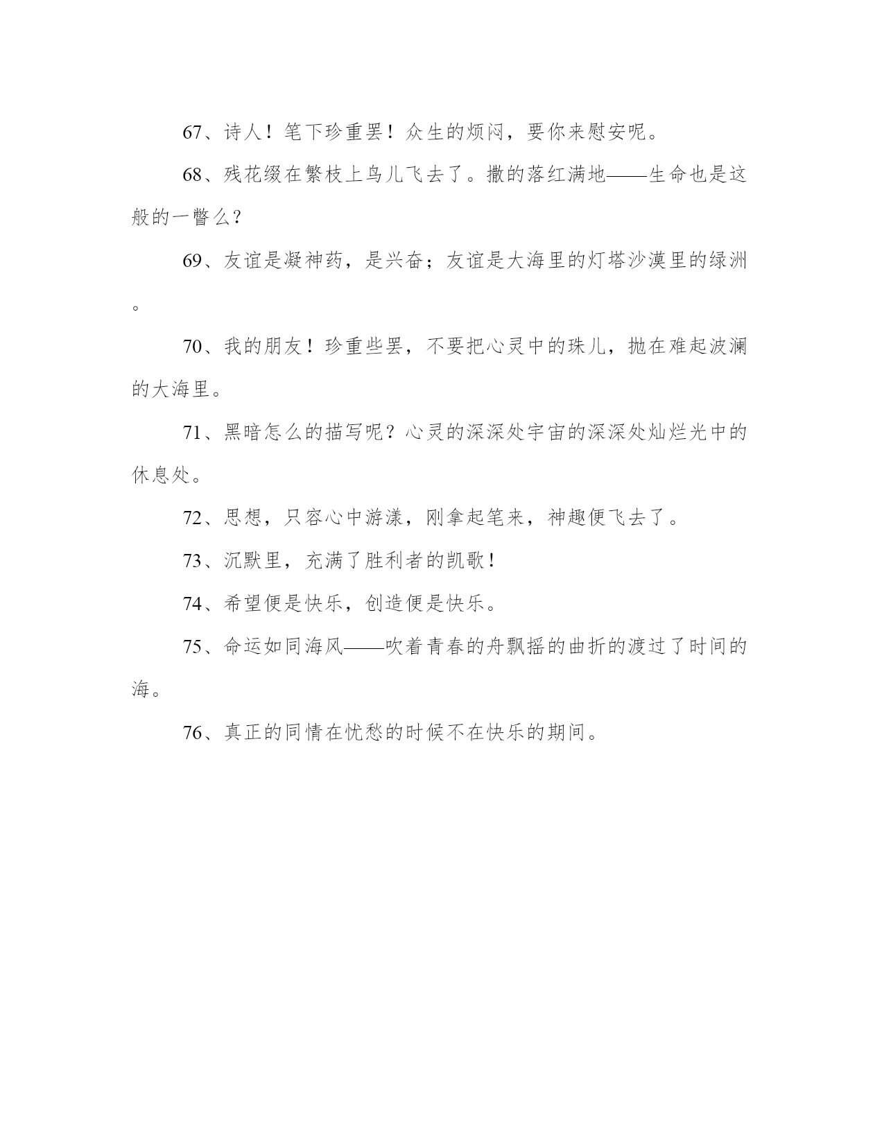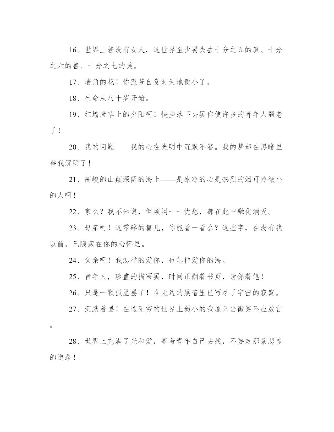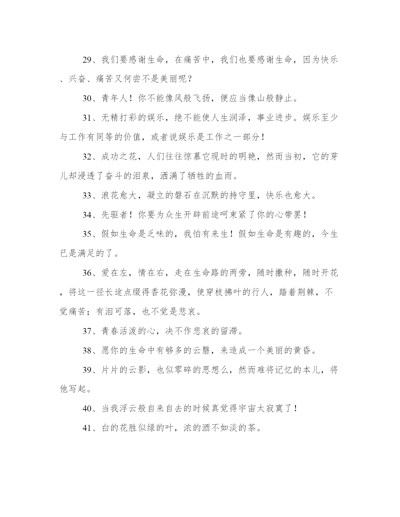 2024年冰心奶奶的名言工作汇报1、愿你的生命有够多的云翳,造成一个美丽的黄昏。2、读书好,好读书,读好书有了爱就有了一切。3、爱情是一种纯度,朋友是一种广度,亲情是一种厚度。4、聪明人!文字是空洞的言语是虚伪的你要引导你的朋友只在你自然流露的行为上!5、人类呵!相爱罢,我们都是长行的旅客,向着同一的归宿。6、有了爱就有了一切。7、真理,在婴儿的沉默中,不在聪明人的辩论里。8、幸福的花枝在命运的神手里寻觅着要付与完全的人。9、寂寞增加郁闷忙碌铲除烦恼——我的朋友!快乐在不停的工作里!10、大海的水,是不能温热的,孤傲的心,是不能软化的。11、春何曾说话呢?但她那伟大潜隐的力量,已这般的温柔了世界!12、走呵!即或走不到,人生不过是这么一回事。13、星星——只能白了青年人的发,不能灰了青年人的心。14、一个朋友,嵌在一个人的心天中,如同星座在青空中一样,某一颗星陨落了,就不能去移另一颗星来填满她的位置。15、冠冕?是暂时的光辉,是永久的束缚。16、世界上若没有女人,这世界至少要失去十分之五的真、十分之六的善、十分之七的美。17、墙角的花!你孤芳自赏时天地便小了。18、生命从八十岁开始。19、红墙衰草上的夕阳呵!快些落下去罢你使许多的青年人颓老了!20、我的问题——我的心在光明中沉默不答。我的梦却在黑暗里替我解明了!21、高峻的山颠深阔的海上——是冰冷的心是热烈的泪可怜微小的人呵!22、家么?我不知道,但烦闷一一忧愁,都在此中融化消灭。23、母亲呵!这零碎的篇儿,你能看一看么?这些字,在没有我以前,已隐藏在你的心怀里。24、父亲呵!我怎样的爱你,也怎样爱你的海。25、青年人,珍重的描写罢,时间正翻着书页,请你着笔!26、只是一颗孤星罢了!在无边的黑暗里已写尽了宇宙的寂寞。27、沉默着罢!在这无穷的世界上弱小的我原只当微笑不应放言。28、世界上充满了光和爱,等着青年自己去找,不要走那条悲惨的道路!29、我们要感谢生命,在痛苦中,我们也要感谢生命,因为快乐、兴奋、痛苦又何尝不是美丽呢?30、青年人!你不能像风般飞扬,便应当像山般静止。31、无精打彩的娱乐,绝不能使人生润泽,事业进步。娱乐至少与工作有同等的价值,或者说娱乐是工作之一部分!32、成功之花,人们往往惊慕它现时的明艳,然而当初,它的芽儿却浸透了奋斗的泪泉,洒满了牺牲的血雨。33、浪花愈大,凝立的磐石在沉默的持守里,快乐也愈大。34、先驱者!你要为众生开辟前途呵束紧了你的心带罢!35、假如生命是乏味的,我怕有来生!假如生命是有趣的,今生已是满足的了。36、爱在左,情在右,走在生命路的两旁,随时撒种,随时开花,将这一径长途点缀得香花弥漫,使穿枝拂叶的行人,踏着荆棘,不觉痛苦;有泪可落,也不觉是悲哀。37、青春活泼的心,决不作悲哀的留滞。38、愿你的生命中有够多的云翳,来造成一个美丽的黄昏。39、片片的云影,也似零碎的思想么,然而难将记忆的本儿,将他写起。40、当我浮云般自来自去的时候真觉得宇宙太寂寞了!41、白的花胜似绿的叶,浓的酒不如淡的茶。42、无限的神秘何处寻它?微笑之后言语之前便是无限的神秘了。43、一步一步的扶走——半隐的青紫的山峰,怎的这般高远呢。44、我这时是在什么世界呢?上帝呵!是繁星在天,夜色深深——我这微小的人儿,只有:感谢的心情,恬默的心灵,来歌唱天婴降生。45、娱乐至少与工作有同等的价值,或者说娱乐是工作之一部分。46、母亲啊!你是荷叶,卧室红莲,心中的雨点来了,除了你,谁是我在无遮拦天空下的荫蔽?47、“家”是什么,我不知道;但烦闷——忧愁,都在此中融化消灭。48、灯呵!感谢你忽然灭了,在不思索的挥写里,替我匀出了思索的时间。49、然而当初,它的芽儿却浸透了奋斗的泪泉,洒满了牺牲的血雨。50、浪花越大,凝立的磐石,在沉默的持守里,快乐也越大了。51、沉默着罢!在这无穷的世界上,弱小的我原只当微笑,不应放言。52、指点我吧,我的朋友!我是横海的燕子,要寻觅隔水的窝巢。53、修养的花儿在寂静中开过去了,成功的果子便要在光明里结实。54、我的心孤舟似的穿过起伏不定的时间的海。55、我自己是凡人,我只求凡人的幸福。56、山头独立,宇宙只一人占有了么?57、一个人只要热爱自己的祖国,有一颗爱国之心,就什么事情都能解决了。什么苦楚,什么怨屈都受得了。58、心潮向后涌着,时间向前走着,青年的烦闷,便在这交流的旋涡里。59、青年人呵!为着后来的回忆,小心着意的指你现在的图画。60、成功的花,人们只惊慕她现时的明艳!然而当初她的芽儿,浸透了奋斗的泪泉,洒遍了牺牲的血雨。61、繁星闪烁着——深蓝的太空何曾听得见它们对话?沉默中微光里它们深深的互相颂赞了