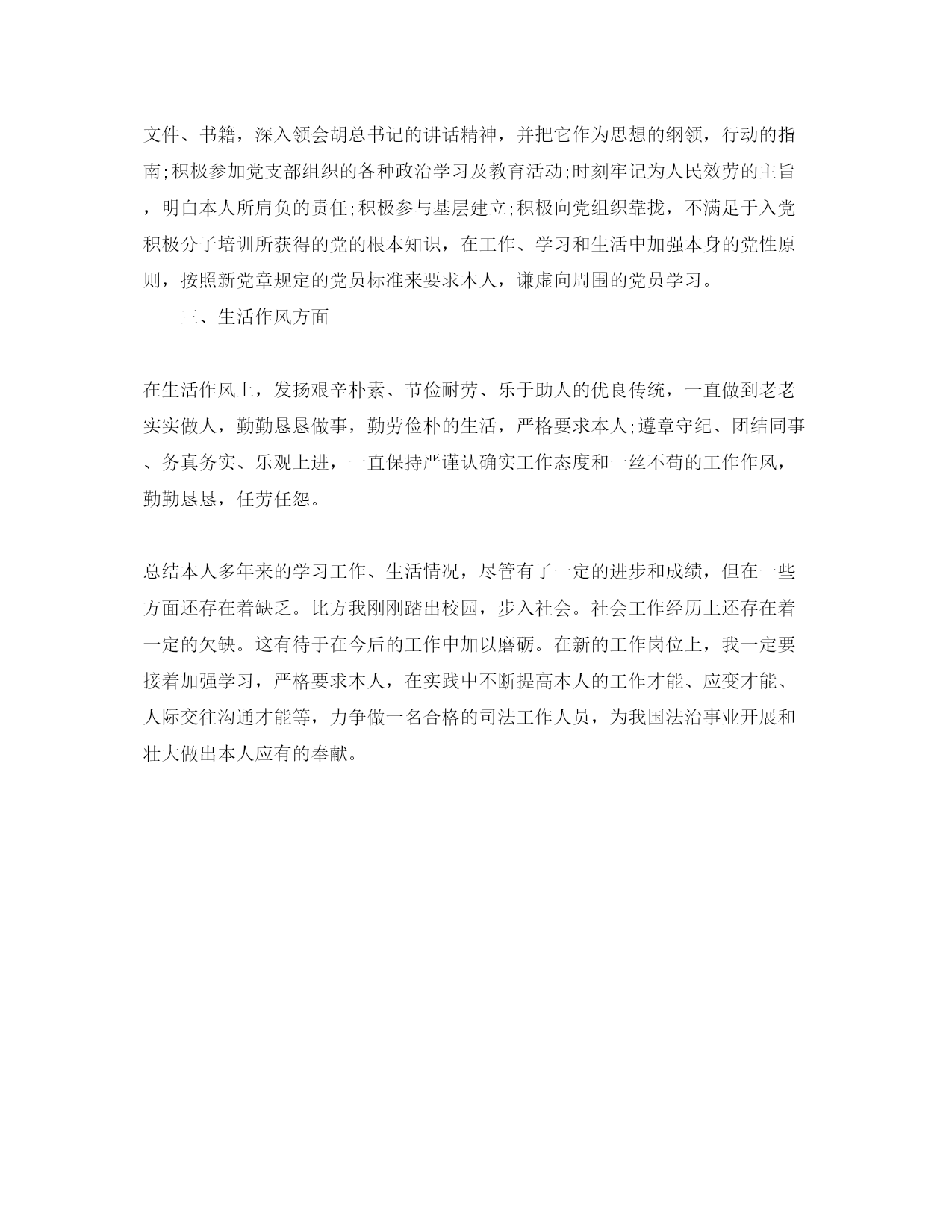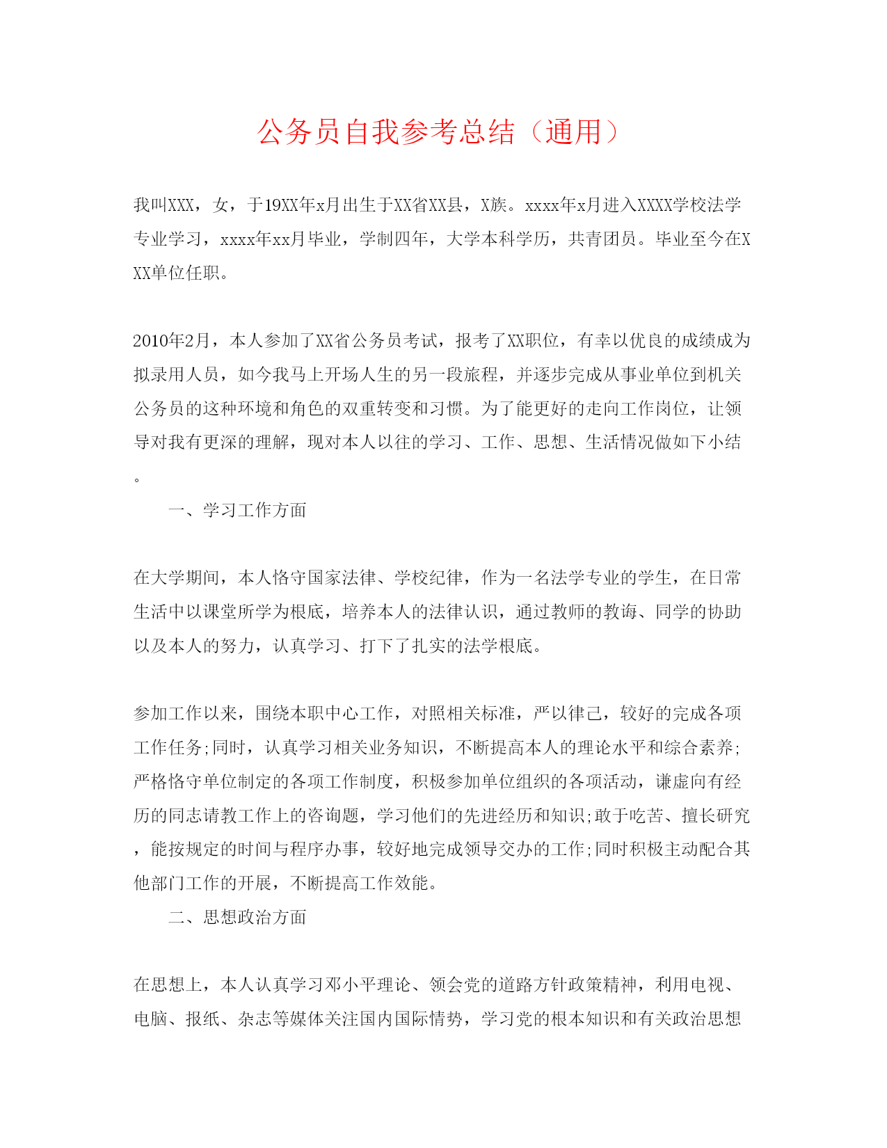 公务员自我参考总结(通用)我叫XXX,女,于19XX年x月出生于XX省XX县,X族。xxxx年x月进入XXXX学校法学专业学习,xxxx年xx月毕业,学制四年,大学本科学历,共青团员。毕业至今在XXX单位任职。2010年2月,本人参加了XX省公务员考试,报考了XX职位,有幸以优良的成绩成为拟录用人员,如今我马上开场人生的另一段旅程,并逐步完成从事业单位到机关公务员的这种环境和角色的双重转变和习惯。为了能更好的走向工作岗位,让领导对我有更深的理解,现对本人以往的学习、工作、思想、生活情况做如下小结。一、学习工作方面在大学期间,本人恪守国家法律、学校纪律,作为一名法学专业的学生,在日常生活中以课堂所学为根底,培养本人的法律认识,通过教师的教诲、同学的协助以及本人的努力,认真学习、打下了扎实的法学根底。参加工作以来,围绕本职中心工作,对照相关标准,严以律己,较好的完成各项工作任务;同时,认真学习相关业务知识,不断提高本人的理论水平和综合素养;严格恪守单位制定的各项工作制度,积极参加单位组织的各项活动,谦虚向有经历的同志请教工作上的咨询题,学习他们的先进经历和知识;敢于吃苦、擅长研究,能按规定的时间与程序办事,较好地完成领导交办的工作;同时积极主动配合其他部门工作的开展,不断提高工作效能。二、思想政治方面在思想上,本人认真学习邓小平理论、领会党的道路方针政策精神,利用电视、电脑、报纸、杂志等媒体关注国内国际情势,学习党的根本知识和有关政治思想文件、书籍,深入领会胡总书记的讲话精神,并把它作为思想的纲领,行动的指南;积极参加党支部组织的各种政治学习及教育活动;时刻牢记为人民效劳的主旨,明白本人所肩负的责任;积极参与基层建立;积极向党组织靠拢,不满足于入党积极分子培训所获得的党的根本知识,在工作、学习和生活中加强本身的党性原则,按照新党章规定的党员标准来要求本人,谦虚向周围的党员学习。三、生活作风方面在生活作风上,发扬艰辛朴素、节俭耐劳、乐于助人的优良传统,一直做到老老实实做人,勤勤恳恳做事,勤劳俭朴的生活,严格要求本人;遵章守纪、团结同事、务真务实、乐观上进,一直保持严谨认确实工作态度和一丝不苟的工作作风,勤勤恳恳,任劳任怨。总结本人多年来的学习工作、生活情况,尽管有了一定的进步和成绩,但在一些方面还存在着缺乏。比方我刚刚踏出校园,步入社会。社会工作经历上还存在着一定的欠缺。这有待于在今后的工作中加以磨砺。在新的工作岗位上,我一定要接着加强学习,严格要求本人,在实践中不断提高本人的工作才能、应变才能、人际交往沟通才能等,力争做一名合格的司法工作人员,为我国法治事业开展和壮大做出本人应有的奉献。