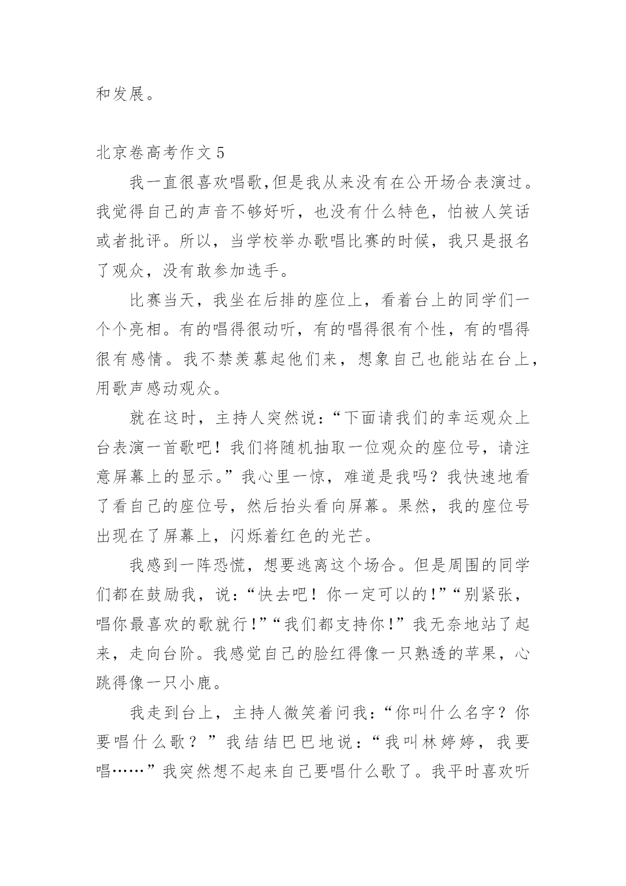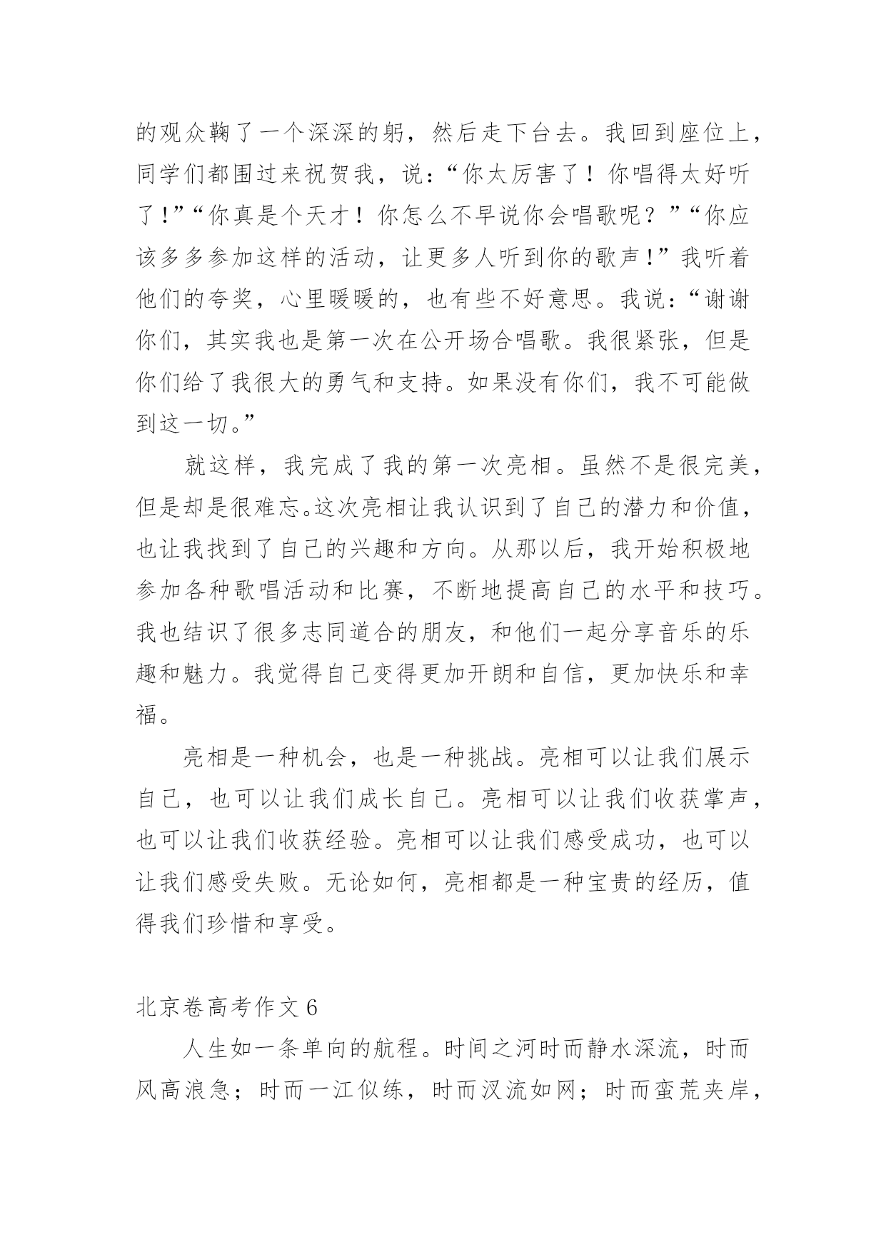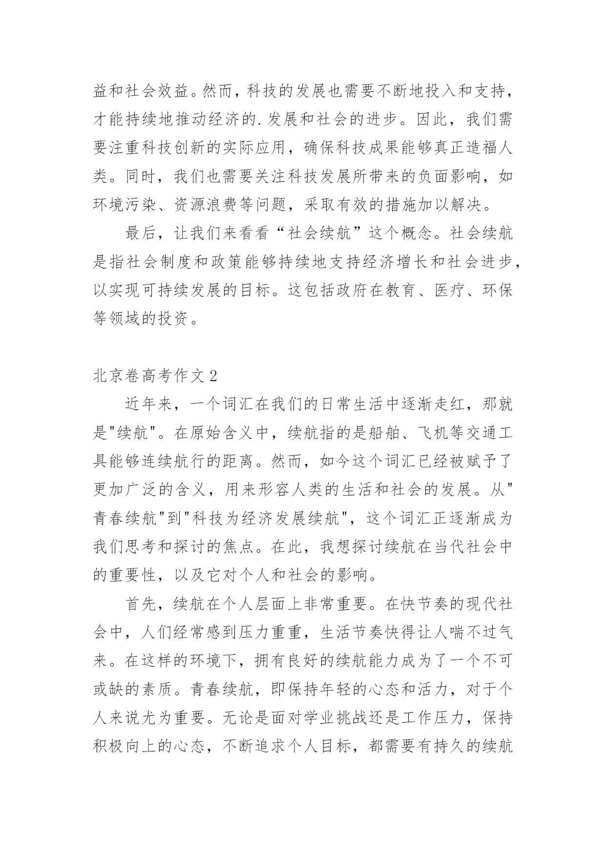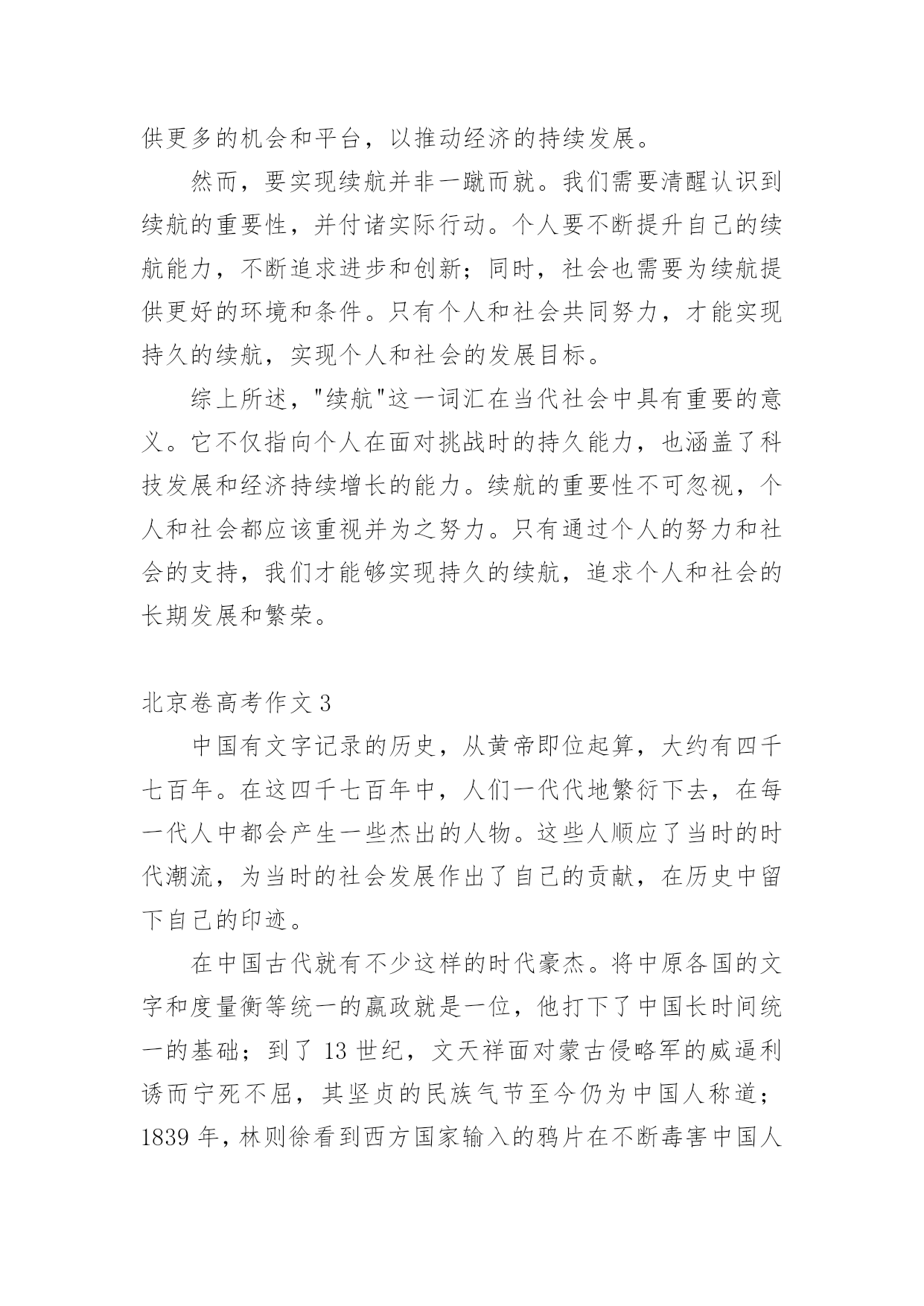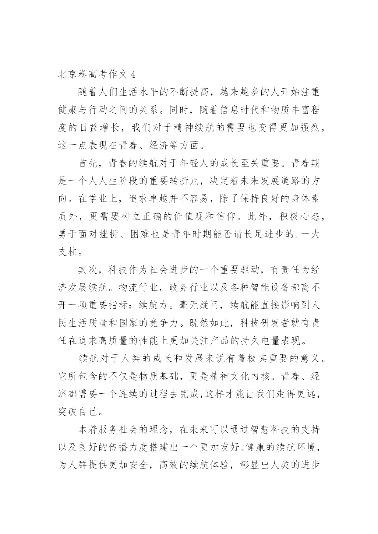 北京卷高考作文在日常学习、工作抑或是生活中,许多人都写过作文吧,通过作文可以把我们那些零零散散的思想,聚集在一块。你知道作文怎样写才规范吗?以下是小编为大家整理的北京卷高考作文,仅供参考,大家一起来看看吧。北京卷高考作文1“续航”一词,最初指的是船只在海上连续航行的能力。然而,如今这个词汇已经不再局限于航海领域,而是在各个领域和时代中得到了广泛的应用。无论是为青春续航、科技为经济发展续航,还是其他各种形式的延伸,都体现了人类对持续发展的追求。本文将探讨“续航”在当今社会的意义及其对我们的启示。首先,让我们来看看“为青春续航”这个概念。青春是人生中最宝贵的时光,它充满了激情、活力和无限可能。然而,随着时间的推移,我们的身体和精神都会逐渐衰老,青春也会逝去。因此,我们需要通过各种方式来延长自己的青春,保持年轻的心态和积极的生活态度。这包括不断学习新知识、拓展人际关系、培养兴趣爱好以及保持健康的生活方式。通过这样的努力,我们可以让自己的青春更加充实、充满活力,从而更好地应对生活中的各种变化和挑战。其次,让我们来看看“科技为经济发展续航”这个概念。科技是推动社会发展的重要力量,它可以带来巨大的经济效益和社会效益。然而,科技的发展也需要不断地投入和支持,才能持续地推动经济的.发展和社会的进步。因此,我们需要注重科技创新的实际应用,确保科技成果能够真正造福人类。同时,我们也需要关注科技发展所带来的负面影响,如环境污染、资源浪费等问题,采取有效的措施加以解决。最后,让我们来看看“社会续航”这个概念。社会续航是指社会制度和政策能够持续地支持经济增长和社会进步,以实现可持续发展的目标。这包括政府在教育、医疗、环保等领域的投资。北京卷高考作文2近年来,一个词汇在我们的日常生活中逐渐走红,那就是"续航"。在原始含义中,续航指的是船舶、飞机等交通工具能够连续航行的距离。然而,如今这个词汇已经被赋予了更加广泛的含义,用来形容人类的生活和社会的发展。从"青春续航"到"科技为经济发展续航",这个词汇正逐渐成为我们思考和探讨的焦点。在此,我想探讨续航在当代社会中的重要性,以及它对个人和社会的影响。首先,续航在个人层面上非常重要。在快节奏的现代社会中,人们经常感到压力重重,生活节奏快得让人喘不过气来。在这样的环境下,拥有良好的续航能力成为了一个不可或缺的素质。青春续航,即保持年轻的心态和活力,对于个人来说尤为重要。无论是面对学业挑战还是工作压力,保持积极向上的心态,不断追求个人目标,都需要有持久的续航能力。只有在艰难困苦的时刻坚持不懈,我们才能战胜困难,取得成功。因此,续航对于个人的成长和发展至关重要。此外,续航也在社会层面上发挥着重要作用。科技为经济发展续航是当代社会的一个重要议题。随着科技的不断进步,它给经济带来了巨大的推动力。科技创新为企业提供了更多发展机会,为经济注入了新的动力。然而,科技发展的续航能力同样需要得到关注。仅仅拥有一次性的科技突破是不够的,需要有持续的创新和研发,才能保持经济的可持续发展。只有不断推动科技进步,不断适应市场需求的变化,我们才能够在激烈的国际竞争中保持领先地位,实现经济的长期繁荣。续航对于个人和社会的重要性是显而易见的,但要实现续航并非易事。首先,个人要实现续航能力,个人需要具备一定的'品质和素养。首先是毅力和坚持不懈的精神。在面对挑战和困难时,只有坚持不懈地努力才能够跨越障碍,取得成功。同时,自律和积极的生活态度也是必不可少的。通过良好的时间管理和合理的生活规划,个人能够更好地分配精力和资源,以维持持久的续航能力。另一方面,社会也需要为续航提供支持和保障。首先是教育体系的改革和完善。教育应该注重培养学生的持久学习能力和创新能力,而不仅仅是追求短期的成绩。学校可以提供更多的综合素质培养和实践机会,帮助学生发展他们的续航能力。同时,社会应该鼓励并支持人们的创新和创业精神。为科技创新提供更多的资金、资源和政策支持,为创业者提供更多的机会和平台,以推动经济的持续发展。然而,要实现续航并非一蹴而就。我们需要清醒认识到续航的重要性,并付诸实际行动。个人要不断提升自己的续航能力,不断追求进步和创新;同时,社会也需要为续航提供更好的环境和条件。只有个人和社会共同努力,才能实现持久的续航,实现个人和社会的发展目标。综上所述,"续航"这一词汇在当代社会中具有重要的意义。它不仅指向个人在面对挑战时的持久能力,也涵盖了科技发展和经济持续增长的能力。续航的重要性不可忽视,个人和社会都应该重视并为之努力。只有通过个人的努力和社会的支持,我们才能够实现持久的续航,追求个人和社会的长期发展和繁荣。北京卷高考作文3中国有文字记录的历史,从黄帝即位起算,大约有四千七百年。在这四千七百年中,人们一代代地繁衍下去,在每一代人中都会产生一些杰出的人物。这些人顺