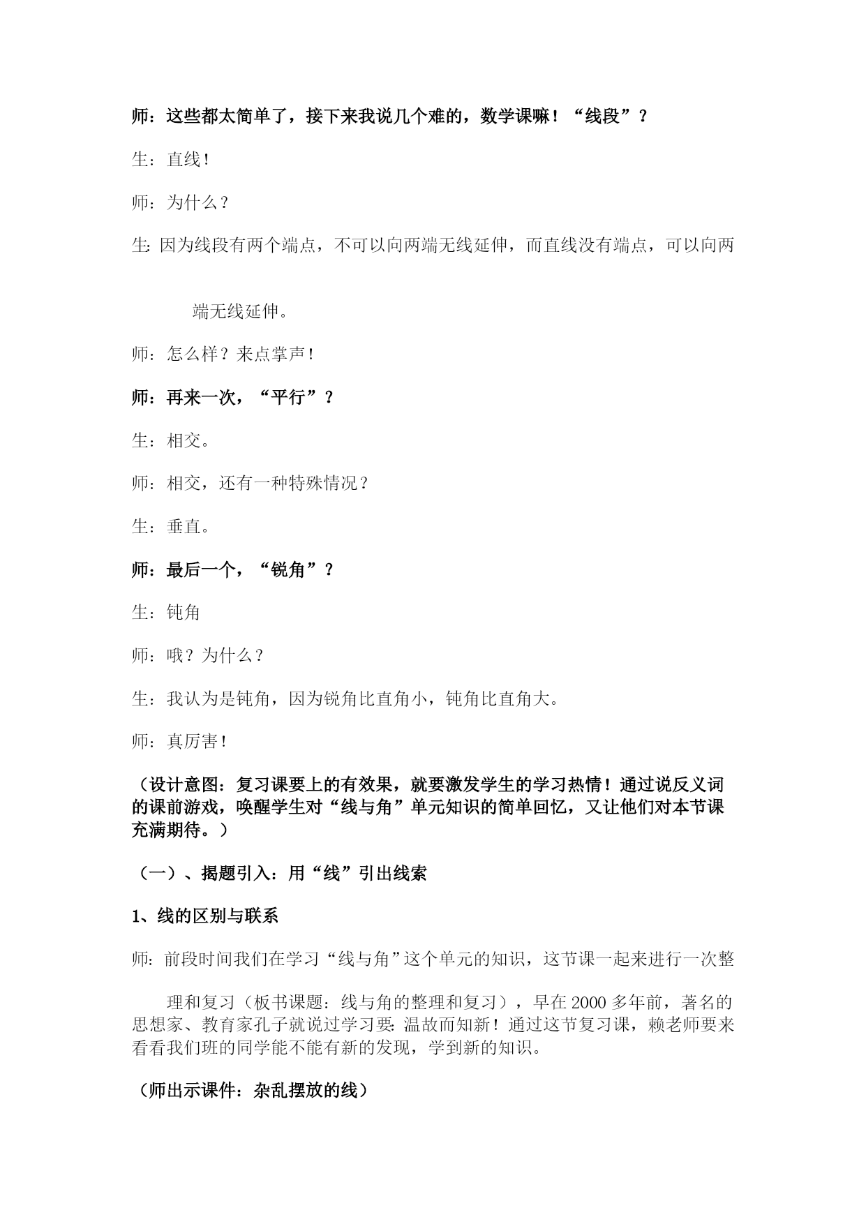北师大四年级《线与角》复习课教学设计一、教学内容北师大版数学四年级上册第二单元“线与角整理复习”二、教学目标1、通过复习加深学生对线段、射线和直线的理解,进一步认识线与线之间的关系;熟悉常见的几种角并会比较角的大小,熟练运用量角器量角的度数和按指定度数画角。2、引导学生经历系统整理知识的过程,学会一些简单整理与复习的方法,培养学生主动建构知识网络的意识。3、通过复习,了解线、角这些平面图形间的内在联系。三、教学重难点重点:学生自主对分类、比较、辨析过的知识点进行整理和归纳。难点:理解线、角这些平面图形间的内在联系与区别。四、教学准备教具:多媒体课件、三角板、量角器、活动角、学生随堂作业纸。学具:直尺、量角器、三角板,草稿本。五、教学过程课前游戏导入、激发兴趣师:课前我们一起来玩一个小游戏,同学们都学过反义词吧?生:学过!师:大的反义词?生:小!师:高兴?生:难过!师:这些都太简单了,接下来我说几个难的,数学课嘛!“线段”?生:直线!师:为什么?生:因为线段有两个端点,不可以向两端无线延伸,而直线没有端点,可以向两端无线延伸。师:怎么样?来点掌声!师:再来一次,“平行”?生:相交。师:相交,还有一种特殊情况?生:垂直。师:最后一个,“锐角”?生:钝角师:哦?为什么?生:我认为是钝角,因为锐角比直角小,钝角比直角大。师:真厉害!(设计意图:复习课要上的有效果,就要激发学生的学习热情!通过说反义词的课前游戏,唤醒学生对“线与角”单元知识的简单回忆,又让他们对本节课充满期待。)(一)、揭题引入:用“线”引出线索1、线的区别与联系师:前段时间我们在学习“线与角”这个单元的知识,这节课一起来进行一次整理和复习(板书课题:线与角的整理和复习),早在2000多年前,著名的思想家、教育家孔子就说过学习要:温故而知新!通过这节复习课,赖老师要来看看我们班的同学能不能有新的发现,学到新的知识。(师出示课件:杂乱摆放的线)师:看到这些横七竖八的线,你们觉得舒服吗?生:不舒服!太乱了!师:那你们能不能先把它们分分类?分完之后再把有关线的知识点梳理一下呢?四人一小组交流一下,把交流的结果记录在作业纸上,3分钟开始。(师巡视,并给予指导)师:好,有没有同学想上来分享一下你们小组的整理结果?生:有、有!师:好,你先来,带上你们小组的整理结果。你先把他们分类吧。生:······我们小组是这样梳理的:先把线分成曲线和直直的线······师:不急,你边说我边写。生:然后再把直直的线分成线段、射线和直线。线段线段有两个端点,不能向两边无限延长;射线有一个端点,可以向一边无限延长;直线没有端点,可以向两边无限延长。线段可以度量,射线和直线不能度量。师:哇!整理了这么多,可帮了我大忙,好,我们掌声欢送他回去好不好。(生鼓掌)师:刚才他首先把曲线和直直的线分成两类,然后再把直直的线分成线段、射线和直线,并且都说了每种线的特点,条理非常清晰,值得我们大家学习!师:那如果要给这几条线取一个名称,你会怎么取?生:线段AB,线段BA;射线AB;直线AB,直线BA师:我听到了,这两种线都有两种读法,但射线你却只说出了一种读法,为什么?生:射线是由一个端点出发,向另一边无限延伸的线,这里是由A点出发,向B点无限延伸的,如果读成射线BA说明是B为端点,向A点无限延长了。师:看来呀,这个端点的作用也很大,看清了端点,就能够认清这些线。2、平行和垂直师:前面我们整理的都是一条线,那如果在同一平面上摆两条线,会有哪几种不同的情况呢?我这里有一些小棒,如果把它当成直线,谁能上来摆一摆。(一生上来摆)师:请你介绍一下?生:我摆出的一组是平行,一组是相交,还有一组是垂直。师:垂直和相交有什么关系?生:垂直是相交的特殊情况师:你解释一下,怎么个特殊?生:当两条直线相交成直角时,这两条直线就形成垂直了。师:你怎么知道两条直线相交是否成直角?生:用量角器和三角板都可以判断。师:两条直线相交时,这个点叫什么?生:交点。师:当相交成直角时,也就是垂直时,这个交点又有个特殊的名称生:垂足。师:那平行的两条线又有什么特点呢?生:两条线之间的距离相等,就说这两条线平行。师:相交有几个交点?生:1个师:平行呢?生:没有!师:感谢这位同学为我们梳理了线的关系,下面我们先来做一组练习。选一选,平行的打“√”,垂直的画“○”,相交的画“×”。3、角的复习师:像③这样两条线相交的情况,我们能在上面找到?生:角!师:反应真快!角是不是有很多种啊?那你们能不能按照我们刚才整理线的方法把角这部分内容也给整理整理呢?(学生自己整理,教师巡视课堂并