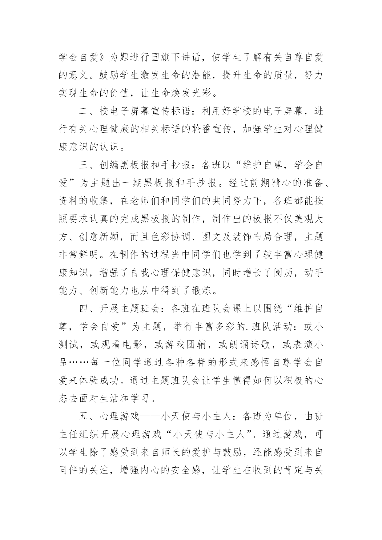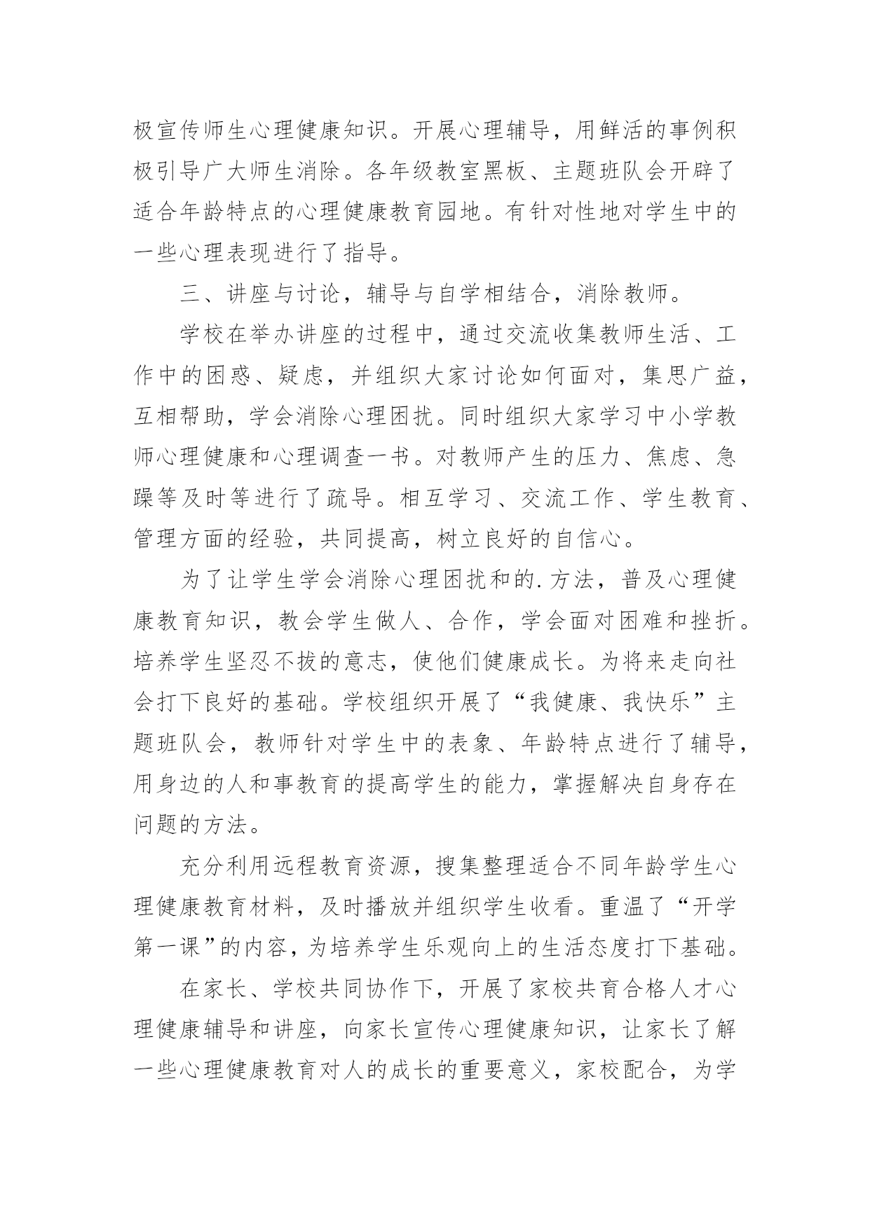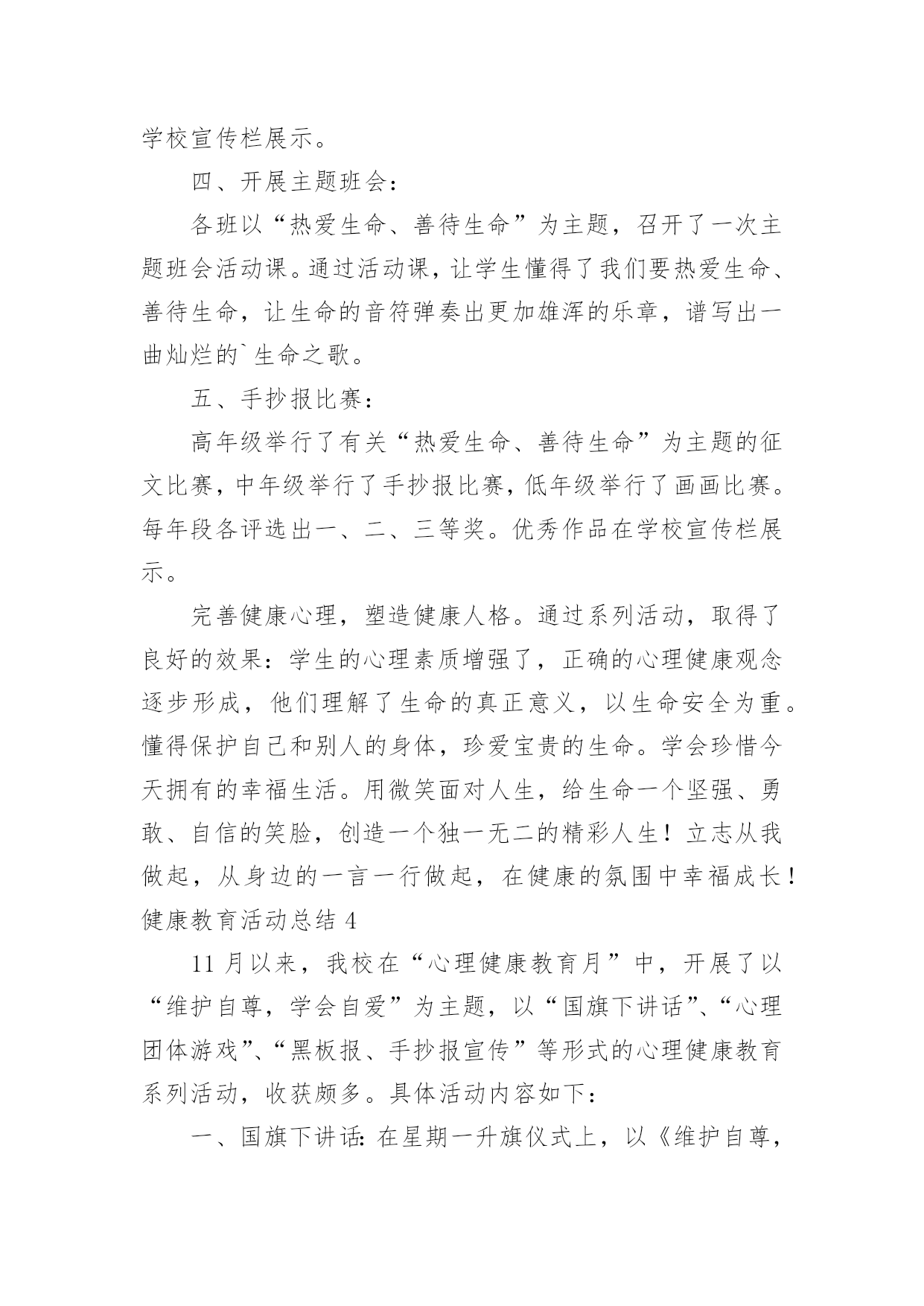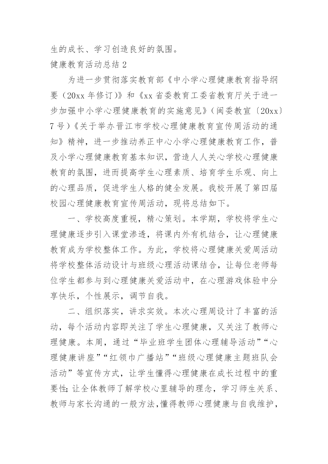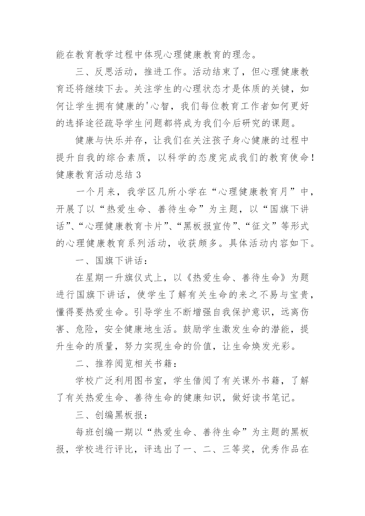 健康教育活动总结健康教育活动总结总结是把一定阶段内的有关情况分析研究,做出有指导性结论的书面材料,它是增长才干的一种好办法,因此我们要做好归纳,写好总结。总结一般是怎么写的呢?以下是小编帮大家整理的健康教育活动总结,供大家参考借鉴,希望可以帮助到有需要的朋友。健康教育活动总结1为进一步贯彻落实教育部《中小学心理健康教育指导纲要》精神。全面提高我校学生心理素质,充分开发学生装潜能,培养学生装乐观向上的心理品质,促进学生装人格健全发展。学校本着以人为本的思想和对师生高度负责的态度,扎实开展中小学心理健康教育活动。一、主题明确,精心设计。根据活动安排意见,学校就心理健康教育月活动做了精心安排,从内容、形式、方法及效果方面均提出了明确的要求,对活动时间也做了安排。为了使活动落到实处,要求全体师生全程参与。及时收集活动材料,整理反馈信息,使活动落到实处。二、广泛宣传心理健康知识。活动之初,学校就充分利用红领巾广播站、宣传栏等积极宣传师生心理健康知识。开展心理辅导,用鲜活的事例积极引导广大师生消除。各年级教室黑板、主题班队会开辟了适合年龄特点的心理健康教育园地。有针对性地对学生中的一些心理表现进行了指导。三、讲座与讨论,辅导与自学相结合,消除教师。学校在举办讲座的过程中,通过交流收集教师生活、工作中的困惑、疑虑,并组织大家讨论如何面对,集思广益,互相帮助,学会消除心理困扰。同时组织大家学习中小学教师心理健康和心理调查一书。对教师产生的压力、焦虑、急躁等及时等进行了疏导。相互学习、交流工作、学生教育、管理方面的经验,共同提高,树立良好的自信心。为了让学生学会消除心理困扰和的.方法,普及心理健康教育知识,教会学生做人、合作,学会面对困难和挫折。培养学生坚忍不拔的意志,使他们健康成长。为将来走向社会打下良好的基础。学校组织开展了“我健康、我快乐”主题班队会,教师针对学生中的表象、年龄特点进行了辅导,用身边的人和事教育的提高学生的能力,掌握解决自身存在问题的方法。充分利用远程教育资源,搜集整理适合不同年龄学生心理健康教育材料,及时播放并组织学生收看。重温了“开学第一课”的内容,为培养学生乐观向上的生活态度打下基础。在家长、学校共同协作下,开展了家校共育合格人才心理健康辅导和讲座,向家长宣传心理健康知识,让家长了解一些心理健康教育对人的成长的重要意义,家校配合,为学生的成长、学习创造良好的氛围。健康教育活动总结2为进一步贯彻落实教育部《中小学心理健康教育指导纲要(20xx年修订)》和《xx省委教育工委省教育厅关于进一步加强中小学心理健康教育的实施意见》(闽委教宣〔20xx〕7号)《关于举办晋江市学校心理健康教育宣传周活动的通知》精神,进一步推动养正中心小学心理健康教育工作,普及小学心理健康教育基本知识,营造人人关心学校心理健康教育的氛围,进而提高学生心理素质、培育学生乐观、向上的心理品质,促进学生人格的健全发展。我校开展了第四届校园心理健康教育宣传周活动,现将总结如下。一、学校高度重视,精心策划。本学期,学校将学生心理健康逐步引入课堂渗透,将课内外有机结合,让心理健康教育成为学校整体工作。为此,学校将心理健康关爱周活动将学校整体活动设计与班级心理活动课结合,让每位老师每位学生都参与到心理健康关爱活动中,在心理游戏体验中分享快乐,个性展示,调节自我。二、组织落实,讲求实效。本次心理周设计了丰富的活动,每个活动内容即关注了学生心理健康,又关注了教师心理健康。本周,通过“毕业班学生团体心理辅导活动”“心理健康讲座”“红领巾广播站”“班级心理健康主题班队会活动”等宣传方式,让学生懂得心理健康在成长过程中的重要性;让全体教师了解学校心里辅导的理念,学习师生关系、教师与家长沟通的一般方法,懂得教师心理健康与自我维护,能在教育教学过程中体现心理健康教育的理念。三、反思活动,推进工作。活动结束了,但心理健康教育还将继续下去。关注学生的心理状态才是体质的关键,如何让学生拥有健康的'心智,我们每位教育工作者如何更好的选择途径疏导学生问题都将成为我们今后研究的课题。健康与快乐并存,让我们在关注孩子身心健康的过程中提升自我的综合素质,以科学的态度完成我们的教育使命!健康教育活动总结3一个月来,我学区几所小学在“心理健康教育月”中,开展了以“热爱生命、善待生命”为主题,以“国旗下讲话”、“心理健康教育卡片”、“黑板报宣传”、“征文”等形式的心理健康教育系列活动,收获颇多。具体活动内容如下。一、国旗下讲话:在星期一升旗仪式上,以《热爱生命、善待生命》为题进行国旗下讲话,使学生了解有关生命的来之不易与宝贵,懂得要热爱生命。引导学生不断增强自我保护意识,远离伤害、危险,安全健康地生活。鼓励学生激发生命的潜能,提升生命的质量,努力实现生命的价值,让生命焕发光彩。二、推荐阅览相关