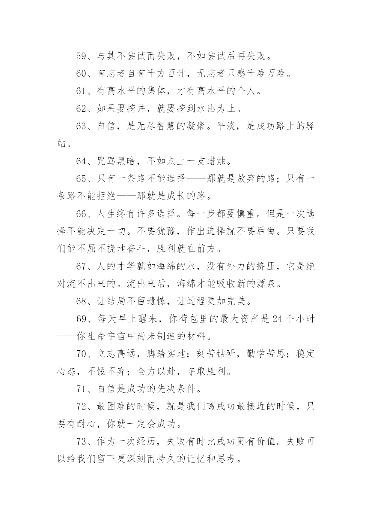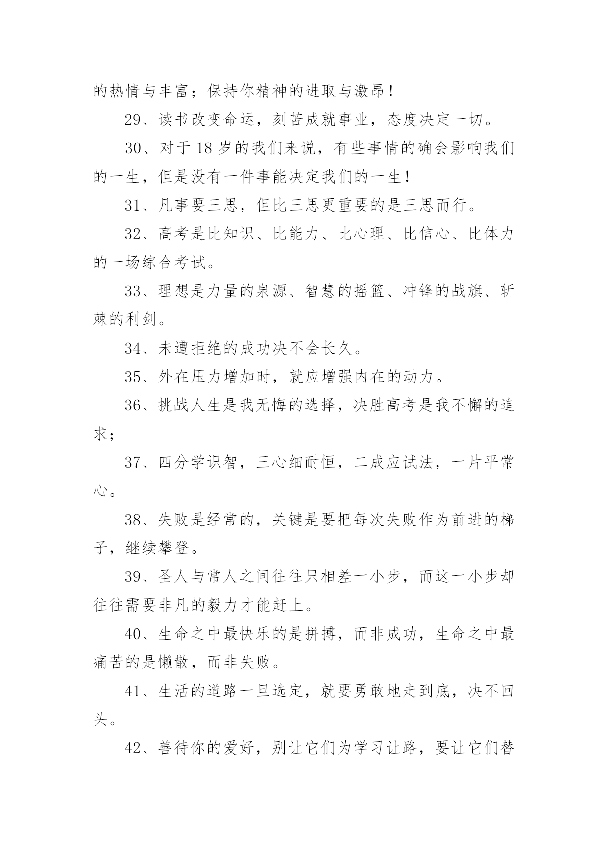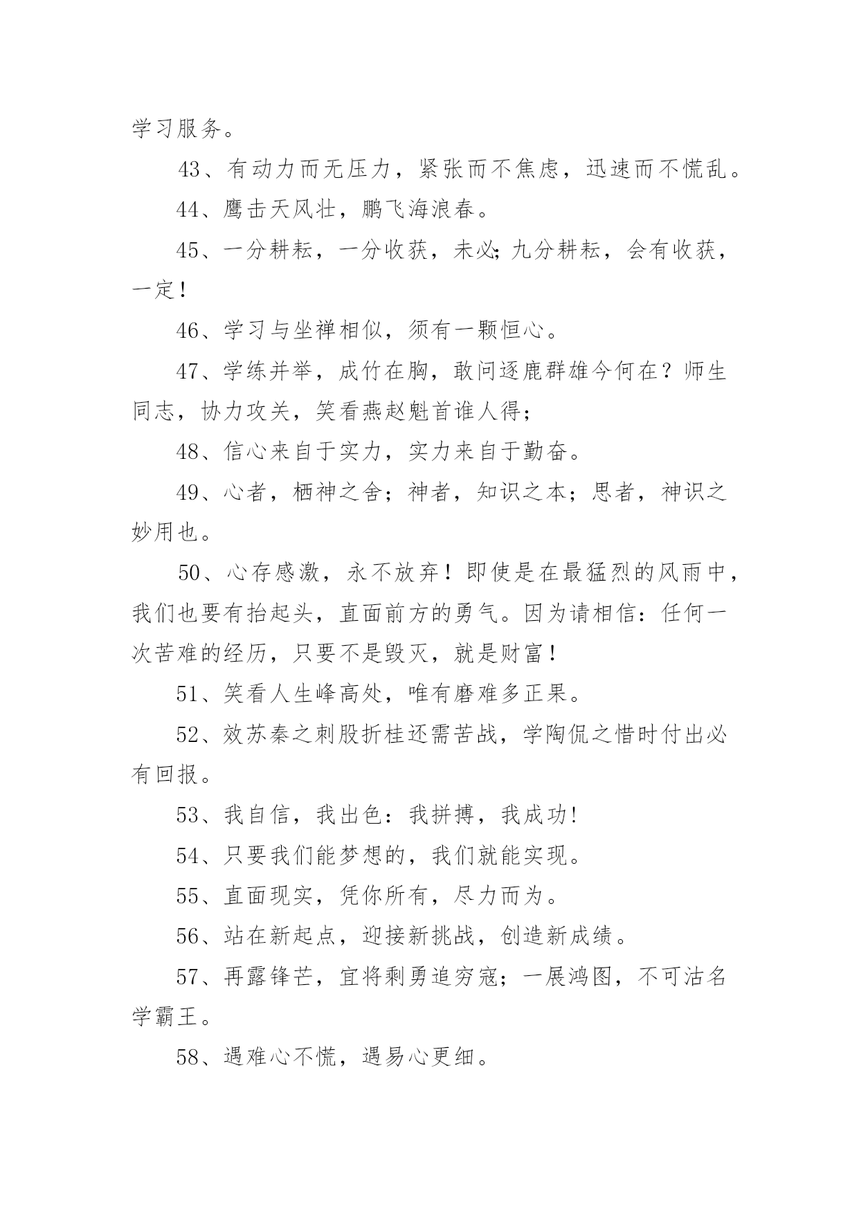 高考冲刺鼓励格言高考冲刺鼓励格言汇总1、保持平常心,营造好环境,扬起常笑脸,轻松迎高考。2、悲观些看成功,乐观些看失败。轻松些看自己,宽容些看别人。理智些看问题,纯真些看人生。3、摒弃侥幸之念,必取百炼成钢;厚积分秒之功,始得一鸣惊人。4、不敢高声语,恐惊读书人。5、脚踏实地,心无旁骛,珍惜分分秒秒。紧跟老师,夯实基础。6、回忆很美,尽管过程艰辛:也许结果总有遗憾,但我们无愧于心。7、灰心生失望,失望生动摇,动摇生失败。8、更快、更高、更强。领先就是金牌。9、高三高考高目标,苦学善学上好学。10、不思,故有惑;不求,故无得;不问,故不知。11、快马加鞭,君为先,自古英雄出少年。12、苦心人,天不负,卧薪尝胆,三千越甲可吞吴;有志者,事竟成,破釜沉舟,百二秦关终属楚13、决战高考,改变命运。屡挫屡战,笑傲群雄。14、决定心理的那片天空是否阴霾甚至是乌云密布的唯一因素是你自己,不能让自己永远有一个阳光灿烂的心情的人本身就是一个失败。15、今日寒窗苦读,必定有我;明朝独占熬头,舍我其谁?16、高考着实是一种丰收,它包蕴着太多的内涵。无论高考成绩如何,你的成长与成熟是任何人无法改变的事实,这三年的辛勤走过,你获得的太多太多。17、高考是一个实现人生的省力杠杆,此时是你撬动它的最佳时机,并且以后你的人生会呈弧线上升。18、不为失败找借口,要为成功找方法。19、不要轻言放弃,否则对不起自己。20、成功决不喜欢会见懒汉,而是唤醒懒汉。21、除非你放弃,否则你不会被打败!22、淡薄功利,轻装前进;不计付出,坚韧不拔;不达目的,誓不罢休。23、抢时间,抓基础,勤演练定有收获;树自信,誓拼搏,升大学回报父母。24、拼搏高考,今生无悔;爬过高三,追求卓越!张扬乐学乐思的个性,坚守不骄不躁的心态。25、努力就能成功,坚持确保胜利。26、拧成一股绳,搏尽一份力,狠下一条心,共圆一个梦。27、你是你的`敌人,只有你才能打倒你自己。你是你的上帝,只有你。28、面对高考,保持你心灵的善良与纯洁;保持你情感的热情与丰富;保持你精神的进取与激昂!29、读书改变命运,刻苦成就事业,态度决定一切。30、对于18岁的我们来说,有些事情的确会影响我们的一生,但是没有一件事能决定我们的一生!31、凡事要三思,但比三思更重要的是三思而行。32、高考是比知识、比能力、比心理、比信心、比体力的一场综合考试。33、理想是力量的泉源、智慧的摇篮、冲锋的战旗、斩棘的利剑。34、未遭拒绝的成功决不会长久。35、外在压力增加时,就应增强内在的动力。36、挑战人生是我无悔的选择,决胜高考是我不懈的追求;37、四分学识智,三心细耐恒,二成应试法,一片平常心。38、失败是经常的,关键是要把每次失败作为前进的梯子,继续攀登。39、圣人与常人之间往往只相差一小步,而这一小步却往往需要非凡的毅力才能赶上。40、生命之中最快乐的是拼搏,而非成功,生命之中最痛苦的是懒散,而非失败。41、生活的道路一旦选定,就要勇敢地走到底,决不回头。42、善待你的爱好,别让它们为学习让路,要让它们替学习服务。43、有动力而无压力,紧张而不焦虑,迅速而不慌乱。44、鹰击天风壮,鹏飞海浪春。45、一分耕耘,一分收获,未必;九分耕耘,会有收获,一定!46、学习与坐禅相似,须有一颗恒心。47、学练并举,成竹在胸,敢问逐鹿群雄今何在?师生同志,协力攻关,笑看燕赵魁首谁人得;48、信心来自于实力,实力来自于勤奋。49、心者,栖神之舍;神者,知识之本;思者,神识之妙用也。50、心存感激,永不放弃!即使是在最猛烈的风雨中,我们也要有抬起头,直面前方的勇气。因为请相信:任何一次苦难的经历,只要不是毁灭,就是财富!51、笑看人生峰高处,唯有磨难多正果。52、效苏秦之刺股折桂还需苦战,学陶侃之惜时付出必有回报。53、我自信,我出色:我拼搏,我成功!54、只要我们能梦想的,我们就能实现。55、直面现实,凭你所有,尽力而为。56、站在新起点,迎接新挑战,创造新成绩。57、再露锋芒,宜将剩勇追穷寇;一展鸿图,不可沽名学霸王。58、遇难心不慌,遇易心更细。59、与其不尝试而失败,不如尝试后再失败。60、有志者自有千方百计,无志者只感千难万难。61、有高水平的集体,才有高水平的个人。62、如果要挖井,就要挖到水出为止。63、自信,是无尽智慧的凝聚。平淡,是成功路上的驿站。64、咒骂黑暗,不如点上一支蜡烛。65、只有一条路不能选择——那就是放弃的路;只有一条路不能拒绝——那就是成长的路。66、人生终有许多选择。每一步都要慎重。但是一次选择不能决定一切。不要犹豫,作出选择就不要后悔。只要我们能不屈不挠地奋斗,胜利就在前方。67、人的才华就如海绵的水,没有外力的挤压,它是绝对流不出来的。流出来后,海绵才能吸收新的源泉。68、让结局不留遗憾,让过程更加完