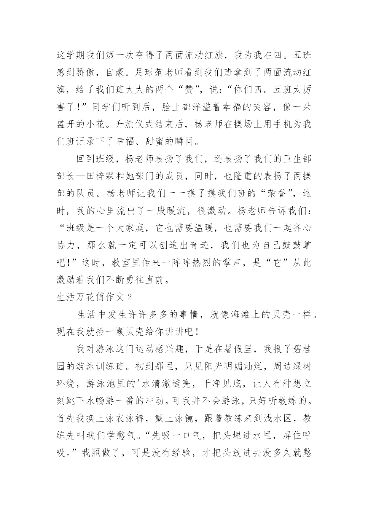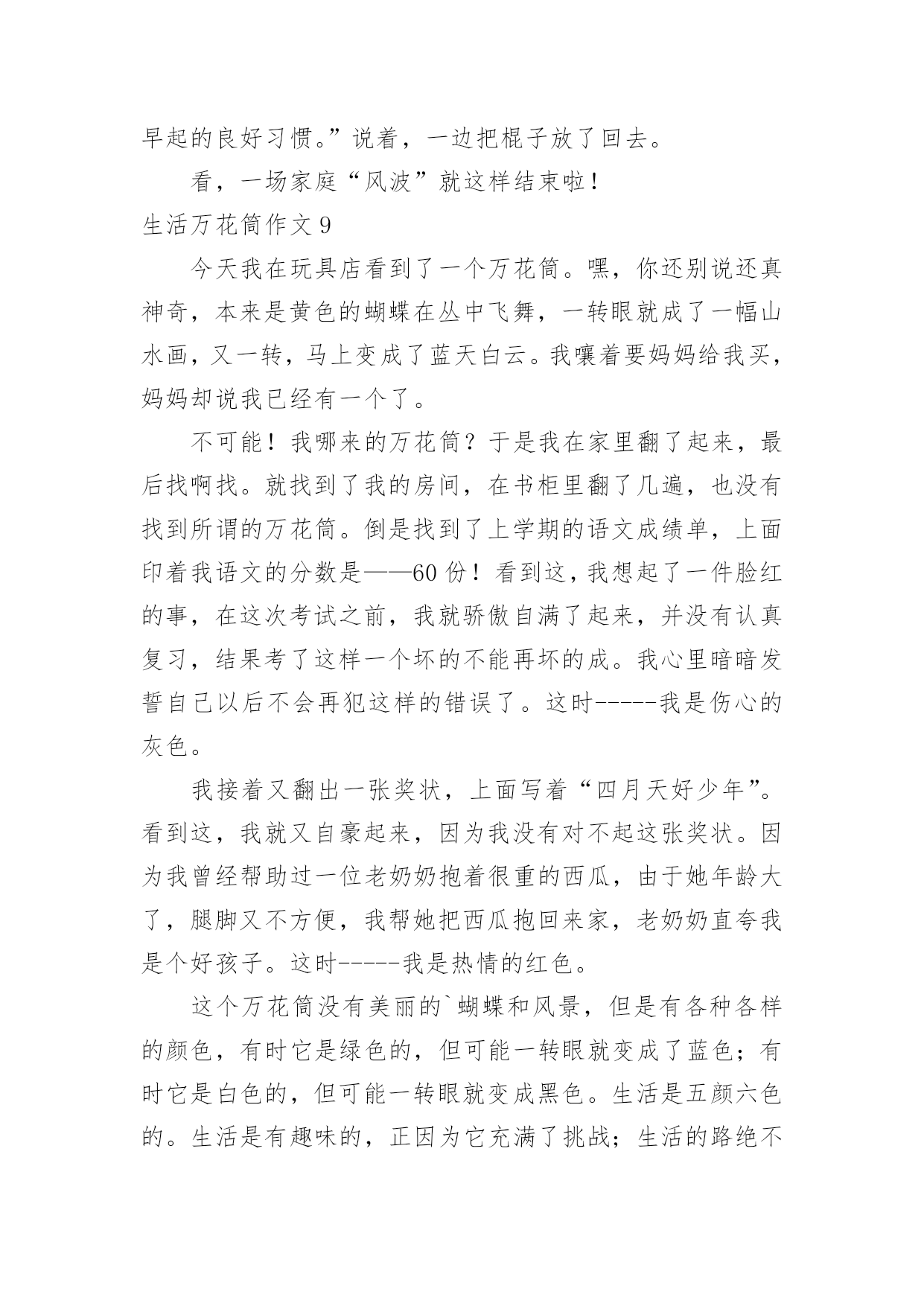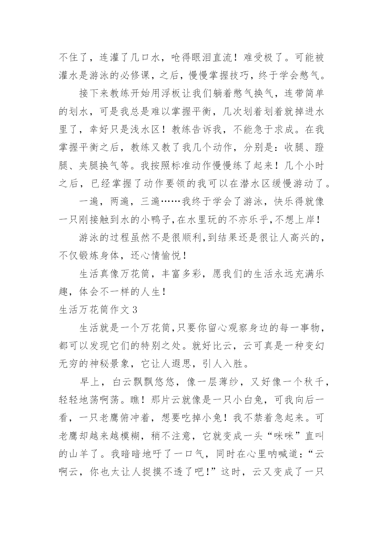 生活万花筒作文生活万花筒作文15篇【精】在平平淡淡的日常中,说到作文,大家肯定都不陌生吧,作文是人们以书面形式表情达意的言语活动。那么你有了解过作文吗?以下是小编精心整理的生活万花筒作文,欢迎阅读,希望大家能够喜欢。生活万花筒作文1生活中有很多事情,就像一个万花筒。有高兴的、兴奋的、喜悦的、难忘的……今天,就来说说我们四(5)班一件令人兴奋,快乐的事。每周一的早晨,学校都会举行升旗仪式、值周总结并且还会给优秀的.班级颁发卫生、路队两面流动红旗。这周一的第二节课后,杨老师来到班级,将我们班的队伍整理好,同学们迈着整齐步伐来到操场后,迅速站好位置,等待着升旗仪式的开始。“全体队友,稍息”老师发号口令,升旗仪式开始了。第一项:升国旗,奏国歌,当国歌响起时,全体同学面向国旗敬礼,唱国歌,表情庄重严肃。第二项:值周总结。第三项:老师颁发上周“卫生”“路队”班级流动红旗。当台上的老师开始念时,同学们都侧耳倾听,当读到四。五班时,我们班的同学都欢呼雀跃,热血沸腾,激动万分。我们高兴、我们开心、我们兴奋、我们激情澎湃……杨老师也高兴不已。这学期我们第一次夺得了两面流动红旗,我为我在四。五班感到骄傲,自豪。足球范老师看到我们班拿到了两面流动红旗,给了我们班大大的两个“赞”,说:“你们四。五班太厉害了!”同学们听到后,脸上都洋溢着幸福的笑容,像一朵盛开的小花。升旗仪式结束后,杨老师在操场上用手机为我们班记录下了幸福、甜蜜的瞬间。回到班级,杨老师表扬了我们,还表扬了我们的卫生部部长—田梓霖和她部门的成员,同时,也隆重的表扬了两操部的队员。杨老师让我们一一摸了摸我们班的“荣誉”,这时,我的心里流出了一股暖流,很激动。杨老师告诉我们:“班级是一个大家庭,它也需要温暖,也需要我们一起齐心协力,那么就一定可以创造出奇迹,我们也为自己鼓鼓掌吧!”这时,教室里传来一阵阵热烈的掌声,是“它”从此激励着我们不断勇往直前。生活万花筒作文2生活中发生许许多多的事情,就像海滩上的贝壳一样。现在我就捡一颗贝壳给你讲讲吧!我对游泳这门运动感兴趣,于是在暑假里,我报了碧桂园的游泳训练班。初到那里,只见阳光明媚灿烂,周边绿树环绕,游泳池里的'水清澈透亮,干净见底,让人有种想立刻跳下水畅游一番的冲动。可我并不会游泳,只好听教练的。首先我换上泳衣泳裤,戴上泳镜,跟着教练来到浅水区,教练先叫我们学憋气。“先吸一口气,把头埋进水里,屏住呼吸。”我照做了,可是没有经验,才把头放进去没多久就憋不住了,连灌了几口水,呛得眼泪直流!难受极了。可能被灌水是游泳的必修课,之后,慢慢掌握技巧,终于学会憋气。接下来教练开始用浮板让我们躺着憋气换气,连带简单的划水,可是我总是难以掌握平衡,几次划着划着就掉进水里了,幸好只是浅水区!教练告诉我,不能急于求成。在我掌握平衡之后,教练又教了我几个动作,分别是:收腿、蹬腿、夹腿换气等。我按照标准动作慢慢练了起来!几个小时之后,已经掌握了动作要领的我可以在潜水区缓慢游动了。一遍,两遍,三遍……我终于学会了游泳,快乐得就像一只刚接触到水的小鸭子,在水里玩的不亦乐乎,不想上岸!游泳的过程虽然不是很顺利,到结果还是很让人高兴的,不仅锻炼身体,还心情愉悦!生活真像万花筒,丰富多彩,愿我们的生活永远充满乐趣,体会不一样的人生!生活万花筒作文3生活就是一个万花筒,只要你留心观察身边的每一事物,都可以发现它们的特别之处。就好比云,云可真是一种变幻无穷的神秘景象,它让人遐思,引人入胜。早上,白云飘飘悠悠,像一层薄纱,又好像一个秋千,轻轻地荡啊荡。瞧!那片云就像是一只小白兔,可我向后一看,一只老鹰俯冲着,想要吃掉小兔!我不禁着急起来。可老鹰却越来越模糊,稍不注意,它就变成一头“咪咪”直叫的山羊了。我暗暗地吁了一口气,同时在心里呐喊道:“云啊云,你也太让人捉摸不透了吧!”这时,云又变成了一只恐龙!我不禁开始猜测,是霸王龙吗?还是翼龙呢?雷龙也有可能……恐龙这时却缓缓地飘走了,我好像跟上去,看一看它到底是什么龙。夕阳西下的火烧云可真是一大奇观,它白里透黄,黄里透红,而且仿佛一个魔术大师一般,耍弄着多棱镜,万花筒。那边的云上边方方正正的,下面却有两个半圆,就像是一辆马车,载着太阳公公,到达天的另一边。这边的云像一个动物聚会:黄乎乎的小兔子,飞快地跑着;一匹振鬃长啸的骏马万里奔腾;蛇吐着分叉的舌头,寻找着猎物;孔雀也不甘示弱,撑开了五颜六色的“扇子”……真是令人目不暇接!在远处咆哮的.雷声中,乌云涌来了。它越来越多,越来越密,越来越浓,最后像一只怒吼的黑色怪兽,席卷长空,似乎即将要倾下的不是一场大雨,而是浓浓的墨汁。但乌云的边缘是浅黑色的,像中国画般,深浅分明。变幻无穷的云,神秘莫测的云,美不胜收的云……我都喜欢。我喜欢久久地望着天空,猜一猜云又变成了什么。生活万花筒作文4以前,我家卖