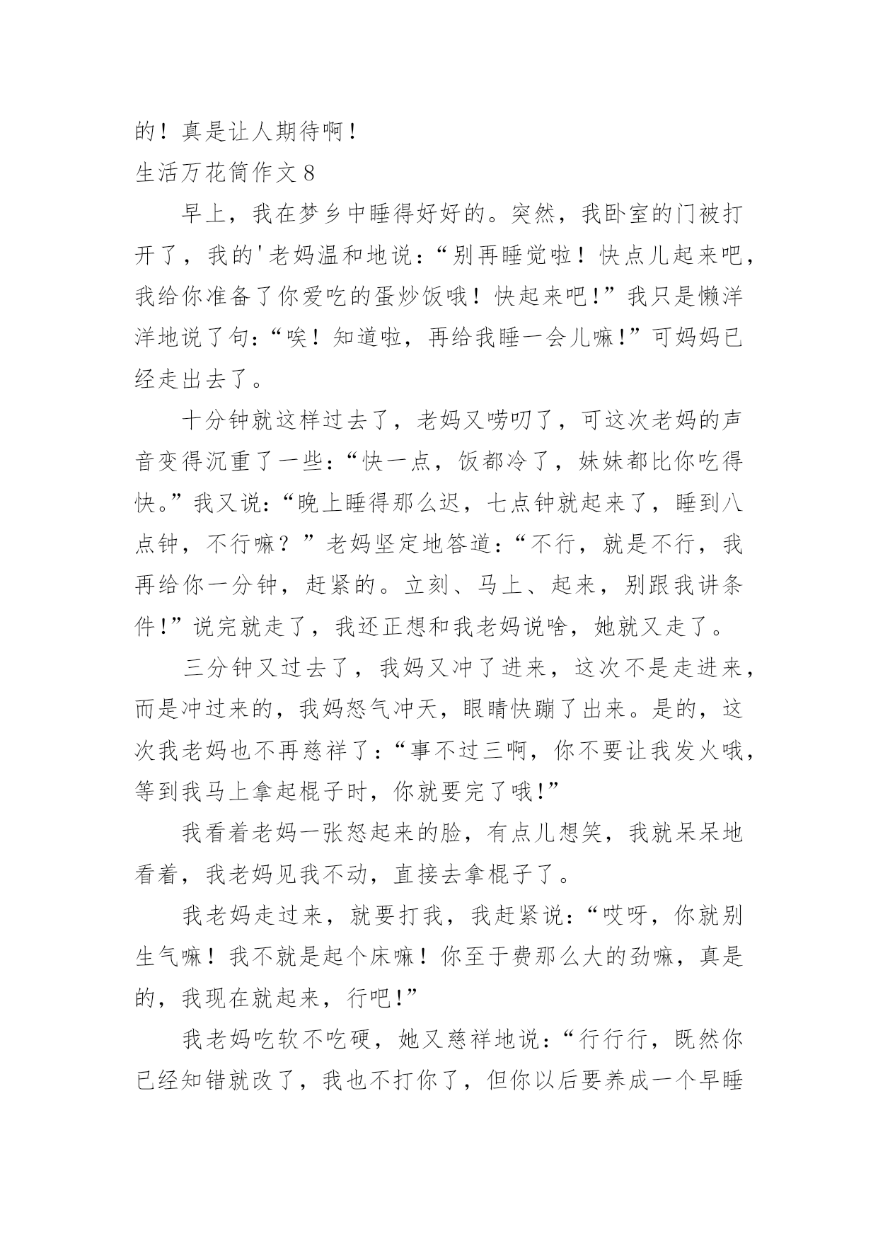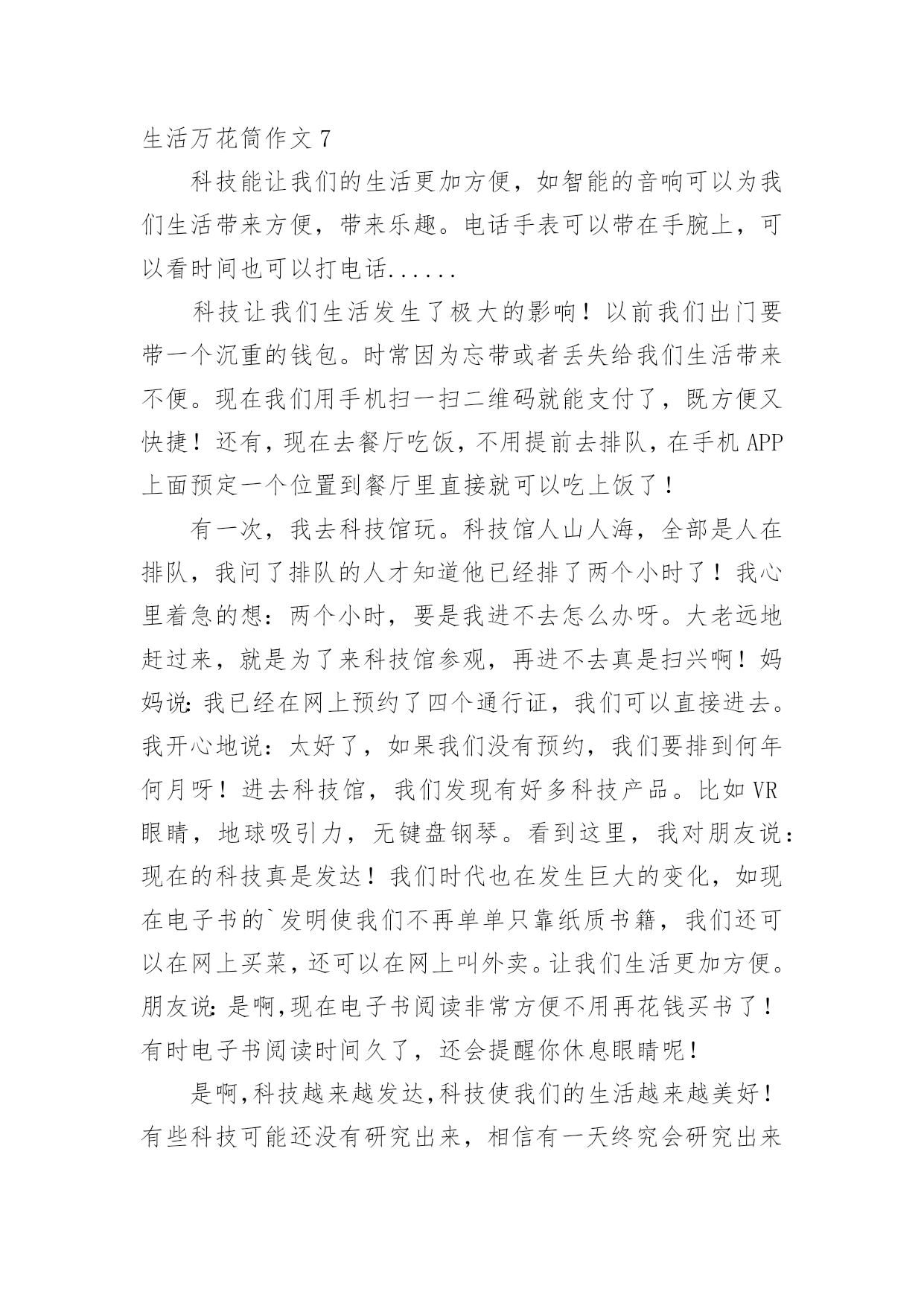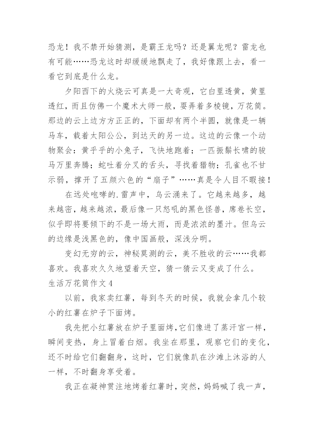 生活万花筒作文生活万花筒作文15篇【精】在平平淡淡的日常中,说到作文,大家肯定都不陌生吧,作文是人们以书面形式表情达意的言语活动。那么你有了解过作文吗?以下是小编精心整理的生活万花筒作文,欢迎阅读,希望大家能够喜欢。生活万花筒作文1生活中有很多事情,就像一个万花筒。有高兴的、兴奋的、喜悦的、难忘的……今天,就来说说我们四(5)班一件令人兴奋,快乐的事。每周一的早晨,学校都会举行升旗仪式、值周总结并且还会给优秀的.班级颁发卫生、路队两面流动红旗。这周一的第二节课后,杨老师来到班级,将我们班的队伍整理好,同学们迈着整齐步伐来到操场后,迅速站好位置,等待着升旗仪式的开始。“全体队友,稍息”老师发号口令,升旗仪式开始了。第一项:升国旗,奏国歌,当国歌响起时,全体同学面向国旗敬礼,唱国歌,表情庄重严肃。第二项:值周总结。第三项:老师颁发上周“卫生”“路队”班级流动红旗。当台上的老师开始念时,同学们都侧耳倾听,当读到四。五班时,我们班的同学都欢呼雀跃,热血沸腾,激动万分。我们高兴、我们开心、我们兴奋、我们激情澎湃……杨老师也高兴不已。这学期我们第一次夺得了两面流动红旗,我为我在四。五班感到骄傲,自豪。足球范老师看到我们班拿到了两面流动红旗,给了我们班大大的两个“赞”,说:“你们四。五班太厉害了!”同学们听到后,脸上都洋溢着幸福的笑容,像一朵盛开的小花。升旗仪式结束后,杨老师在操场上用手机为我们班记录下了幸福、甜蜜的瞬间。回到班级,杨老师表扬了我们,还表扬了我们的卫生部部长—田梓霖和她部门的成员,同时,也隆重的表扬了两操部的队员。杨老师让我们一一摸了摸我们班的“荣誉”,这时,我的心里流出了一股暖流,很激动。杨老师告诉我们:“班级是一个大家庭,它也需要温暖,也需要我们一起齐心协力,那么就一定可以创造出奇迹,我们也为自己鼓鼓掌吧!”这时,教室里传来一阵阵热烈的掌声,是“它”从此激励着我们不断勇往直前。生活万花筒作文2生活中发生许许多多的事情,就像海滩上的贝壳一样。现在我就捡一颗贝壳给你讲讲吧!我对游泳这门运动感兴趣,于是在暑假里,我报了碧桂园的游泳训练班。初到那里,只见阳光明媚灿烂,周边绿树环绕,游泳池里的'水清澈透亮,干净见底,让人有种想立刻跳下水畅游一番的冲动。可我并不会游泳,只好听教练的。首先我换上泳衣泳裤,戴上泳镜,跟着教练来到浅水区,教练先叫我们学憋气。“先吸一口气,把头埋进水里,屏住呼吸。”我照做了,可是没有经验,才把头放进去没多久就憋不住了,连灌了几口水,呛得眼泪直流!难受极了。可能被灌水是游泳的必修课,之后,慢慢掌握技巧,终于学会憋气。接下来教练开始用浮板让我们躺着憋气换气,连带简单的划水,可是我总是难以掌握平衡,几次划着划着就掉进水里了,幸好只是浅水区!教练告诉我,不能急于求成。在我掌握平衡之后,教练又教了我几个动作,分别是:收腿、蹬腿、夹腿换气等。我按照标准动作慢慢练了起来!几个小时之后,已经掌握了动作要领的我可以在潜水区缓慢游动了。一遍,两遍,三遍……我终于学会了游泳,快乐得就像一只刚接触到水的小鸭子,在水里玩的不亦乐乎,不想上岸!游泳的过程虽然不是很顺利,到结果还是很让人高兴的,不仅锻炼身体,还心情愉悦!生活真像万花筒,丰富多彩,愿我们的生活永远充满乐趣,体会不一样的人生!生活万花筒作文3生活就是一个万花筒,只要你留心观察身边的每一事物,都可以发现它们的特别之处。就好比云,云可真是一种变幻无穷的神秘景象,它让人遐思,引人入胜。早上,白云飘飘悠悠,像一层薄纱,又好像一个秋千,轻轻地荡啊荡。瞧!那片云就像是一只小白兔,可我向后一看,一只老鹰俯冲着,想要吃掉小兔!我不禁着急起来。可老鹰却越来越模糊,稍不注意,它就变成一头“咪咪”直叫的山羊了。我暗暗地吁了一口气,同时在心里呐喊道:“云啊云,你也太让人捉摸不透了吧!”这时,云又变成了一只恐龙!我不禁开始猜测,是霸王龙吗?还是翼龙呢?雷龙也有可能……恐龙这时却缓缓地飘走了,我好像跟上去,看一看它到底是什么龙。夕阳西下的火烧云可真是一大奇观,它白里透黄,黄里透红,而且仿佛一个魔术大师一般,耍弄着多棱镜,万花筒。那边的云上边方方正正的,下面却有两个半圆,就像是一辆马车,载着太阳公公,到达天的另一边。这边的云像一个动物聚会:黄乎乎的小兔子,飞快地跑着;一匹振鬃长啸的骏马万里奔腾;蛇吐着分叉的舌头,寻找着猎物;孔雀也不甘示弱,撑开了五颜六色的“扇子”……真是令人目不暇接!在远处咆哮的.雷声中,乌云涌来了。它越来越多,越来越密,越来越浓,最后像一只怒吼的黑色怪兽,席卷长空,似乎即将要倾下的不是一场大雨,而是浓浓的墨汁。但乌云的边缘是浅黑色的,像中国画般,深浅分明。变幻无穷的云,神秘莫测的云,美不胜收的云……我都喜欢。我喜欢久久地望着天空,猜一猜云又变成了什么。生活万花筒作文4以前,我家卖