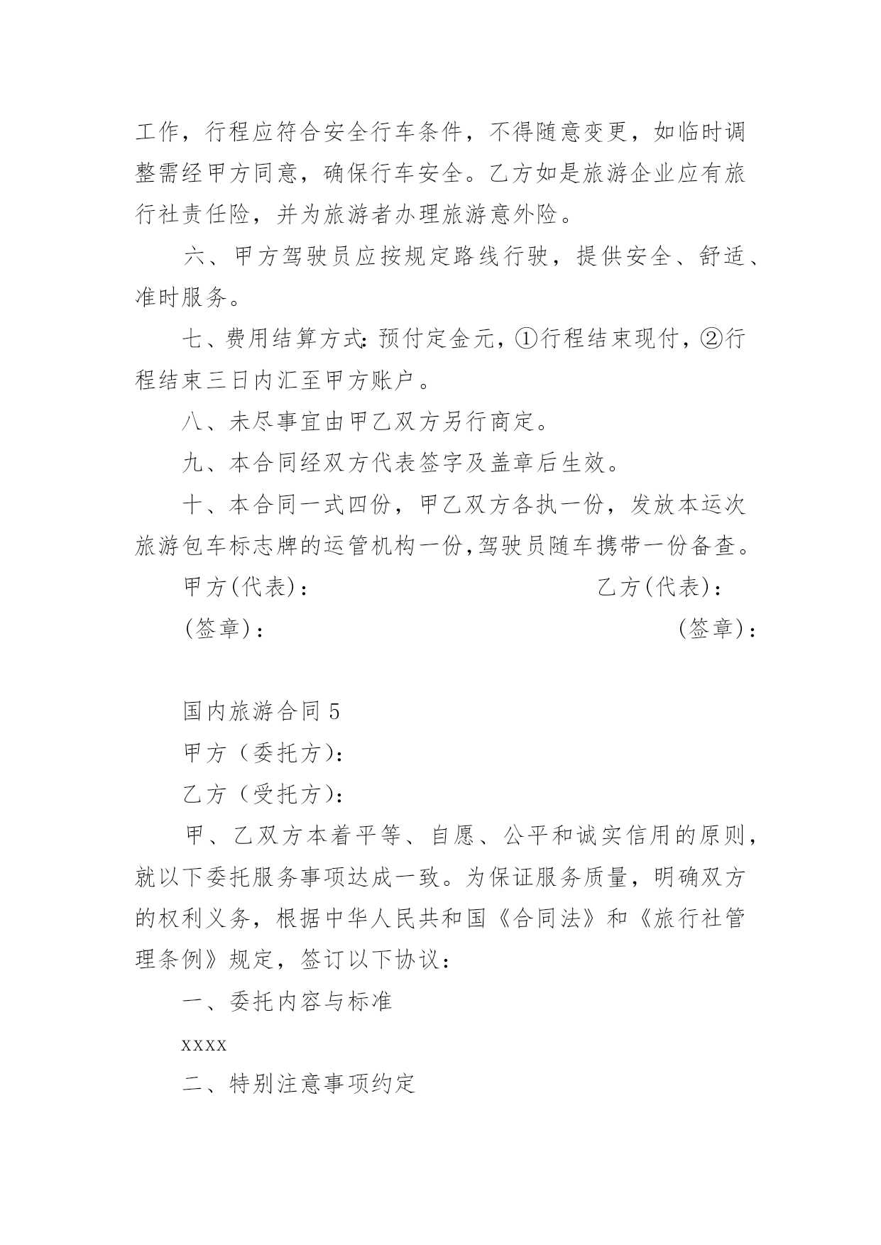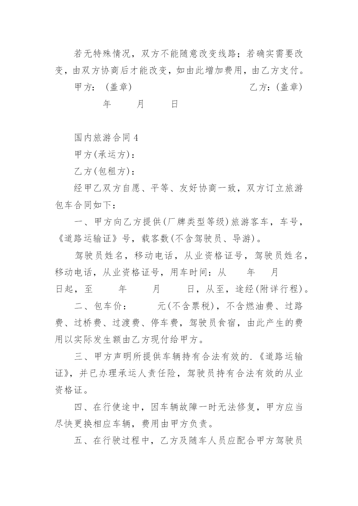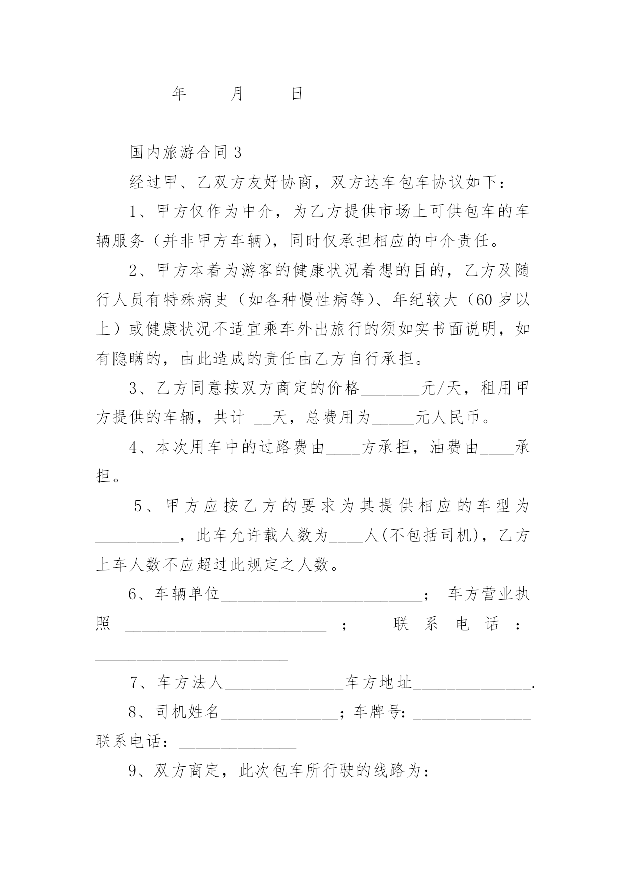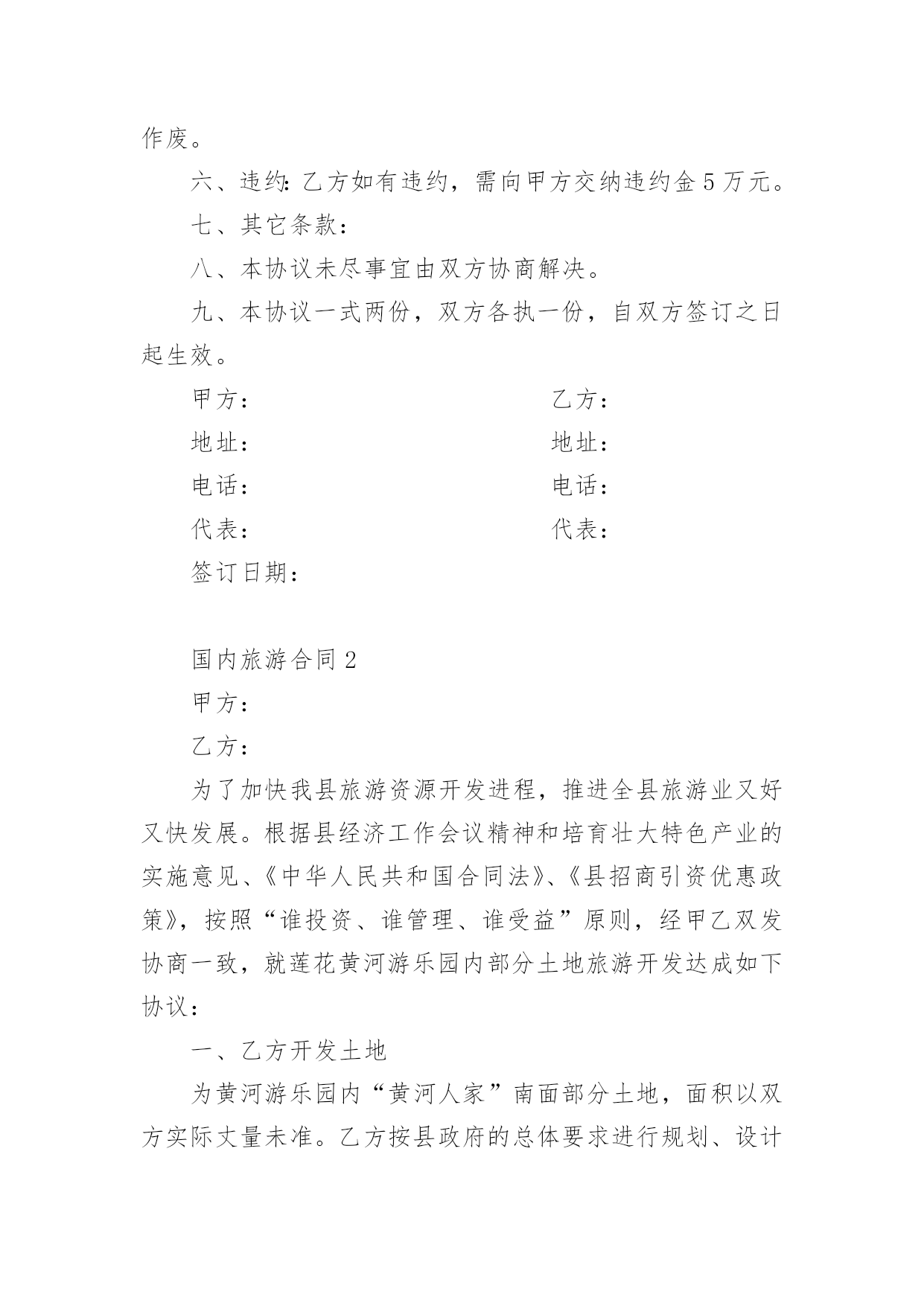 国内旅游合同国内旅游合同怎么写?合同一般由四部分组成:首部、正文、尾部、附件。首部,大多由合同的名称、当事人身份信息、引言等构成。引言主要是讲明签订合同的目的。正文内容可以通过条款的形式进行罗列,大致包括标的、数量、质量、价款、报酬、履行的期限、地点和方式、违约责任、争议解决方式。这些都是基本的条款,缺少任何一个都会给履行结果带来不确定性。大部分合同都是需要结合实际根据以上的基本条款进行扩充的。尾部主要是合同当事人签字栏、附件清单等。附件清单应附在当事人签字栏以上,这样在各方签署合同的同时也就确认了清单的存在。合同附件与合同其他条款具有同等法律效力,如果附件清单不在合同中列明,一旦产生争议可以能会面临举证方面的麻烦。国内旅游合同(精选6篇)随着法治精神地不断发扬,人们愈发重视合同,能够利用到合同的场合越来越多,签订合同能平衡双方当事人的平等地位。那么制定合同书有什么需要注意的呢?下面是小编为大家整理的国内旅游合同(精选6篇),供大家参考借鉴,希望可以帮助到有需要的朋友。国内旅游合同1甲方:乙方:为共同发展旅游事业,加强商业与旅游业合作,保障旅客在旅游活动中的切身利益,为消费者提供最大优惠及安全,甲乙双方本着友好协作,互惠互利的原则,就双方组团旅游事宜,达成如下协议:一、本次旅游项目:青岩寺歪脖老母两日游二、本次旅游期限:xx年4月3日xx年5月7日三、本次旅游由甲乙双方共同承办。票价为人民币:每人100元/次,费用包括往返空调大巴,二正一早用餐,46人/间宾馆住宿及景点门票,旅游安全人身意外伤害保险。四、双方权利及责任:1、甲方应积极宣传组织客源,全力推荐本次旅游项目。2、甲方以发放旅游代金券的形式负责向乙方提供旅游客员,委托乙方组团出游,旅游代金券票面为:65元,由甲方向游客发放,乙方负责向游客收取甲方所发放的旅游代金券,并再向游客收取每人/次35元现金,乙方承担本次旅游全程项目的落实及责任。甲方不承担任何费用及责任。3、乙方负责与游客协调或签订具体出游时间及相关事宜。五、结算:本次旅游活动期限结束,由乙方财务人员按乙方所收取的代金券数量向甲方按每张5元结算,65元代金券自行作废。六、违约:乙方如有违约,需向甲方交纳违约金5万元。七、其它条款:八、本协议未尽事宜由双方协商解决。九、本协议一式两份,双方各执一份,自双方签订之日起生效。甲方:乙方:地址:地址:电话:电话:代表:代表:签订日期:国内旅游合同2甲方:乙方:为了加快我县旅游资源开发进程,推进全县旅游业又好又快发展。根据县经济工作会议精神和培育壮大特色产业的实施意见、《中华人民共和国合同法》、《县招商引资优惠政策》,按照“谁投资、谁管理、谁受益”原则,经甲乙双发协商一致,就莲花黄河游乐园内部分土地旅游开发达成如下协议:一、乙方开发土地为黄河游乐园内“黄河人家”南面部分土地,面积以双方实际丈量未准。乙方按县政府的总体要求进行规划、设计和建设(古典式建筑模式),并绿化美化承包区,乙方得规划和设计方案待县政府审批后方可实施。二、甲方将土地使用权租赁给乙方,期限为40年。乙方在租赁期满后按国家有关规定可优先承包。甲方协助办理相关手续。三、乙方必须年内开工建设并完成。总投资100万元。乙方在国家得法律、法规及政策允许范围内从事旅游开发和经营活动,承包期内不得改变经营性质。四、乙方应加强景区设施、植被得保护;甲方应搞好宣传和推介。五、甲方和莲花镇政府对乙方资金到位情况和建设进度进行监控,自协议签定后两年内乙方不开发建设或不按协议执行的,甲方按照有关法律程序和国家土地政策收回土地使用权,由此产生的损失由乙方全部承担。六、甲方保证“三通”即(水、电、路)。七、若乙方在中途出让或转让使用权,甲方提请县政府研究决定同意后方可进行,否则不准在中途出让或转让使用权。八、本协议未尽事宜,由甲乙双方协商解决,当发生争议和纠纷时,双方协商未果,任何一方有权提请当地仲裁机构仲裁或司法解决。九、协议一式3份,甲乙双方各存一份,存档一份。甲方:(盖章)乙方:(盖章)负责人:负责人:年月日国内旅游合同3经过甲、乙双方友好协商,双方达车包车协议如下:1、甲方仅作为中介,为乙方提供市场上可供包车的车辆服务(并非甲方车辆),同时仅承担相应的中介责任。2、甲方本着为游客的健康状况着想的目的,乙方及随行人员有特殊病史(如各种慢性病等)、年纪较大(60岁以上)或健康状况不适宜乘车外出旅行的须如实书面说明,如有隐瞒的,由此造成的责任由乙方自行承担。3、乙方同意按双方商定的价格_______元/天,租用甲方提供的车辆,共计__天,总费用为_____元人民币。4、本次用车中的过路费由____方承担,油费由____承担。5、甲方应按乙方的要求为其提供相应的车型为__________,此车允许载人数为____人(不包括司机)