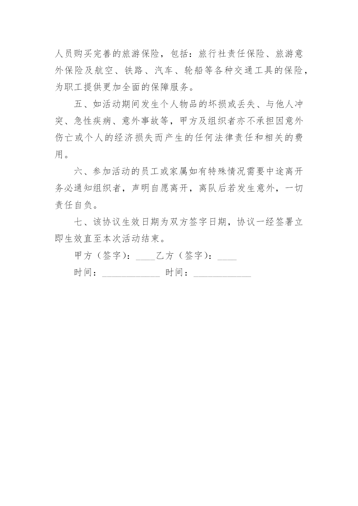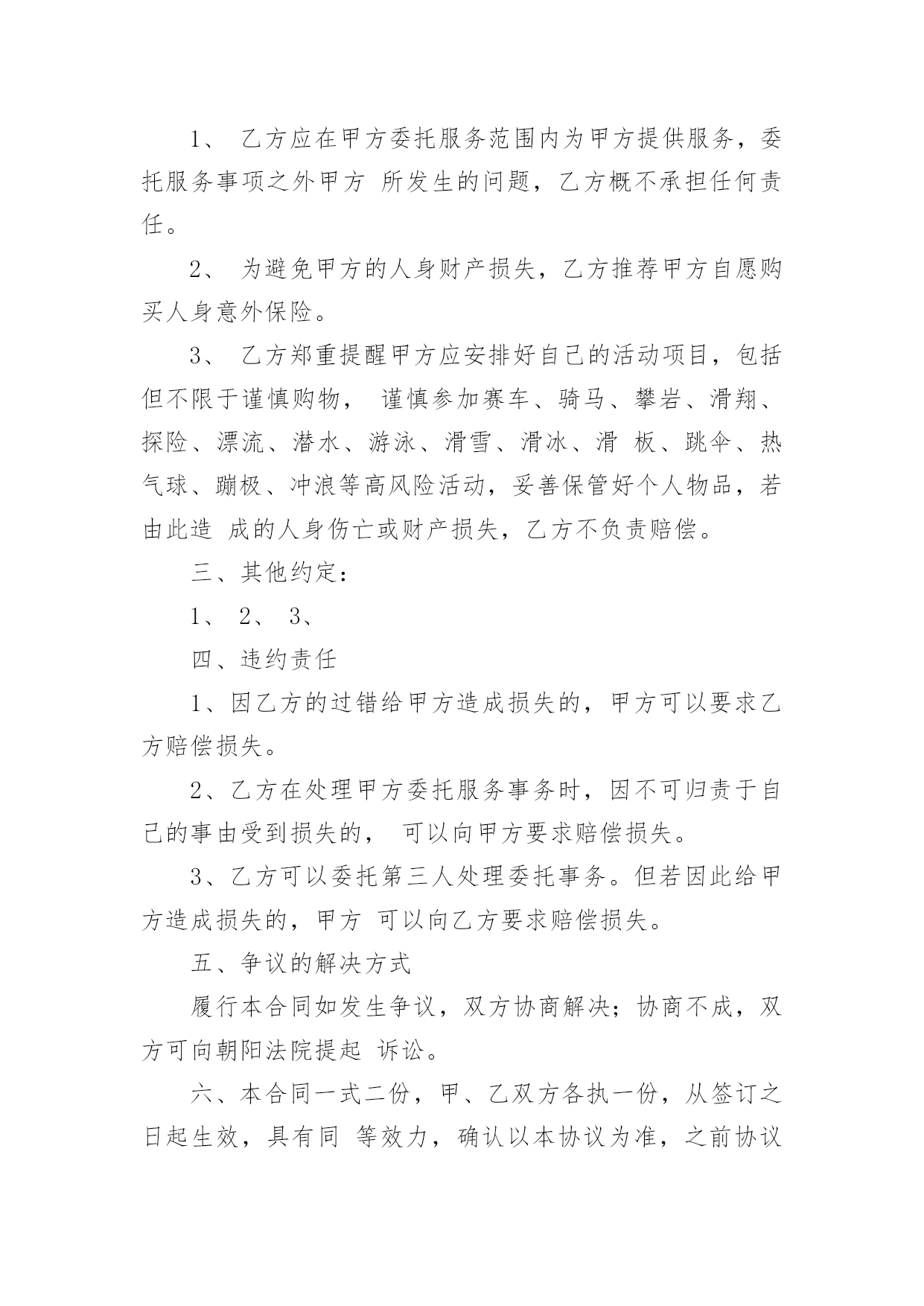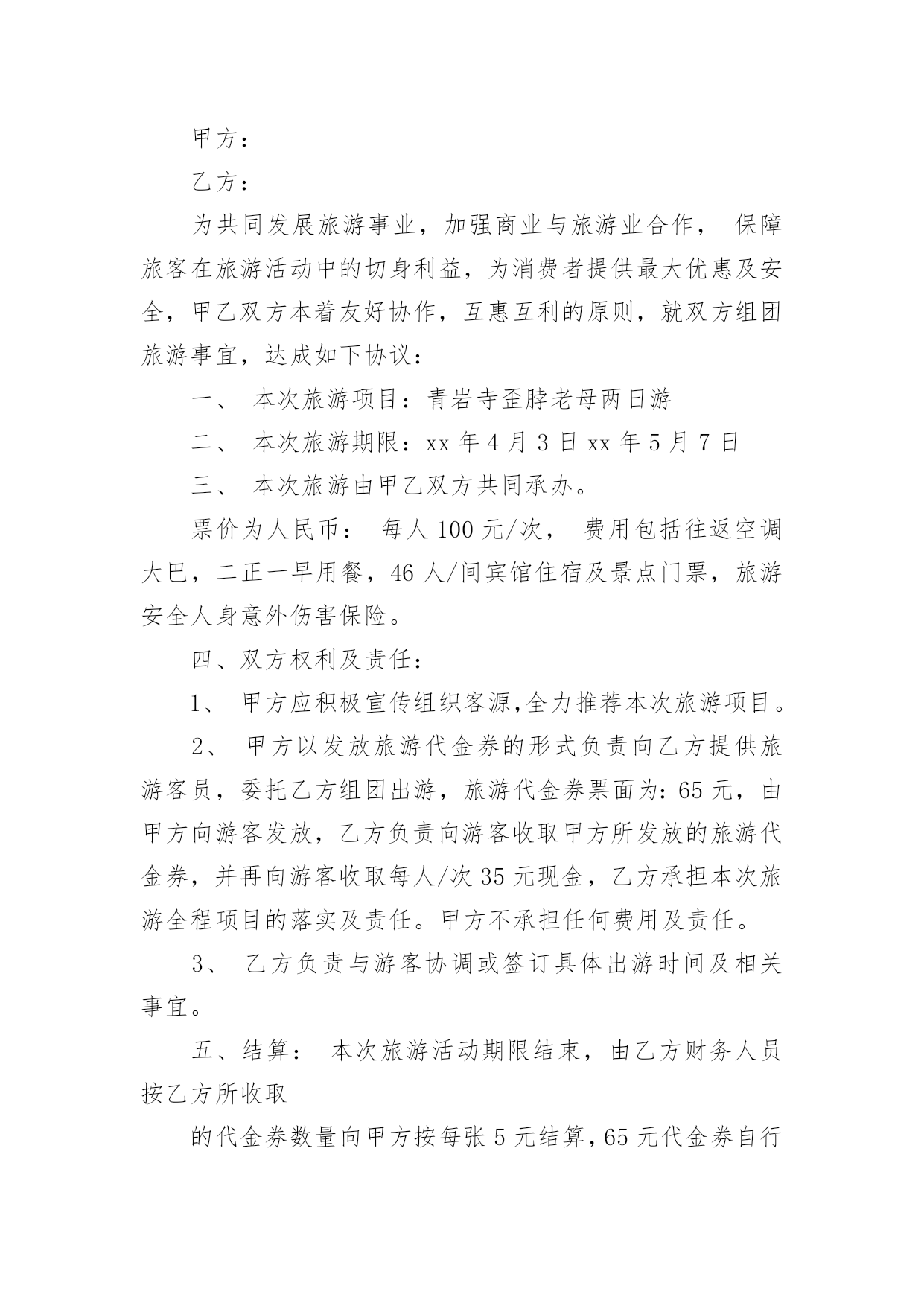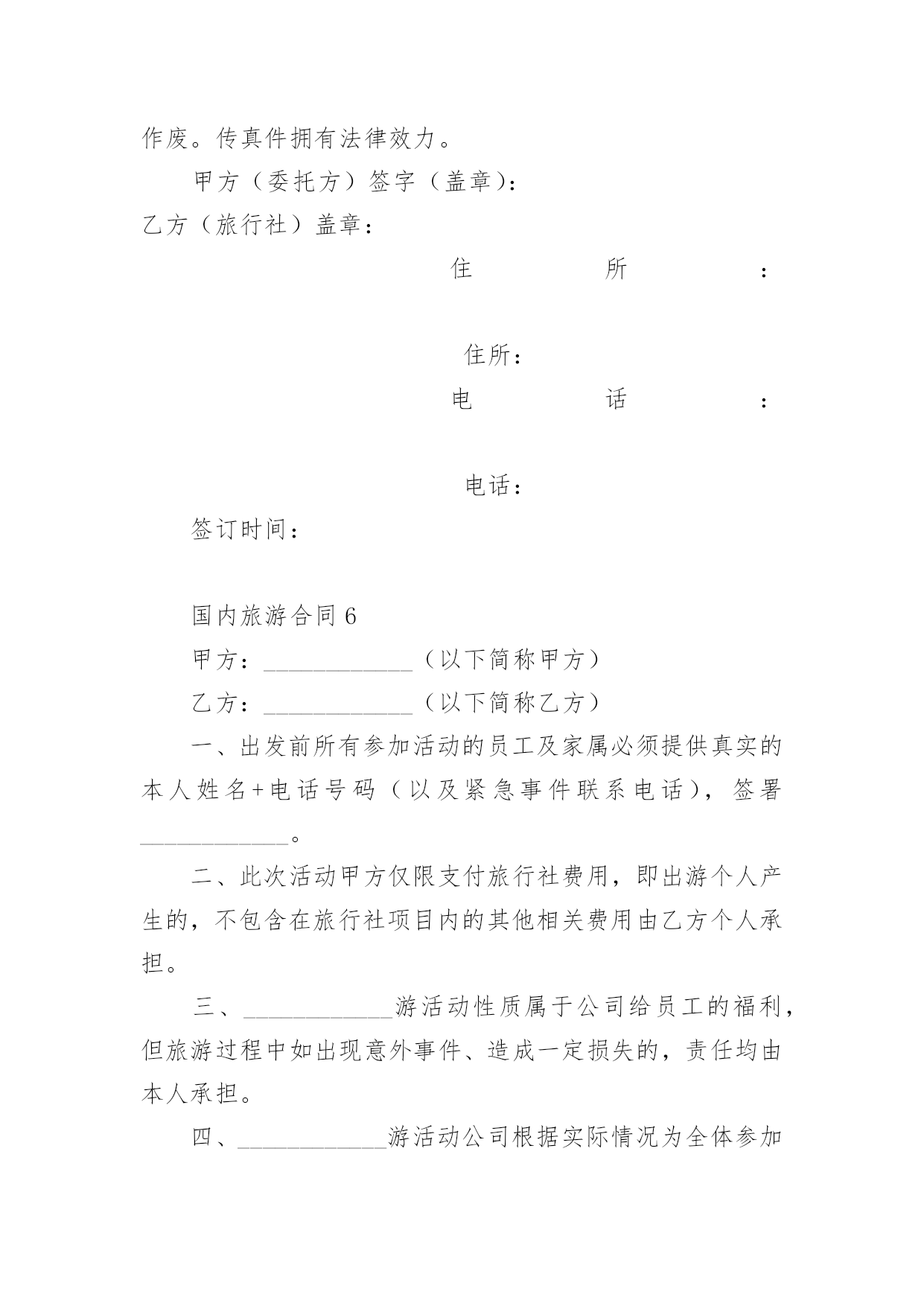 国内旅游合同国内旅游合同怎么写?合同一般由四部分组成:首部、正文、尾部、附件。首部,大多由合同的名称、当事人身份信息、引言等构成。引言主要是讲明签订合同的目的。正文内容可以通过条款的形式进行罗列,大致包括标的、数量、质量、价款、报酬、履行的期限、地点和方式、违约责任、争议解决方式。这些都是基本的条款,缺少任何一个都会给履行结果带来不确定性。大部分合同都是需要结合实际根据以上的基本条款进行扩充的。尾部主要是合同当事人签字栏、附件清单等。附件清单应附在当事人签字栏以上,这样在各方签署合同的同时也就确认了清单的存在。合同附件与合同其他条款具有同等法律效力,如果附件清单不在合同中列明,一旦产生争议可以能会面临举证方面的麻烦。国内旅游合同(精选6篇)随着法治精神地不断发扬,人们愈发重视合同,能够利用到合同的场合越来越多,签订合同能平衡双方当事人的平等地位。那么制定合同书有什么需要注意的呢?下面是小编为大家整理的国内旅游合同(精选6篇),供大家参考借鉴,希望可以帮助到有需要的朋友。国内旅游合同1甲方:乙方:为共同发展旅游事业,加强商业与旅游业合作,保障旅客在旅游活动中的切身利益,为消费者提供最大优惠及安全,甲乙双方本着友好协作,互惠互利的原则,就双方组团旅游事宜,达成如下协议:一、本次旅游项目:青岩寺歪脖老母两日游二、本次旅游期限:xx年4月3日xx年5月7日三、本次旅游由甲乙双方共同承办。票价为人民币:每人100元/次,费用包括往返空调大巴,二正一早用餐,46人/间宾馆住宿及景点门票,旅游安全人身意外伤害保险。四、双方权利及责任:1、甲方应积极宣传组织客源,全力推荐本次旅游项目。2、甲方以发放旅游代金券的形式负责向乙方提供旅游客员,委托乙方组团出游,旅游代金券票面为:65元,由甲方向游客发放,乙方负责向游客收取甲方所发放的旅游代金券,并再向游客收取每人/次35元现金,乙方承担本次旅游全程项目的落实及责任。甲方不承担任何费用及责任。3、乙方负责与游客协调或签订具体出游时间及相关事宜。五、结算:本次旅游活动期限结束,由乙方财务人员按乙方所收取的代金券数量向甲方按每张5元结算,65元代金券自行作废。六、违约:乙方如有违约,需向甲方交纳违约金5万元。七、其它条款:八、本协议未尽事宜由双方协商解决。九、本协议一式两份,双方各执一份,自双方签订之日起生效。甲方:乙方:地址:地址:电话:电话:代表:代表:签订日期:国内旅游合同2甲方:乙方:为了加快我县旅游资源开发进程,推进全县旅游业又好又快发展。根据县经济工作会议精神和培育壮大特色产业的实施意见、《中华人民共和国合同法》、《县招商引资优惠政策》,按照“谁投资、谁管理、谁受益”原则,经甲乙双发协商一致,就莲花黄河游乐园内部分土地旅游开发达成如下协议:一、乙方开发土地为黄河游乐园内“黄河人家”南面部分土地,面积以双方实际丈量未准。乙方按县政府的总体要求进行规划、设计和建设(古典式建筑模式),并绿化美化承包区,乙方得规划和设计方案待县政府审批后方可实施。二、甲方将土地使用权租赁给乙方,期限为40年。乙方在租赁期满后按国家有关规定可优先承包。甲方协助办理相关手续。三、乙方必须年内开工建设并完成。总投资100万元。乙方在国家得法律、法规及政策允许范围内从事旅游开发和经营活动,承包期内不得改变经营性质。四、乙方应加强景区设施、植被得保护;甲方应搞好宣传和推介。五、甲方和莲花镇政府对乙方资金到位情况和建设进度进行监控,自协议签定后两年内乙方不开发建设或不按协议执行的,甲方按照有关法律程序和国家土地政策收回土地使用权,由此产生的损失由乙方全部承担。六、甲方保证“三通”即(水、电、路)。七、若乙方在中途出让或转让使用权,甲方提请县政府研究决定同意后方可进行,否则不准在中途出让或转让使用权。八、本协议未尽事宜,由甲乙双方协商解决,当发生争议和纠纷时,双方协商未果,任何一方有权提请当地仲裁机构仲裁或司法解决。九、协议一式3份,甲乙双方各存一份,存档一份。甲方:(盖章)乙方:(盖章)负责人:负责人:年月日国内旅游合同3经过甲、乙双方友好协商,双方达车包车协议如下:1、甲方仅作为中介,为乙方提供市场上可供包车的车辆服务(并非甲方车辆),同时仅承担相应的中介责任。2、甲方本着为游客的健康状况着想的目的,乙方及随行人员有特殊病史(如各种慢性病等)、年纪较大(60岁以上)或健康状况不适宜乘车外出旅行的须如实书面说明,如有隐瞒的,由此造成的责任由乙方自行承担。3、乙方同意按双方商定的价格_______元/天,租用甲方提供的车辆,共计__天,总费用为_____元人民币。4、本次用车中的过路费由____方承担,油费由____承担。5、甲方应按乙方的要求为其提供相应的车型为__________,此车允许载人数为____人(不包括司机)