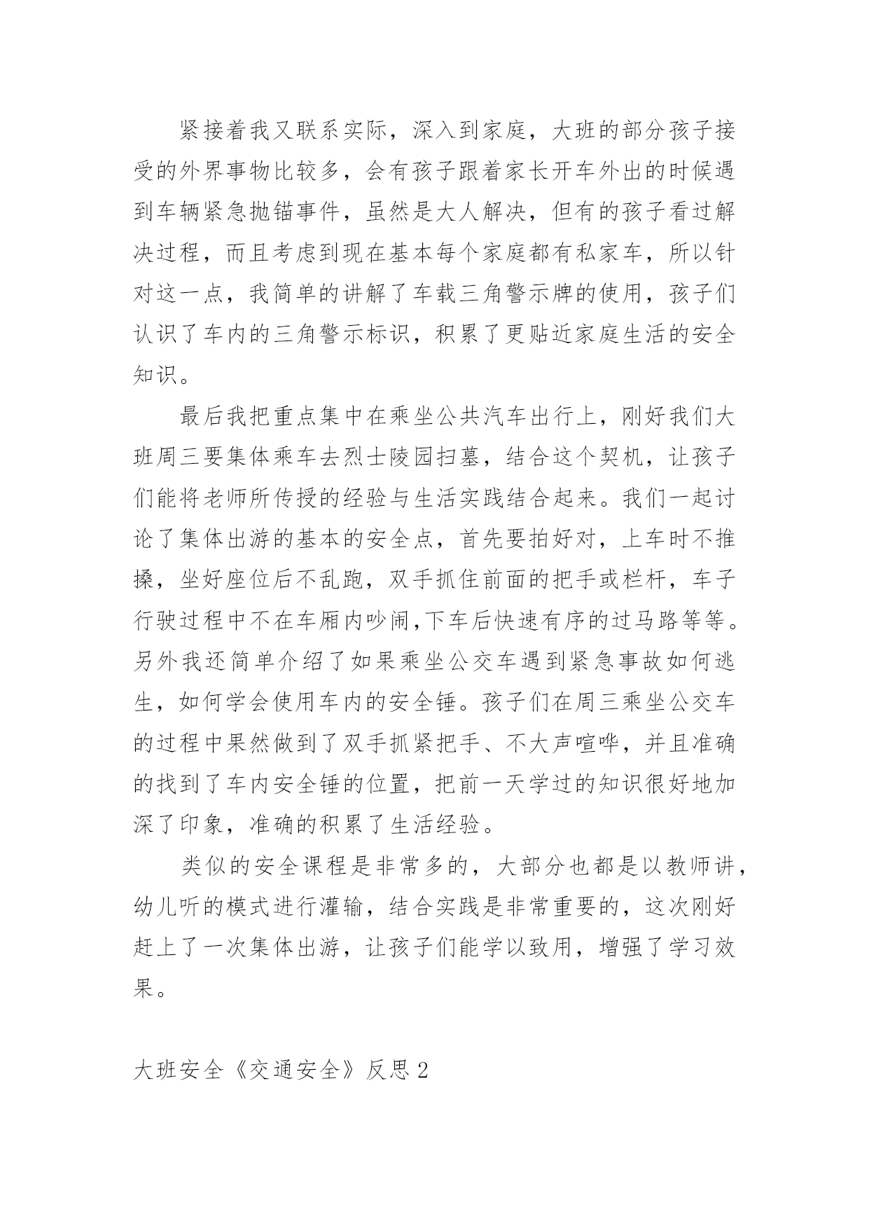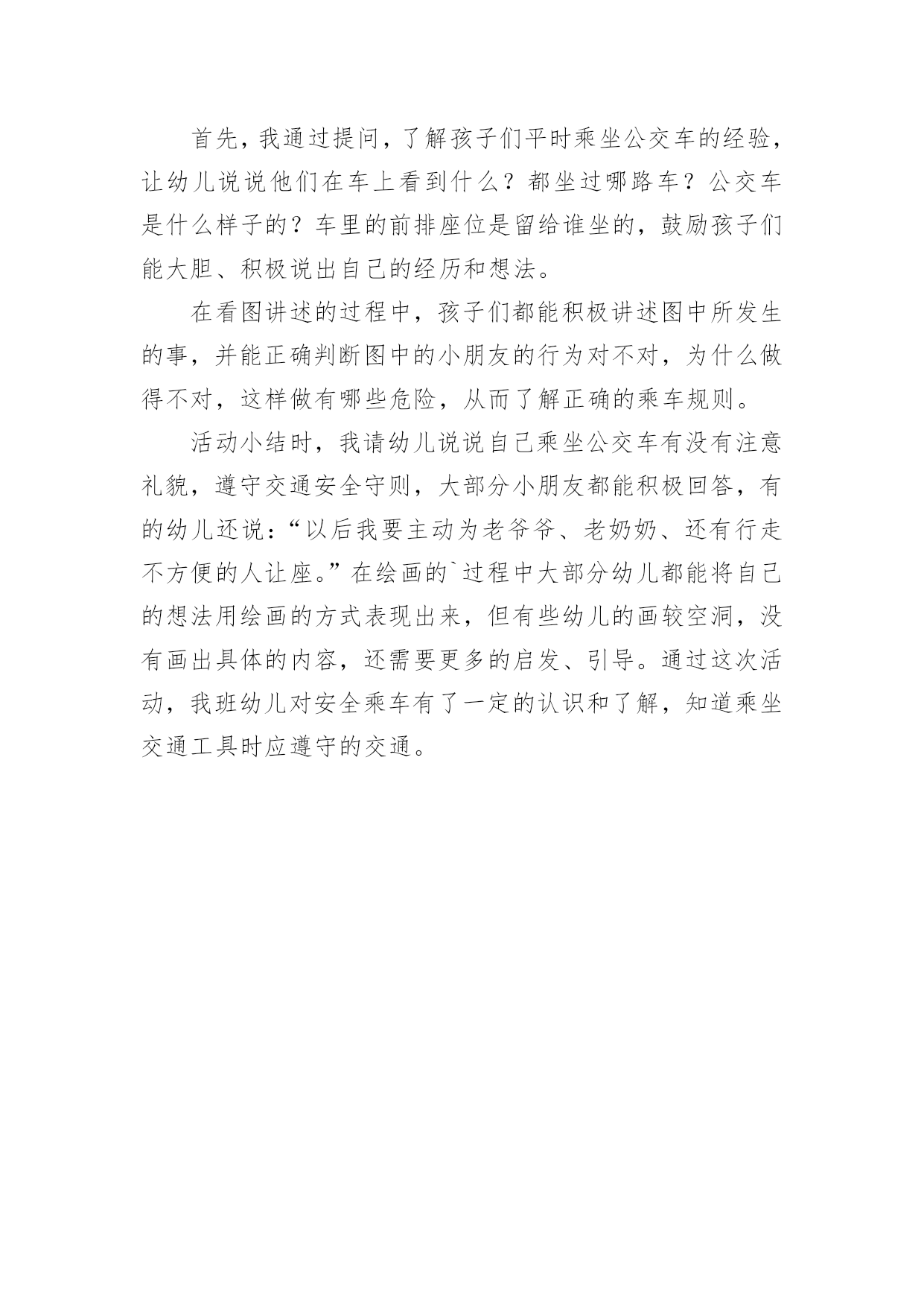 大班安全《交通安全》反思在现实社会中,课堂教学是重要的任务之一,反思指回头、反过来思考的意思。反思我们应该怎么写呢?以下是小编收集整理的大班安全《交通安全》反思,欢迎大家分享。大班安全《交通安全》反思1关于交通安全的课程活动,我们班级已经组织了很多次了,幼儿对简单的基本的交通安全问题和注意事项都有了一定的了解,于是我们换角度,不再将以前的知识反复讲,而是加入更加贴近家庭生活,从出行遇到紧急事件该怎样解决这个角度来一起讨论,结合幼儿生活经验,总结一些简单的急救知识。首先我让孩子们自己总结了他们所知道的有关交通安全小知识,这很好的帮助幼儿回忆以往所学知识并且锻炼了他们的表达和概括能力。接着我向幼儿展示了几种不同的交通事故的现场图片,幼儿看到图片后纷纷表示惊讶,然后我们一起讨论了这些事故是怎么发生的,是什么原因造成的,并且怎么预防。孩子们都发表了自己的看法,大家集体总结,开车的'时候不能离前面的车子太近,容易发生追尾,过红绿灯的时候不能抢黄灯,要等一等,开车的时候不能打电话或者喝酒等等。对于几种常见的事故类型可能幼儿接触的不多,并不能明确分辨。紧接着我又联系实际,深入到家庭,大班的部分孩子接受的外界事物比较多,会有孩子跟着家长开车外出的时候遇到车辆紧急抛锚事件,虽然是大人解决,但有的孩子看过解决过程,而且考虑到现在基本每个家庭都有私家车,所以针对这一点,我简单的讲解了车载三角警示牌的使用,孩子们认识了车内的三角警示标识,积累了更贴近家庭生活的安全知识。最后我把重点集中在乘坐公共汽车出行上,刚好我们大班周三要集体乘车去烈士陵园扫墓,结合这个契机,让孩子们能将老师所传授的经验与生活实践结合起来。我们一起讨论了集体出游的基本的安全点,首先要拍好对,上车时不推搡,坐好座位后不乱跑,双手抓住前面的把手或栏杆,车子行驶过程中不在车厢内吵闹,下车后快速有序的过马路等等。另外我还简单介绍了如果乘坐公交车遇到紧急事故如何逃生,如何学会使用车内的安全锤。孩子们在周三乘坐公交车的过程中果然做到了双手抓紧把手、不大声喧哗,并且准确的找到了车内安全锤的位置,把前一天学过的知识很好地加深了印象,准确的积累了生活经验。类似的安全课程是非常多的,大部分也都是以教师讲,幼儿听的模式进行灌输,结合实践是非常重要的,这次刚好赶上了一次集体出游,让孩子们能学以致用,增强了学习效果。大班安全《交通安全》反思2首先,我通过提问,了解孩子们平时乘坐公交车的经验,让幼儿说说他们在车上看到什么?都坐过哪路车?公交车是什么样子的?车里的前排座位是留给谁坐的,鼓励孩子们能大胆、积极说出自己的经历和想法。在看图讲述的过程中,孩子们都能积极讲述图中所发生的事,并能正确判断图中的小朋友的行为对不对,为什么做得不对,这样做有哪些危险,从而了解正确的乘车规则。活动小结时,我请幼儿说说自己乘坐公交车有没有注意礼貌,遵守交通安全守则,大部分小朋友都能积极回答,有的幼儿还说:“以后我要主动为老爷爷、老奶奶、还有行走不方便的人让座。”在绘画的`过程中大部分幼儿都能将自己的想法用绘画的方式表现出来,但有些幼儿的画较空洞,没有画出具体的内容,还需要更多的启发、引导。通过这次活动,我班幼儿对安全乘车有了一定的认识和了解,知道乘坐交通工具时应遵守的交通。
