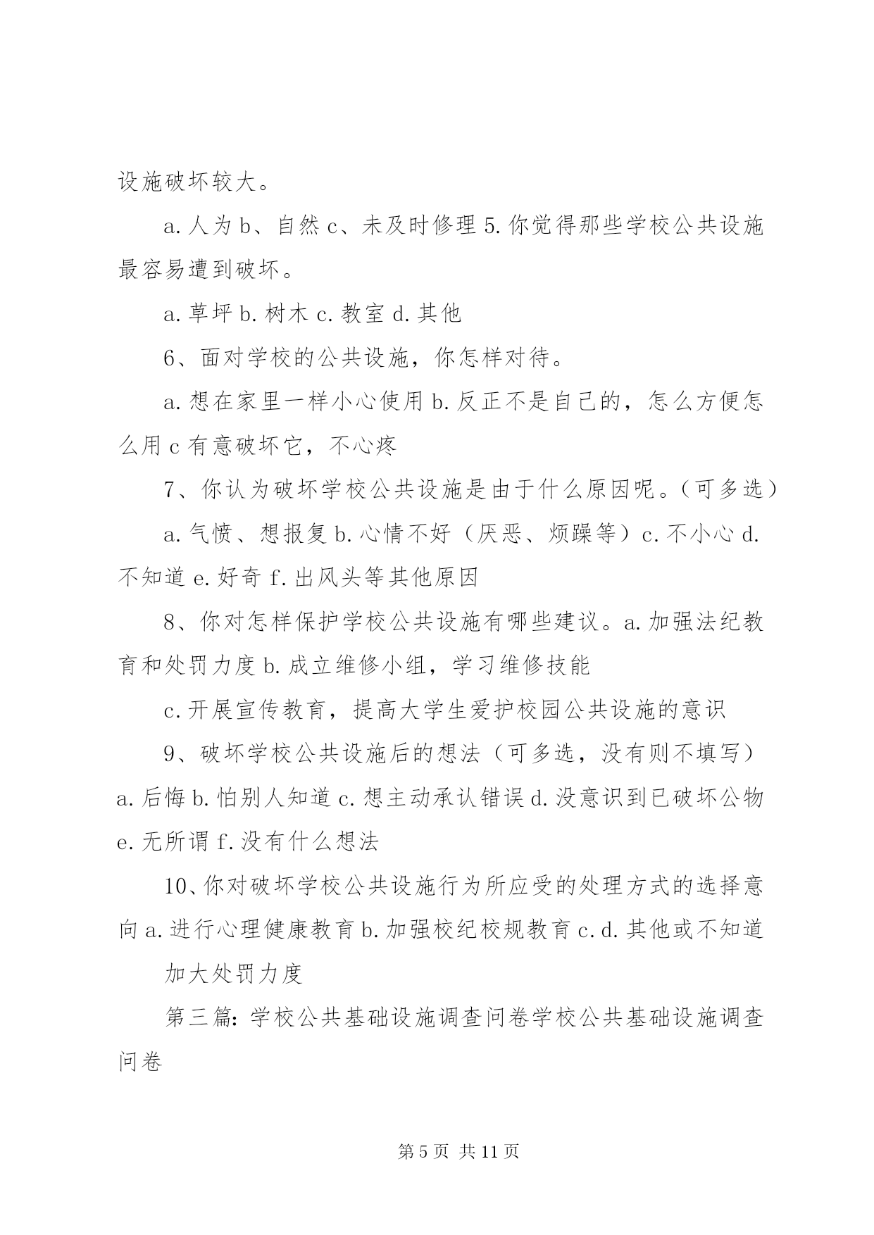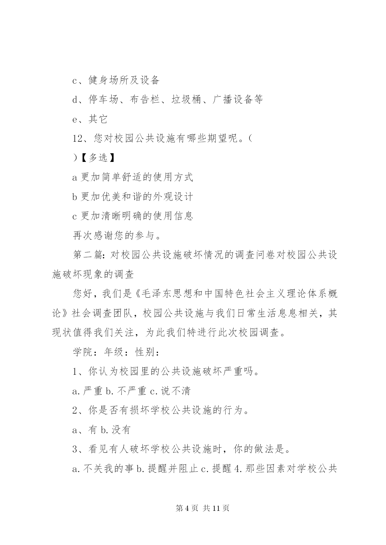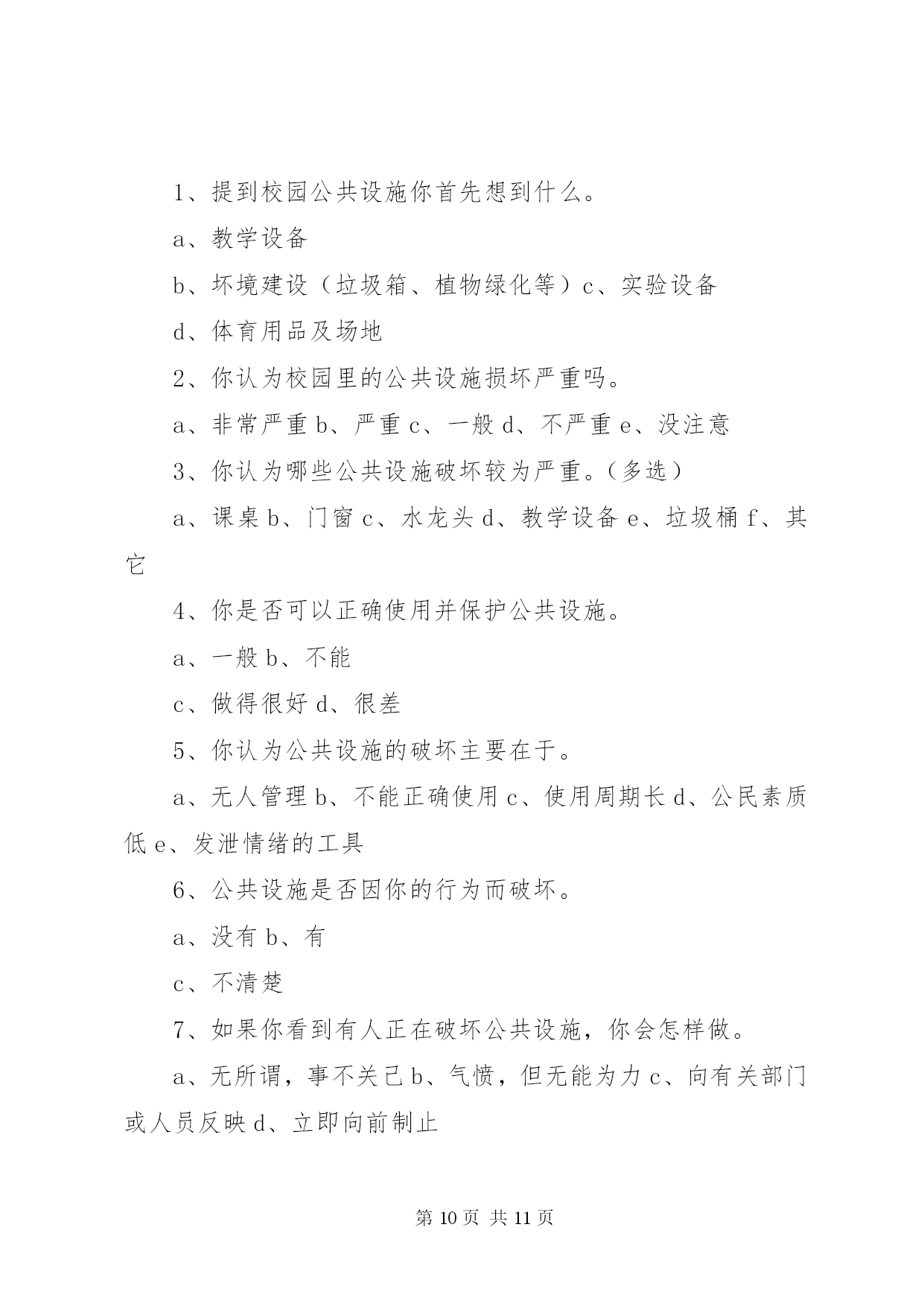第PAGE\*Arabic\*MERGEFORMAT11页共NUMPAGES\*MERGEFORMAT11页校园公共设施调查问卷亲爱的同学:感谢您参与此次问卷调查。该调查的目的在于。为构建和谐及人性化校园提供一些参考和依据。此问卷不会泄露您的任何信息,希望您能认真填写以下问卷,感谢您的合作。您所在学校为:1、您认为校园公共设施对一个学校意味着什么。()【多选】a、学校形象b、学生学习条件c、校园文化2、目前一些学校建筑物出现裂缝(或其他质量问题),您认为可能的原因有(a、工期短、质量差b、地基不稳c、资金短缺、投入不足d、管理不善、维护不周e、自然因素f、其它3、学校多媒体出现故障的频率()【单选】a、较高b、一般c、偶尔d、没有4、本校残疾人卫生间的情况()【单选】a、有、开放b、有、不开放c、无5、本校普通卫生间的情况()【多选】a、干净、整洁b、脏、乱、差c、卫生间设备(如:水龙头、门扣等)损坏严重d、卫生间设备(如:水龙头、门扣等)损坏一般e、无上述情况6、您认为学校提供的娱乐健身设备和场所的情况是()【多选】a、设备不齐全且数量少、质量差b、设备齐全且数量、质量尚可c、距离远、开放时间不合理、使用不方便d、距离适中、开放时间合理、使用方便7、本校atm自助取款机的服务情况是()【单选】a、种类多、存取方便b、种类少、存取难、手续费贵c、其它【多选】)8、您认为校医院的服务情况如何()【单选】a、服务态度差、医疗设备不齐全b、服务态度好、医疗设备齐全c、不知道9、您认为校园绿化存在哪些问题()【多选】a、缺乏亭廊、游园、休闲椅、庭荫凳b、观赏性绿地多,缺乏学习、交流、休憩的实用性空间c、日常维护管理方法不科学d、缺少可以自由采摘水果的果树e、管理方不允许学生在草坪上休息或学习等10、您对学校道路设有斑马线有何看法()【单选】a、学校道路不等于公路,校内应提倡限速,车让人是理所应当,符合人性化要求,无需设置b、斑马线不是红绿灯,对行驶车辆无强制约束力,无需设置c、学校有一定的交通流量,设置斑马线为保护学生安全提供了可能d、无所谓11、您认为校园内需要增添哪些公共设施。()【多选】a、电子自助设备(如:自助查询机、话费机等)b、休闲吧、小吃店等娱乐场所c、健身场所及设备d、停车场、布告栏、垃圾桶、广播设备等e、其它12、您对校园公共设施有哪些期望呢。()【多选】a更加简单舒适的使用方式b更加优美和谐的外观设计c更加清晰明确的使用信息再次感谢您的参与。第二篇:对校园公共设施破坏情况的调查问卷对校园公共设施破坏现象的调查您好,我们是《毛泽东思想和中国特色社会主义理论体系概论》社会调查团队,校园公共设施与我们日常生活息息相关,其现状值得我们关注,为此我们特进行此次校园调查。学院:年级:性别:1、你认为校园里的公共设施破坏严重吗。a.严重b.不严重c.说不清2、你是否有损坏学校公共设施的行为。a、有b.没有3、看见有人破坏学校公共设施时,你的做法是。a.不关我的事b.提醒并阻止c.提醒4.那些因素对学校公共设施破坏较大。a.人为b、自然c、未及时修理5.你觉得那些学校公共设施最容易遭到破坏。a.草坪b.树木c.教室d.其他6、面对学校的公共设施,你怎样对待。a.想在家里一样小心使用b.反正不是自己的,怎么方便怎么用c有意破坏它,不心疼7、你认为破坏学校公共设施是由于什么原因呢。(可多选)a.气愤、想报复b.心情不好(厌恶、烦躁等)c.不小心d.不知道e.好奇f.出风头等其他原因8、你对怎样保护学校公共设施有哪些建议。a.加强法纪教育和处罚力度b.成立维修小组,学习维修技能c.开展宣传教育,提高大学生爱护校园公共设施的意识9、破坏学校公共设施后的想法(可多选,没有则不填写)a.后悔b.怕别人知道c.想主动承认错误d.没意识到已破坏公物e.无所谓f.没有什么想法10、你对破坏学校公共设施行为所应受的处理方式的选择意向a.进行心理健康教育b.加强校纪校规教育c.d.其他或不知道加大处罚力度第三篇:学校公共基础设施调查问卷学校公共基础设施调查问卷亲爱的同学:感谢您参与此次问卷调查。调查的目的在于。了解同学们对本校的公共基础设施的意见。此问卷不会泄露您的任何信息,希望您能认真填写以下问卷,感谢您的合作。1、您经常在哪些教学楼上课。【多选】a、一教b、三教c、五教d、八教2、您认为哪幢教学楼的基础教学设施比较齐全和完善。a、一教b、三教c、五教d、八教3、您认为不同的基础教学设施对您的学习有影响吗。a、影响很大b、有点,但无所谓c、完全没影响4、您认为校园公共基础设施对一个学校意味着什么。【多选】a、学校形象b、学生学习条件c、校园文化5、学校多媒体出现故障的频率a、经常b、偶尔c没有6、你认为自习场地是否够用。a、