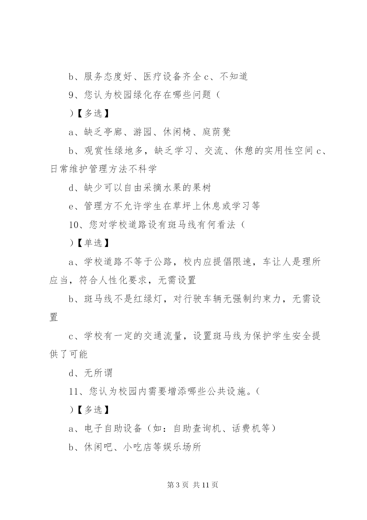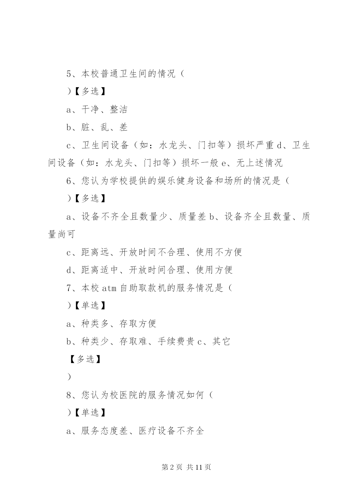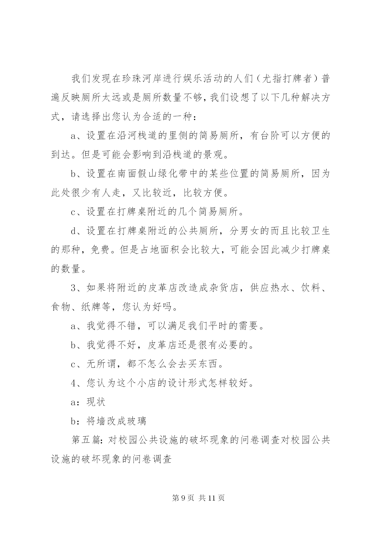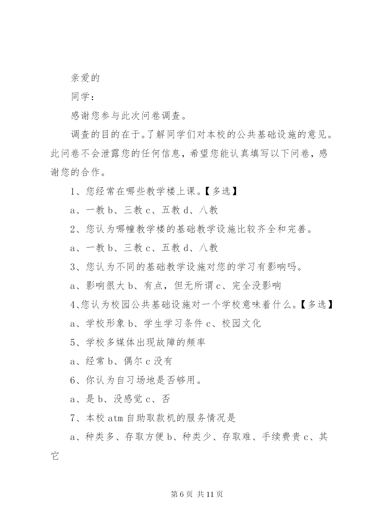 第PAGE\*Arabic\*MERGEFORMAT11页共NUMPAGES\*MERGEFORMAT11页校园公共设施调查问卷亲爱的同学:感谢您参与此次问卷调查。该调查的目的在于。为构建和谐及人性化校园提供一些参考和依据。此问卷不会泄露您的任何信息,希望您能认真填写以下问卷,感谢您的合作。您所在学校为:1、您认为校园公共设施对一个学校意味着什么。()【多选】a、学校形象b、学生学习条件c、校园文化2、目前一些学校建筑物出现裂缝(或其他质量问题),您认为可能的原因有(a、工期短、质量差b、地基不稳c、资金短缺、投入不足d、管理不善、维护不周e、自然因素f、其它3、学校多媒体出现故障的频率()【单选】a、较高b、一般c、偶尔d、没有4、本校残疾人卫生间的情况()【单选】a、有、开放b、有、不开放c、无5、本校普通卫生间的情况()【多选】a、干净、整洁b、脏、乱、差c、卫生间设备(如:水龙头、门扣等)损坏严重d、卫生间设备(如:水龙头、门扣等)损坏一般e、无上述情况6、您认为学校提供的娱乐健身设备和场所的情况是()【多选】a、设备不齐全且数量少、质量差b、设备齐全且数量、质量尚可c、距离远、开放时间不合理、使用不方便d、距离适中、开放时间合理、使用方便7、本校atm自助取款机的服务情况是()【单选】a、种类多、存取方便b、种类少、存取难、手续费贵c、其它【多选】)8、您认为校医院的服务情况如何()【单选】a、服务态度差、医疗设备不齐全b、服务态度好、医疗设备齐全c、不知道9、您认为校园绿化存在哪些问题()【多选】a、缺乏亭廊、游园、休闲椅、庭荫凳b、观赏性绿地多,缺乏学习、交流、休憩的实用性空间c、日常维护管理方法不科学d、缺少可以自由采摘水果的果树e、管理方不允许学生在草坪上休息或学习等10、您对学校道路设有斑马线有何看法()【单选】a、学校道路不等于公路,校内应提倡限速,车让人是理所应当,符合人性化要求,无需设置b、斑马线不是红绿灯,对行驶车辆无强制约束力,无需设置c、学校有一定的交通流量,设置斑马线为保护学生安全提供了可能d、无所谓11、您认为校园内需要增添哪些公共设施。()【多选】a、电子自助设备(如:自助查询机、话费机等)b、休闲吧、小吃店等娱乐场所c、健身场所及设备d、停车场、布告栏、垃圾桶、广播设备等e、其它12、您对校园公共设施有哪些期望呢。()【多选】a更加简单舒适的使用方式b更加优美和谐的外观设计c更加清晰明确的使用信息再次感谢您的参与。第二篇:对校园公共设施破坏情况的调查问卷对校园公共设施破坏现象的调查您好,我们是《毛泽东思想和中国特色社会主义理论体系概论》社会调查团队,校园公共设施与我们日常生活息息相关,其现状值得我们关注,为此我们特进行此次校园调查。学院:年级:性别:1、你认为校园里的公共设施破坏严重吗。a.严重b.不严重c.说不清2、你是否有损坏学校公共设施的行为。a、有b.没有3、看见有人破坏学校公共设施时,你的做法是。a.不关我的事b.提醒并阻止c.提醒4.那些因素对学校公共设施破坏较大。a.人为b、自然c、未及时修理5.你觉得那些学校公共设施最容易遭到破坏。a.草坪b.树木c.教室d.其他6、面对学校的公共设施,你怎样对待。a.想在家里一样小心使用b.反正不是自己的,怎么方便怎么用c有意破坏它,不心疼7、你认为破坏学校公共设施是由于什么原因呢。(可多选)a.气愤、想报复b.心情不好(厌恶、烦躁等)c.不小心d.不知道e.好奇f.出风头等其他原因8、你对怎样保护学校公共设施有哪些建议。a.加强法纪教育和处罚力度b.成立维修小组,学习维修技能c.开展宣传教育,提高大学生爱护校园公共设施的意识9、破坏学校公共设施后的想法(可多选,没有则不填写)a.后悔b.怕别人知道c.想主动承认错误d.没意识到已破坏公物e.无所谓f.没有什么想法10、你对破坏学校公共设施行为所应受的处理方式的选择意向a.进行心理健康教育b.加强校纪校规教育c.d.其他或不知道加大处罚力度第三篇:学校公共基础设施调查问卷学校公共基础设施调查问卷亲爱的同学:感谢您参与此次问卷调查。调查的目的在于。了解同学们对本校的公共基础设施的意见。此问卷不会泄露您的任何信息,希望您能认真填写以下问卷,感谢您的合作。1、您经常在哪些教学楼上课。【多选】a、一教b、三教c、五教d、八教2、您认为哪幢教学楼的基础教学设施比较齐全和完善。a、一教b、三教c、五教d、八教3、您认为不同的基础教学设施对您的学习有影响吗。a、影响很大b、有点,但无所谓c、完全没影响4、您认为校园公共基础设施对一个学校意味着什么。【多选】a、学校形象b、学生学习条件c、校园文化5、学校多媒体出现故障的频率a、经常b、偶尔c没有6、你认为自习场地是否够用。a、