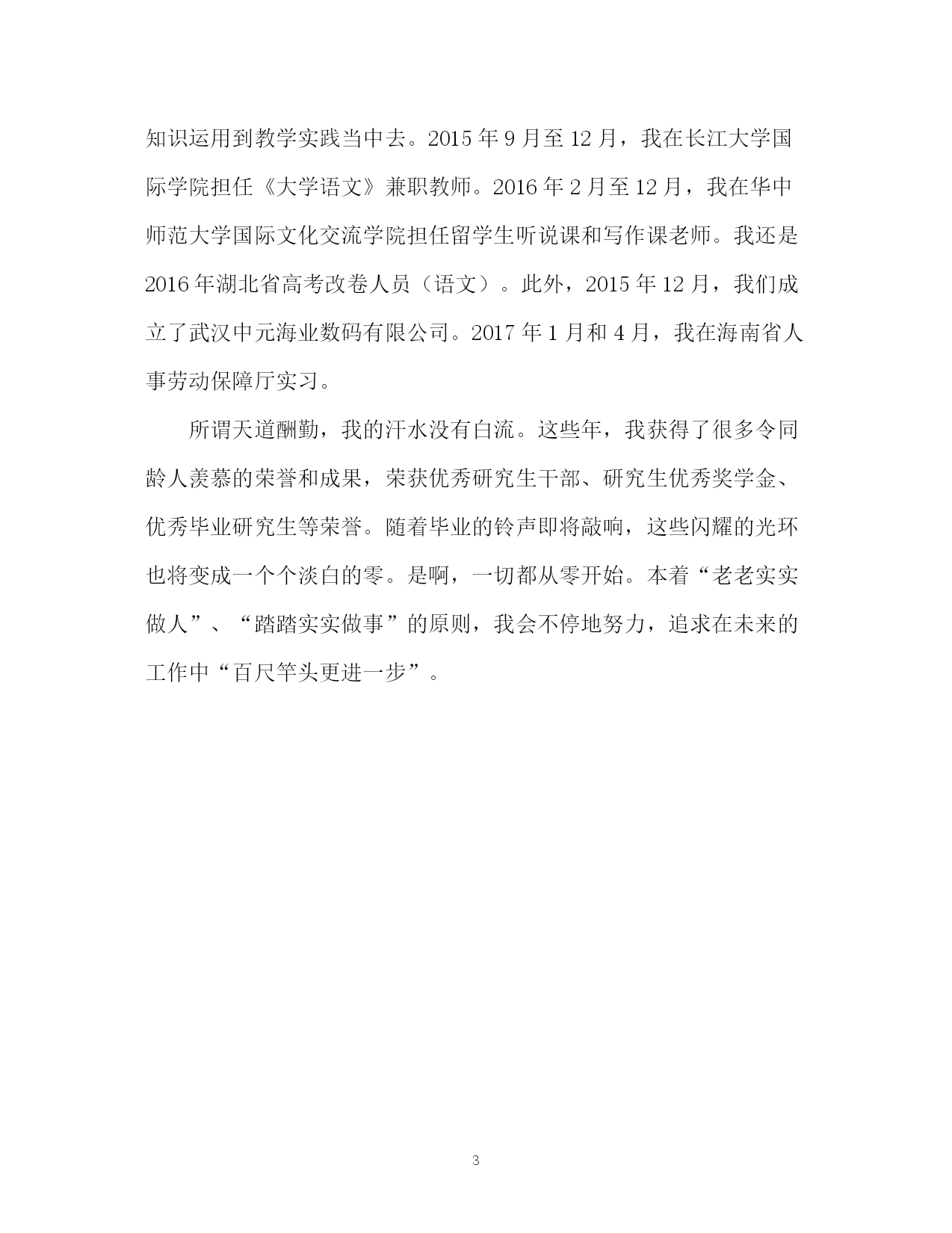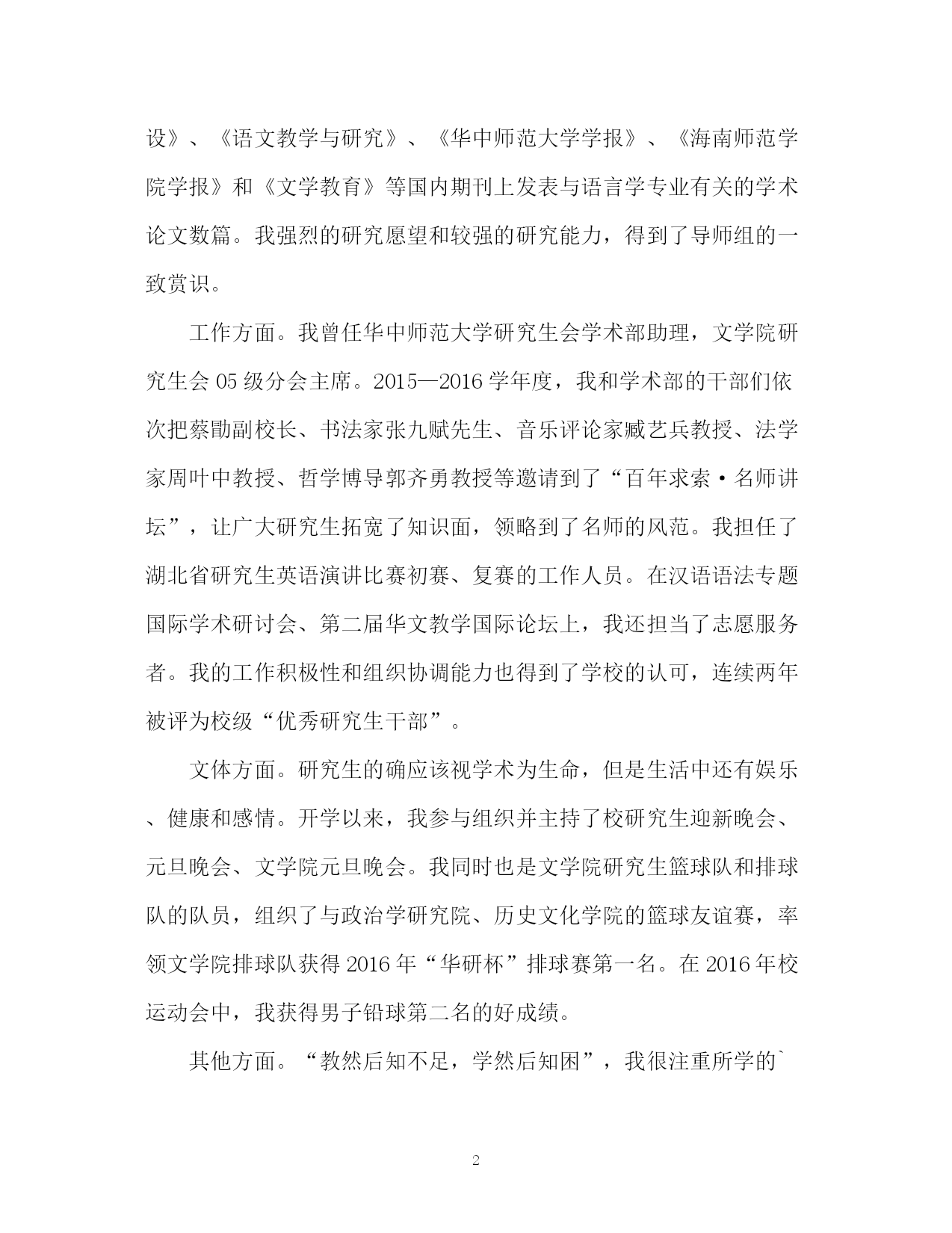 此资料由网络收集而来,如有侵权请告知上传者立即删除。资料共分享,我们负责传递知识。PAGEPAGE3语言学专业研究生自我鉴定语言学专业研究生自我鉴定在华中师范大学攻读硕士学位的两年研究生生活,是我生活压力最大、经济负担最重、学业收获最多的求学阶段。在老师的关心、同学的帮助和自身的努力下,我的研究生生涯可谓是风风火火、无怨无悔。思想方面。我认真学习马克思列宁主义、毛泽东思想、xxx理论和“三个代表”重要思想;关心时事政治,关心学校的改革与发展;拥护党的路线、方针和政策,能认真执行学校、院的决议;尊敬导师、团结同学、乐于助人、勇于奉献,具有良好的道德品质和思想修养;能遵守国家法律、法令和学校各项规章制度。作为一名中共党员和一名学生干部,我始终努力学习、积极工作,充分发挥学生干部的模范带头作用学业方面。我的研究方向为应用语言学,主要研究兴趣为现代汉语语法、社会语言学、文化语言学。我学术思想活跃,学习目的明确,态度端正,学风良好,勤奋好学,刻苦钻研,成绩优秀;早已经通过国家英语六级考试;以第一作者的身份在《汉语学习》、《语文建设》、《语文教学与研究》、《华中师范大学学报》、《海南师范学院学报》和《文学教育》等国内期刊上发表与语言学专业有关的学术论文数篇。我强烈的研究愿望和较强的研究能力,得到了导师组的一致赏识。工作方面。我曾任华中师范大学研究生会学术部助理,文学院研究生会05级分会主席。2015—2016学年度,我和学术部的干部们依次把蔡勖副校长、书法家张九赋先生、音乐评论家臧艺兵教授、法学家周叶中教授、哲学博导郭齐勇教授等邀请到了“百年求索·名师讲坛”,让广大研究生拓宽了知识面,领略到了名师的风范。我担任了湖北省研究生英语演讲比赛初赛、复赛的工作人员。在汉语语法专题国际学术研讨会、第二届华文教学国际论坛上,我还担当了志愿服务者。我的工作积极性和组织协调能力也得到了学校的认可,连续两年被评为校级“优秀研究生干部”。文体方面。研究生的确应该视学术为生命,但是生活中还有娱乐、健康和感情。开学以来,我参与组织并主持了校研究生迎新晚会、元旦晚会、文学院元旦晚会。我同时也是文学院研究生篮球队和排球队的队员,组织了与政治学研究院、历史文化学院的篮球友谊赛,率领文学院排球队获得2016年“华研杯”排球赛第一名。在2016年校运动会中,我获得男子铅球第二名的好成绩。其他方面。“教然后知不足,学然后知困”,我很注重所学的`知识运用到教学实践当中去。2015年9月至12月,我在长江大学国际学院担任《大学语文》兼职教师。2016年2月至12月,我在华中师范大学国际文化交流学院担任留学生听说课和写作课老师。我还是2016年湖北省高考改卷人员(语文)。此外,2015年12月,我们成立了武汉中元海业数码有限公司。2017年1月和4月,我在海南省人事劳动保障厅实习。所谓天道酬勤,我的汗水没有白流。这些年,我获得了很多令同龄人羡慕的荣誉和成果,荣获优秀研究生干部、研究生优秀奖学金、优秀毕业研究生等荣誉。随着毕业的铃声即将敲响,这些闪耀的光环也将变成一个个淡白的零。是啊,一切都从零开始。本着“老老实实做人”、“踏踏实实做事”的原则,我会不停地努力,追求在未来的工作中“百尺竿头更进一步”。