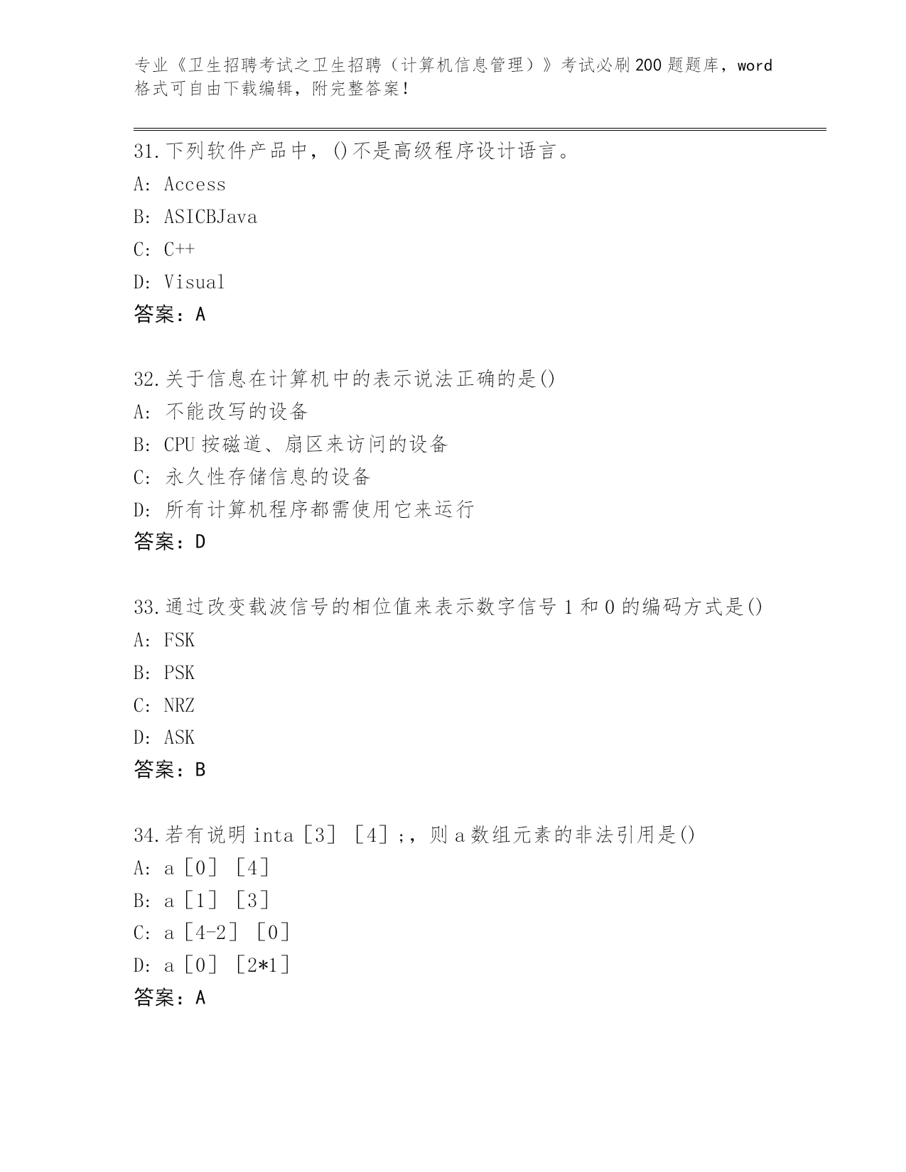 河北省顺平县2024《卫生招聘考试之卫生招聘(计算机信息管理)》考试必刷200题内部题库【易错题】