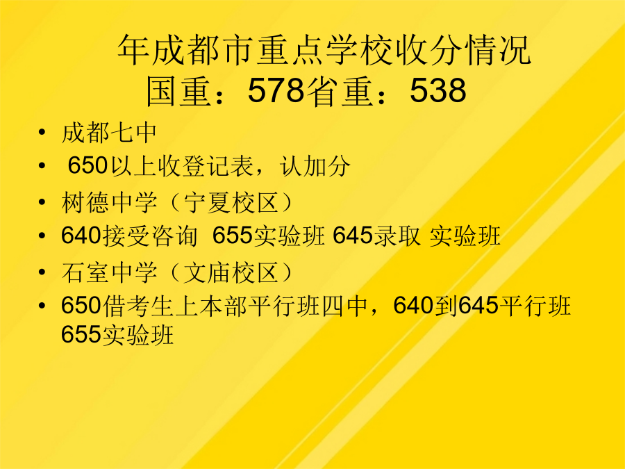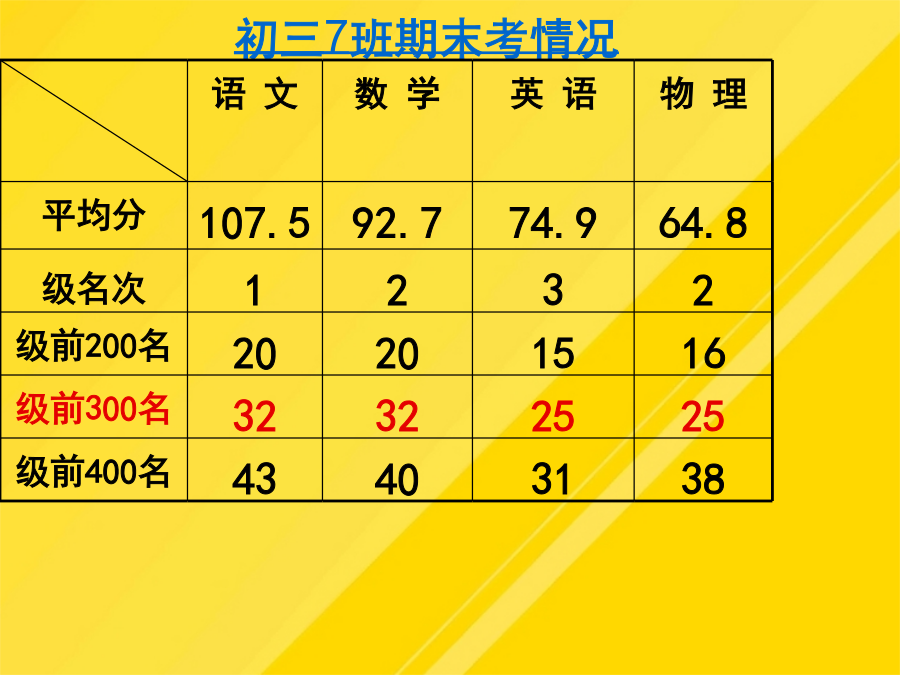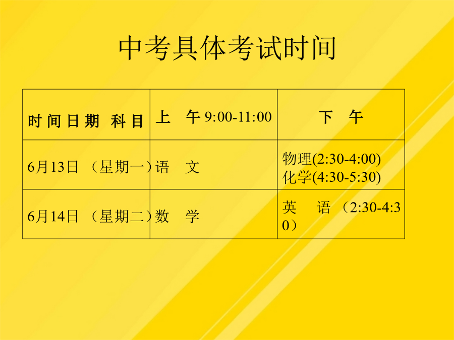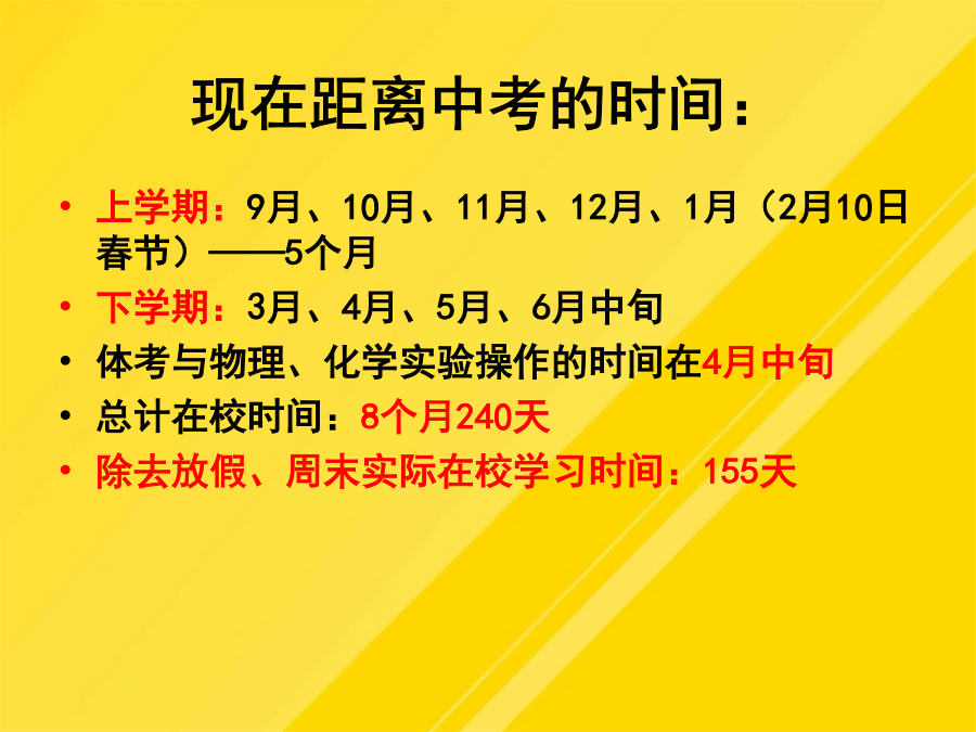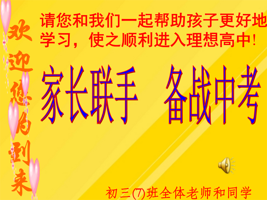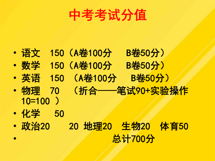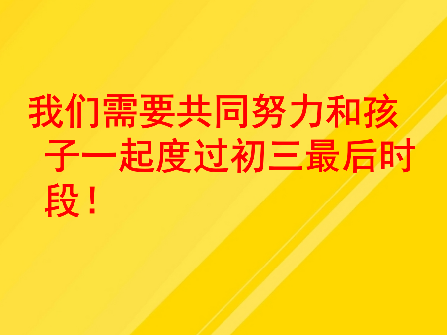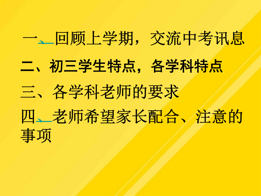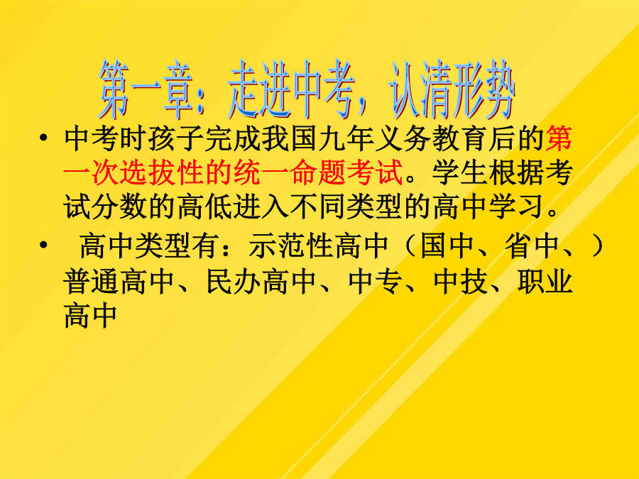 我们需要共同努力和孩子一起度过初三最后时段!欢迎您的到来一、回顾上学期,交流中考讯息初三7班期末考情况中考时孩子完成我国九年义务教育后的第一次选拔性的统一命题考试。学生根据考试分数的高低进入不同类型的高中学习。高中类型有:示范性高中(国中、省中、)普通高中、民办高中、中专、中技、职业高中中考时间:现在距离中考的时间:中考具体考试时间中考考试分值年成都市重点学校收分情况国重:578省重:538师大附中615登记618分开始收费,625分不收费十二中(川大附中)610可收,交2万;620不交钱盐道街中学598分龙泉一中588分田家炳中学578可以登记成都市实验外国语学校(西区)630分以上或列县(市、区)第一名,大市(州)前三名西北中学武侯高级中学交大附中588温江中学587温江二中538各级各类中专、中技、职业高中要分国家重点、省重等称号,对考试也有一定分数要求。升学国家级重点高中必须操行等级A、B等D等不能升学。第二章:了解孩子,了解初三1、初三学生部分心理特点:1.生理的影响(青春期的狂燥,叛逆,对异性有好感)。1.思想不够成熟。1、任务重、竞争激烈。1、班风学风好,竞争意识强。对于基础不好,成绩暂时落后的孩子,你们不要对自己的学习失去信心,不要放弃自己。第三章:各学科老师要求4、个别同学基础薄弱,出现心有余而力不足的情况,家长应及时给予鼓励和帮助,慎防学生出现自暴自弃心理。2、每天要保证1个小时的课外复习。对孩子玩电脑游戏、QQ、打及看电视加以严格监督和控制。希望家长配合,跟踪学生复习进度.中考时孩子完成我国九年义务教育后的第一次选拔性的统一命题考试。升学国家级重点高中必须操行等级A、B等D等不能升学。5、部分同学文理学科不均衡,偏科现象比较突出,合理利用课余时间狠抓自己的薄弱学科。615登记618分开始收费,625分不收费升学国家级重点高中必须操行等级A、B等D等不能升学。我们与家长达成教育孩子的共识奇迹是可以在坚持努力的同学身上发生的,这样的例子已经屡见不鲜。1.生理的影响(青春期的建议孩子在校尽量把作业做完,回家在9点前必须做完作业,保证2个小时的额外复习。总计在校时间:8个月240天2、我们的安排3、各学科学习特点语文:订下家庭学习规矩,并且自始至终执行,以形成良好的学习习惯,作息习惯。建议孩子在校尽量把作业做完,回家在9点前必须做完作业,保证2个小时的额外复习。(偏向英语、数学)物理科复习注意事项第三章:各学科老师要求第四章:希望家长配合,注意的事项我们与家长达成教育孩子的共识希望家长配合的事项希望家长配合的事项希望家长配合的事项希望家长配合的事项初三的特点是:作业多、时间紧。一些同学学习缺乏主动,没有紧迫感,学习没有可行性计划,课余时间利用不足,我们家长通过讲道理、督促、必要的一些合理的惩罚、集体指导、个别指导等方式引导同学不断优化学习方法,从而更有效地提高学习成绩。家长少说7句话1、去年谁家的某某考上了某某重点高中,你能像他一样就好了。2、就在这次考试,你一定要好好把握!3、你一定要好好考,要为父母争口气,全家就指望你了。4、好好复习,考时要超常发挥!5、什么事都不要你做,你只要好好复习就行。6、孩子!你千万不能紧张。7、你们班某某同学这次模拟考试考了多少分?细节关注成功英语(2:30-4:30)只要调整好自己的心态,正确的估价自己,知道自己的长处是什么,不足是什么,学习方法得当,就能够不断地提高自己的学习成绩!告之压力所在:初三的氛围是紧张的,从开学上课的第一天起就要准备好,这是艰辛的一年,要有吃苦精神!6、多与孩子沟通,了解孩子的学习情况,注意每一次考试的成绩,及时了解学习、行为动态。如果语法确实困难,要找老师及时帮你弥补。第一章:走进中考,认清形势把桃子挂在高处,如果猴子跳一跳能够够到,那么它就会想方设法去够,如果挂得太高,猴子无论如何够不到,那么猴子就会放弃。1、英语的中考范围全部是初中内容,靠基础知识和综合运用能力,复习时注重基础知识的过关,反复把教材跑熟,知识点专研透。2、每天抽15-20分钟时间复习课本、笔记和练习。四、老师希望家长配合、注意的事项时间日期科目总计在校时间:8个月240天只要调整好自己的心态,正确的估价自己,知道自己的长处是什么,不足是什么,学习方法得当,就能够不断地提高自己的学习成绩!二、初三学生特点,各学科特点同时利用课余时间要用来查漏补缺。一起体验那种“苦,并快乐着;把桃子挂在高处,如果猴子跳一跳能够够到,那么它就会想方设法去够,如果挂得太高,猴子无论如何够不到,那么猴子就会放弃。每周进行学科测验,考试结束后都会通过校讯通及时发放成绩,请家长及时分析。6、