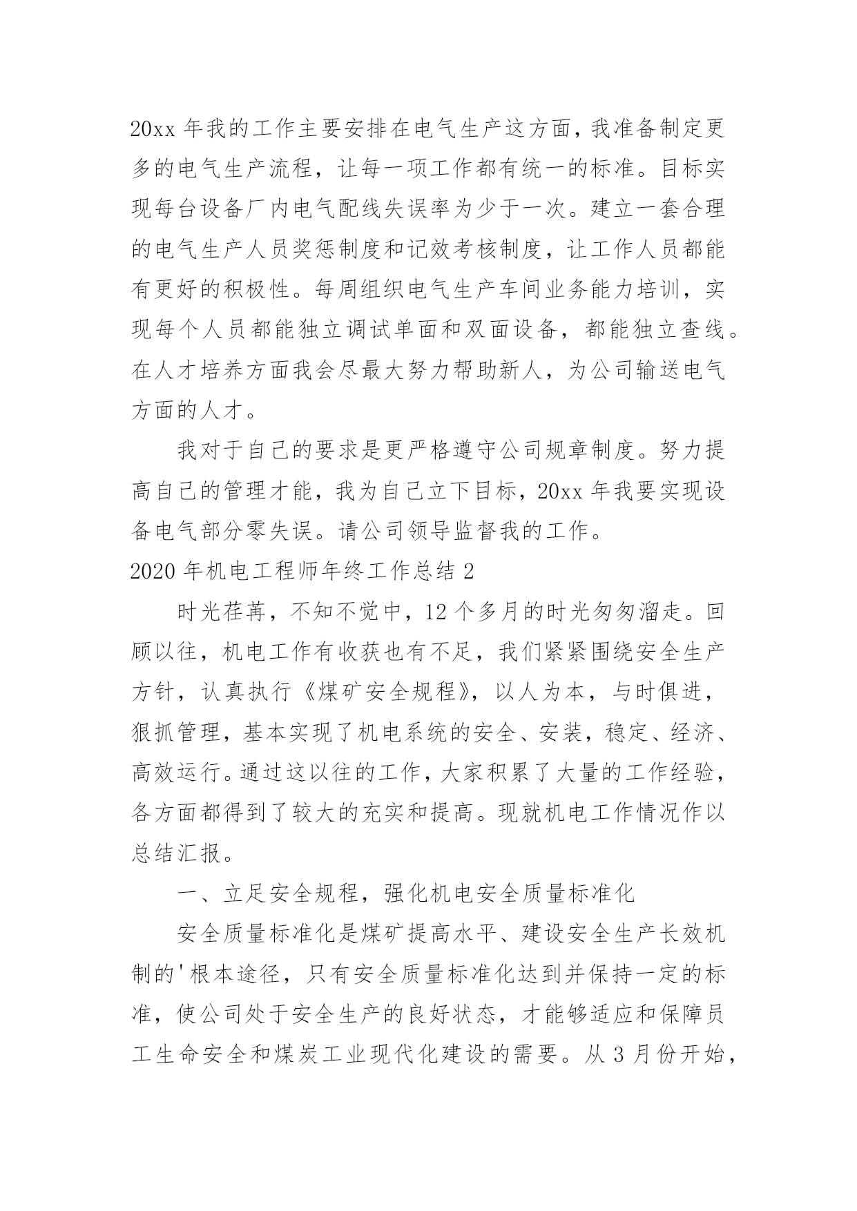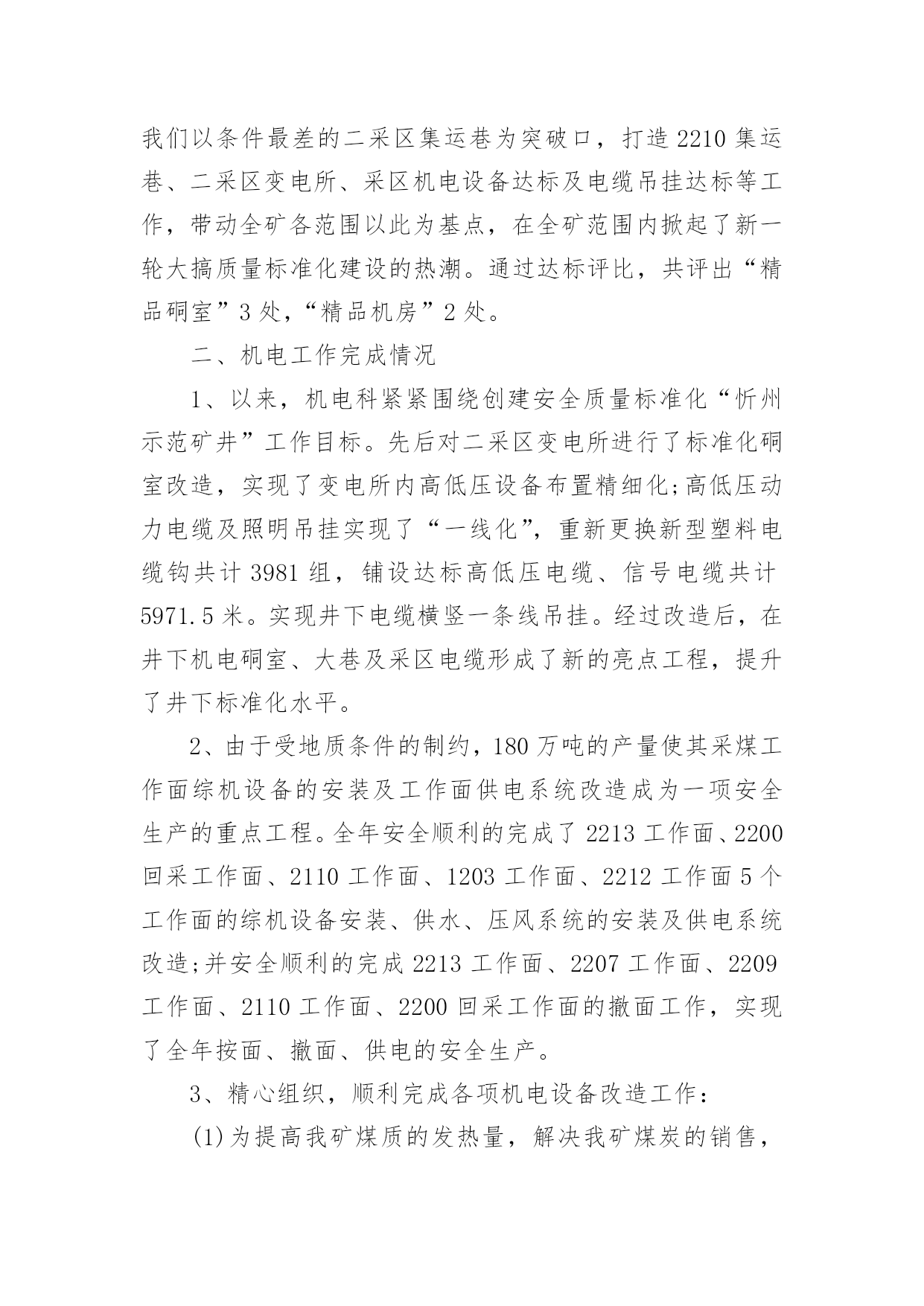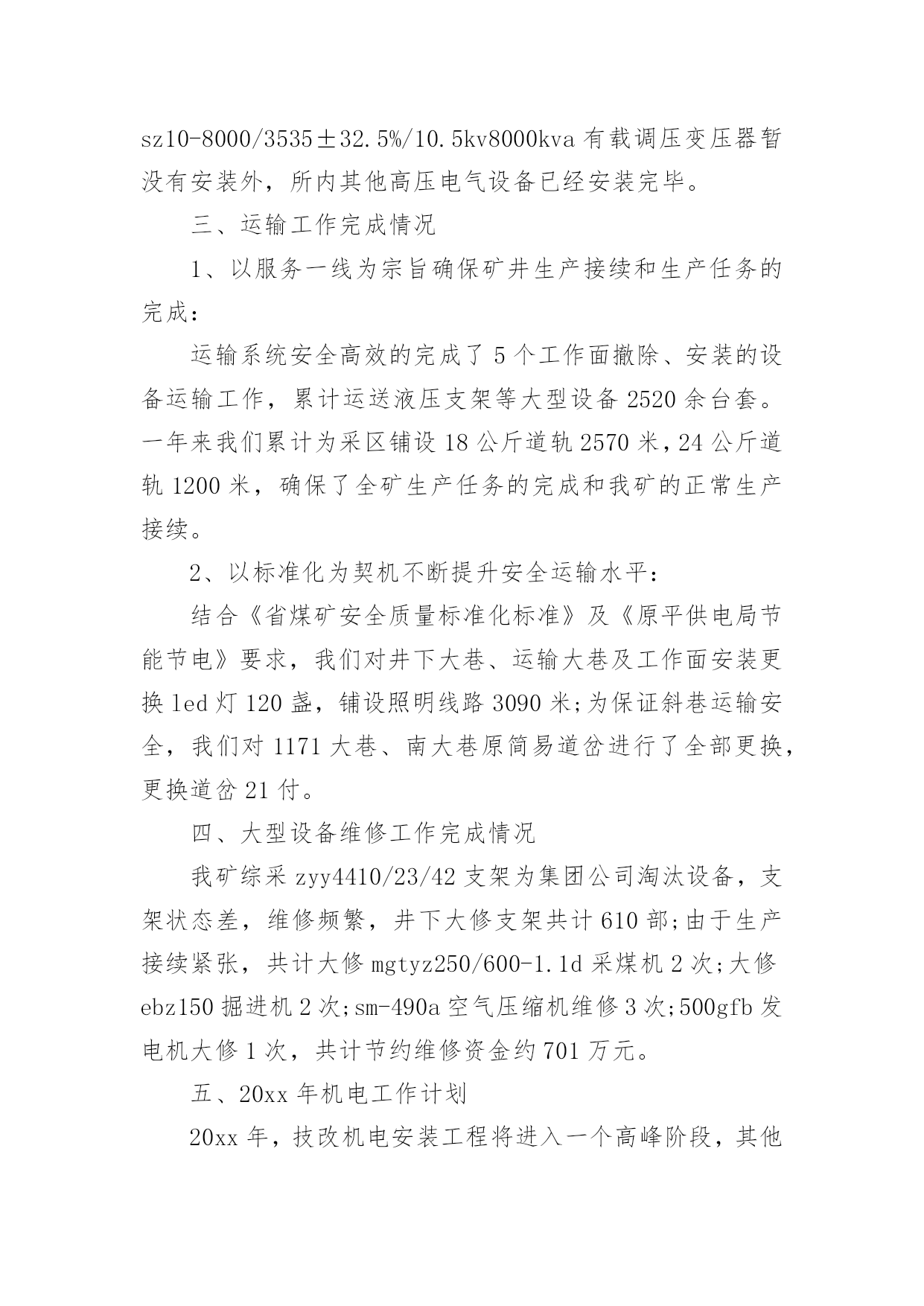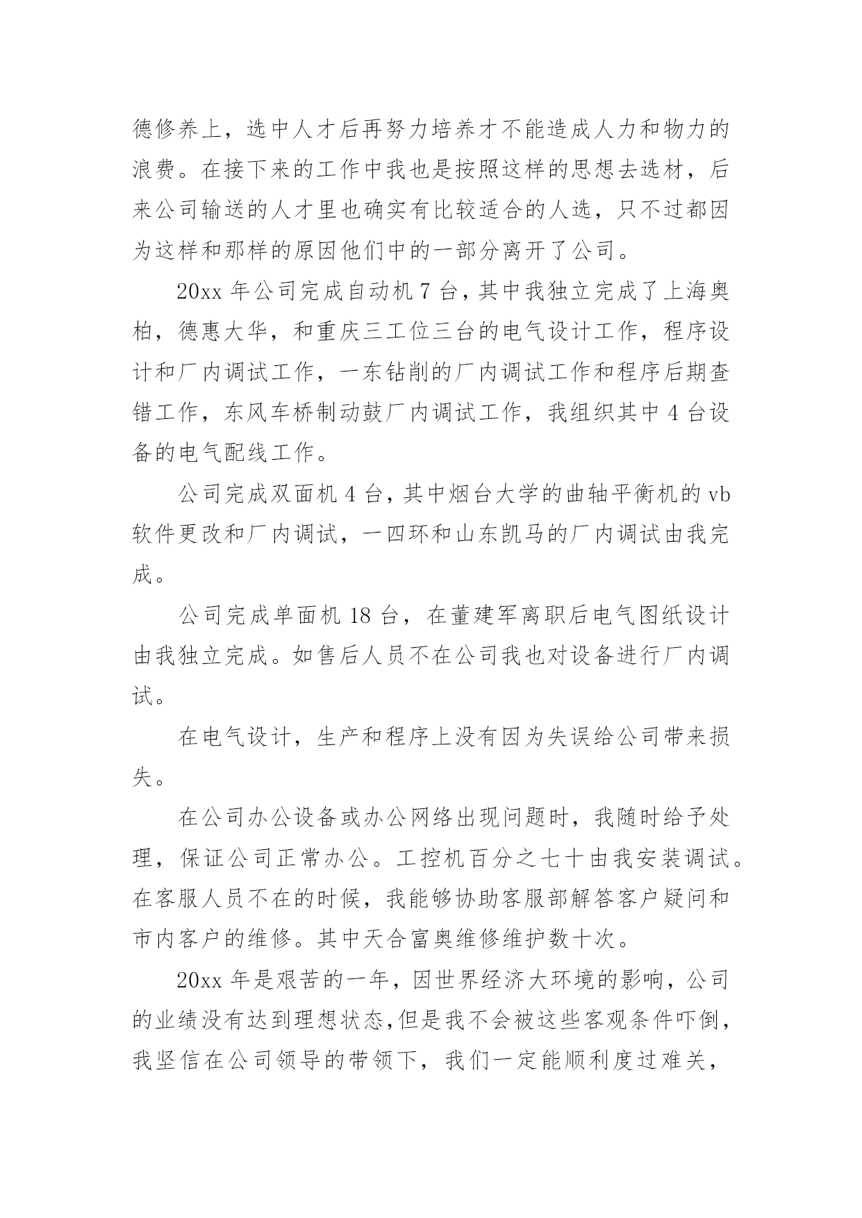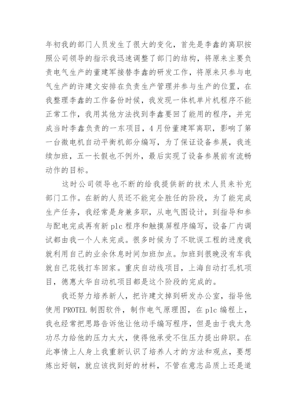机电工程师年终工作总结2020年机电工程师年终工作总结2020年机电工程师年终工作总结1xxxx年是我在公司工作的第一年,在这一年里随着公司在不断的发展和壮大我个人也从一个不知所谓的棱头青逐渐的变的成熟,从一个对平衡机毫无了解的门外汉变成一个熟悉平衡机原理熟悉公司各种产品的专业技术人员,而且在对部门的管理和与人沟通方面我也有了更深层次的认识,我深知我取得的这些进步和公司领导的培养是分不开的。没有他们不厌其烦的教导和一次次的给予机会我不会取得今天的进步,20xx年,将会是机遇和挑战并存的一年,我将团结在公司领导核心周围,努力工作,艰苦奋斗,为公司向更高层次发展做出自己的贡献。回首15年初,虽然在15年公司取得了可喜的成果,但是公司领导并没有沾沾自喜,反而为xxxx年制定了更高的目标。我也在经过短暂的调整之后马上进入自己的角色,当时按照领导的指示,我负责研发部管理和电气车间生产管理的工作。、我首先指定的部门工作范畴细则,明确了整个部门的工作任务。又对每个部门的成员在整个部门工作中所负责的范畴做了规定并已书面的形式发放到他们手中,我制定了部门成员结构组成图,明确上下级的从属关系。我想在完成公司交给的部门任务的同时建立一个有纪律,有向心力的团队更好的为公司服务是领导更希望我能做到的。在xxxx年初我的部门人员发生了很大的变化,首先是李鑫的离职按照公司领导的指示我迅速调整了部门的结构,将原来主要负责电气生产的董建军接替李鑫的研发工作,将原来只参与电气生产的许建文安排在负责生产管理并参与生产的位置,在我整理李鑫的工作备份时候,我发现一体机单片机程序不能正常工作,我用其他方法找到李鑫要回了能用的程序,并完成当时李鑫负责的一东项目,4月份董建军离职,影响了第一台微电机自动平衡机部分编写,为了保证设备参展,我连续加班,五一长假也不例外,最后实现了设备参展前有流畅动作的目标。这时公司领导也不断的给我提供新的技术人员来补充部门工作。在新的人员还不能完全胜任的阶段,为了能完成生产任务,我经常是身兼多职,从电气图设计,到指导和参与配电完成再有新plc程序和触摸屏程序编写,设备厂内调试都由我一个人来完成。很多时候为了不耽误工程的进度我就利用自己的业余休息时间加班加点。加班到很晚没有车我就自己花钱打车回家。重庆自动线项目,上海自动打孔机项目,德惠大华自动机项目都是这个阶段的完成的。我还努力培养新人,把许建文掉到研发办公室,指导他使用PROTEL制图软件,制作电气原理图,在plc编程上,我也经常把思路告诉他让他动手编写程序,但是由于我太急功尽力给他的压力太大,使得他承受不住压力提出辞职。在此事情上人身上我重新认识了培养人才的方法和观点,要想炼出好钢,就应该找到好的材料,不管在意志品质上还是道德修养上,选中人才后再努力培养才不能造成人力和物力的浪费。在接下来的工作中我也是按照这样的思想去选材,后来公司输送的人才里也确实有比较适合的人选,只不过都因为这样和那样的原因他们中的一部分离开了公司。20xx年公司完成自动机7台,其中我独立完成了上海奥柏,德惠大华,和重庆三工位三台的电气设计工作,程序设计和厂内调试工作,一东钻削的厂内调试工作和程序后期查错工作,东风车桥制动鼓厂内调试工作,我组织其中4台设备的电气配线工作。公司完成双面机4台,其中烟台大学的曲轴平衡机的vb软件更改和厂内调试,一四环和山东凯马的厂内调试由我完成。公司完成单面机18台,在董建军离职后电气图纸设计由我独立完成。如售后人员不在公司我也对设备进行厂内调试。在电气设计,生产和程序上没有因为失误给公司带来损失。在公司办公设备或办公网络出现问题时,我随时给予处理,保证公司正常办公。工控机百分之七十由我安装调试。在客服人员不在的时候,我能够协助客服部解答客户疑问和市内客户的维修。其中天合富奥维修维护数十次。20xx年是艰苦的一年,因世界经济大环境的影响,公司的业绩没有达到理想状态,但是我不会被这些客观条件吓倒,我坚信在公司领导的带领下,我们一定能顺利度过难关,20xx年我的工作主要安排在电气生产这方面,我准备制定更多的电气生产流程,让每一项工作都有统一的标准。目标实现每台设备厂内电气配线失误率为少于一次。建立一套合理的电气生产人员奖惩制度和记效考核制度,让工作人员都能有更好的积极性。每周组织电气生产车间业务能力培训,实现每个人员都能独立调试单面和双面设备,都能独立查线。在人才培养方面我会尽最大努力帮助新人,为公司输送电气方面的人才。我对于自己的要求是更严格遵守公司规章制度。努力提高自己的管理才能,我为自己立下目标,20xx年我要实现设备电气部分零失误。请公司领导监督我的工作。2020年机电工程师年终工作总结2时光荏苒,不知不觉中,12个多月的时光匆匆溜走。回顾以往,机电工作有收获也有不足,我们紧紧围绕安