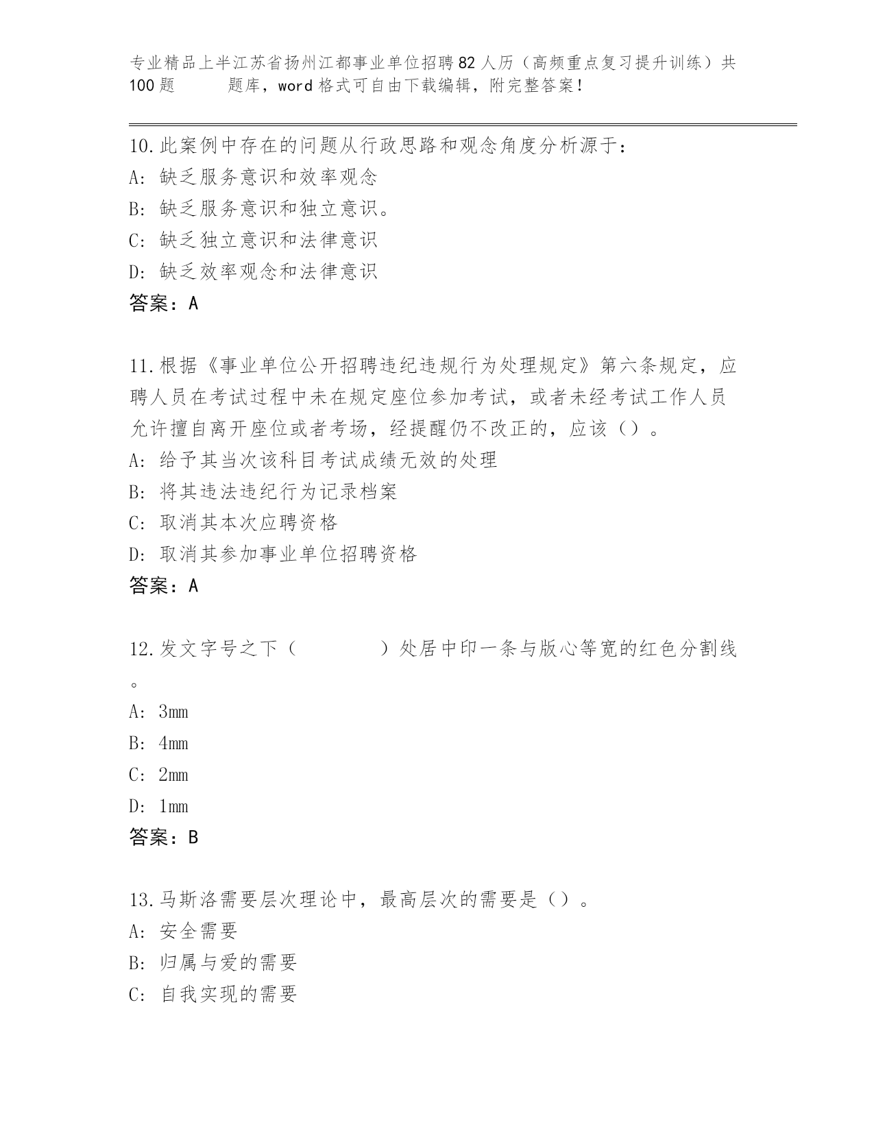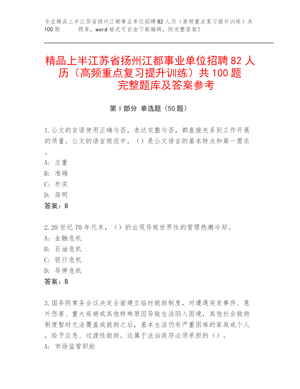 精编上半江苏省扬州江都事业单位招聘82人历(高频重点复习提升训练)共100题 完整题库及参考答案