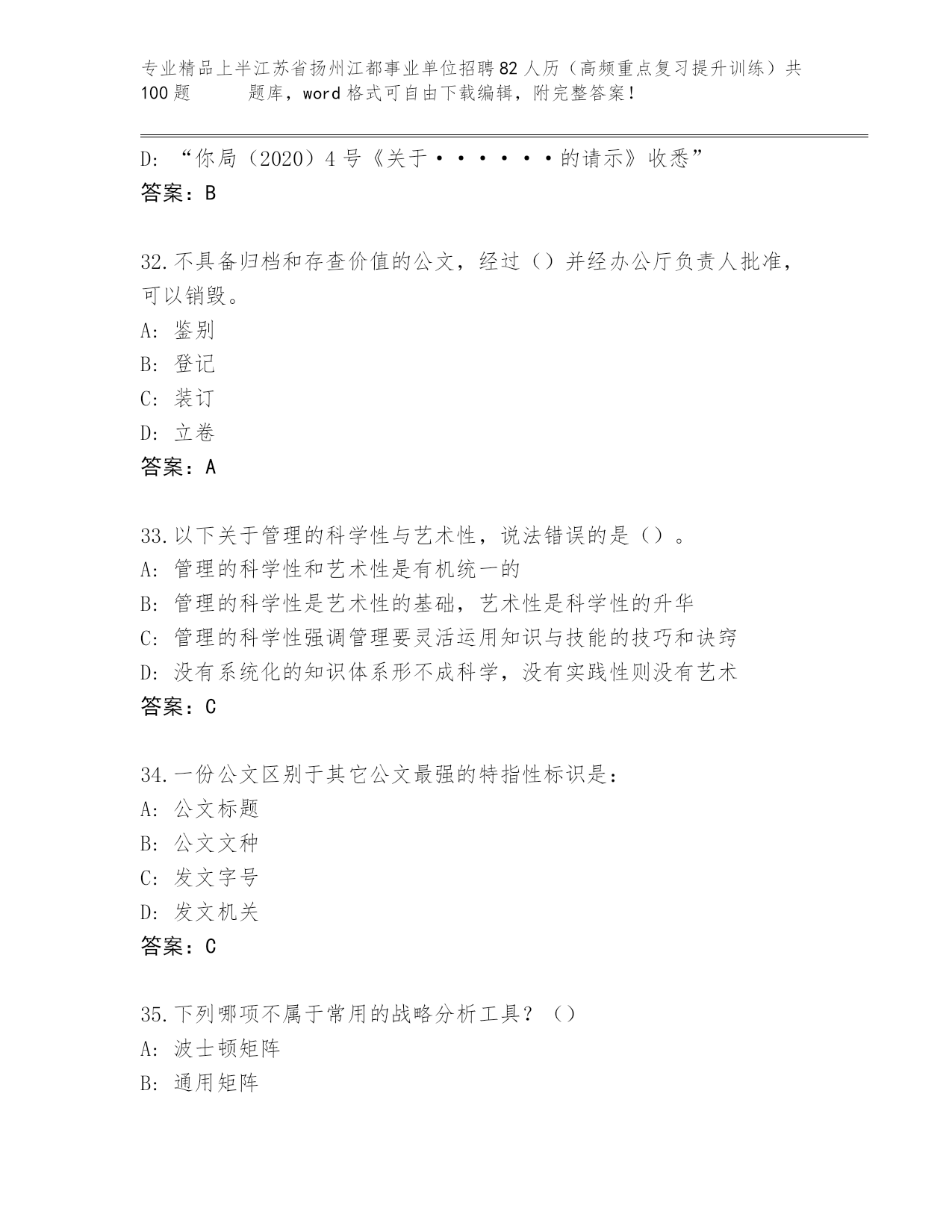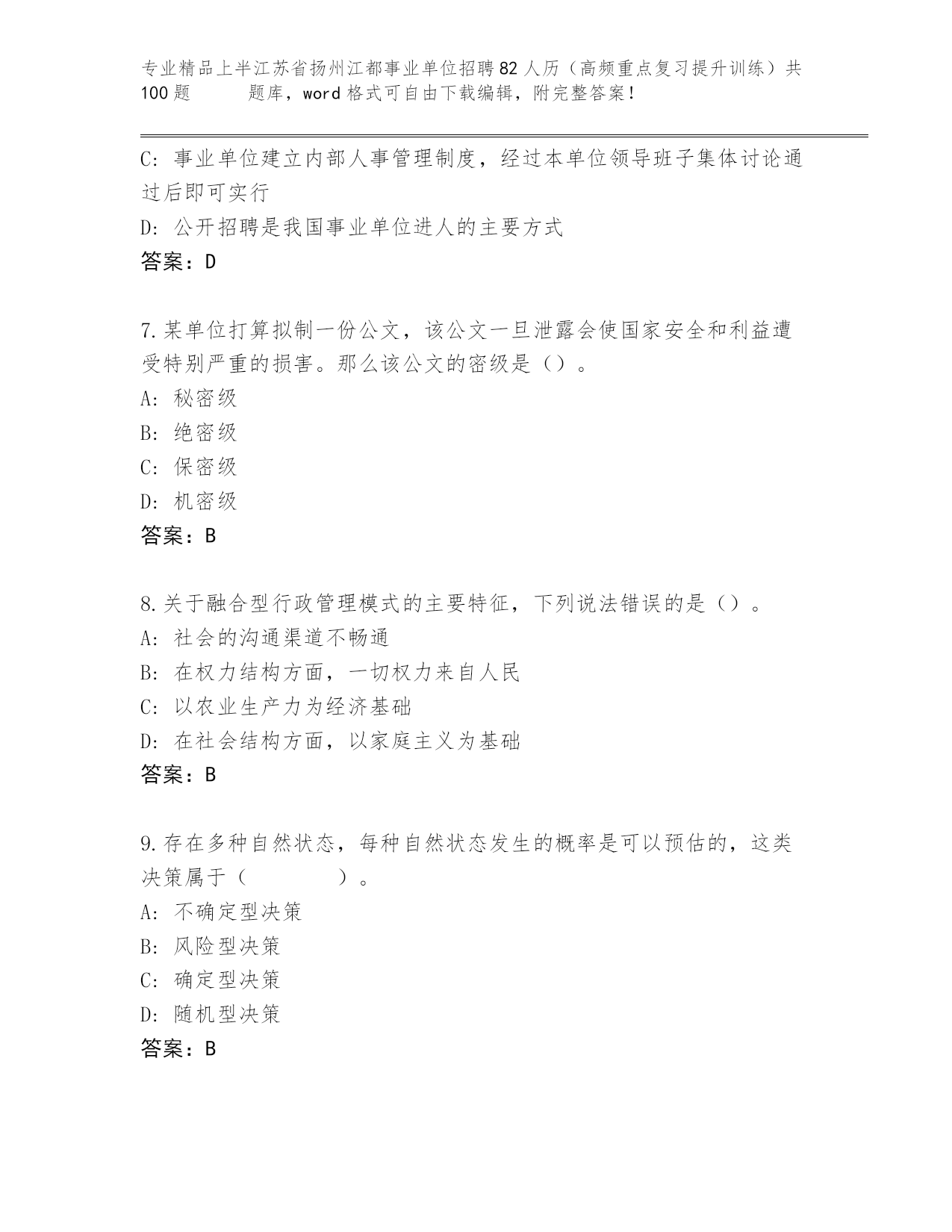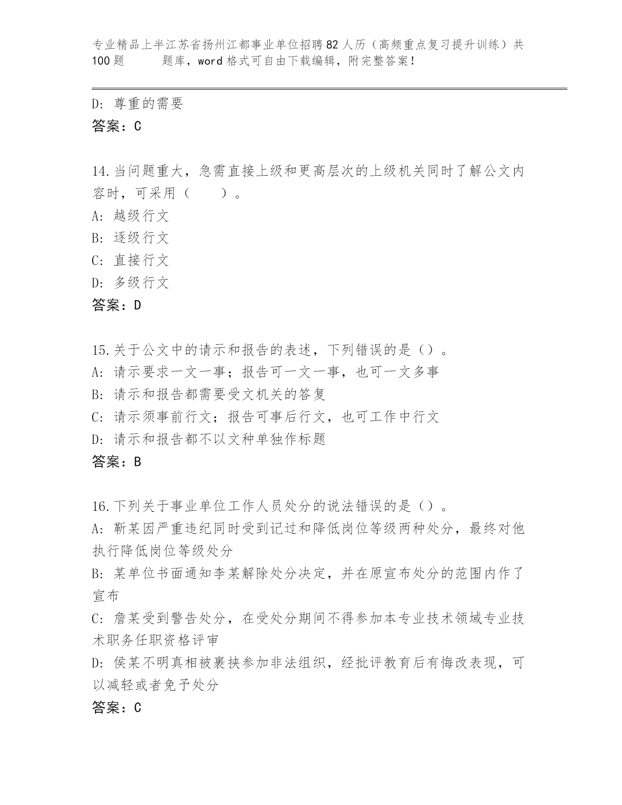 历年上半江苏省扬州江都事业单位招聘82人历(高频重点复习提升训练)共100题 题库及答案解析