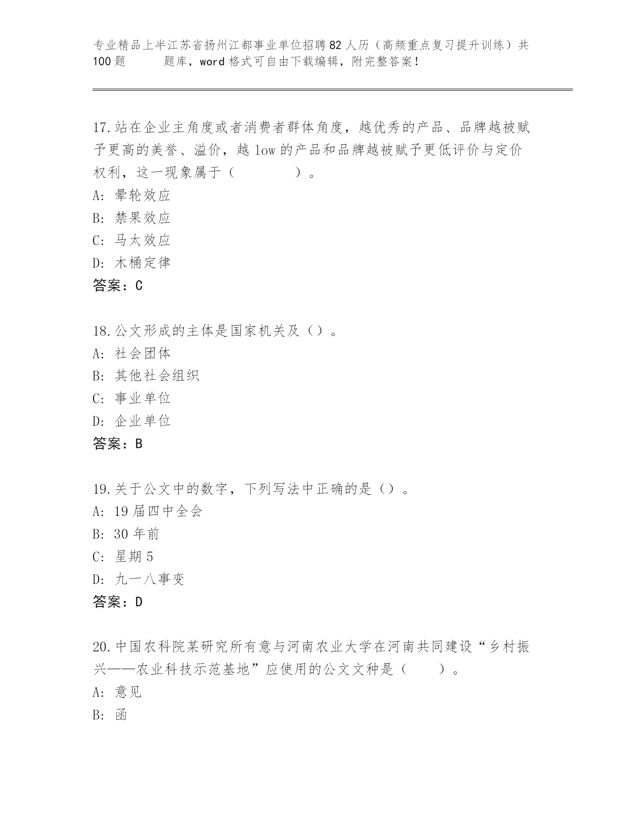 精品上半江苏省扬州江都事业单位招聘82人历(高频重点复习提升训练)共100题 王牌题库含答案【A卷】