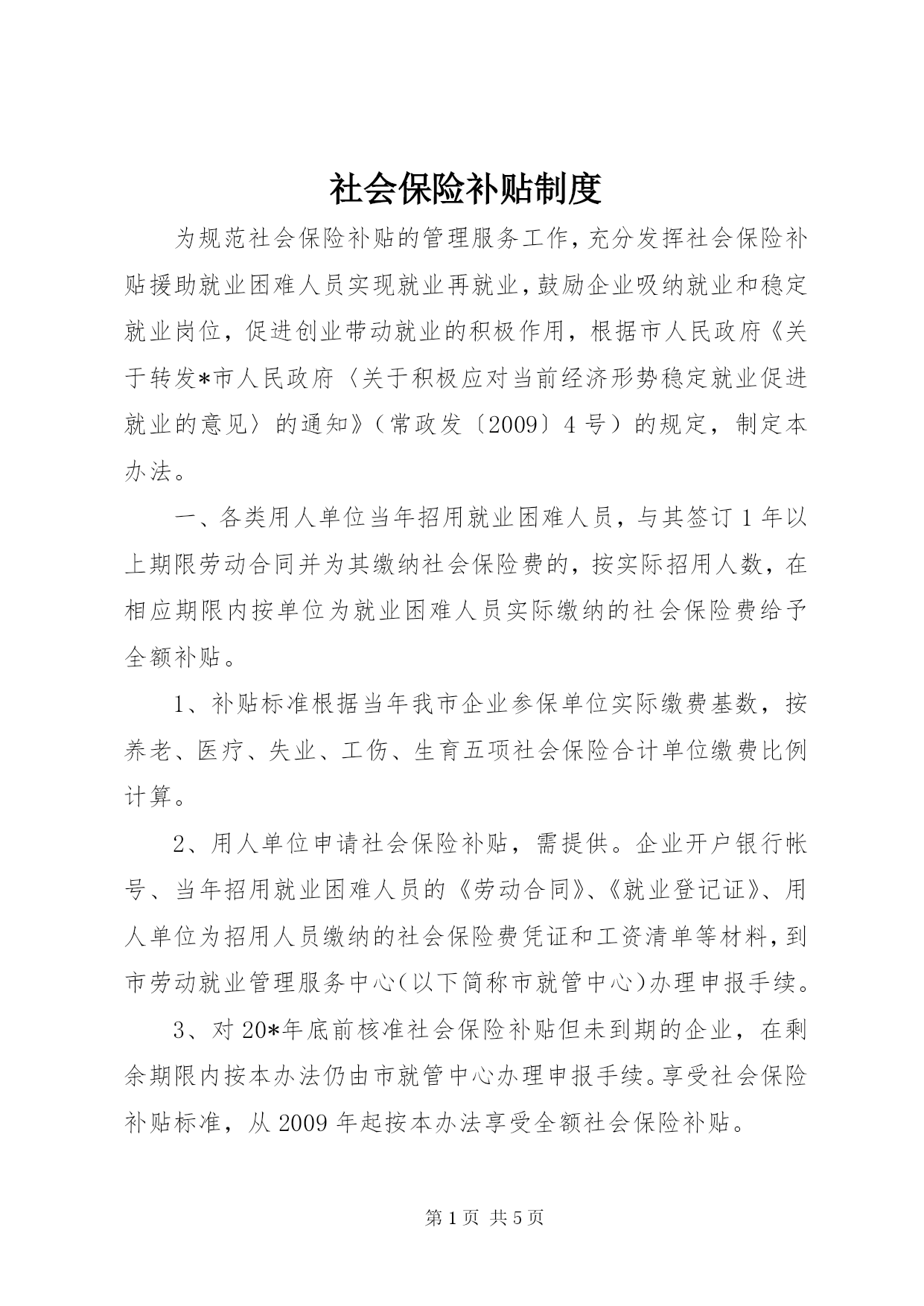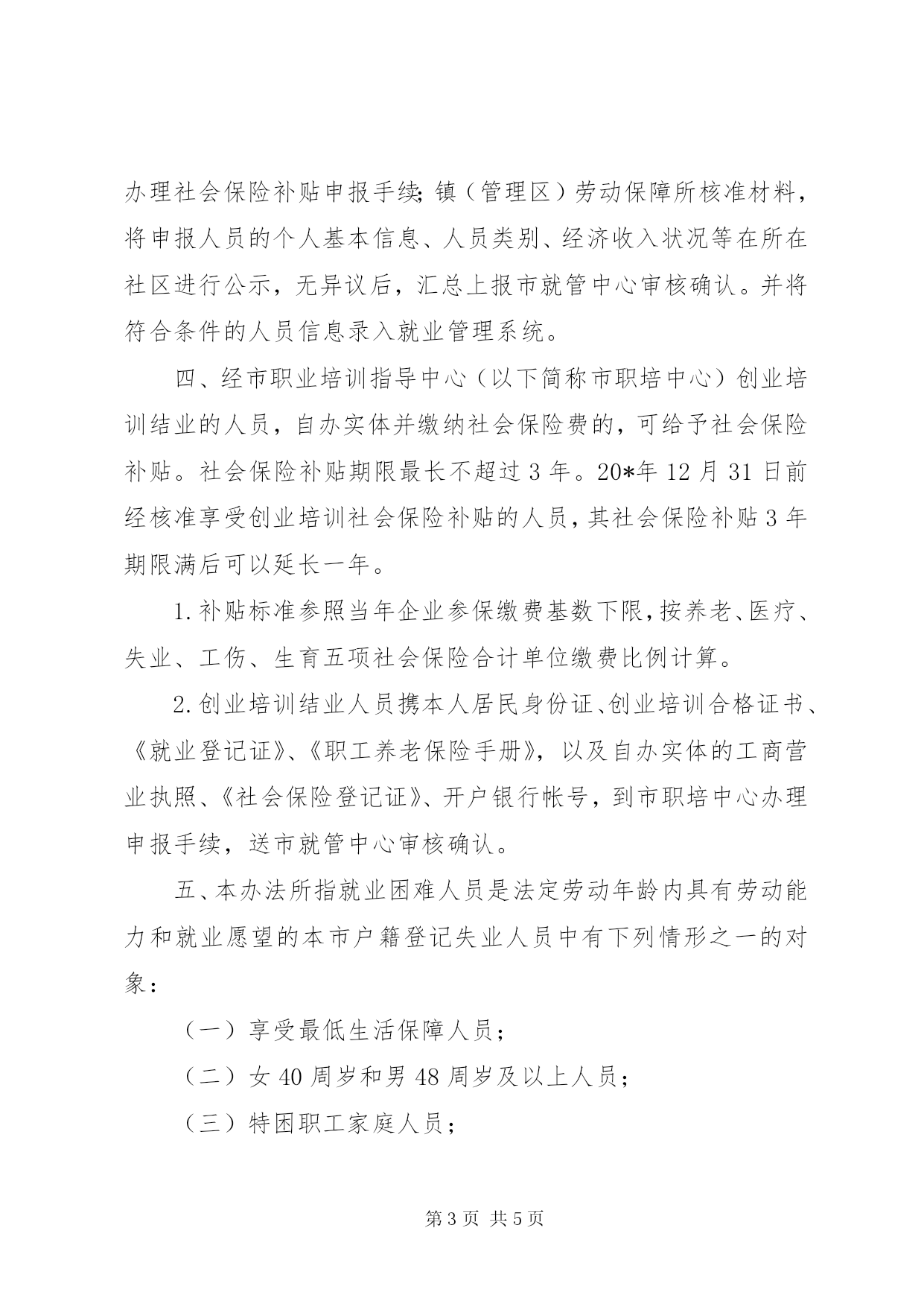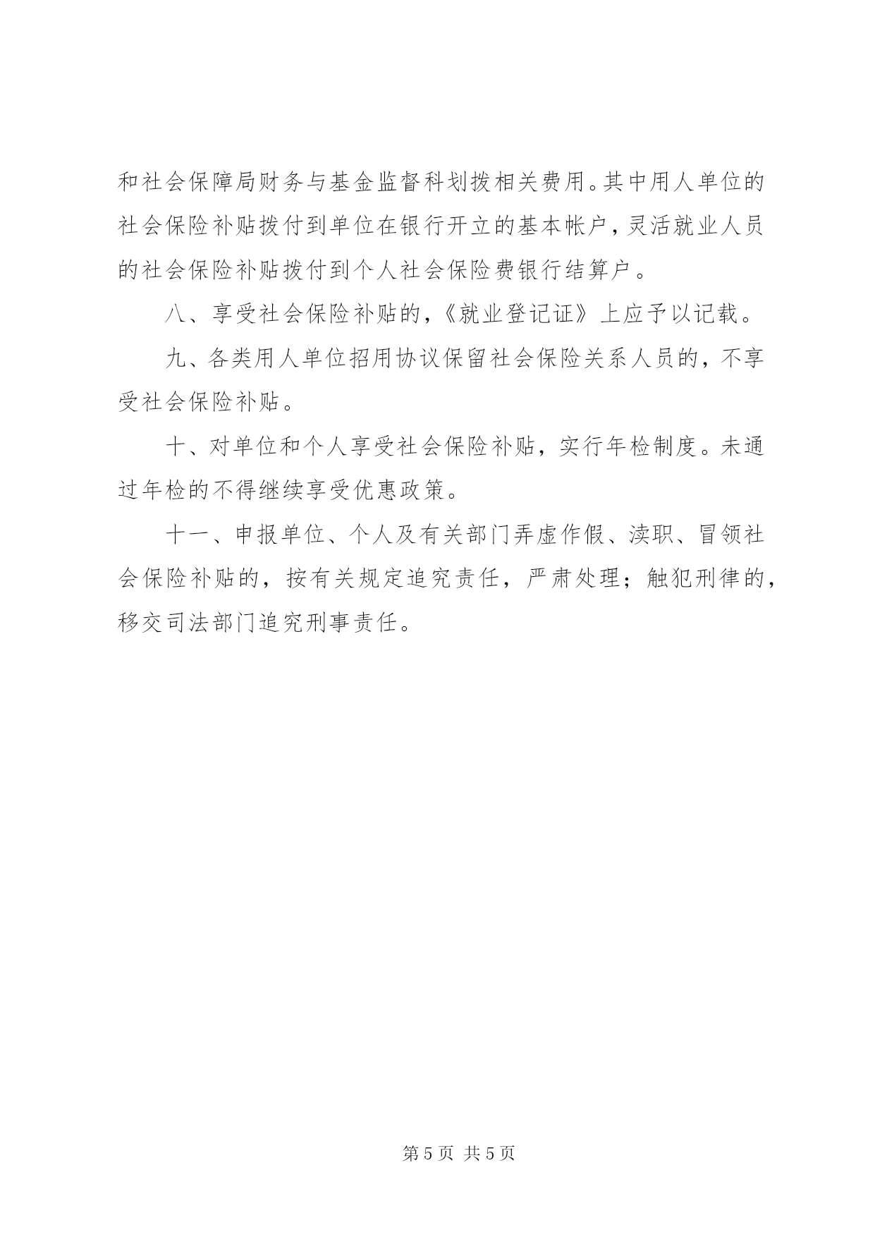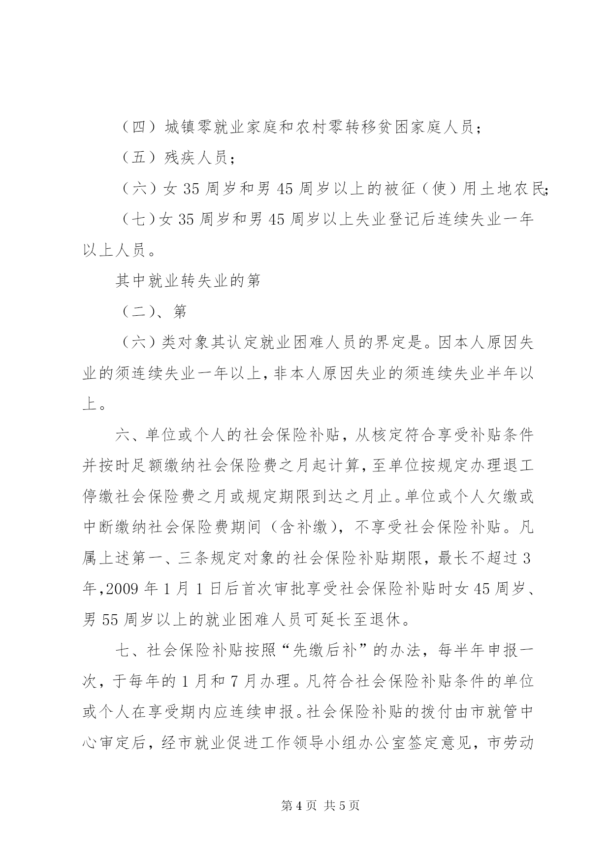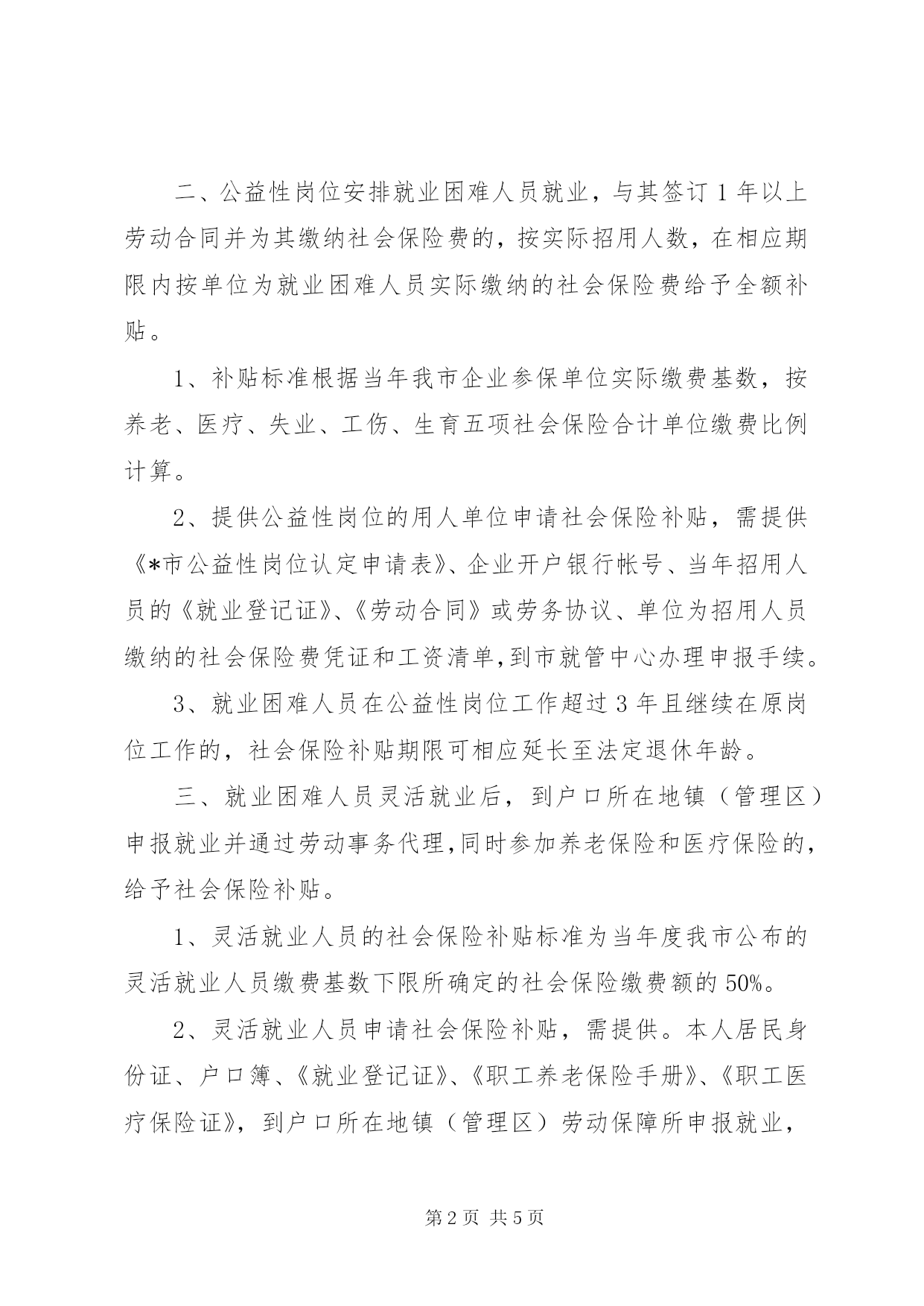 第PAGE\*Arabic\*MERGEFORMAT5页共NUMPAGES\*MERGEFORMAT5页社会保险补贴制度为规范社会保险补贴的管理服务工作,充分发挥社会保险补贴援助就业困难人员实现就业再就业,鼓励企业吸纳就业和稳定就业岗位,促进创业带动就业的积极作用,根据市人民政府《关于转发*市人民政府〈关于积极应对当前经济形势稳定就业促进就业的意见〉的通知》(常政发〔2009〕4号)的规定,制定本办法。一、各类用人单位当年招用就业困难人员,与其签订1年以上期限劳动合同并为其缴纳社会保险费的,按实际招用人数,在相应期限内按单位为就业困难人员实际缴纳的社会保险费给予全额补贴。1、补贴标准根据当年我市企业参保单位实际缴费基数,按养老、医疗、失业、工伤、生育五项社会保险合计单位缴费比例计算。2、用人单位申请社会保险补贴,需提供。企业开户银行帐号、当年招用就业困难人员的《劳动合同》、《就业登记证》、用人单位为招用人员缴纳的社会保险费凭证和工资清单等材料,到市劳动就业管理服务中心(以下简称市就管中心)办理申报手续。3、对20*年底前核准社会保险补贴但未到期的企业,在剩余期限内按本办法仍由市就管中心办理申报手续。享受社会保险补贴标准,从2009年起按本办法享受全额社会保险补贴。二、公益性岗位安排就业困难人员就业,与其签订1年以上劳动合同并为其缴纳社会保险费的,按实际招用人数,在相应期限内按单位为就业困难人员实际缴纳的社会保险费给予全额补贴。1、补贴标准根据当年我市企业参保单位实际缴费基数,按养老、医疗、失业、工伤、生育五项社会保险合计单位缴费比例计算。2、提供公益性岗位的用人单位申请社会保险补贴,需提供《*市公益性岗位认定申请表》、企业开户银行帐号、当年招用人员的《就业登记证》、《劳动合同》或劳务协议、单位为招用人员缴纳的社会保险费凭证和工资清单,到市就管中心办理申报手续。3、就业困难人员在公益性岗位工作超过3年且继续在原岗位工作的,社会保险补贴期限可相应延长至法定退休年龄。三、就业困难人员灵活就业后,到户口所在地镇(管理区)申报就业并通过劳动事务代理,同时参加养老保险和医疗保险的,给予社会保险补贴。1、灵活就业人员的社会保险补贴标准为当年度我市公布的灵活就业人员缴费基数下限所确定的社会保险缴费额的50%。2、灵活就业人员申请社会保险补贴,需提供。本人居民身份证、户口簿、《就业登记证》、《职工养老保险手册》、《职工医疗保险证》,到户口所在地镇(管理区)劳动保障所申报就业,办理社会保险补贴申报手续;镇(管理区)劳动保障所核准材料,将申报人员的个人基本信息、人员类别、经济收入状况等在所在社区进行公示,无异议后,汇总上报市就管中心审核确认。并将符合条件的人员信息录入就业管理系统。四、经市职业培训指导中心(以下简称市职培中心)创业培训结业的人员,自办实体并缴纳社会保险费的,可给予社会保险补贴。社会保险补贴期限最长不超过3年。20*年12月31日前经核准享受创业培训社会保险补贴的人员,其社会保险补贴3年期限满后可以延长一年。1.补贴标准参照当年企业参保缴费基数下限,按养老、医疗、失业、工伤、生育五项社会保险合计单位缴费比例计算。2.创业培训结业人员携本人居民身份证、创业培训合格证书、《就业登记证》、《职工养老保险手册》,以及自办实体的工商营业执照、《社会保险登记证》、开户银行帐号,到市职培中心办理申报手续,送市就管中心审核确认。五、本办法所指就业困难人员是法定劳动年龄内具有劳动能力和就业愿望的本市户籍登记失业人员中有下列情形之一的对象:(一)享受最低生活保障人员;(二)女40周岁和男48周岁及以上人员;(三)特困职工家庭人员;(四)城镇零就业家庭和农村零转移贫困家庭人员;(五)残疾人员;(六)女35周岁和男45周岁以上的被征(使)用土地农民;(七)女35周岁和男45周岁以上失业登记后连续失业一年以上人员。其中就业转失业的第(二)、第(六)类对象其认定就业困难人员的界定是。因本人原因失业的须连续失业一年以上,非本人原因失业的须连续失业半年以上。六、单位或个人的社会保险补贴,从核定符合享受补贴条件并按时足额缴纳社会保险费之月起计算,至单位按规定办理退工停缴社会保险费之月或规定期限到达之月止。单位或个人欠缴或中断缴纳社会保险费期间(含补缴),不享受社会保险补贴。凡属上述第一、三条规定对象的社会保险补贴期限,最长不超过3年,2009年1月1日后首次审批享受社会保险补贴时女45周岁、男55周岁以上的就业困难人员可延长至退休。七、社会保险补贴按照“先缴后补”的办法,每半年申报一次,于每年的1月和7月办理。凡符合社会保险补贴条件的单位或个人在享受期内应连续申报。社会保险补贴的拨付由市就管中心审定后,经市就业促进工作领导小组办公室签定意见,