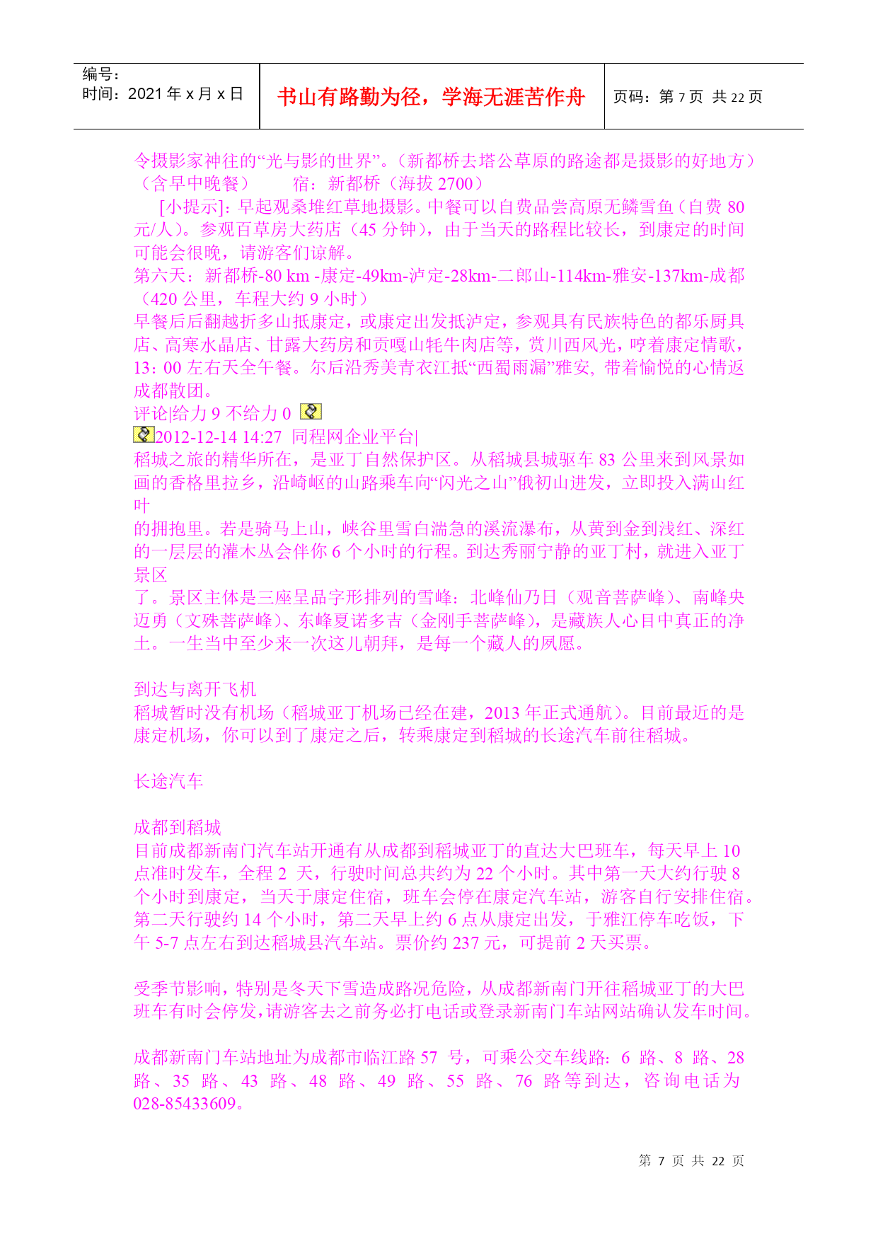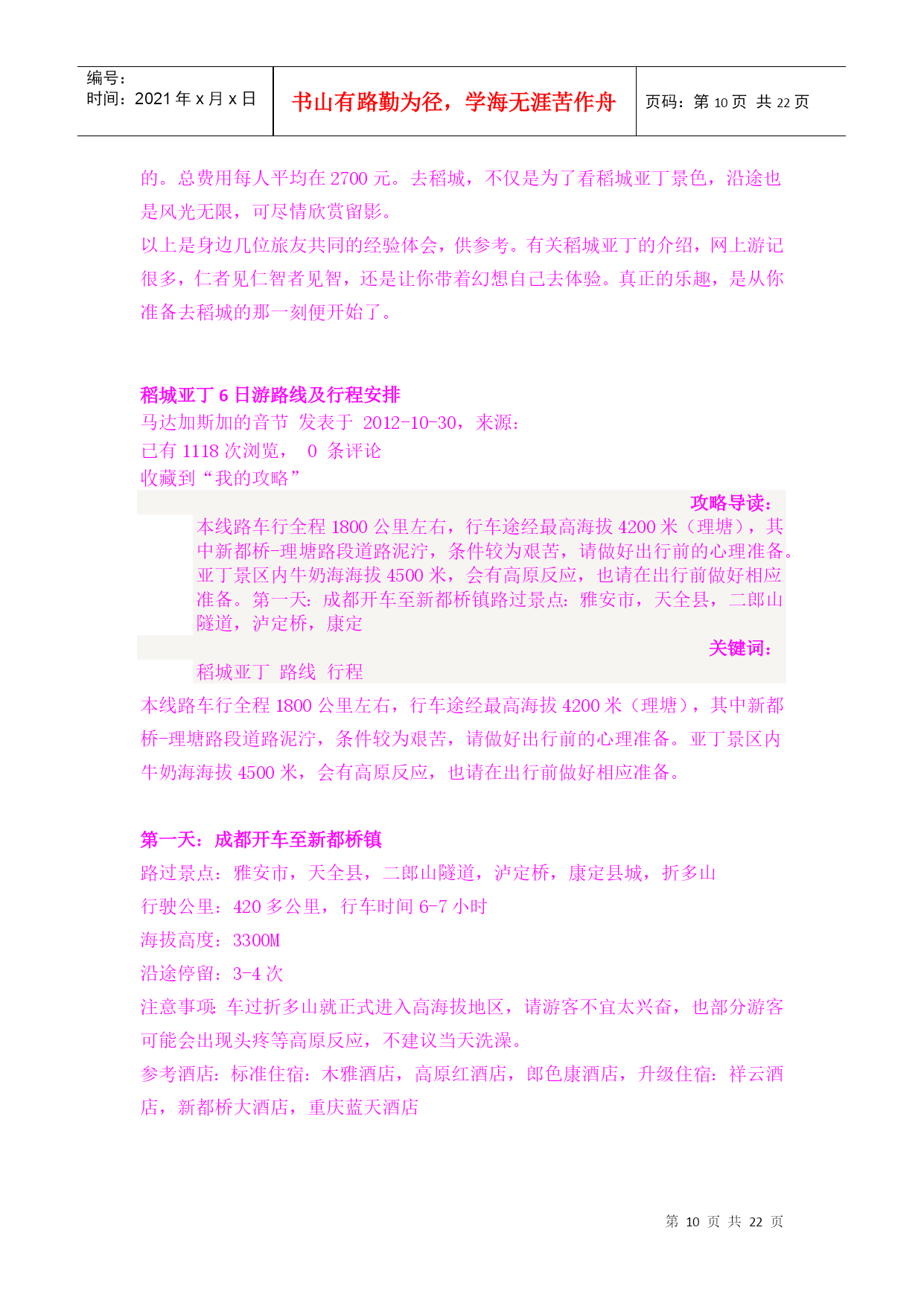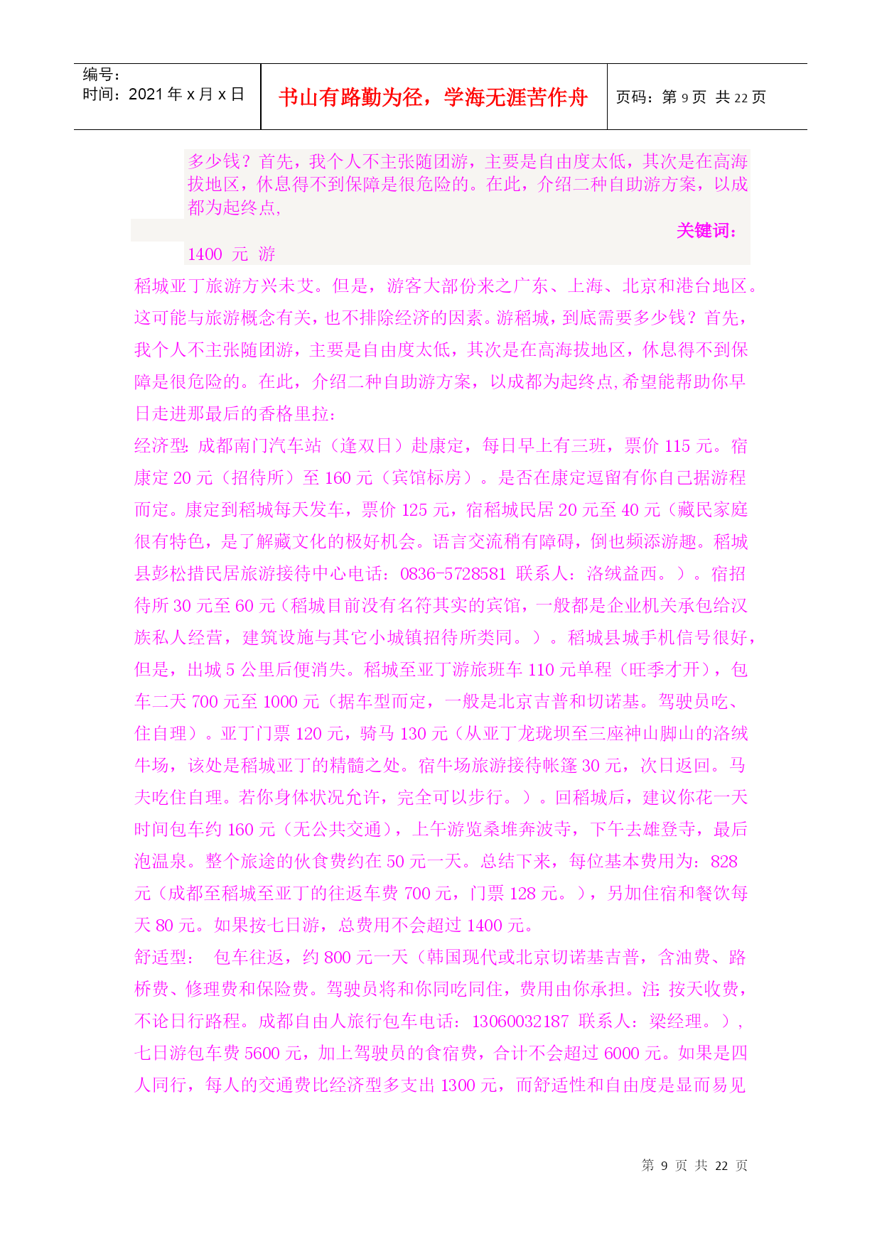 编号:时间:2021年x月x日书山有路勤为径,学海无涯苦作舟页码:第PAGE22页共NUMPAGES22页第PAGE\*MERGEFORMAT22页共NUMPAGES\*MERGEFORMAT22页1、HYPERLINK""\t"_blank"海子山HYPERLINK""\t"_blank"海子山HYPERLINK""\t"_blank"自然保护区位于稻城北部,总面积3287平方公里,平均海拔4300-700米。该高原面是青藏高原最大的古冰体遗迹,即“稻城古HYPERLINK""\t"_blank"冰帽”。冰蚀后的怪石及大小海子(冰蚀岩盆)HYPERLINK""\t"_blank"星罗棋布,大小海子1145个,其规模密度为我国之最。景象壮观,憾人心魄。2、兴伊措兴伊措(4420米)是稻城北部HYPERLINK""\t"_blank"海子山中部上最大的HYPERLINK""\t"_blank"淡水湖泊,面积7平方公里。湖深3米左右,最深处达30余米。兴伊措是稻城河主要源头,湖周地势平坦,HYPERLINK""\t"_blank"牧草茂盛。3、桑堆小镇桑堆小镇距HYPERLINK""\t"_blank"稻城县城金珠镇28公里,公路沿线牧场开阔、溪流平缓、山峦起伏、气象万千,村寨、牧人、牛羊群点缀其间,宁静祥和。金秋十月桑堆红草滩的旖旎美景成为稻城上镜率最高的景点。4、茹布查卡温泉茹布查卡温泉位于HYPERLINK""\t"_blank"稻城县县城东南3公里的贡HYPERLINK""\t"_blank"巴山北麓,海拔3747米。水温68~80℃,日流量达7000立方米,含钙、触感柔滑,洗后皮肤异常光洁滑爽,现建有澡塘11个,民间露天浴塘1个。5、色拉HYPERLINK""\t"_blank"晨雾、傍河夕照色拉HYPERLINK""\t"_blank"晨雾、傍河夕照是稻城风光的经典之一。HYPERLINK""\t"_blank"稻城县城周围到处散布着树形优美的青HYPERLINK""\t"_blank"杨树,金秋十月色拉、傍河的HYPERLINK""\t"_blank"田园风光HYPERLINK""\t"_blank"如诗如画,每当朝阳初升、夕阳西沉时,HYPERLINK""\t"_blank"恍如仙境的风光成为HYPERLINK""\t"_blank"油画家、摄影家的天堂。6、HYPERLINK""\t"_blank"贡嘎郎吉岭寺HYPERLINK""\t"_blank"贡嘎郎吉岭寺为稻城县内最大的HYPERLINK""\t"_blank"黄教寺院,该寺院建筑宏伟,壁画精美,寺内珍藏了一尊HYPERLINK""\t"_blank"五世达赖所赠“HYPERLINK""\t"_blank"弥勒铜像”。7、俄初山俄初山——HYPERLINK""\t"_blank"藏语意为“闪光的山”,海拔5145米,俄初山HYPERLINK""\t"_blank"山形平缓、森林广袤,山上HYPERLINK""\t"_blank"风云变幻莫测。每年10月,初霜便降临于俄初山的山岭峰谷,HYPERLINK""\t"_blank"雪线以下的HYPERLINK""\t"_blank"林涛HYPERLINK""\t"_blank"树海换上了秋的盛装。火红的枫叶,翠绿的松柏,金黄的桦树林与HYPERLINK""\t"_blank"蓝天白云、皑皑雪峰HYPERLINK""\t"_blank"交相辉映。8、HYPERLINK""\t"_blank"冲古寺HYPERLINK""\t"_blank"冲古寺(3885)米,位于HYPERLINK""\t"_blank"仙乃日雪峰脚下。寺院HYPERLINK""\t"_blank"残垣断壁毁坏严重,建寺年代无从考证。HYPERLINK""\t"_blank"冲古寺隶属HYPERLINK""\t"_blank"贡嘎朗吉岭寺,根戈HYPERLINK""\t"_blank"活佛派有扎巴在此念经颂佛,小经堂内供有HYPERLINK""\t"_blank"泥塑HYPERLINK""\t"_blank"释迦。9、洛绒牛场洛绒牛场(4180米),为附近山民放牧的HYPERLINK""\t"_blank"高山牧场,洛绒牛场被HYPERLINK""\t"_blank"仙乃日、HYPERLINK""\t"_blank"央迈勇、HYPERLINK""\t"