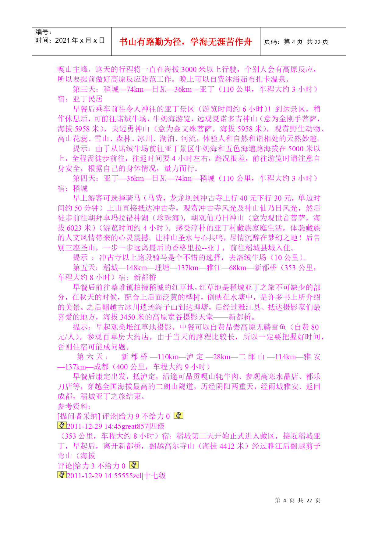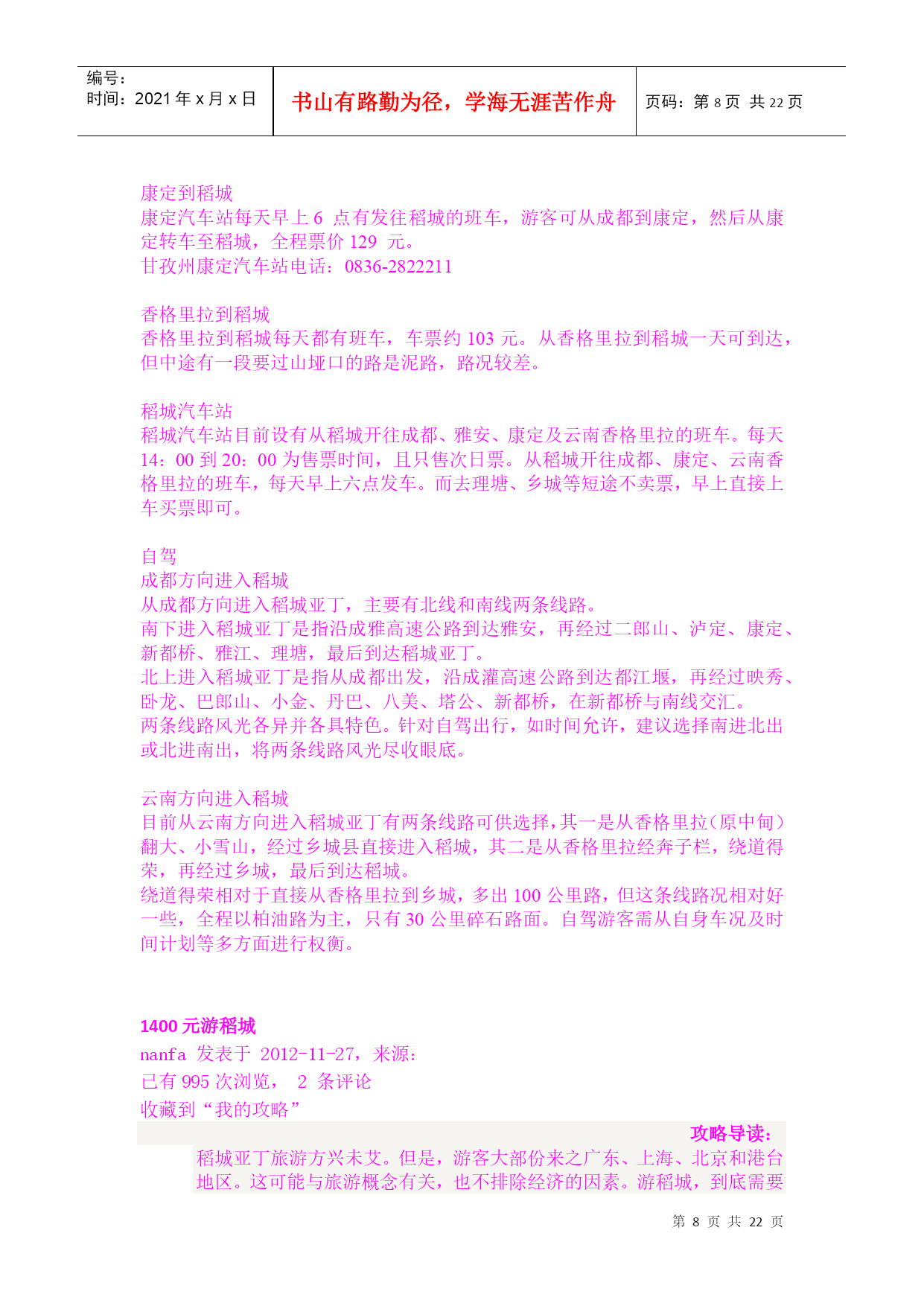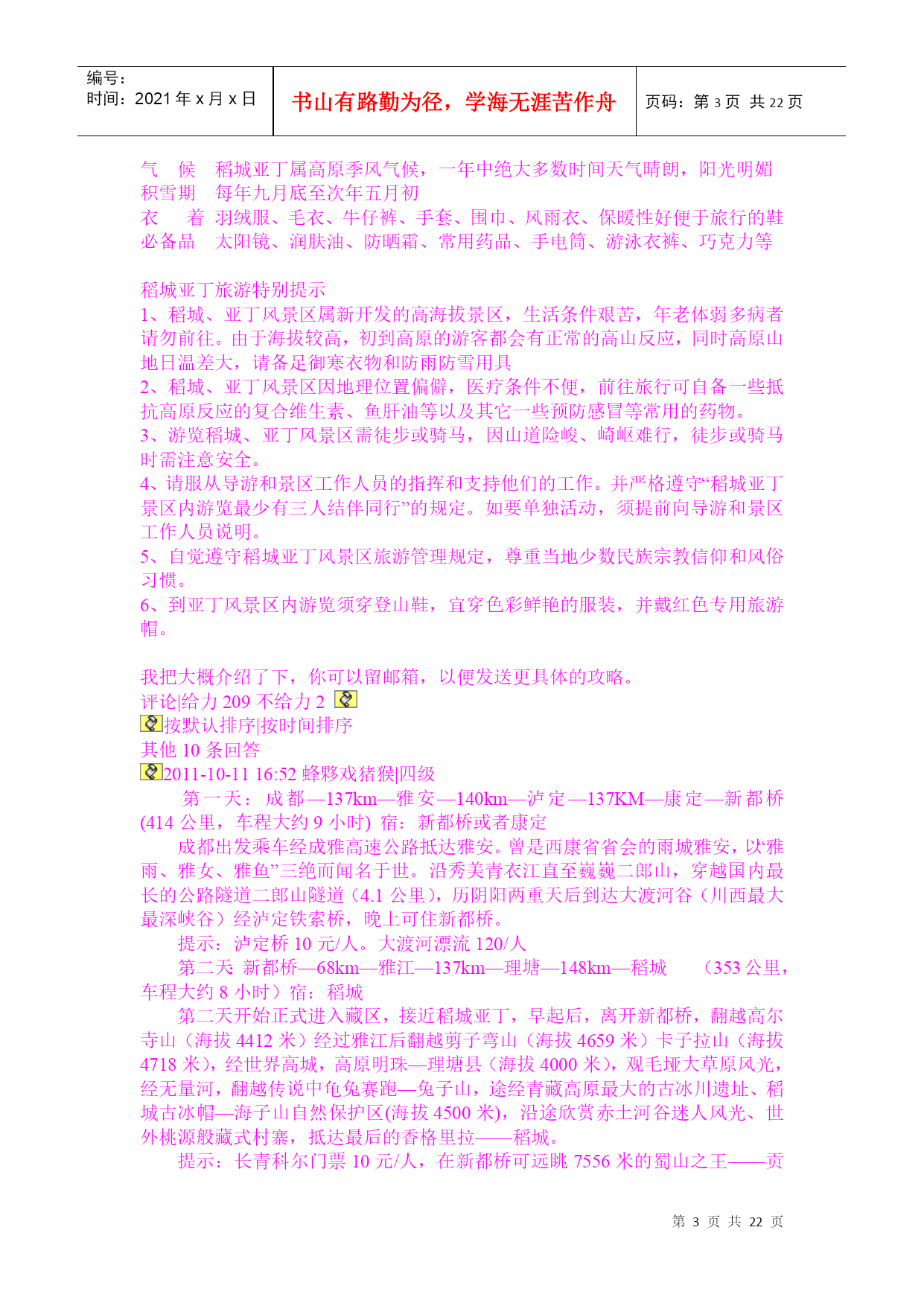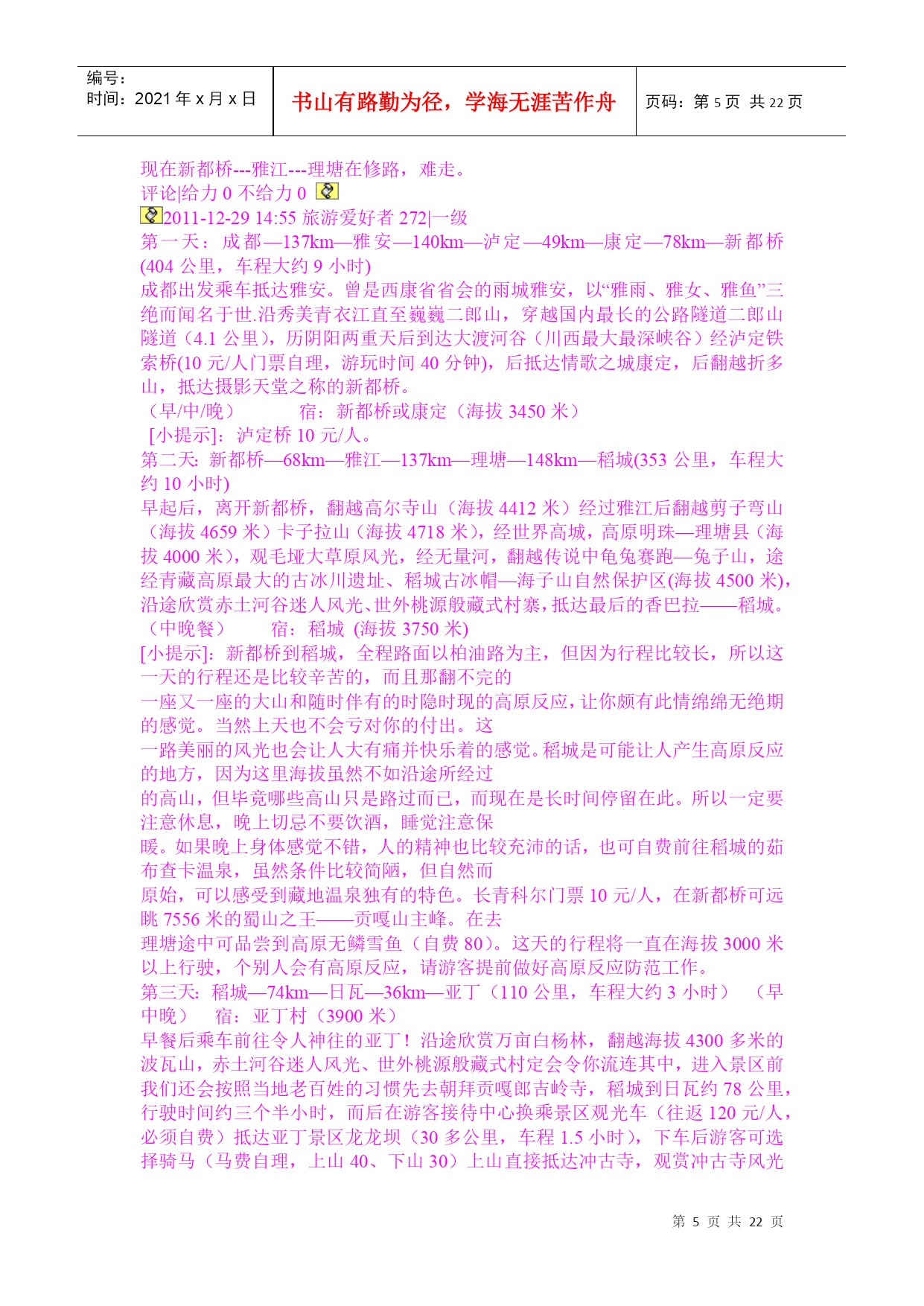 编号:时间:2021年x月x日书山有路勤为径,学海无涯苦作舟页码:第PAGE22页共NUMPAGES22页第PAGE\*MERGEFORMAT22页共NUMPAGES\*MERGEFORMAT22页1、HYPERLINK""\t"_blank"海子山HYPERLINK""\t"_blank"海子山HYPERLINK""\t"_blank"自然保护区位于稻城北部,总面积3287平方公里,平均海拔4300-700米。该高原面是青藏高原最大的古冰体遗迹,即“稻城古HYPERLINK""\t"_blank"冰帽”。冰蚀后的怪石及大小海子(冰蚀岩盆)HYPERLINK""\t"_blank"星罗棋布,大小海子1145个,其规模密度为我国之最。景象壮观,憾人心魄。2、兴伊措兴伊措(4420米)是稻城北部HYPERLINK""\t"_blank"海子山中部上最大的HYPERLINK""\t"_blank"淡水湖泊,面积7平方公里。湖深3米左右,最深处达30余米。兴伊措是稻城河主要源头,湖周地势平坦,HYPERLINK""\t"_blank"牧草茂盛。3、桑堆小镇桑堆小镇距HYPERLINK""\t"_blank"稻城县城金珠镇28公里,公路沿线牧场开阔、溪流平缓、山峦起伏、气象万千,村寨、牧人、牛羊群点缀其间,宁静祥和。金秋十月桑堆红草滩的旖旎美景成为稻城上镜率最高的景点。4、茹布查卡温泉茹布查卡温泉位于HYPERLINK""\t"_blank"稻城县县城东南3公里的贡HYPERLINK""\t"_blank"巴山北麓,海拔3747米。水温68~80℃,日流量达7000立方米,含钙、触感柔滑,洗后皮肤异常光洁滑爽,现建有澡塘11个,民间露天浴塘1个。5、色拉HYPERLINK""\t"_blank"晨雾、傍河夕照色拉HYPERLINK""\t"_blank"晨雾、傍河夕照是稻城风光的经典之一。HYPERLINK""\t"_blank"稻城县城周围到处散布着树形优美的青HYPERLINK""\t"_blank"杨树,金秋十月色拉、傍河的HYPERLINK""\t"_blank"田园风光HYPERLINK""\t"_blank"如诗如画,每当朝阳初升、夕阳西沉时,HYPERLINK""\t"_blank"恍如仙境的风光成为HYPERLINK""\t"_blank"油画家、摄影家的天堂。6、HYPERLINK""\t"_blank"贡嘎郎吉岭寺HYPERLINK""\t"_blank"贡嘎郎吉岭寺为稻城县内最大的HYPERLINK""\t"_blank"黄教寺院,该寺院建筑宏伟,壁画精美,寺内珍藏了一尊HYPERLINK""\t"_blank"五世达赖所赠“HYPERLINK""\t"_blank"弥勒铜像”。7、俄初山俄初山——HYPERLINK""\t"_blank"藏语意为“闪光的山”,海拔5145米,俄初山HYPERLINK""\t"_blank"山形平缓、森林广袤,山上HYPERLINK""\t"_blank"风云变幻莫测。每年10月,初霜便降临于俄初山的山岭峰谷,HYPERLINK""\t"_blank"雪线以下的HYPERLINK""\t"_blank"林涛HYPERLINK""\t"_blank"树海换上了秋的盛装。火红的枫叶,翠绿的松柏,金黄的桦树林与HYPERLINK""\t"_blank"蓝天白云、皑皑雪峰HYPERLINK""\t"_blank"交相辉映。8、HYPERLINK""\t"_blank"冲古寺HYPERLINK""\t"_blank"冲古寺(3885)米,位于HYPERLINK""\t"_blank"仙乃日雪峰脚下。寺院HYPERLINK""\t"_blank"残垣断壁毁坏严重,建寺年代无从考证。HYPERLINK""\t"_blank"冲古寺隶属HYPERLINK""\t"_blank"贡嘎朗吉岭寺,根戈HYPERLINK""\t"_blank"活佛派有扎巴在此念经颂佛,小经堂内供有HYPERLINK""\t"_blank"泥塑HYPERLINK""\t"_blank"释迦。9、洛绒牛场洛绒牛场(4180米),为附近山民放牧的HYPERLINK""\t"_blank"高山牧场,洛绒牛场被HYPERLINK""\t"_blank"仙乃日、HYPERLINK""\t"_blank"央迈勇、HYPERLINK""\t"