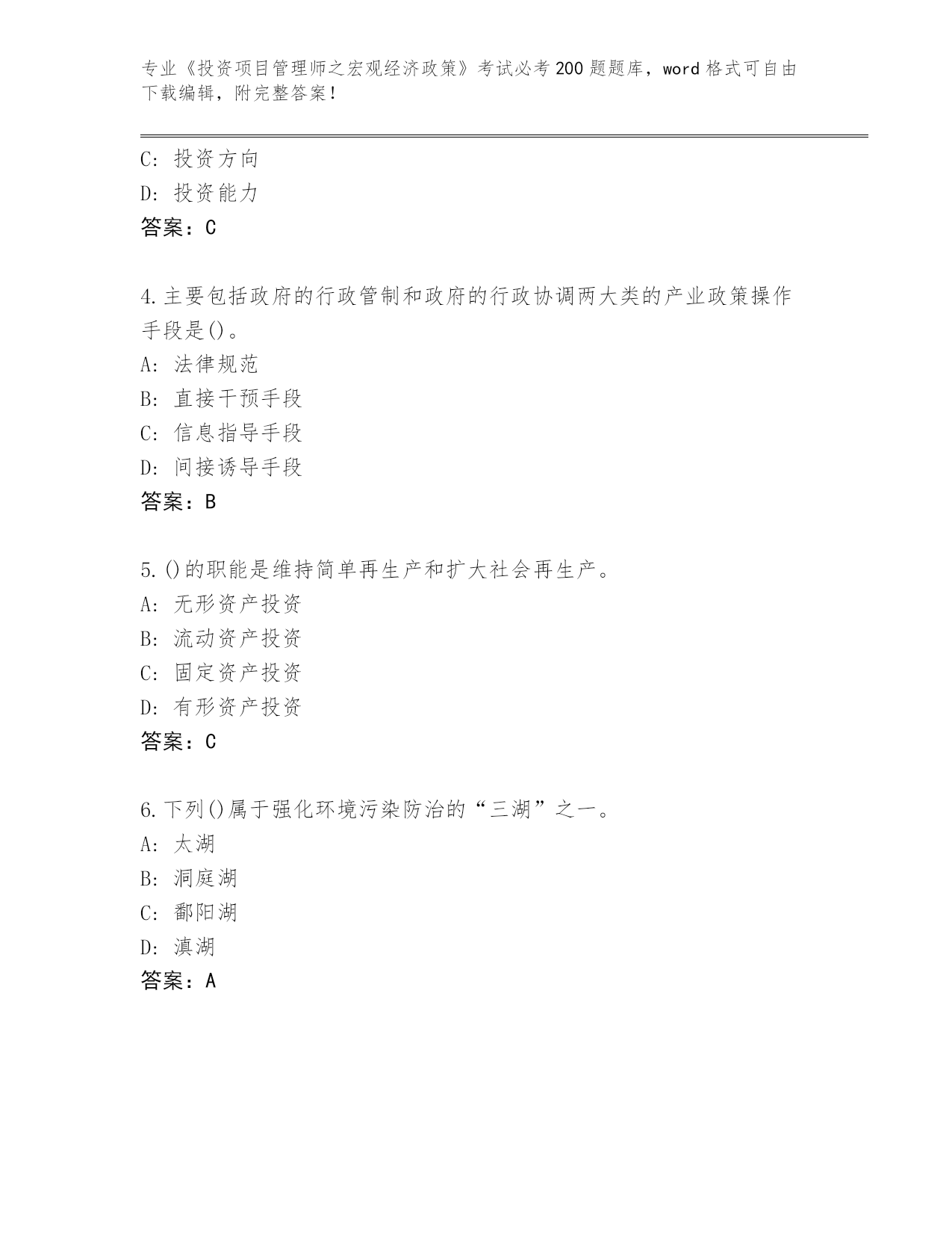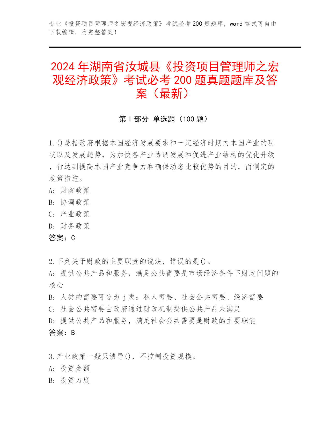 2024年湖南省汝城县《投资项目管理师之宏观经济政策》考试必考200题真题题库及答案(最新)