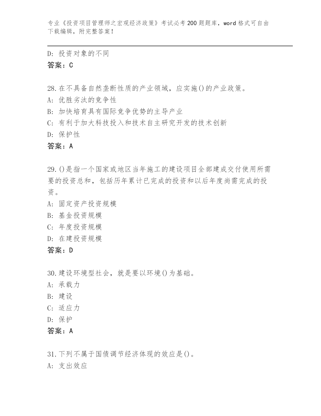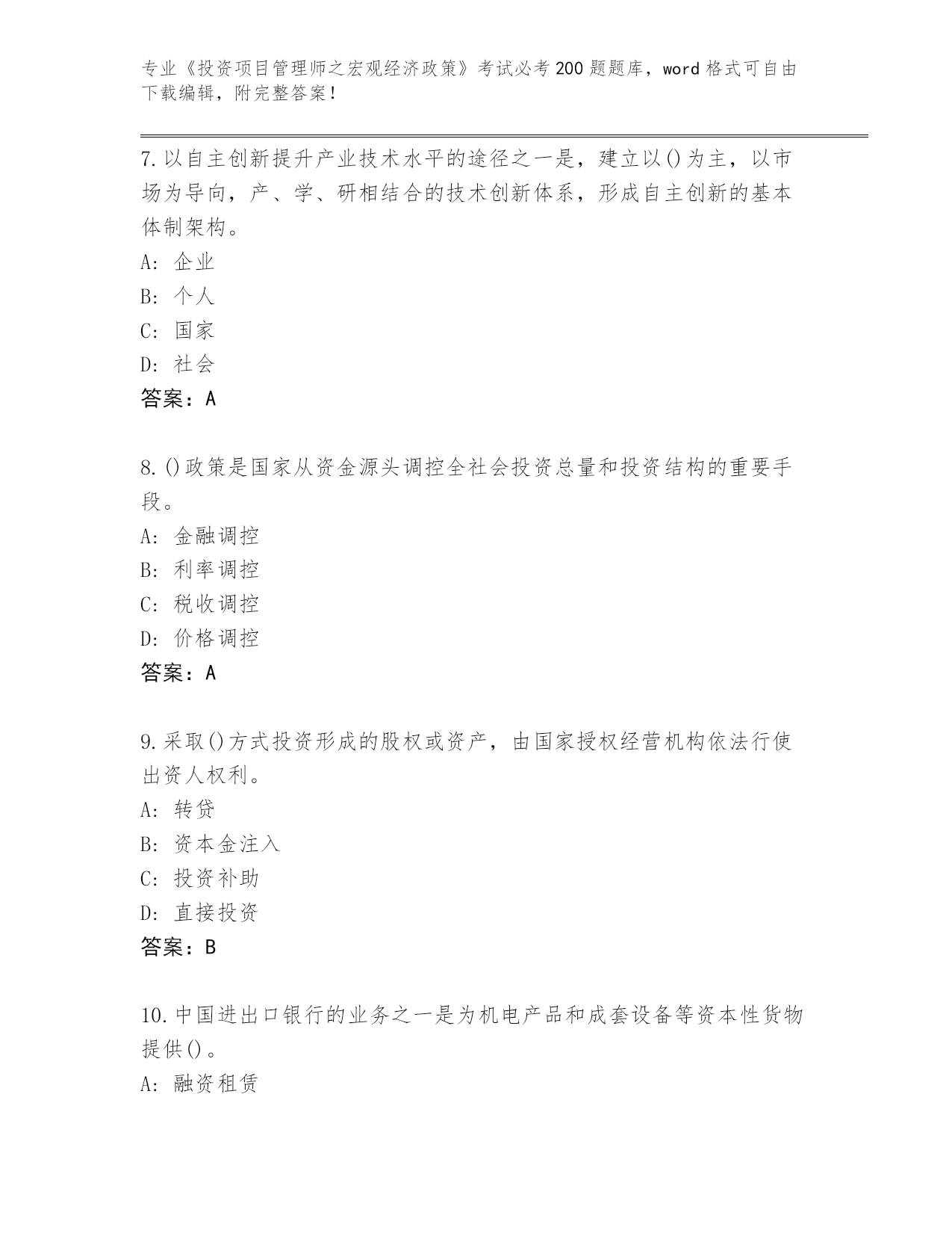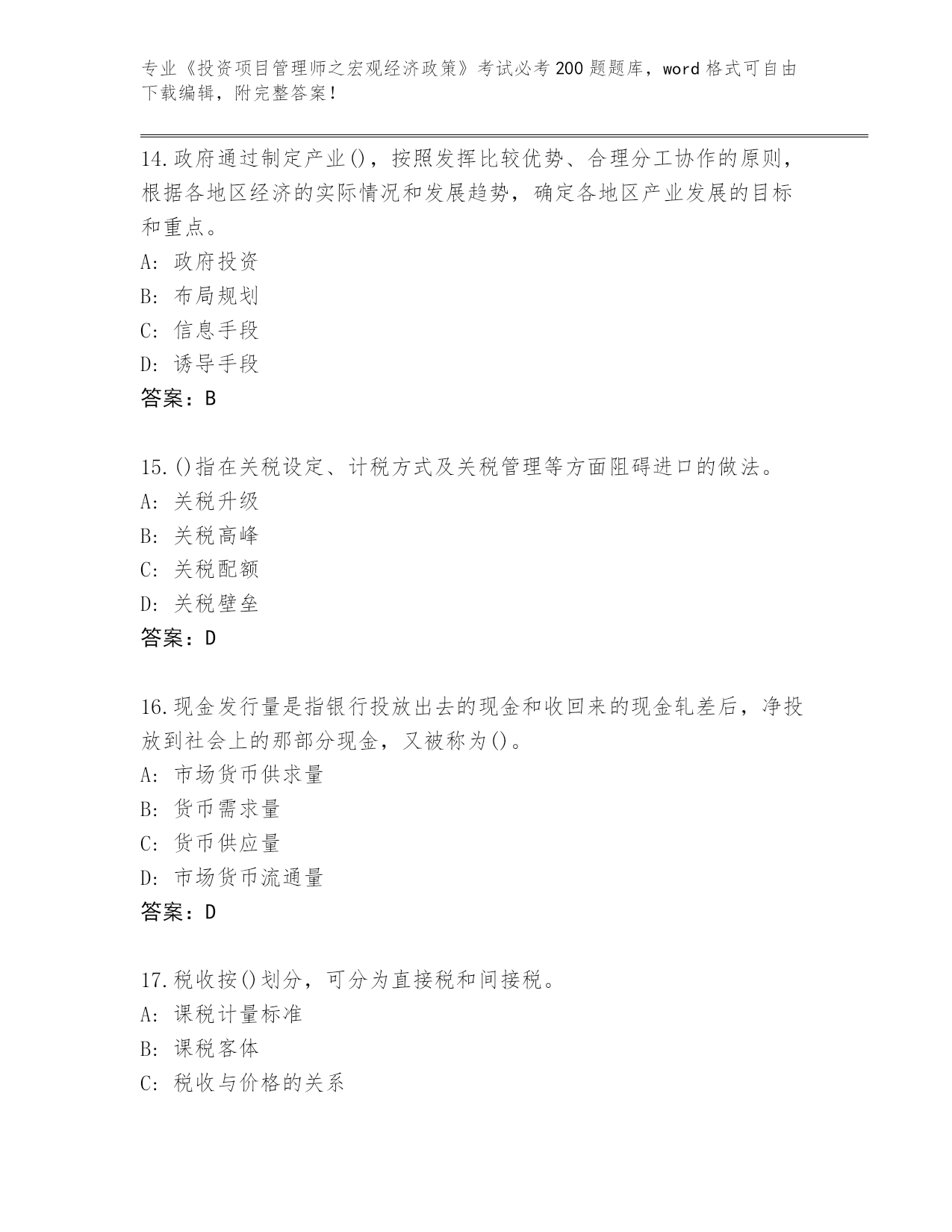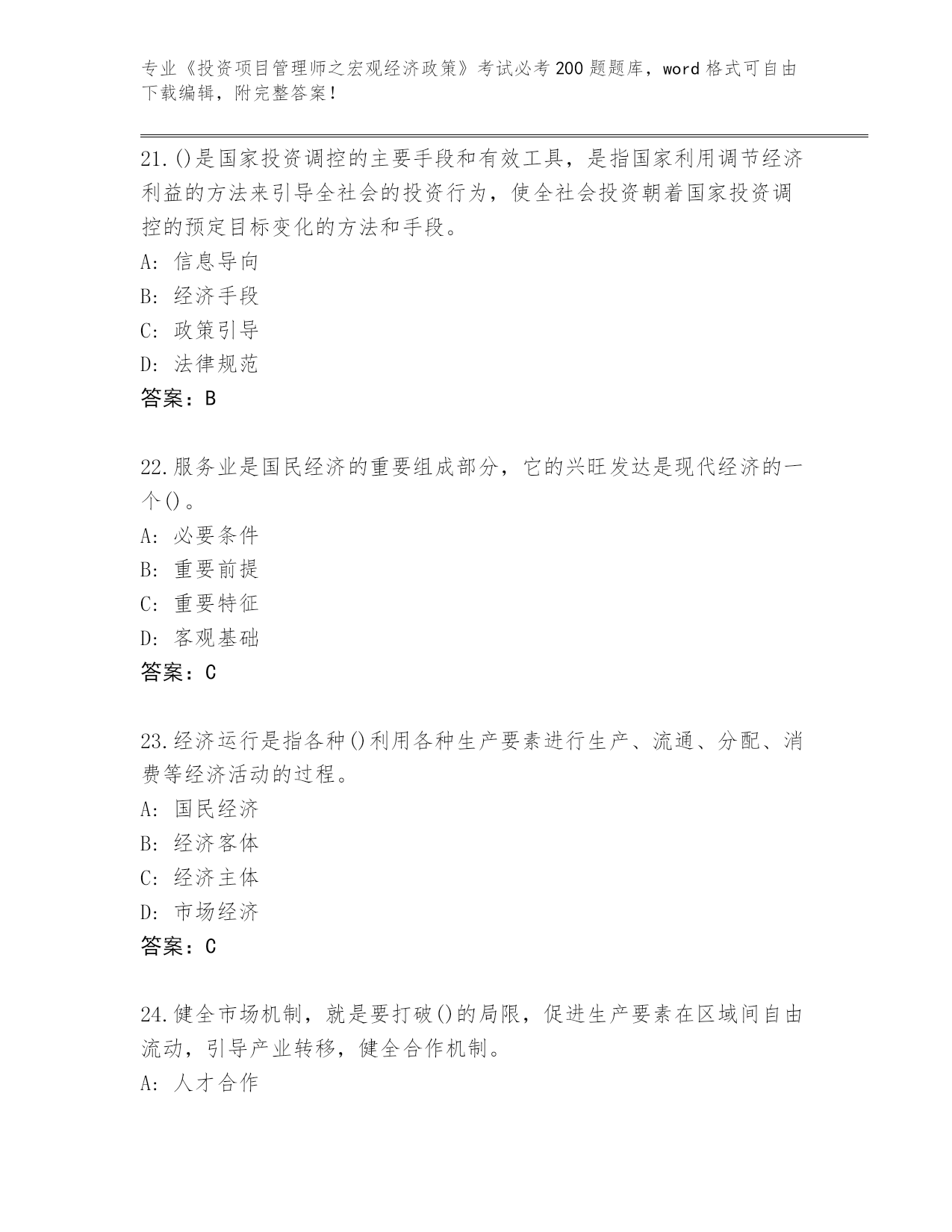 2024年湖南省汝城县《投资项目管理师之宏观经济政策》考试必刷200题真题及答案下载