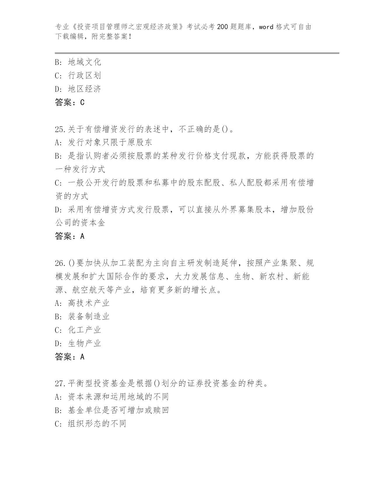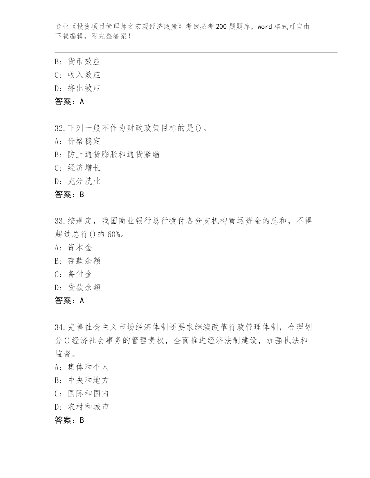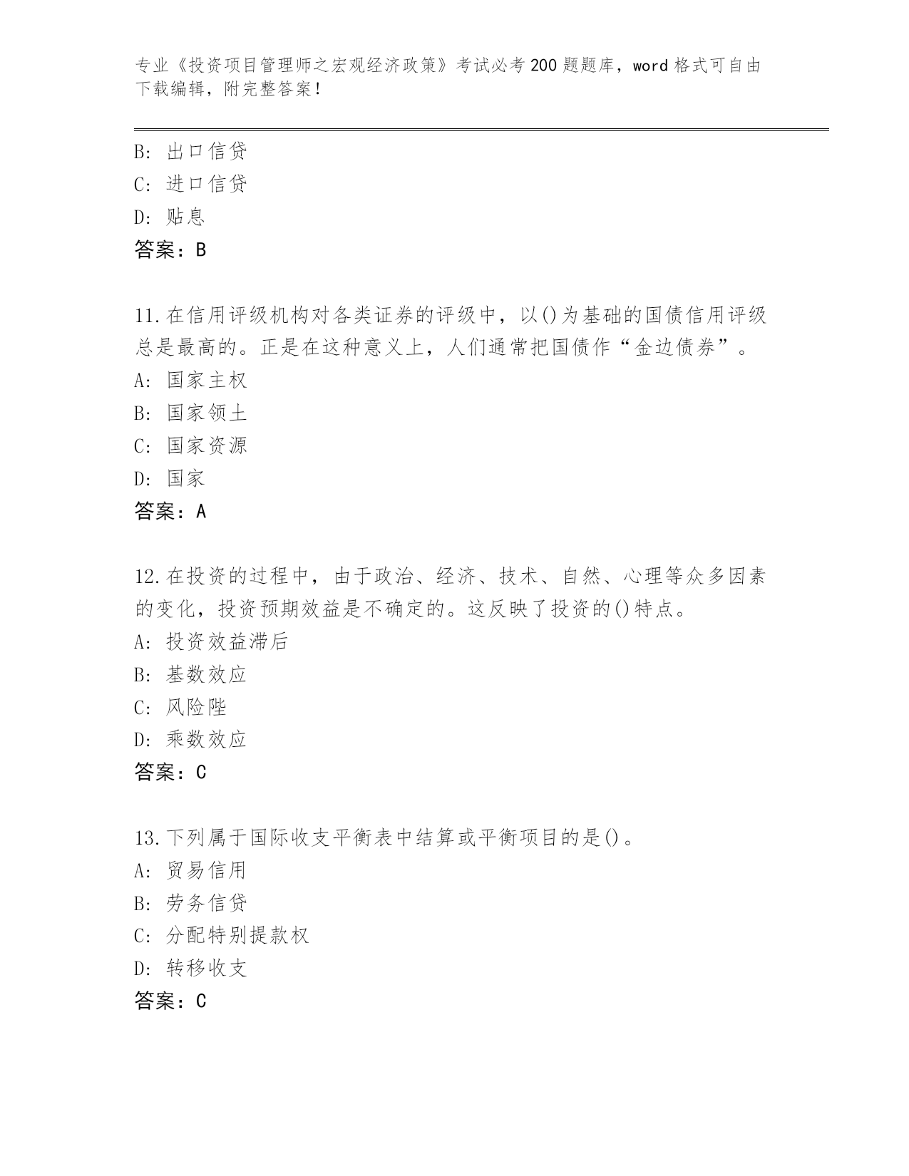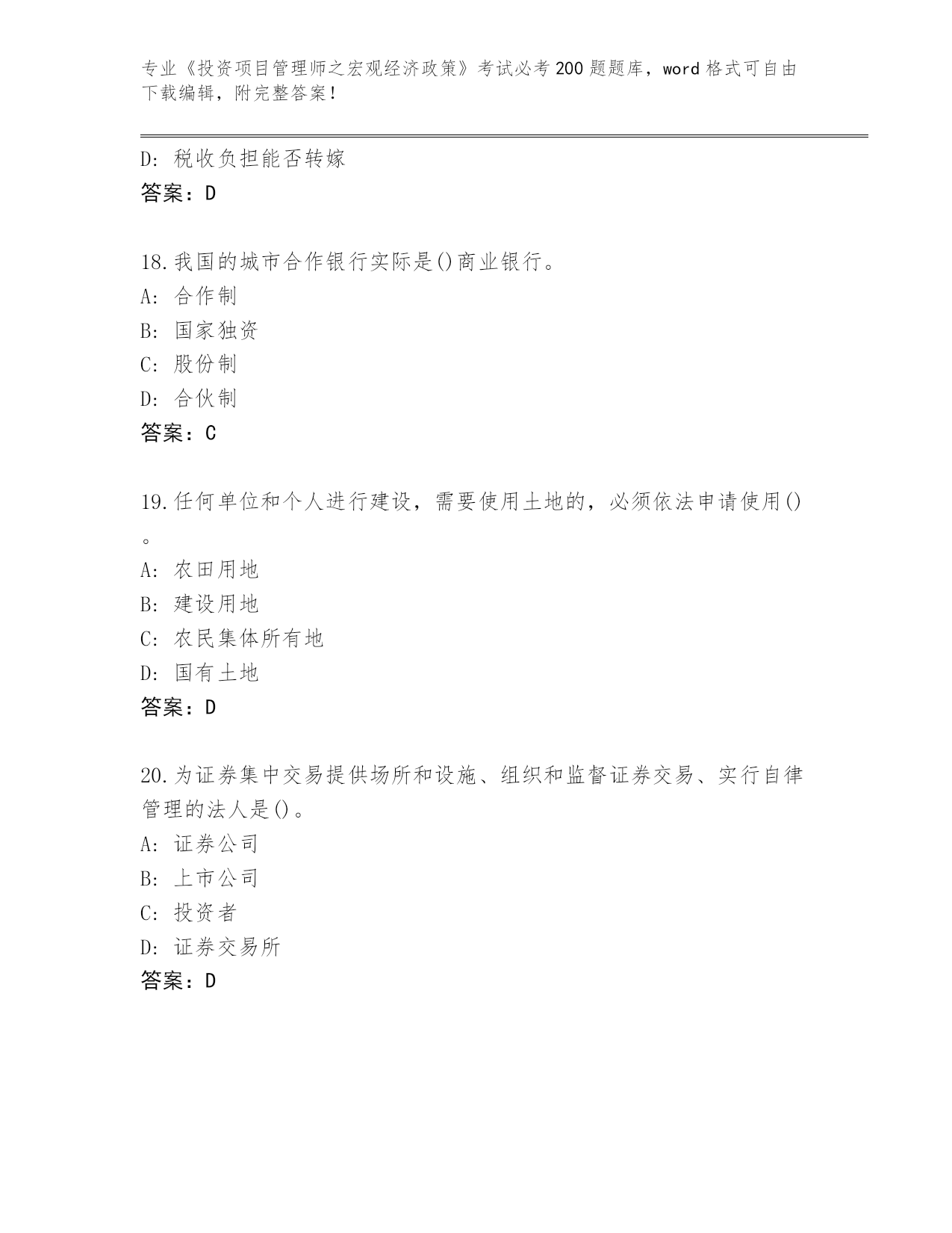 2024年湖南省汝城县《投资项目管理师之宏观经济政策》考试必刷200题真题及答案下载