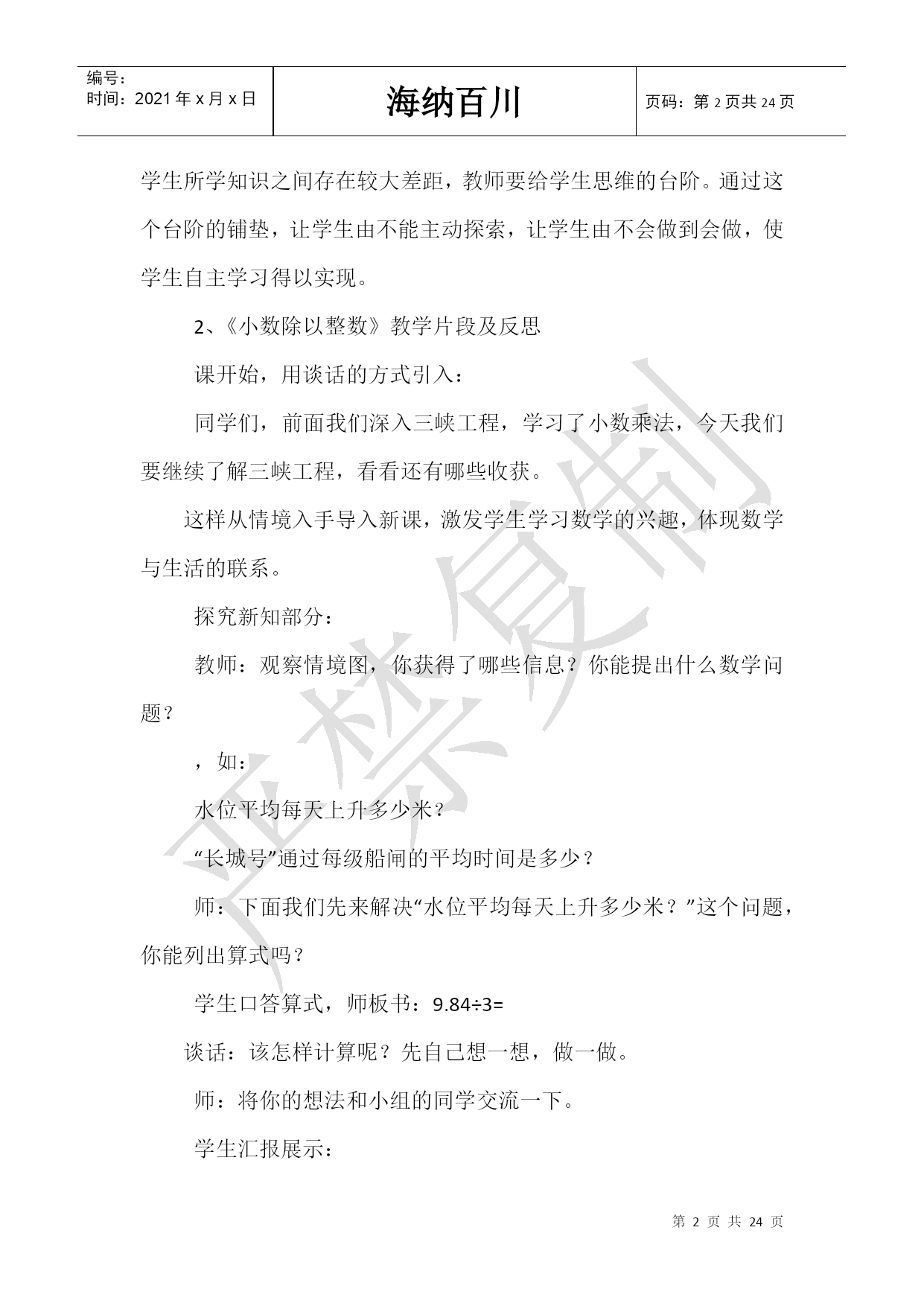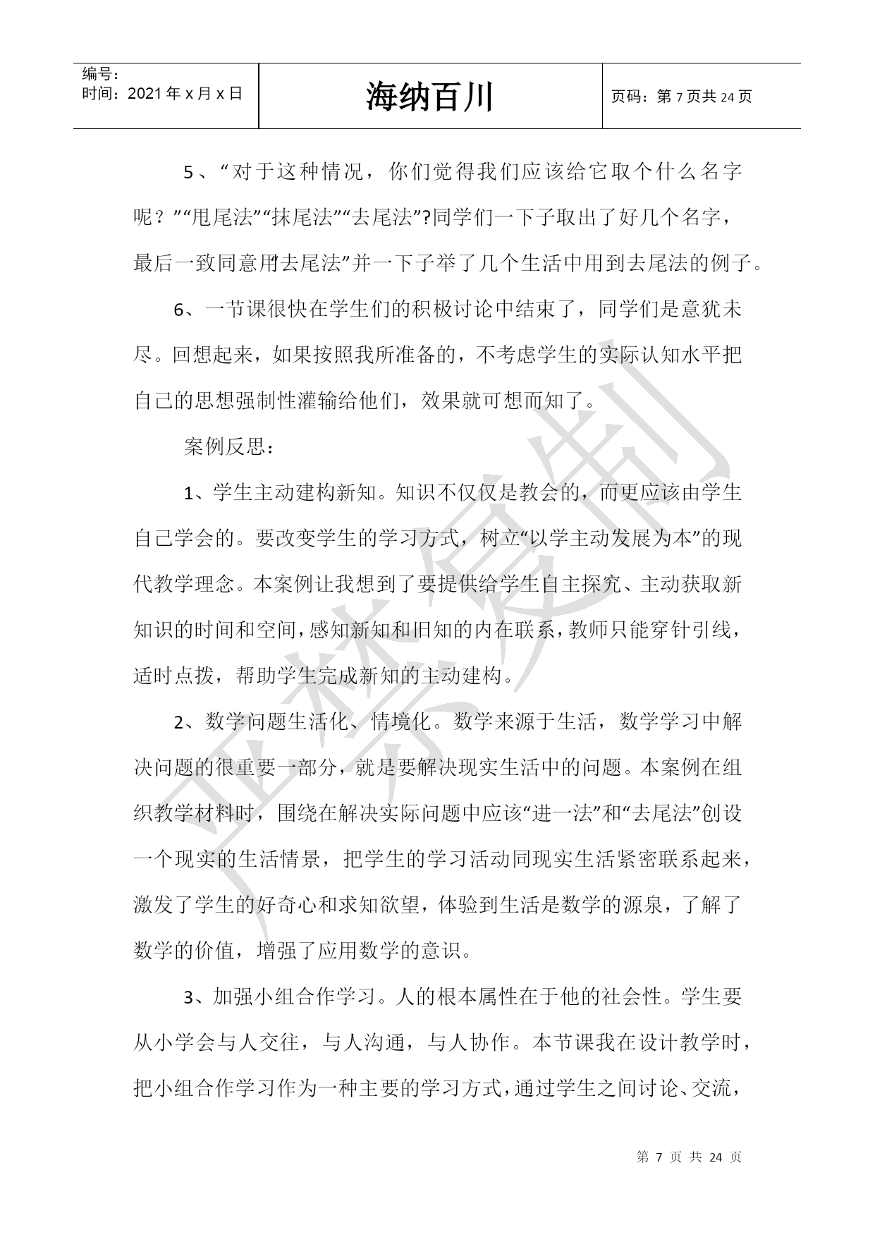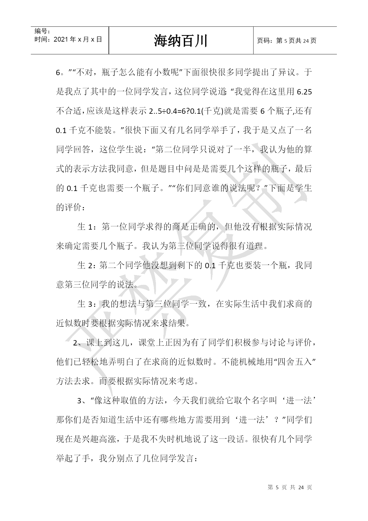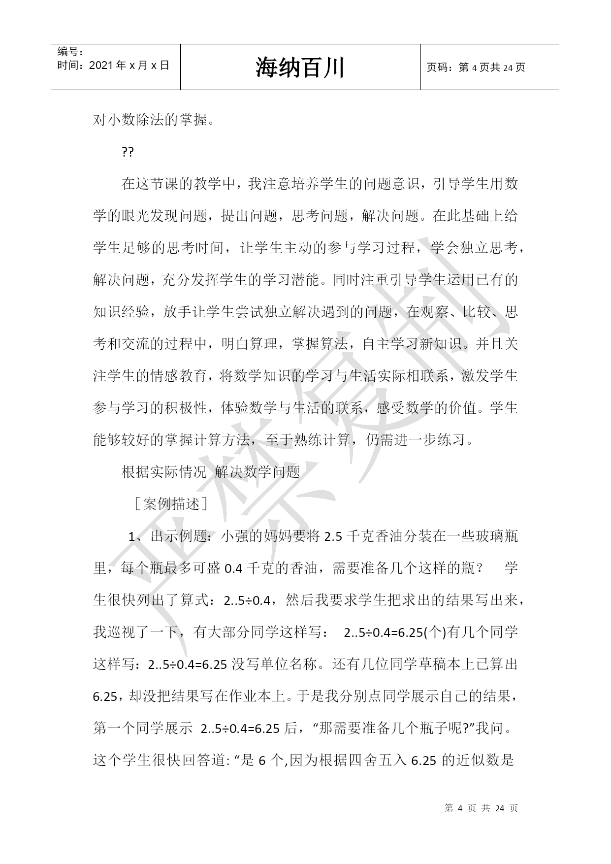 编号:时间:2021年x月x日海纳百川页码:第PAGE24页共NUMPAGES24页第PAGE\*MERGEFORMAT24页共NUMPAGES\*MERGEFORMAT24页教学案例与反思篇一:教学案例与反思1、求一个小数的近似数》案例及教学反思教学片段:把20.256保留两位小数、一位小数和整数,它的近似数各是多少?师:同学们对这个问题有什么不懂的地方吗?生:我不知道保留是什么意思?生:我知道“保留“就是留下来的意思。生:那么“保留两位小数”又是什么意思?师:老师考一考你们。“保留一位小数是什么意思呢?生1:保留一位小数就是把小数部分要留下来一位。师:保留整数呢?生2:就是把这个数小数点左边的数留下来。师:看来同学们真明白了。下面请同学们尝试例1,并让三个学生分别上黑板板书如下,再说一说他们是怎样想的。教学反思这节课通过学生的互相提问及讲解,收到了一想不到的效果。其成功原因在于:我们应该了解学生的现在知识水平与学习的新知识之间有多大的差距,或者说学生有多大的坎,能不能迈过去,或者说学生跳一跳能不能摘到果子,去体会成功的快乐。如果学生现有知识与学生所学知识之间存在较大差距,教师要给学生思维的台阶。通过这个台阶的铺垫,让学生由不能主动探索,让学生由不会做到会做,使学生自主学习得以实现。2、《小数除以整数》教学片段及反思课开始,用谈话的方式引入:同学们,前面我们深入三峡工程,学习了小数乘法,今天我们要继续了解三峡工程,看看还有哪些收获。这样从情境入手导入新课,激发学生学习数学的兴趣,体现数学与生活的联系。探究新知部分:教师:观察情境图,你获得了哪些信息?你能提出什么数学问题?,如:水位平均每天上升多少米?“长城号”通过每级船闸的平均时间是多少?师:下面我们先来解决“水位平均每天上升多少米?”这个问题,你能列出算式吗?学生口答算式,师板书:9.84÷3=谈话:该怎样计算呢?先自己想一想,做一做。师:将你的想法和小组的同学交流一下。学生汇报展示:估算:9÷3=3,9.84米比9米多,水位平均每天上升3米多。变成整数计算,9.84米=984厘米,984÷3=328=3.28竖式算法。这样教师尽量先给学生自主探索的空间,让他们尝试自己来解决问题,同时注意尊重学生的想法,给他们相互交流的机会,调动学生学习的积极性,同时也能够体现数学算法多样化的特点,发展学生的思维。师:下面我们来重点研究一下笔算方法。师:除到被除数的十分位仍有余数2,应该怎么办?学生共同把这道除法竖式做完。这样突出教学的重点,让学生理解为什么商的小数点要与被除数的小数点对齐。师:“长城号”通过每级船闸的平均时间是多少?你能自己解决吗?比较:这个题和前面学过的有什么不同?如果不够商1时该怎么办?概括:在什么情况下,小数除法中商的最高位是0?这样在前面教学的基础上,逐渐引导学生说出:只要被除数比除数小,商的个位上就不够商1,学生一边理解,一边消化,有利于对小数除法的掌握。??在这节课的教学中,我注意培养学生的问题意识,引导学生用数学的眼光发现问题,提出问题,思考问题,解决问题。在此基础上给学生足够的思考时间,让学生主动的参与学习过程,学会独立思考,解决问题,充分发挥学生的学习潜能。同时注重引导学生运用已有的知识经验,放手让学生尝试独立解决遇到的问题,在观察、比较、思考和交流的过程中,明白算理,掌握算法,自主学习新知识。并且关注学生的情感教育,将数学知识的学习与生活实际相联系,激发学生参与学习的积极性,体验数学与生活的联系,感受数学的价值。学生能够较好的掌握计算方法,至于熟练计算,仍需进一步练习。根据实际情况解决数学问题[案例描述]1、出示例题:小强的妈妈要将2.5千克香油分装在一些玻璃瓶里,每个瓶最多可盛0.4千克的香油,需要准备几个这样的瓶?学生很快列出了算式:2..5÷0.4,然后我要求学生把求出的结果写出来,我巡视了一下,有大部分同学这样写:2..5÷0.4=6.25(个)有几个同学这样写:2..5÷0.4=6.25没写单位名称。还有几位同学草稿本上已算出6.25,却没把结果写在作业本上。于是我分别点同学展示自己的结果,第一个同学展示2..5÷0.4=6.25后,“那需要准备几个瓶子呢?”我问。这个学生很快回答道:“是6个,因为根据四舍五入6.25的近似数是6。”“不对,瓶子怎么能有小数呢”下面很快很多同学提出了异议。于是我点了其中的一位同学发言,这位同学说道:“我觉得在这里用6.25不合适,应该是这样表示2..5÷0.4=6?0.1(千克)就是需要6个瓶子,还有0.1千克不能装。”很快下面又有几名同学举手了,我于是又点了一名同学回答,这位学