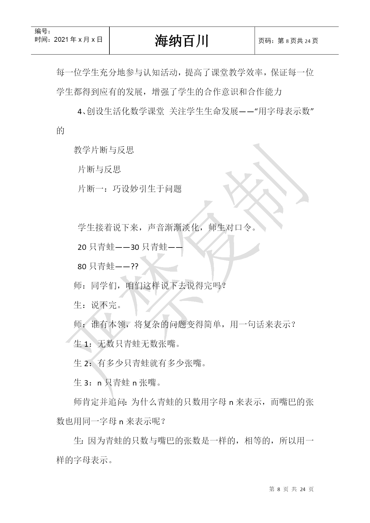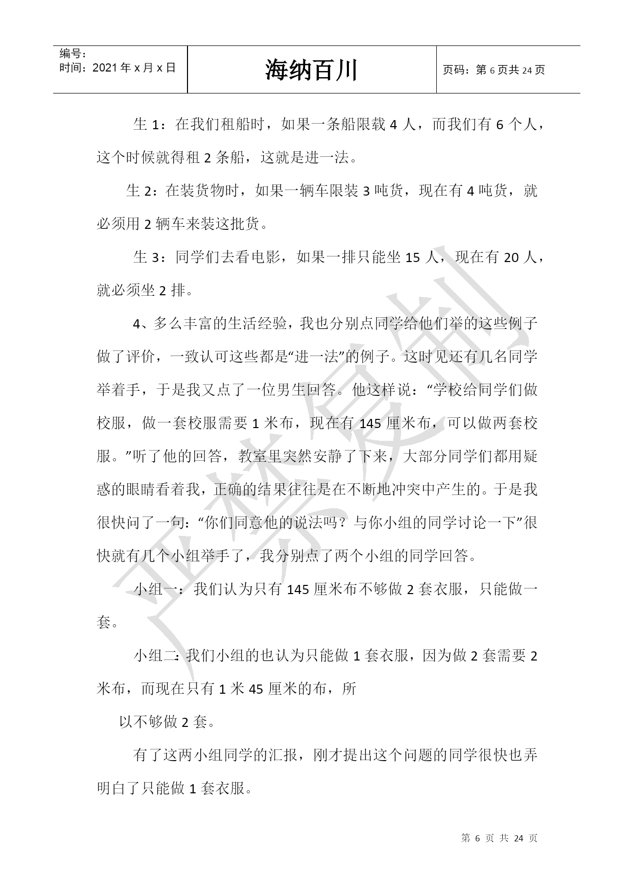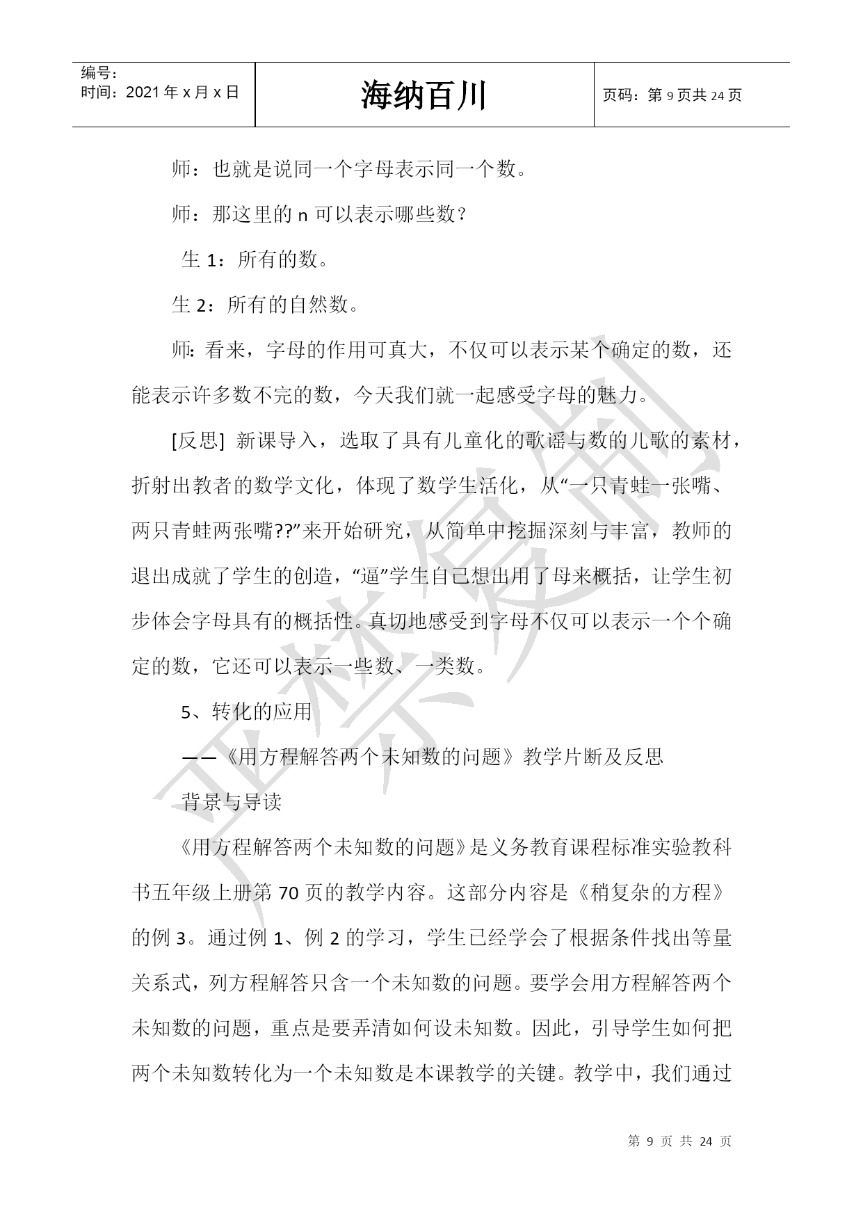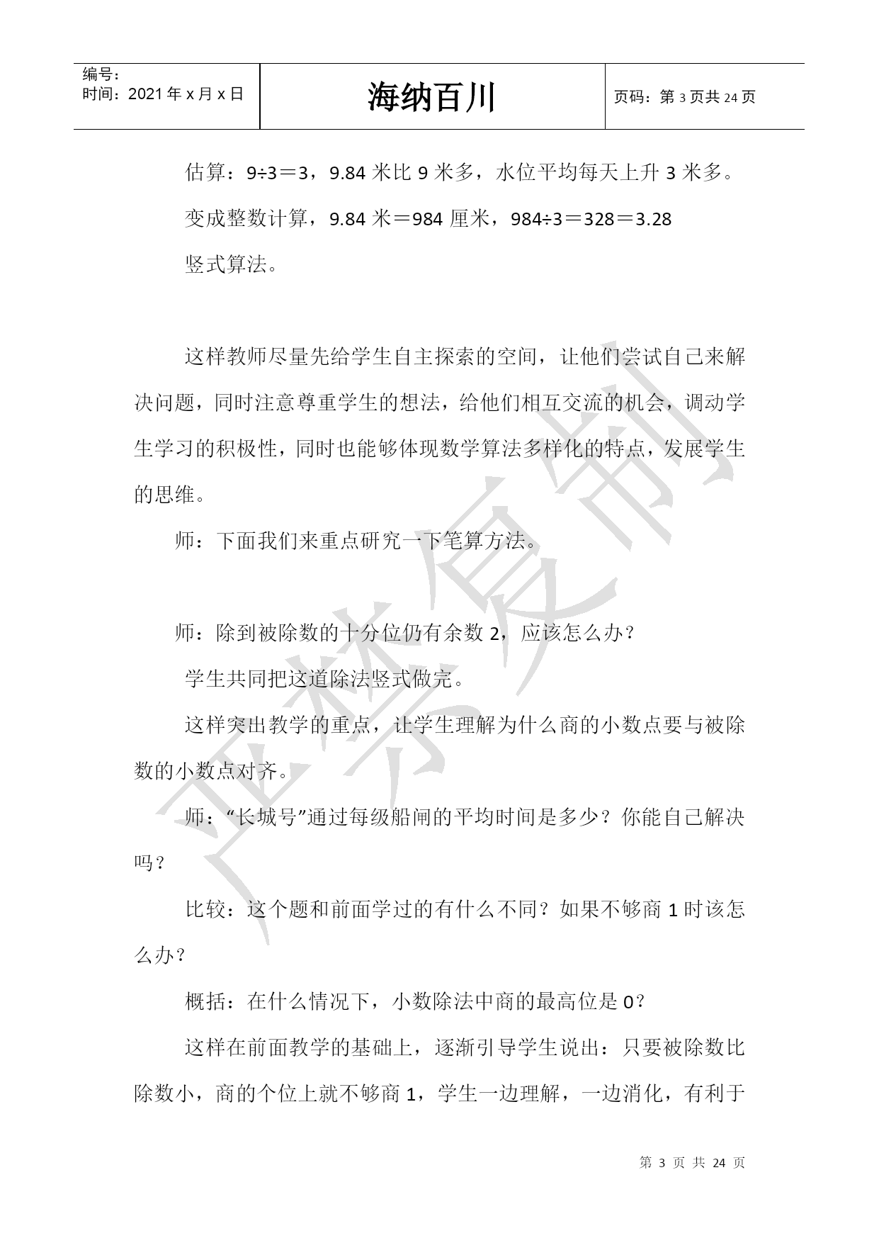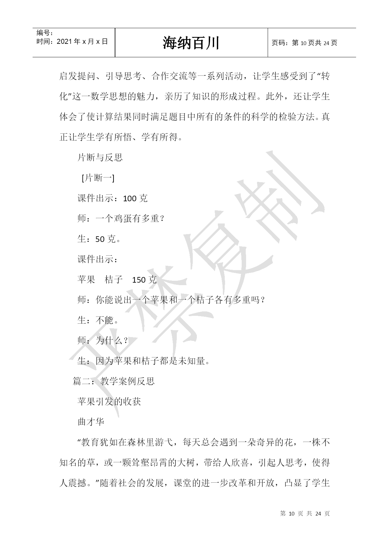 编号:时间:2021年x月x日海纳百川页码:第PAGE24页共NUMPAGES24页第PAGE\*MERGEFORMAT24页共NUMPAGES\*MERGEFORMAT24页教学案例与反思篇一:教学案例与反思1、求一个小数的近似数》案例及教学反思教学片段:把20.256保留两位小数、一位小数和整数,它的近似数各是多少?师:同学们对这个问题有什么不懂的地方吗?生:我不知道保留是什么意思?生:我知道“保留“就是留下来的意思。生:那么“保留两位小数”又是什么意思?师:老师考一考你们。“保留一位小数是什么意思呢?生1:保留一位小数就是把小数部分要留下来一位。师:保留整数呢?生2:就是把这个数小数点左边的数留下来。师:看来同学们真明白了。下面请同学们尝试例1,并让三个学生分别上黑板板书如下,再说一说他们是怎样想的。教学反思这节课通过学生的互相提问及讲解,收到了一想不到的效果。其成功原因在于:我们应该了解学生的现在知识水平与学习的新知识之间有多大的差距,或者说学生有多大的坎,能不能迈过去,或者说学生跳一跳能不能摘到果子,去体会成功的快乐。如果学生现有知识与学生所学知识之间存在较大差距,教师要给学生思维的台阶。通过这个台阶的铺垫,让学生由不能主动探索,让学生由不会做到会做,使学生自主学习得以实现。2、《小数除以整数》教学片段及反思课开始,用谈话的方式引入:同学们,前面我们深入三峡工程,学习了小数乘法,今天我们要继续了解三峡工程,看看还有哪些收获。这样从情境入手导入新课,激发学生学习数学的兴趣,体现数学与生活的联系。探究新知部分:教师:观察情境图,你获得了哪些信息?你能提出什么数学问题?,如:水位平均每天上升多少米?“长城号”通过每级船闸的平均时间是多少?师:下面我们先来解决“水位平均每天上升多少米?”这个问题,你能列出算式吗?学生口答算式,师板书:9.84÷3=谈话:该怎样计算呢?先自己想一想,做一做。师:将你的想法和小组的同学交流一下。学生汇报展示:估算:9÷3=3,9.84米比9米多,水位平均每天上升3米多。变成整数计算,9.84米=984厘米,984÷3=328=3.28竖式算法。这样教师尽量先给学生自主探索的空间,让他们尝试自己来解决问题,同时注意尊重学生的想法,给他们相互交流的机会,调动学生学习的积极性,同时也能够体现数学算法多样化的特点,发展学生的思维。师:下面我们来重点研究一下笔算方法。师:除到被除数的十分位仍有余数2,应该怎么办?学生共同把这道除法竖式做完。这样突出教学的重点,让学生理解为什么商的小数点要与被除数的小数点对齐。师:“长城号”通过每级船闸的平均时间是多少?你能自己解决吗?比较:这个题和前面学过的有什么不同?如果不够商1时该怎么办?概括:在什么情况下,小数除法中商的最高位是0?这样在前面教学的基础上,逐渐引导学生说出:只要被除数比除数小,商的个位上就不够商1,学生一边理解,一边消化,有利于对小数除法的掌握。??在这节课的教学中,我注意培养学生的问题意识,引导学生用数学的眼光发现问题,提出问题,思考问题,解决问题。在此基础上给学生足够的思考时间,让学生主动的参与学习过程,学会独立思考,解决问题,充分发挥学生的学习潜能。同时注重引导学生运用已有的知识经验,放手让学生尝试独立解决遇到的问题,在观察、比较、思考和交流的过程中,明白算理,掌握算法,自主学习新知识。并且关注学生的情感教育,将数学知识的学习与生活实际相联系,激发学生参与学习的积极性,体验数学与生活的联系,感受数学的价值。学生能够较好的掌握计算方法,至于熟练计算,仍需进一步练习。根据实际情况解决数学问题[案例描述]1、出示例题:小强的妈妈要将2.5千克香油分装在一些玻璃瓶里,每个瓶最多可盛0.4千克的香油,需要准备几个这样的瓶?学生很快列出了算式:2..5÷0.4,然后我要求学生把求出的结果写出来,我巡视了一下,有大部分同学这样写:2..5÷0.4=6.25(个)有几个同学这样写:2..5÷0.4=6.25没写单位名称。还有几位同学草稿本上已算出6.25,却没把结果写在作业本上。于是我分别点同学展示自己的结果,第一个同学展示2..5÷0.4=6.25后,“那需要准备几个瓶子呢?”我问。这个学生很快回答道:“是6个,因为根据四舍五入6.25的近似数是6。”“不对,瓶子怎么能有小数呢”下面很快很多同学提出了异议。于是我点了其中的一位同学发言,这位同学说道:“我觉得在这里用6.25不合适,应该是这样表示2..5÷0.4=6?0.1(千克)就是需要6个瓶子,还有0.1千克不能装。”很快下面又有几名同学举手了,我于是又点了一名同学回答,这位学