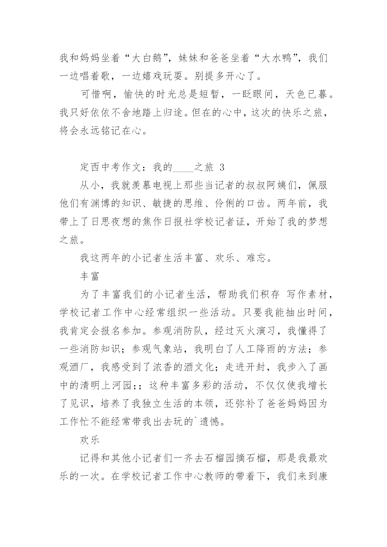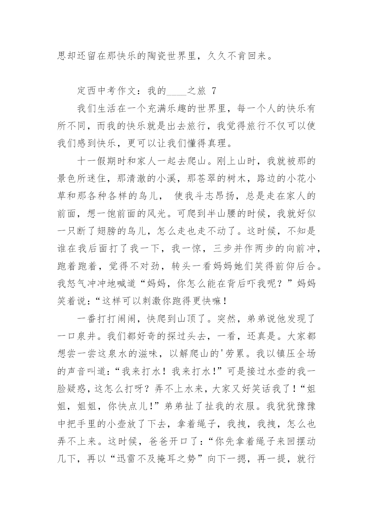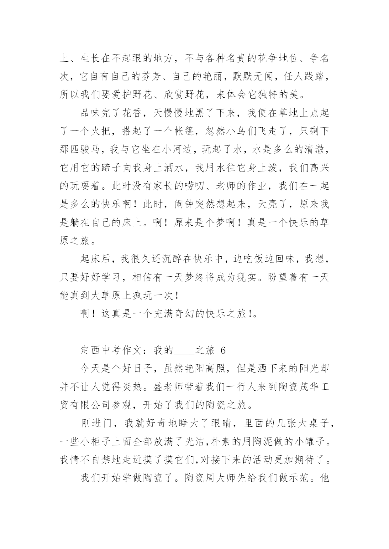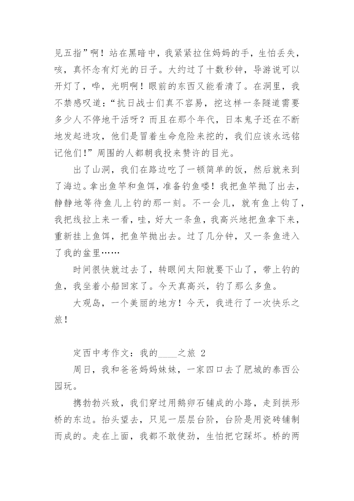 定西中考作文:我的____之旅2024年定西中考作文范文:我的____之旅(精选18篇)在平时的学习、工作或生活中,大家都不可避免地会接触到作文吧,作文要求篇章结构完整,一定要避免无结尾作文的出现。那么问题来了,到底应如何写一篇优秀的作文呢?以下是小编为大家收集的2024年定西中考作文范文:我的____之旅,供大家参考借鉴,希望可以帮助到有需要的朋友。定西中考作文:我的____之旅1终于把国庆节盼来了,国庆七天的假期去旅行再合适不过了,这不,今天我们就来到了大观岛。大观岛位于仰口地区,旁边就是著名的崂山。我们驱车到达仰口码头,又坐了40分钟的船才到大观岛。登上岛以后,我四处眺望,发现整个岛被海水包围,宛如一件蓝色的衣服中镶嵌着一颗绿宝石。跟随着导游走了一会儿,突然一个大洞口出现在我们的面前,导游一边走一边说:“这个就是抗日时期八路军挖的'防空洞,我们现在就进去参观一下。”说完,导游就进去了,我们也紧随其后。洞口很小,只能容纳一个人进出。进去以后,我们纷纷打开手电筒,发现山洞里全都是大大小小的房间,有的房间的墙壁上还有一些弹孔。走了一会儿,导游让我们把手电筒全部关闭,说让我们感受一下当年洞里的生活。霎时,洞里变成漆黑一片,我们就连手指头也看不见了,这时可真是“伸手不见五指”啊!站在黑暗中,我紧紧拉住妈妈的手,生怕丢失,咳,真怀念有灯光的日子。大约过了十数秒钟,导游说可以开灯了,哗,光明啊!眼前的东西又能看清了。在洞里,我不禁感叹道:“抗日战士们真不容易,挖这样一条隧道需要多少人不停地干活呀?而且在那个年代,日本鬼子还在不断地发起进攻,他们是冒着生命危险来挖的,我们应该永远铭记他们!”周围的人都朝我投来赞许的目光。出了山洞,我们在路边吃了一顿简单的饭,然后就来到了海边。拿出鱼竿和鱼饵,准备钓鱼喽!我把鱼竿抛了出去,静静地等待鱼儿上钓的那一刻。不一会儿,就有鱼上钩了,我把线拉上来一看,哇,好大一条鱼,我高兴地把鱼拿下来,重新挂上鱼饵,把鱼竿抛出去。过了几分钟,又一条鱼进入了我的盆里……时间很快就过去了,转眼间太阳就要下山了,带上钓的鱼,我坐着小船回家了。今天真高兴,钓了那么多鱼。大观岛,一个美丽的地方!今天,我进行了一次快乐之旅!定西中考作文:我的____之旅2周日,我和爸爸妈妈妹妹,一家四口去了肥城的泰西公园玩。携勃勃兴致,我们穿过用鹅卵石铺成的小路,走到拱形桥的东边。抬头望去,只见一层层台阶,台阶是用瓷砖铺制而成的。走在上面,我都不敢使劲,生怕把它踩坏。桥的两边有一些花骨朵似的东西,细眼看去,显得十分精致。站在桥的上面,俯视水面,水真绿啊,绿得像一块无瑕的翡翠;水真静啊,静地让人感觉不到它在的流动。走下桥,我看到了一对新婚的人正在拍婚纱照,幸福的人儿好像也被这美丽的景色所陶醉,妄想把他们都搬进自己的相册带回家。我们不忍心打搅他们,悄悄地走开了。我们来到花园,花儿万紫千红,婀娜多姿。绿树翠竹四面环和,郁郁葱葱,与红花绿叶相映成趣。谁想天公不作美,转眼间,乌云密布,好像要下雨了。欣赏风景的人们纷纷躲在小亭子里。一时间,小亭子里成了欢乐的的海洋。人们聊得是雨,赏的是风景。在亭子里,朝外面望去,被雨冲刷过得小草越发显得更加娇嫩和翠绿。小雨并没有持续很长时间,雨势变弱,我们便又迫不及待的踏上了游园之旅。院子里一些奇形怪状的石头吸引住了我,它们憨态可掬,有的像小狗,正在津津有味的啃着骨头;有的像鳄鱼,正在懒洋洋地睡大觉;有的像大象,有的像小猫咪,有的像鸭子,有的像天鹅,有的像……恋恋不舍的离开形态各异的石头阵,我们继续前行,映入眼帘的是一池湖水。湖水像明镜似的闪着光,湖边的垂柳仿佛在贪婪地吮吸着清凉的湖水。走到湖的`东面,看到湖中太阳的影子,风儿一吹,阳光照在波光粼粼的湖面上,像给水面铺上了一层闪闪发光的碎银,又像被揉皱了的绿缎。看到这么美的景色,我们便租了两条小船,畅游其中。我和妈妈坐着“大白鹅”,妹妹和爸爸坐着“大水鸭”,我们一边唱着歌,一边嬉戏玩耍。别提多开心了。可惜啊,愉快的时光总是短暂,一眨眼间,天色已暮。我只好依依不舍地踏上归途。但在的心中,这次的快乐之旅,将会永远铭记在心。定西中考作文:我的____之旅3从小,我就羡慕电视上那些当记者的叔叔阿姨们,佩服他们有渊博的知识、敏捷的思维、伶俐的口齿。两年前,我带上了日思夜想的焦作日报社学校记者证,开始了我的梦想之旅。我这两年的小记者生活丰富、欢乐、难忘。丰富为了丰富我们的小记者生活,帮助我们积存写作素材,学校记者工作中心经常组织一些活动。只要我能抽出时间,我肯定会报名参加。参观消防队,经过灭火演习,我懂得了一些消防知识;参观气象站,我明白了人工降雨的方法;参观酒厂,我感受到了浓香的酒文化;走进开封,我步入了画中的清明上河园;;这种丰富多彩的活动,不仅仅使我增长了见识,培养了我独立