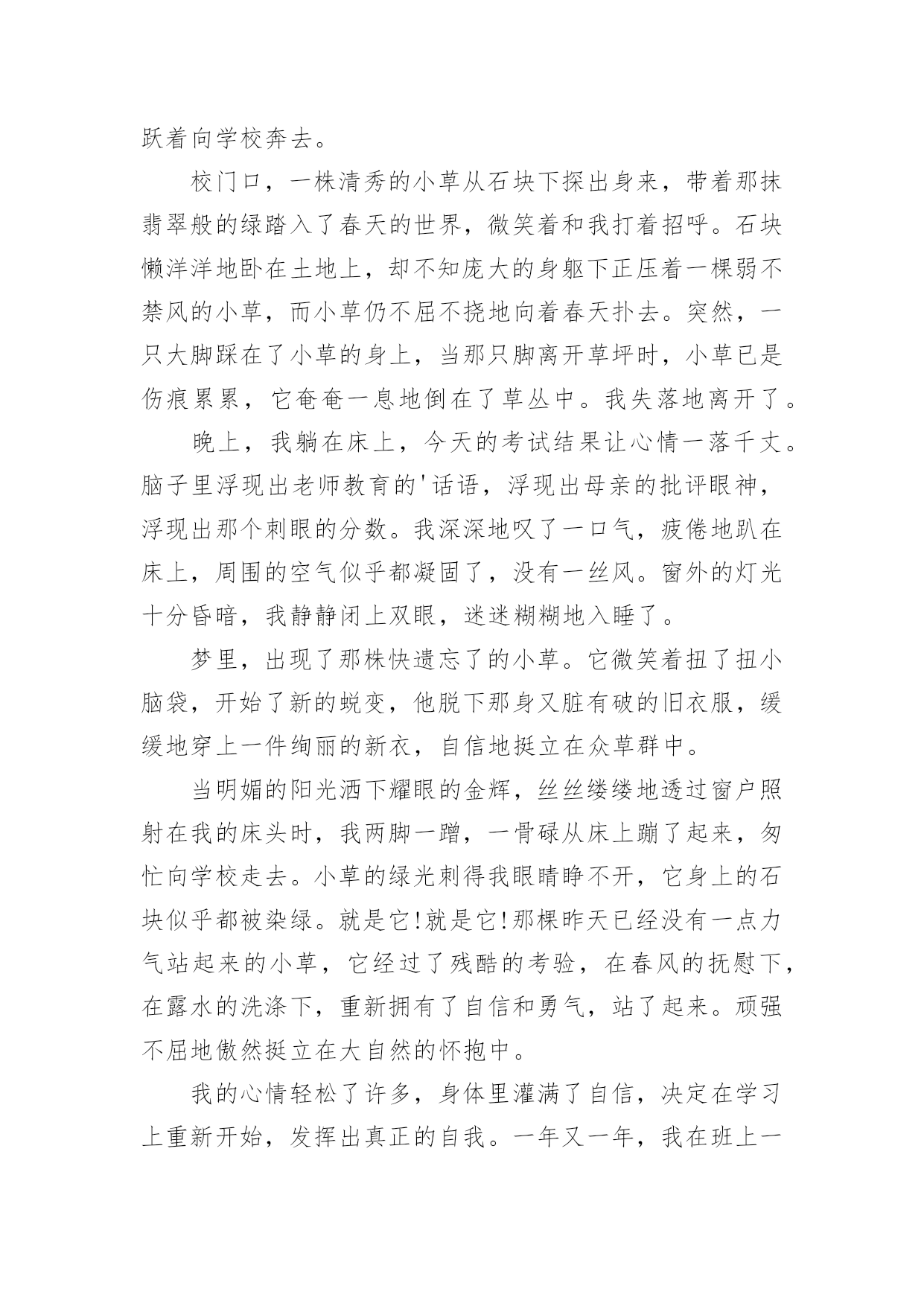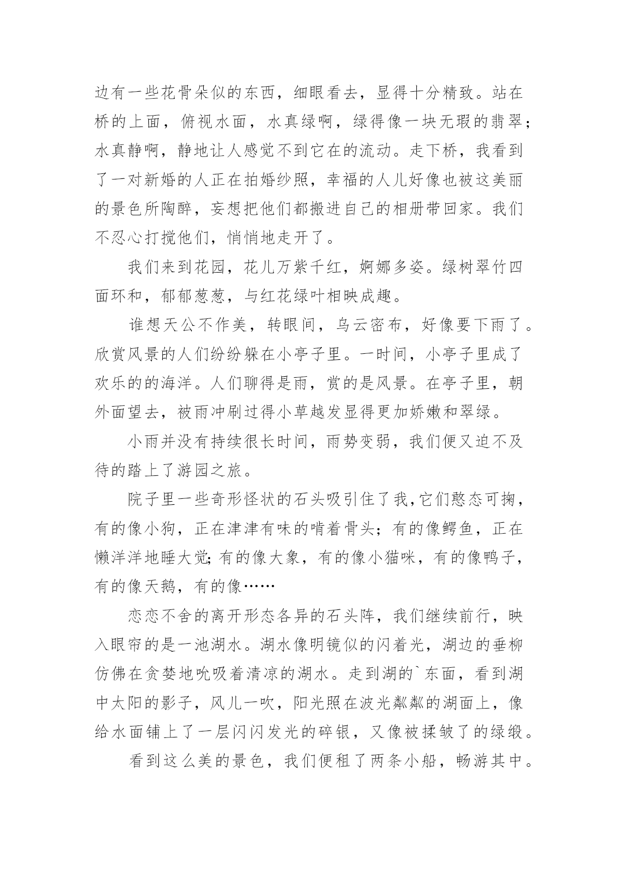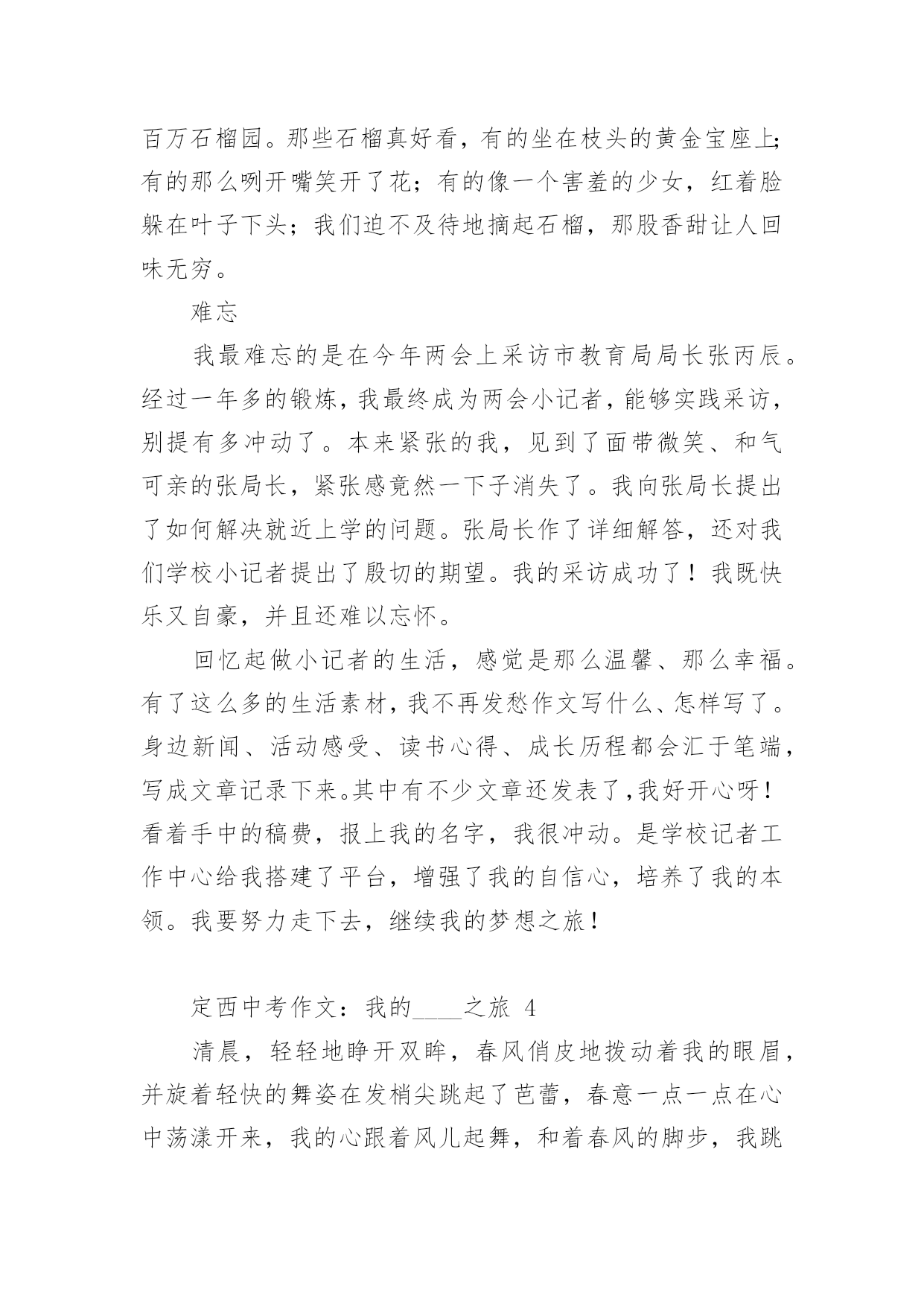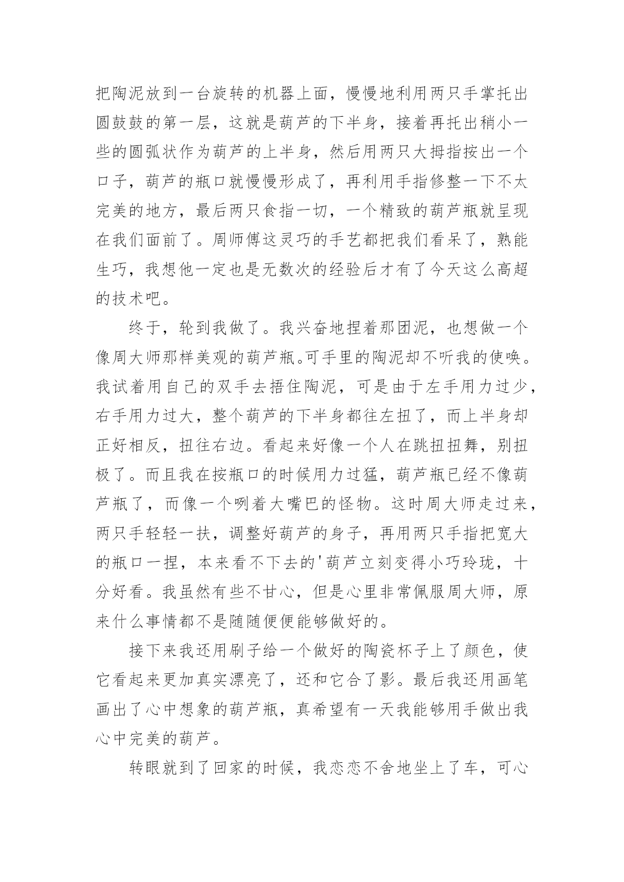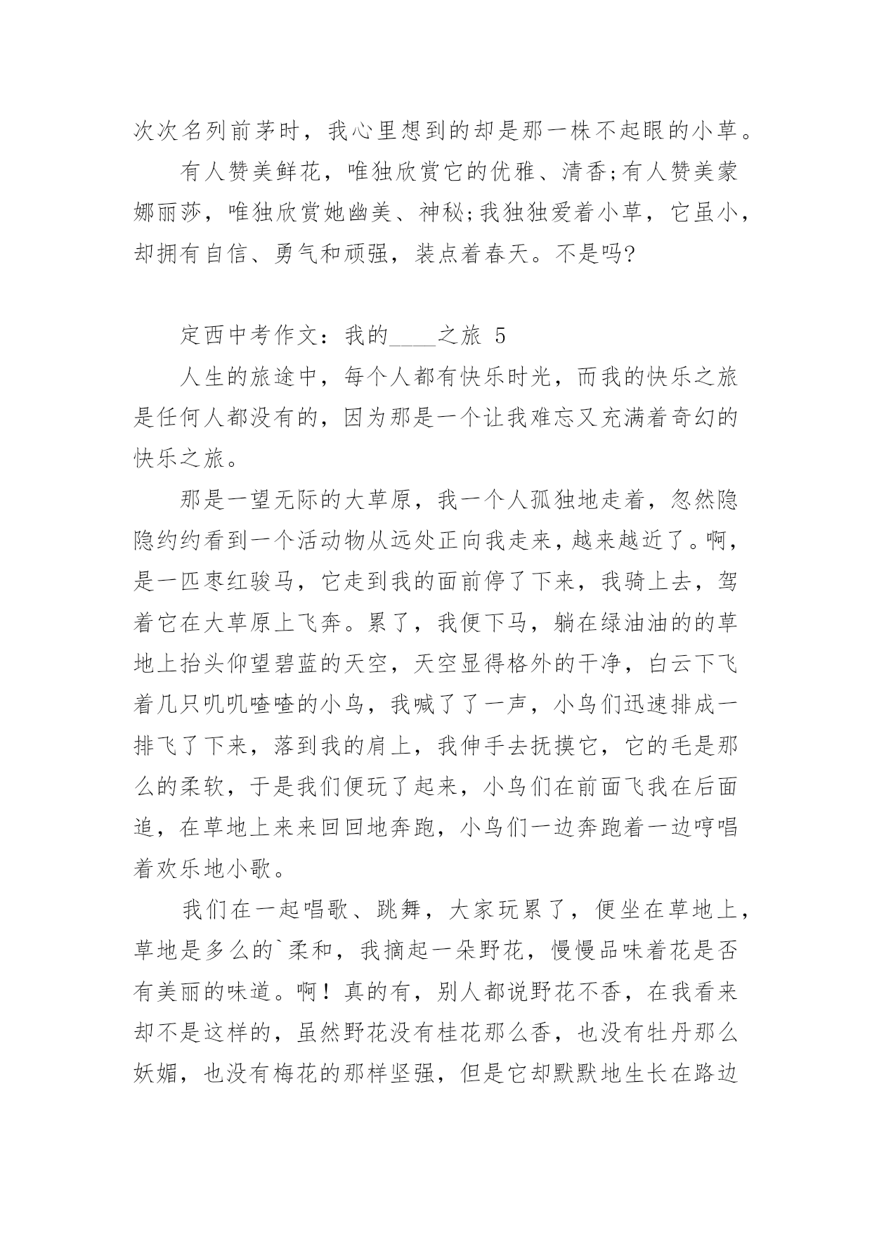 定西中考作文:我的____之旅2024年定西中考作文范文:我的____之旅(精选18篇)在平时的学习、工作或生活中,大家都不可避免地会接触到作文吧,作文要求篇章结构完整,一定要避免无结尾作文的出现。那么问题来了,到底应如何写一篇优秀的作文呢?以下是小编为大家收集的2024年定西中考作文范文:我的____之旅,供大家参考借鉴,希望可以帮助到有需要的朋友。定西中考作文:我的____之旅1终于把国庆节盼来了,国庆七天的假期去旅行再合适不过了,这不,今天我们就来到了大观岛。大观岛位于仰口地区,旁边就是著名的崂山。我们驱车到达仰口码头,又坐了40分钟的船才到大观岛。登上岛以后,我四处眺望,发现整个岛被海水包围,宛如一件蓝色的衣服中镶嵌着一颗绿宝石。跟随着导游走了一会儿,突然一个大洞口出现在我们的面前,导游一边走一边说:“这个就是抗日时期八路军挖的'防空洞,我们现在就进去参观一下。”说完,导游就进去了,我们也紧随其后。洞口很小,只能容纳一个人进出。进去以后,我们纷纷打开手电筒,发现山洞里全都是大大小小的房间,有的房间的墙壁上还有一些弹孔。走了一会儿,导游让我们把手电筒全部关闭,说让我们感受一下当年洞里的生活。霎时,洞里变成漆黑一片,我们就连手指头也看不见了,这时可真是“伸手不见五指”啊!站在黑暗中,我紧紧拉住妈妈的手,生怕丢失,咳,真怀念有灯光的日子。大约过了十数秒钟,导游说可以开灯了,哗,光明啊!眼前的东西又能看清了。在洞里,我不禁感叹道:“抗日战士们真不容易,挖这样一条隧道需要多少人不停地干活呀?而且在那个年代,日本鬼子还在不断地发起进攻,他们是冒着生命危险来挖的,我们应该永远铭记他们!”周围的人都朝我投来赞许的目光。出了山洞,我们在路边吃了一顿简单的饭,然后就来到了海边。拿出鱼竿和鱼饵,准备钓鱼喽!我把鱼竿抛了出去,静静地等待鱼儿上钓的那一刻。不一会儿,就有鱼上钩了,我把线拉上来一看,哇,好大一条鱼,我高兴地把鱼拿下来,重新挂上鱼饵,把鱼竿抛出去。过了几分钟,又一条鱼进入了我的盆里……时间很快就过去了,转眼间太阳就要下山了,带上钓的鱼,我坐着小船回家了。今天真高兴,钓了那么多鱼。大观岛,一个美丽的地方!今天,我进行了一次快乐之旅!定西中考作文:我的____之旅2周日,我和爸爸妈妈妹妹,一家四口去了肥城的泰西公园玩。携勃勃兴致,我们穿过用鹅卵石铺成的小路,走到拱形桥的东边。抬头望去,只见一层层台阶,台阶是用瓷砖铺制而成的。走在上面,我都不敢使劲,生怕把它踩坏。桥的两边有一些花骨朵似的东西,细眼看去,显得十分精致。站在桥的上面,俯视水面,水真绿啊,绿得像一块无瑕的翡翠;水真静啊,静地让人感觉不到它在的流动。走下桥,我看到了一对新婚的人正在拍婚纱照,幸福的人儿好像也被这美丽的景色所陶醉,妄想把他们都搬进自己的相册带回家。我们不忍心打搅他们,悄悄地走开了。我们来到花园,花儿万紫千红,婀娜多姿。绿树翠竹四面环和,郁郁葱葱,与红花绿叶相映成趣。谁想天公不作美,转眼间,乌云密布,好像要下雨了。欣赏风景的人们纷纷躲在小亭子里。一时间,小亭子里成了欢乐的的海洋。人们聊得是雨,赏的是风景。在亭子里,朝外面望去,被雨冲刷过得小草越发显得更加娇嫩和翠绿。小雨并没有持续很长时间,雨势变弱,我们便又迫不及待的踏上了游园之旅。院子里一些奇形怪状的石头吸引住了我,它们憨态可掬,有的像小狗,正在津津有味的啃着骨头;有的像鳄鱼,正在懒洋洋地睡大觉;有的像大象,有的像小猫咪,有的像鸭子,有的像天鹅,有的像……恋恋不舍的离开形态各异的石头阵,我们继续前行,映入眼帘的是一池湖水。湖水像明镜似的闪着光,湖边的垂柳仿佛在贪婪地吮吸着清凉的湖水。走到湖的`东面,看到湖中太阳的影子,风儿一吹,阳光照在波光粼粼的湖面上,像给水面铺上了一层闪闪发光的碎银,又像被揉皱了的绿缎。看到这么美的景色,我们便租了两条小船,畅游其中。我和妈妈坐着“大白鹅”,妹妹和爸爸坐着“大水鸭”,我们一边唱着歌,一边嬉戏玩耍。别提多开心了。可惜啊,愉快的时光总是短暂,一眨眼间,天色已暮。我只好依依不舍地踏上归途。但在的心中,这次的快乐之旅,将会永远铭记在心。定西中考作文:我的____之旅3从小,我就羡慕电视上那些当记者的叔叔阿姨们,佩服他们有渊博的知识、敏捷的思维、伶俐的口齿。两年前,我带上了日思夜想的焦作日报社学校记者证,开始了我的梦想之旅。我这两年的小记者生活丰富、欢乐、难忘。丰富为了丰富我们的小记者生活,帮助我们积存写作素材,学校记者工作中心经常组织一些活动。只要我能抽出时间,我肯定会报名参加。参观消防队,经过灭火演习,我懂得了一些消防知识;参观气象站,我明白了人工降雨的方法;参观酒厂,我感受到了浓香的酒文化;走进开封,我步入了画中的清明上河园;;这种丰富多彩的活动,不仅仅使我增长了见识,培养了我独立
