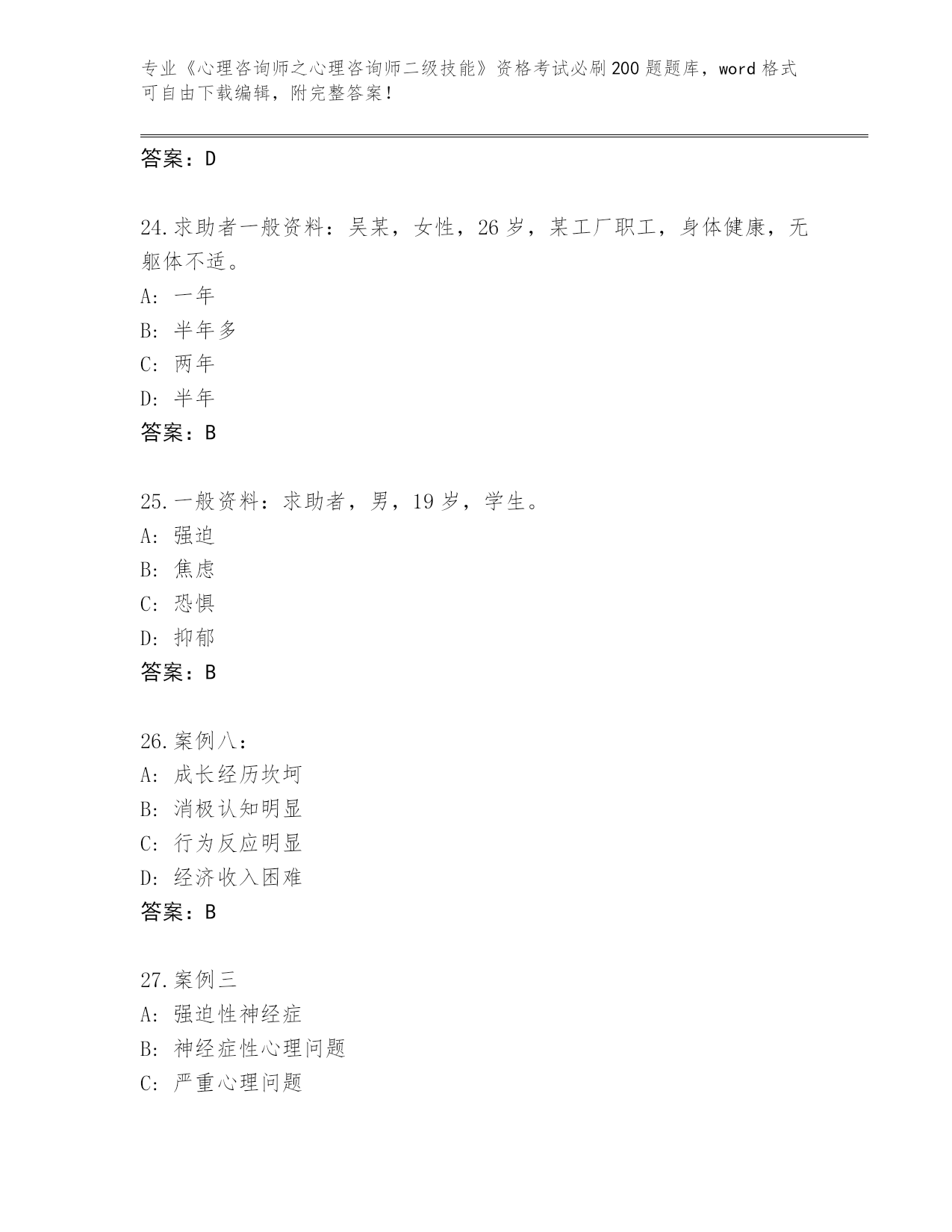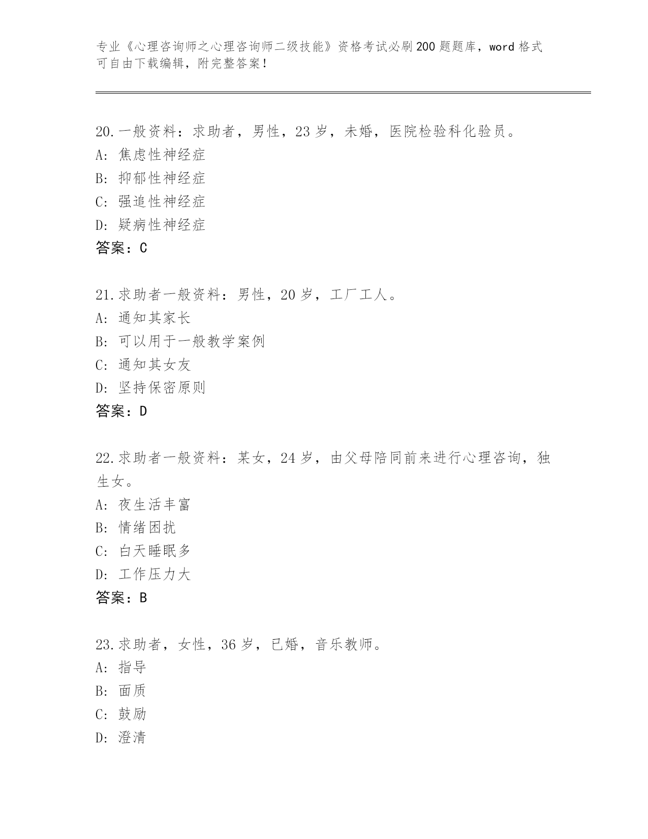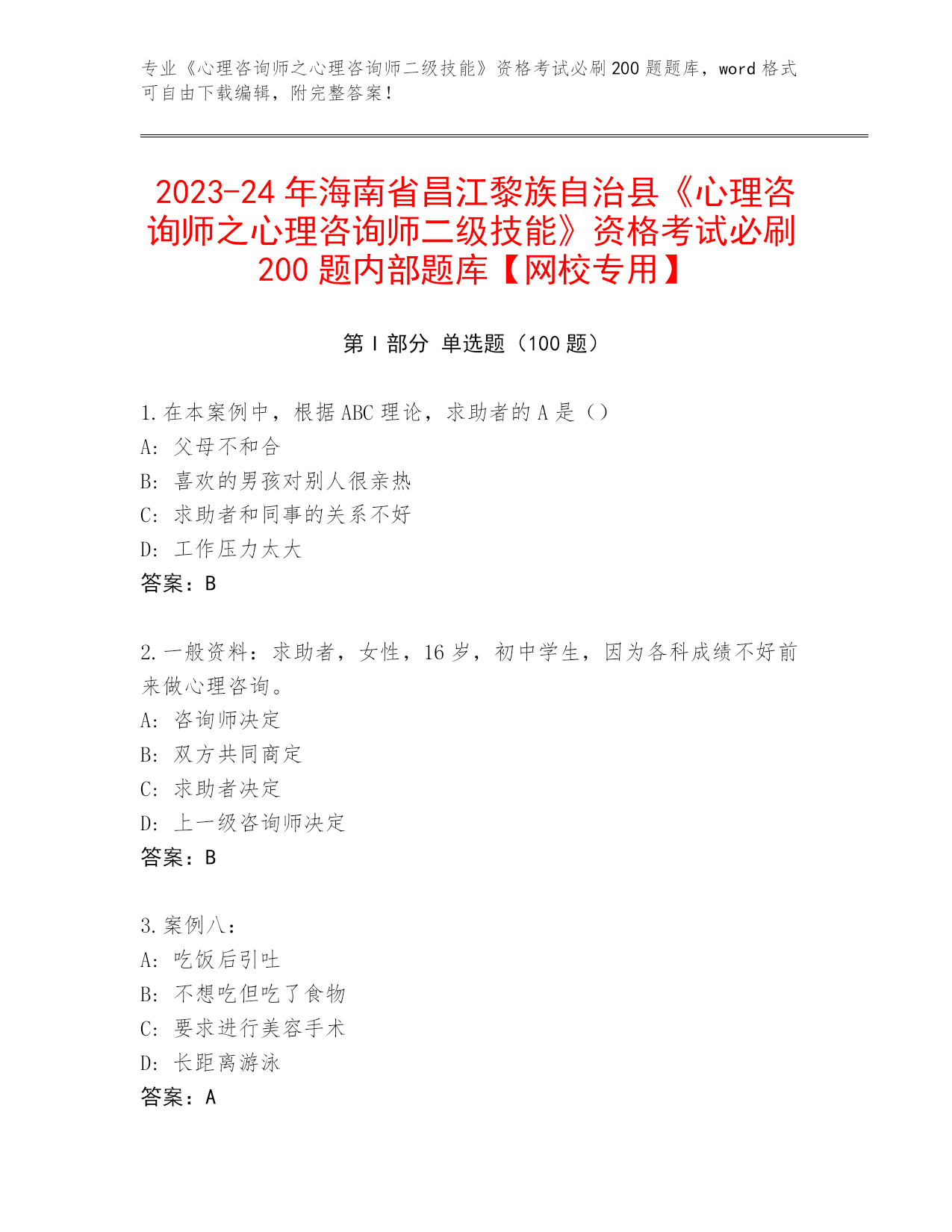 2023-24年海南省昌江黎族自治县《心理咨询师之心理咨询师二级技能》资格考试必刷200题内部题库【网校专用】