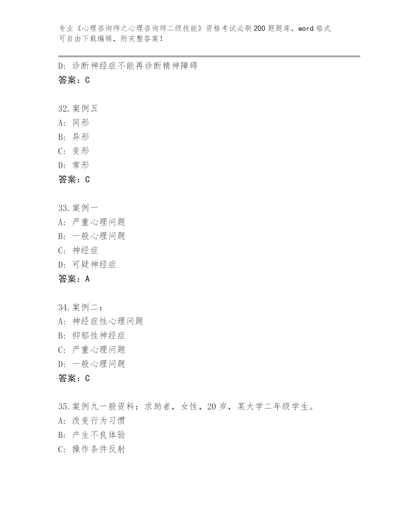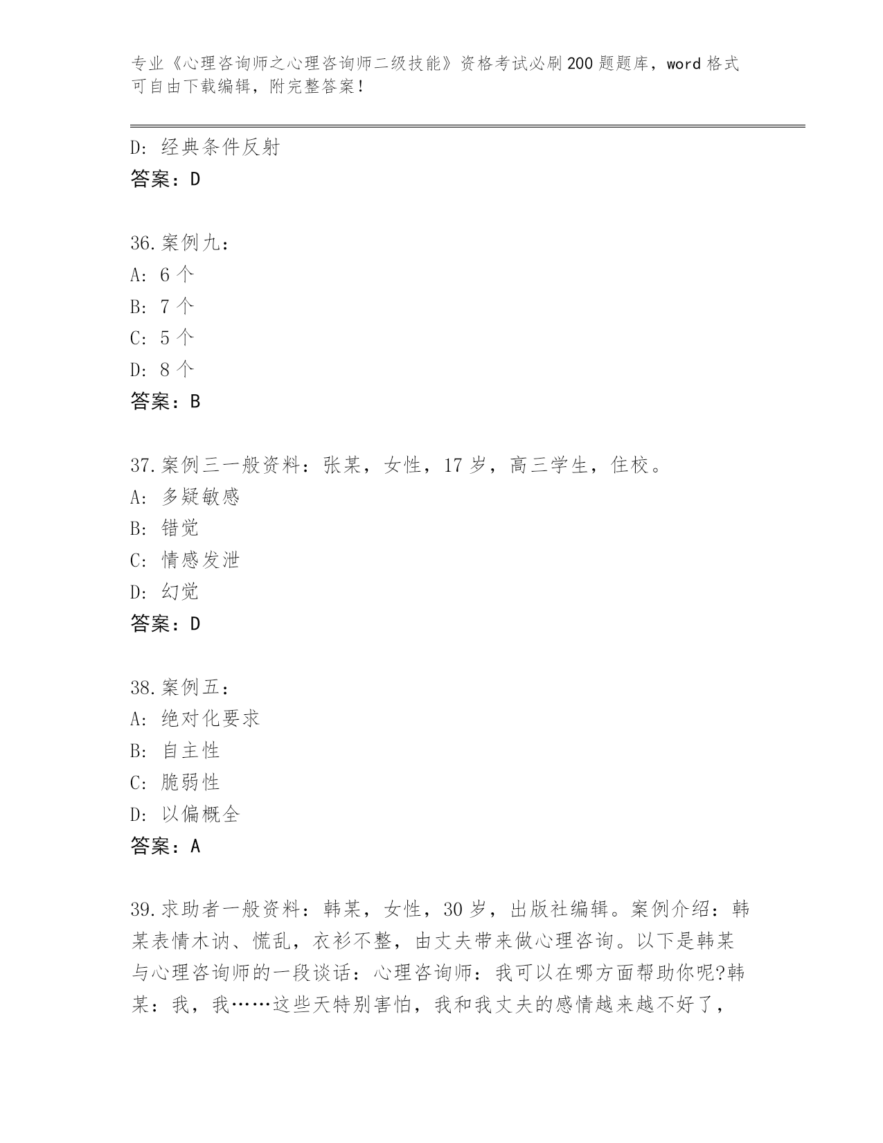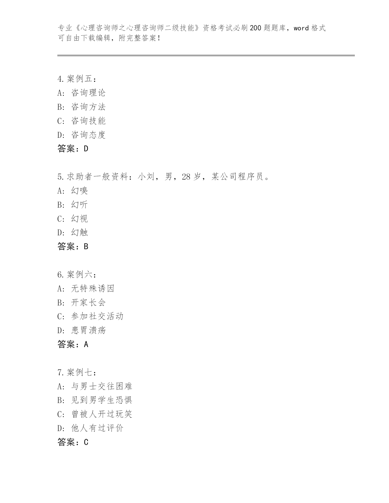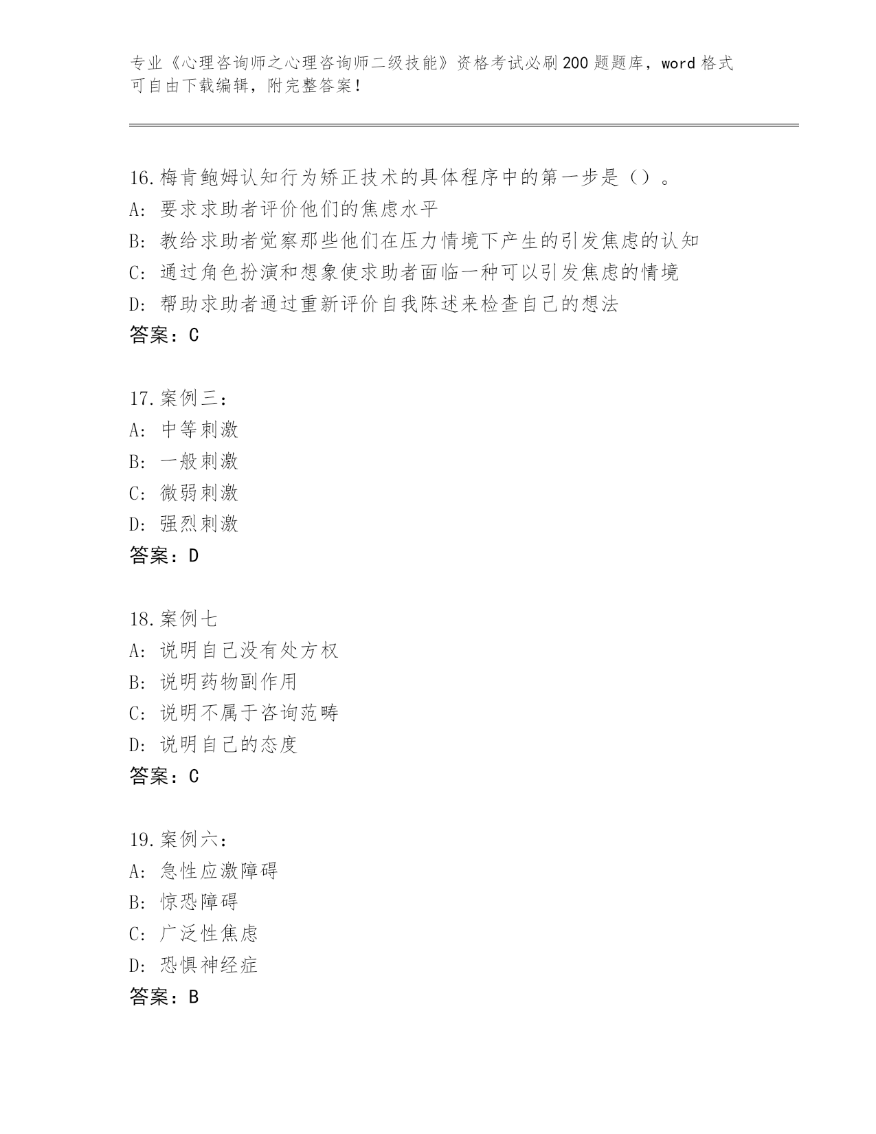 内部使用江西省吉安县《心理咨询师之心理咨询师二级技能》考试必刷200题真题题库【网校专用】