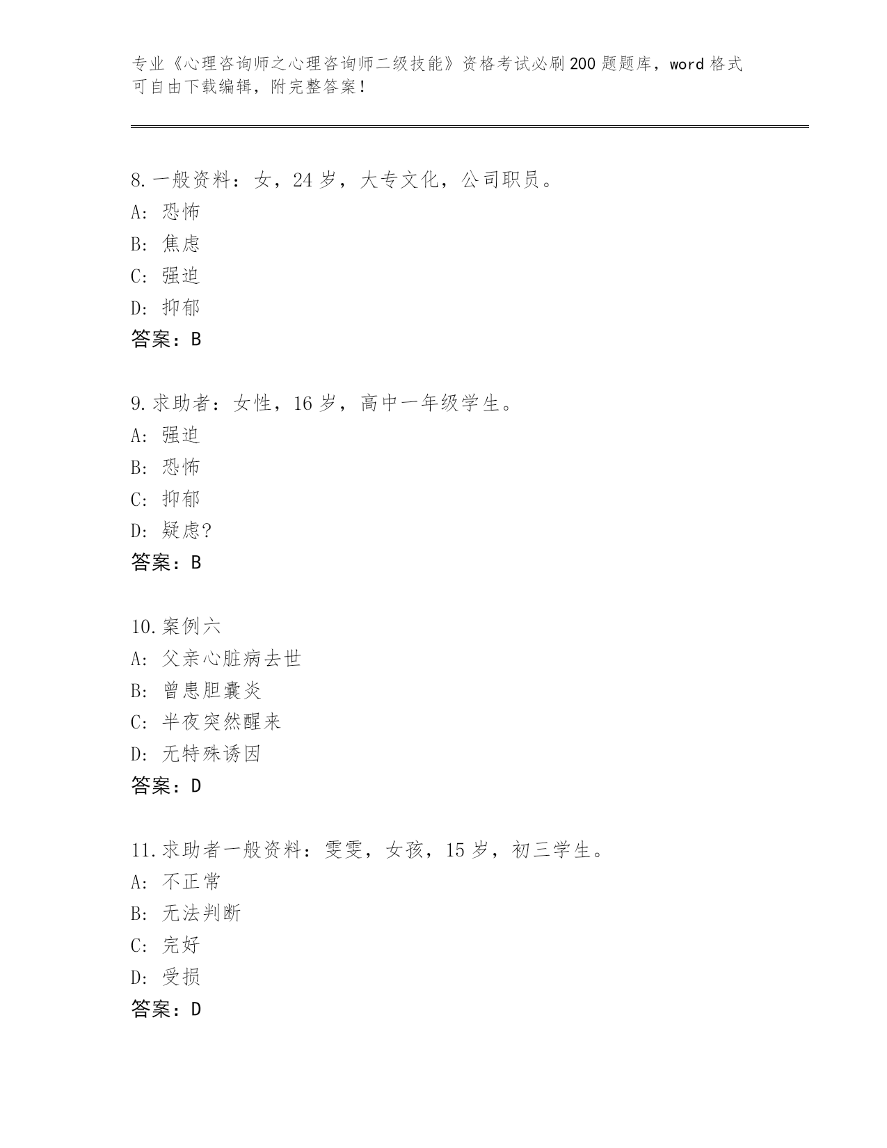 福建省2024年《心理咨询师之心理咨询师二级技能》资格考试必背200题内部题库【网校专用】