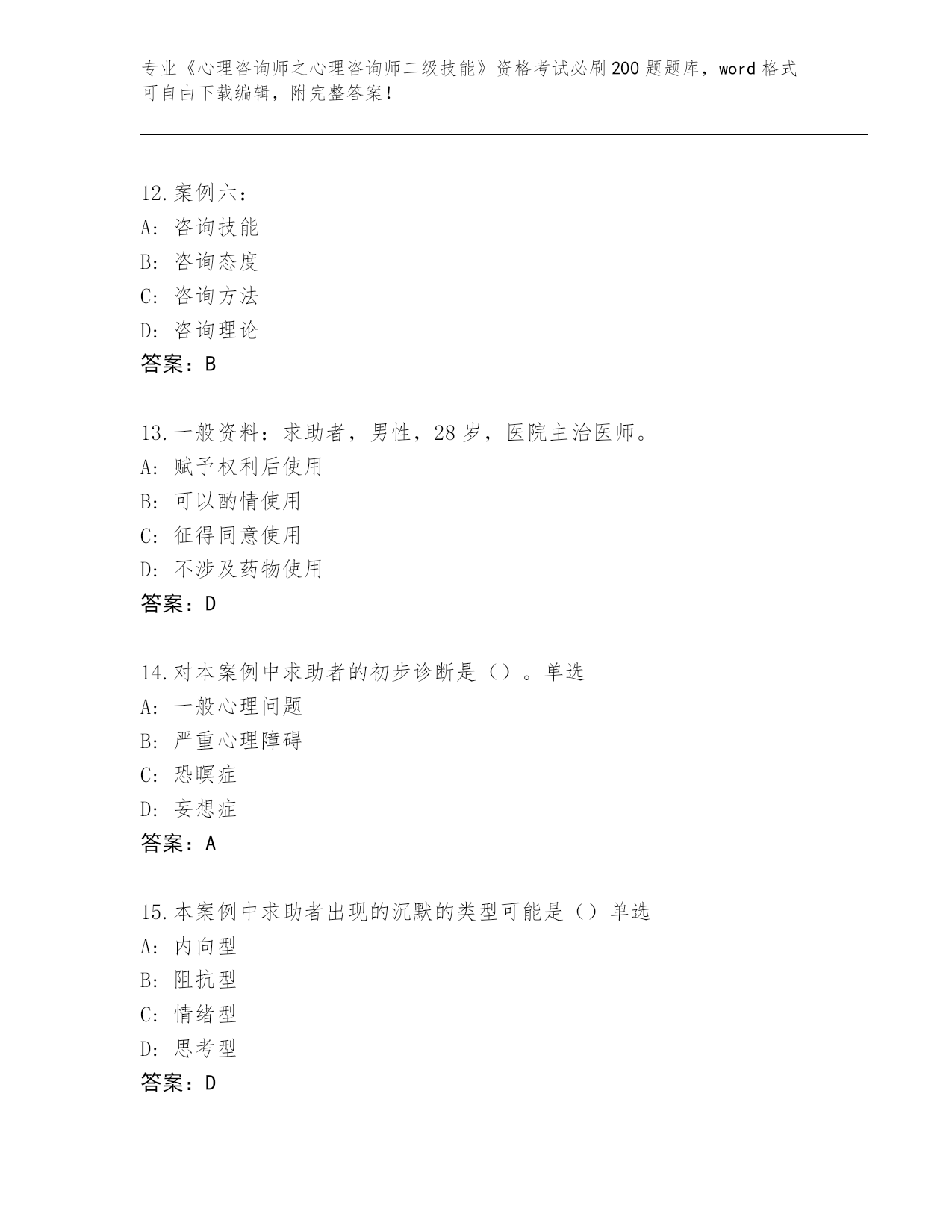 2024云南省《心理咨询师之心理咨询师二级技能》资格考试必刷200题大全【网校专用】