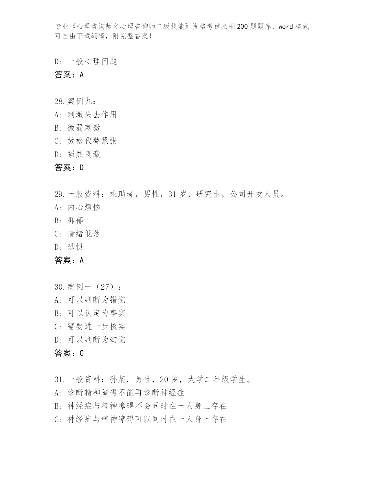 湖南省2024年《心理咨询师之心理咨询师二级技能》资格考试必刷200题内部题库及答案【网校专用】
