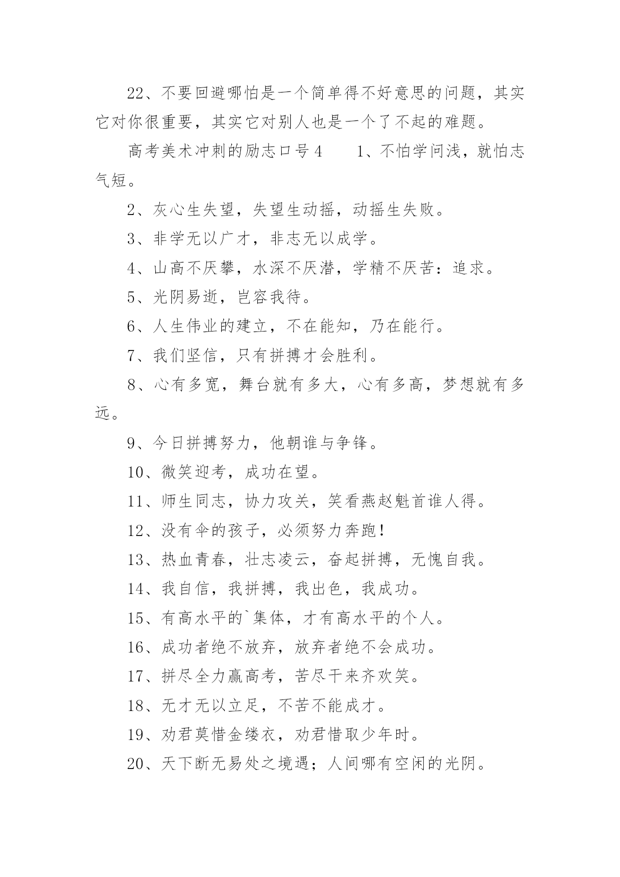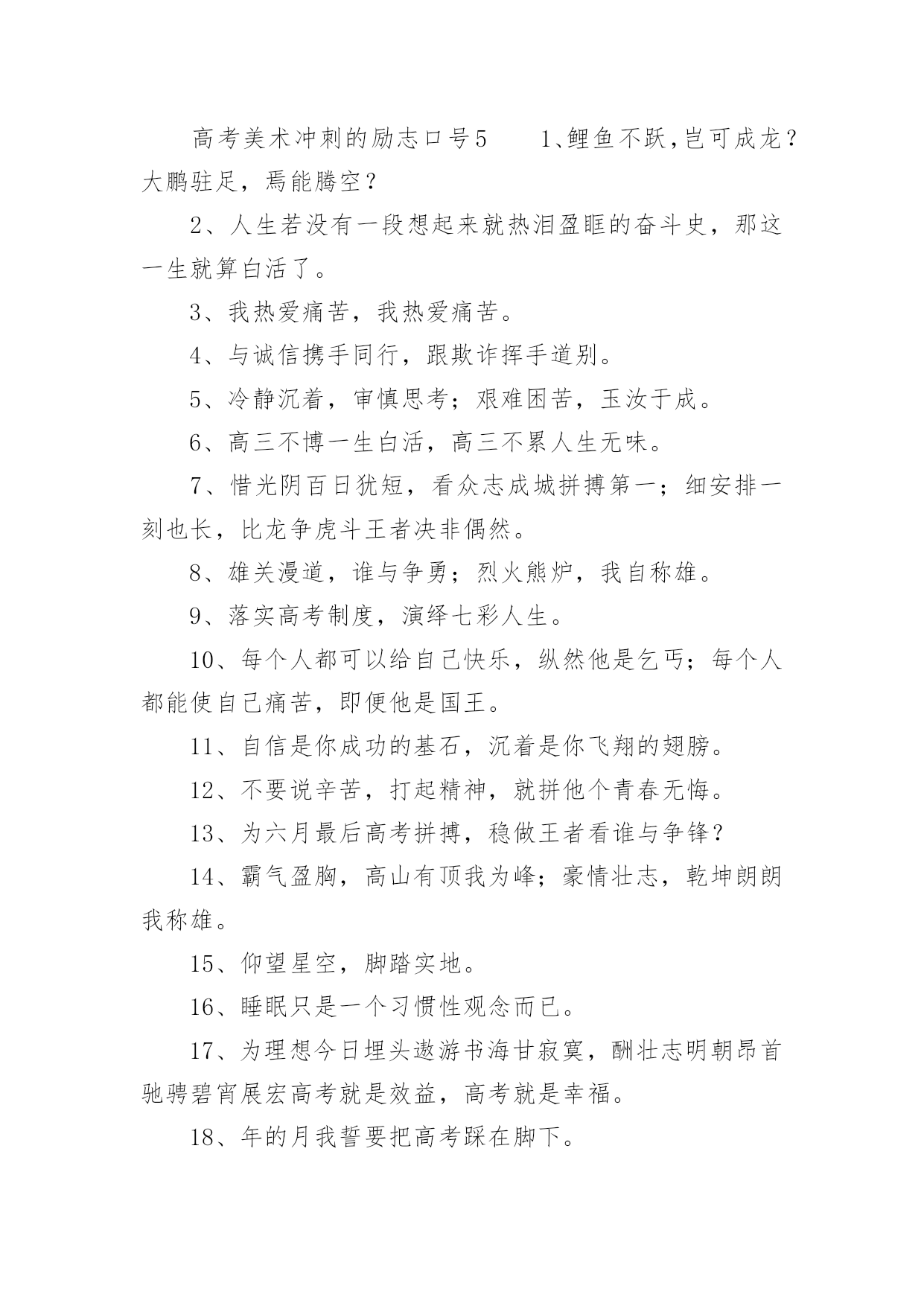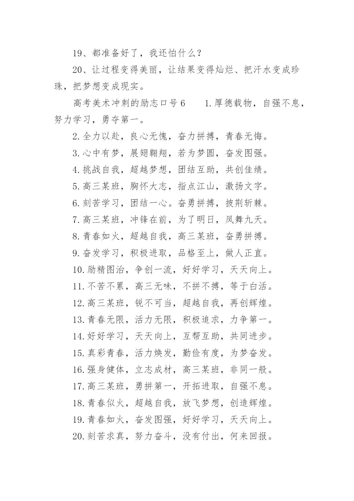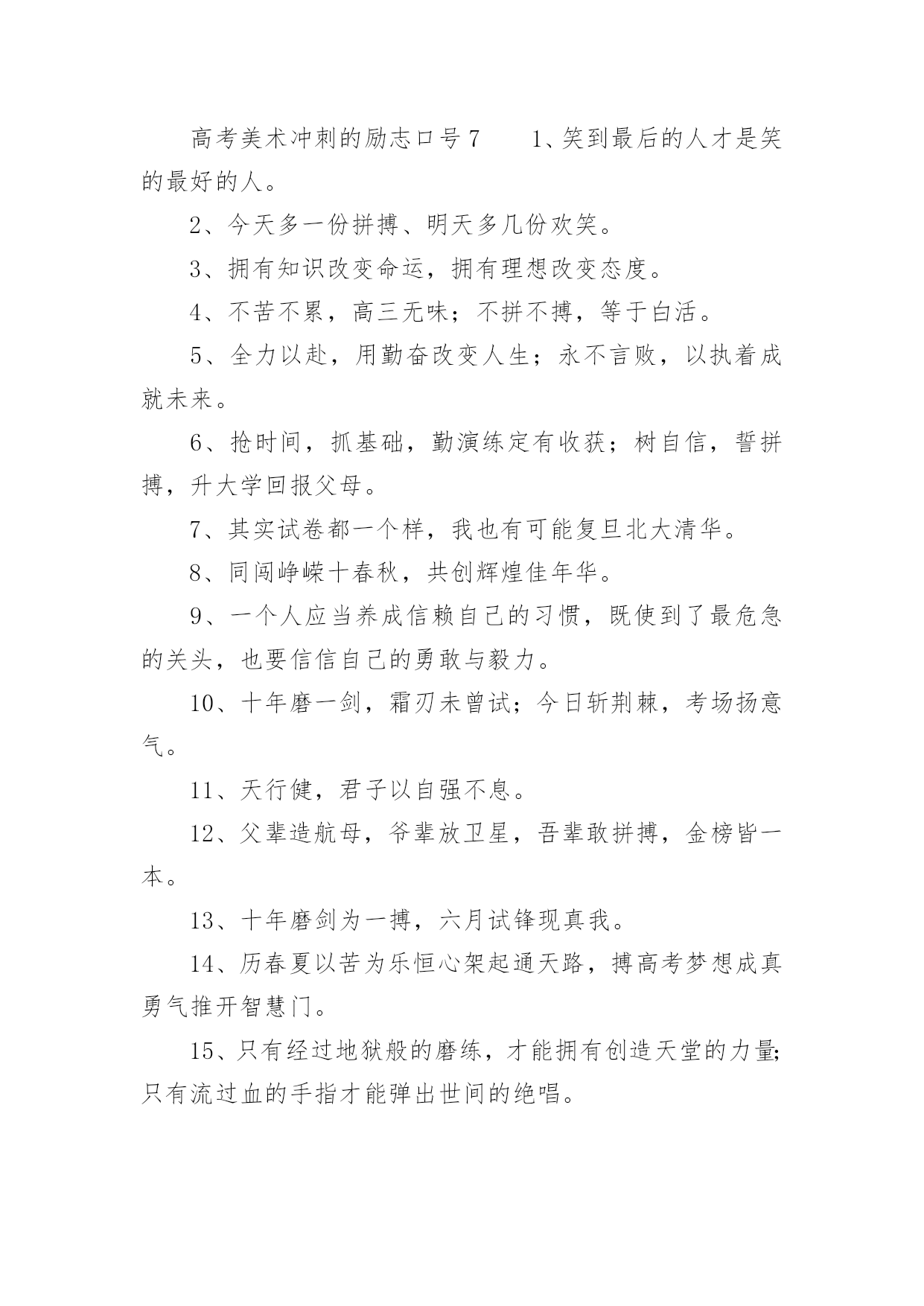 高考美术冲刺的励志口号高考美术冲刺的励志口号在学习、工作或生活中,大家对口号都再熟悉不过了吧,口号是指挥一个团队共同行为的指令。其实很多朋友都不太清楚什么样的口号才是好的口号,以下是小编帮大家整理的高考美术冲刺的励志口号,仅供参考,欢迎大家阅读。高考美术冲刺的励志口号11、和谐文化,艺术校园。2、泼一抹墨色,国风脉脉。调几声弦音,民韵悠悠。3、有艺术的世界更美好。4、民族风韵,共展乾坤,舞出艺术,唱出国风。5、用艺术点缀我们的生活,让文化丰富我们的心灵。6、风采艺术节,展现新舞台。7、美丽的艺术出于你美丽的心灵。8、艺术源于生活,艺术点亮生活。9、文化是艺术的摇篮,艺术是文化的体现。10、迈向精彩艺术人生,绽放校园文化魅力。11、放飞理想翅膀展现你我风采!12、我的舞台我作主,我的风采我展现。13、放飞你我理想,展示你我风采;学校的光辉,让我们来闪烁吧!14、校园大舞台,大家一起来;师生共参与,展我新风采。15、文艺大舞台欢迎你到来,文艺大舞台展我新风采;16、我们爱艺术,懂得欣赏;我们懂艺术,积极争取;我们演艺术,超越自我。17、艺术大舞台,大家一起来,劲歌加热舞,展现新自我,18、用艺术点亮人生,用行动实现理想。19、展示才艺的舞台,完善自我的机会。20、青春属于我们,舞台属于我们,艺术属于我们,21、我的艺术我展示,我的技能我发挥。我的艺术我表演,我的舞台我主宰。22、同一个艺术,同一个理想。23、成功在于努力,艺术在于创。24、迈着青春的脚步,走向艺术的舞台;尽我最大的努力,展我最美的风采。25、天生我才,赢在舞台;放飞理想,成就未来。激情四月,艺术之节;比学赶帮,超越理想。26、校园艺术大舞台,展我学生新风采。点燃青春激情,畅响校园艺术。27、艺术之风,吹吹吹,吹遍校园每个角落;艺术之雨,洒洒洒,洒进每个学生心窝。28、艺术魅力,炫我风采;开心无限,勇往直前;超越自我,志在必得。29、扬起自信的风帆,驶向成功的彼岸。30、拼搏自信,努力奋进。开创辉煌,永远自强。和谐一致,共创佳绩。你我携手,创造未来。31、为班级争光,为艺术节争辉!32、艺术之乐,展示自我理想!艺术之美,展现自我风采!33、我们的第一,我们去争取!我们的奇迹,我们去创造!34、问你行不行,艺术评一评,想象在哪里,全在艺术里!35、精彩艺术节,圆我艺术梦!展示新文化,塑造新未来!36、让艺术之风吹拂你我心灵,让艺术之彩点缀你我生活,让我们走进艺术的海洋。37、扬起自信的风帆,驶向成功的彼岸;竞技场上显才艺,艺术之中共发展38、我的舞台我主宰,胜利属于你和我。展示你我风采,力争完美舞台!39、艺术大舞台,我们一起来!五彩大世界,由你来争夺!40、同一个舞台,同一个理想。插上自由的翅膀,在艺术的天空中遨翔。41、艺术节,激情洋洋,创辉煌;艺术节,英姿飒飒,展风彩。42、艺术编织人生,人生描绘艺术。艺术的精彩靠大家,我们的节目更精彩。43、艺术舞台,发扬自信,张弛自我;艺术天地,五彩缤纷,再创辉煌。44、拥有快乐,展望未来;拥有艺术,展望明天。45、校园艺术好,开心每一秒。踏上艺术之舟,共享成功人生。46、载歌载舞你我他,校园文化靠大家。47、抱一种最虚心的学徒的兴趣,这样碾颜料的人常常会成为优秀的画家48、让艺术之花开遍江南49、勇攀艺术高峰争做江南新人50、艺术是一种使我们达到真实的假想[高考美术冲刺的励志口号]相关文章:1.励志高考冲刺口号精选2.励志中考冲刺口号3.高考励志口号汇总4.励志的高考口号5.高考励志口号集录6.高考励志名言口号7.高考励志口号推荐8.最流行高考励志标语口号9.高考励志口号摘录10.高考励志口号大汇总高考美术冲刺的励志口号21、眉毛上的汗水和眉毛下的泪水你必须选择一样。2、横下一条心,坚决要出线。3、我相信方法总比困难多。4、在考场上没有弱者的眼泪只有强者的天下。5、相信自己,我们能创造奇迹、这是你的誓言,这是我的誓言,这是我们共同的誓言。6、不敢高声语,恐惊读书人。7、人人争过分,个个考入校。8、不经风雨,怎见彩虹?9、放飞你的心灵,播撒你的希望。10、日月星辰,见证辛勤身影;父母师友,鼓励奋斗人生。11、回忆很美,尽管过程艰辛:也许结果总有遗憾,但我们无愧于心。12、高考为了生产,促进经济发展。13、精神成人,知识成才,态度成全。14、要想成功,必先发疯,今日疯狂,明日辉煌。15、我能——人之所以能,是相信能。高考美术冲刺的励志口号31、决战高考,改变命运。屡挫屡战,笑傲群雄。2、进更理想大学,铸更辉煌人生。——须更刻苦的奋斗。3、抢时间,抓基础,勤演练定有收获;树自信,誓拼搏,升大学回报父母。4、我努力,我坚持,我一定能成功!5、惜光阴百日犹短,看众志成城拼搏第一;细安排一刻也长,比龙争虎斗谁为争锋?6、为五月最后
