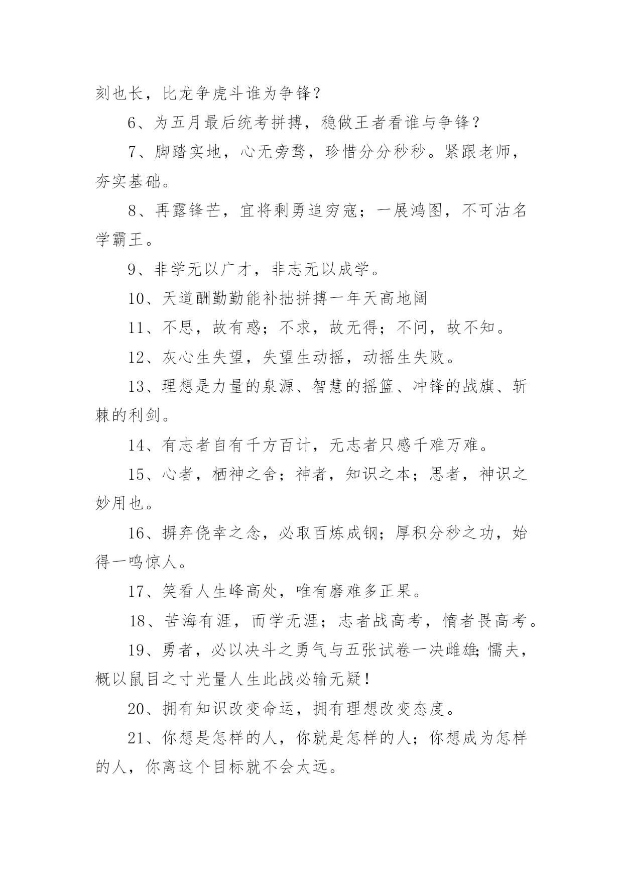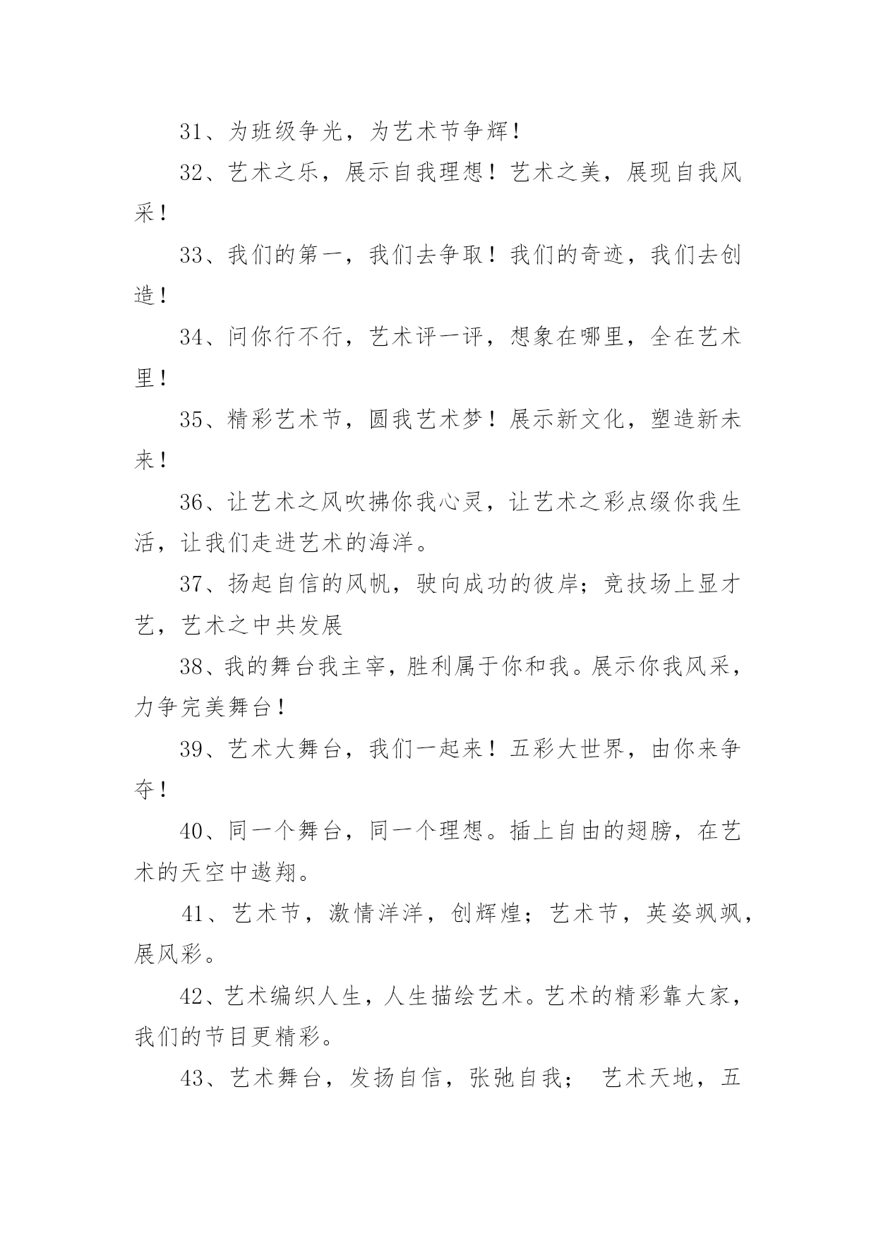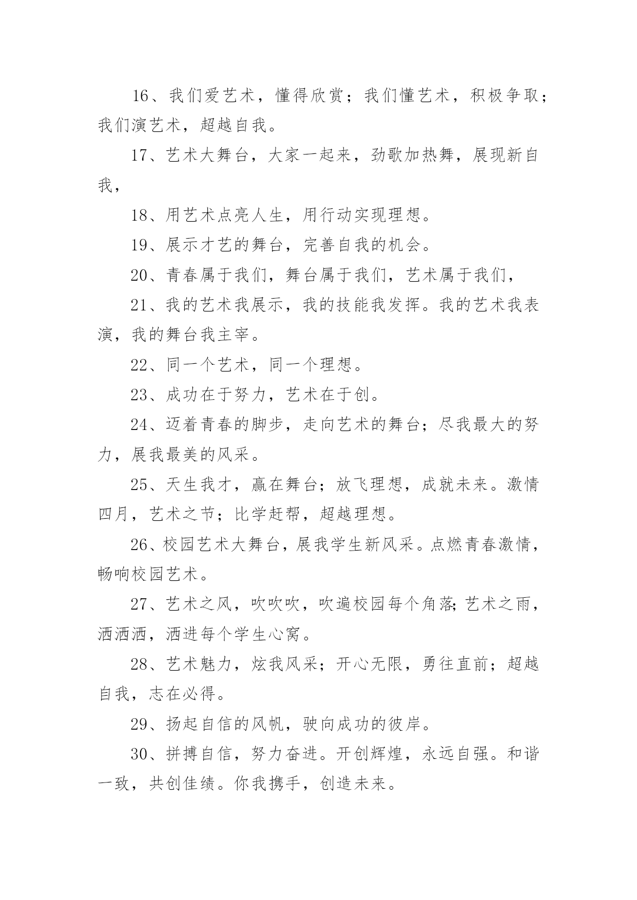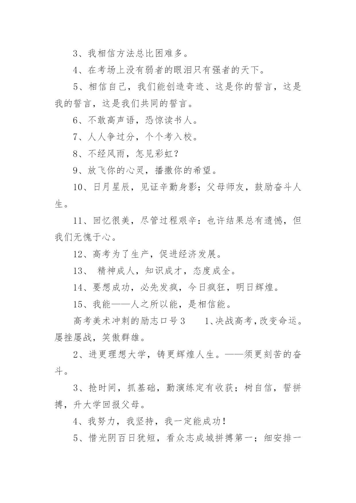 高考美术冲刺的励志口号高考美术冲刺的励志口号在学习、工作或生活中,大家对口号都再熟悉不过了吧,口号是指挥一个团队共同行为的指令。其实很多朋友都不太清楚什么样的口号才是好的口号,以下是小编帮大家整理的高考美术冲刺的励志口号,仅供参考,欢迎大家阅读。高考美术冲刺的励志口号11、和谐文化,艺术校园。2、泼一抹墨色,国风脉脉。调几声弦音,民韵悠悠。3、有艺术的世界更美好。4、民族风韵,共展乾坤,舞出艺术,唱出国风。5、用艺术点缀我们的生活,让文化丰富我们的心灵。6、风采艺术节,展现新舞台。7、美丽的艺术出于你美丽的心灵。8、艺术源于生活,艺术点亮生活。9、文化是艺术的摇篮,艺术是文化的体现。10、迈向精彩艺术人生,绽放校园文化魅力。11、放飞理想翅膀展现你我风采!12、我的舞台我作主,我的风采我展现。13、放飞你我理想,展示你我风采;学校的光辉,让我们来闪烁吧!14、校园大舞台,大家一起来;师生共参与,展我新风采。15、文艺大舞台欢迎你到来,文艺大舞台展我新风采;16、我们爱艺术,懂得欣赏;我们懂艺术,积极争取;我们演艺术,超越自我。17、艺术大舞台,大家一起来,劲歌加热舞,展现新自我,18、用艺术点亮人生,用行动实现理想。19、展示才艺的舞台,完善自我的机会。20、青春属于我们,舞台属于我们,艺术属于我们,21、我的艺术我展示,我的技能我发挥。我的艺术我表演,我的舞台我主宰。22、同一个艺术,同一个理想。23、成功在于努力,艺术在于创。24、迈着青春的脚步,走向艺术的舞台;尽我最大的努力,展我最美的风采。25、天生我才,赢在舞台;放飞理想,成就未来。激情四月,艺术之节;比学赶帮,超越理想。26、校园艺术大舞台,展我学生新风采。点燃青春激情,畅响校园艺术。27、艺术之风,吹吹吹,吹遍校园每个角落;艺术之雨,洒洒洒,洒进每个学生心窝。28、艺术魅力,炫我风采;开心无限,勇往直前;超越自我,志在必得。29、扬起自信的风帆,驶向成功的彼岸。30、拼搏自信,努力奋进。开创辉煌,永远自强。和谐一致,共创佳绩。你我携手,创造未来。31、为班级争光,为艺术节争辉!32、艺术之乐,展示自我理想!艺术之美,展现自我风采!33、我们的第一,我们去争取!我们的奇迹,我们去创造!34、问你行不行,艺术评一评,想象在哪里,全在艺术里!35、精彩艺术节,圆我艺术梦!展示新文化,塑造新未来!36、让艺术之风吹拂你我心灵,让艺术之彩点缀你我生活,让我们走进艺术的海洋。37、扬起自信的风帆,驶向成功的彼岸;竞技场上显才艺,艺术之中共发展38、我的舞台我主宰,胜利属于你和我。展示你我风采,力争完美舞台!39、艺术大舞台,我们一起来!五彩大世界,由你来争夺!40、同一个舞台,同一个理想。插上自由的翅膀,在艺术的天空中遨翔。41、艺术节,激情洋洋,创辉煌;艺术节,英姿飒飒,展风彩。42、艺术编织人生,人生描绘艺术。艺术的精彩靠大家,我们的节目更精彩。43、艺术舞台,发扬自信,张弛自我;艺术天地,五彩缤纷,再创辉煌。44、拥有快乐,展望未来;拥有艺术,展望明天。45、校园艺术好,开心每一秒。踏上艺术之舟,共享成功人生。46、载歌载舞你我他,校园文化靠大家。47、抱一种最虚心的学徒的兴趣,这样碾颜料的人常常会成为优秀的画家48、让艺术之花开遍江南49、勇攀艺术高峰争做江南新人50、艺术是一种使我们达到真实的假想[高考美术冲刺的励志口号]相关文章:1.励志高考冲刺口号精选2.励志中考冲刺口号3.高考励志口号汇总4.励志的高考口号5.高考励志口号集录6.高考励志名言口号7.高考励志口号推荐8.最流行高考励志标语口号9.高考励志口号摘录10.高考励志口号大汇总高考美术冲刺的励志口号21、眉毛上的汗水和眉毛下的泪水你必须选择一样。2、横下一条心,坚决要出线。3、我相信方法总比困难多。4、在考场上没有弱者的眼泪只有强者的天下。5、相信自己,我们能创造奇迹、这是你的誓言,这是我的誓言,这是我们共同的誓言。6、不敢高声语,恐惊读书人。7、人人争过分,个个考入校。8、不经风雨,怎见彩虹?9、放飞你的心灵,播撒你的希望。10、日月星辰,见证辛勤身影;父母师友,鼓励奋斗人生。11、回忆很美,尽管过程艰辛:也许结果总有遗憾,但我们无愧于心。12、高考为了生产,促进经济发展。13、精神成人,知识成才,态度成全。14、要想成功,必先发疯,今日疯狂,明日辉煌。15、我能——人之所以能,是相信能。高考美术冲刺的励志口号31、决战高考,改变命运。屡挫屡战,笑傲群雄。2、进更理想大学,铸更辉煌人生。——须更刻苦的奋斗。3、抢时间,抓基础,勤演练定有收获;树自信,誓拼搏,升大学回报父母。4、我努力,我坚持,我一定能成功!5、惜光阴百日犹短,看众志成城拼搏第一;细安排一刻也长,比龙争虎斗谁为争锋?6、为五月最后