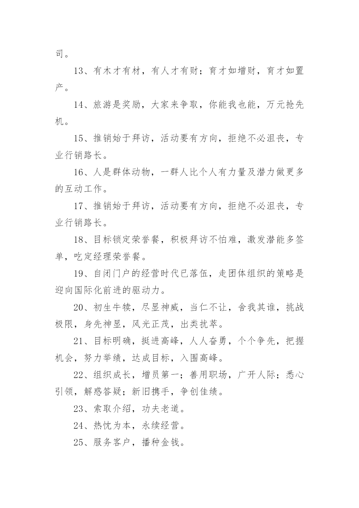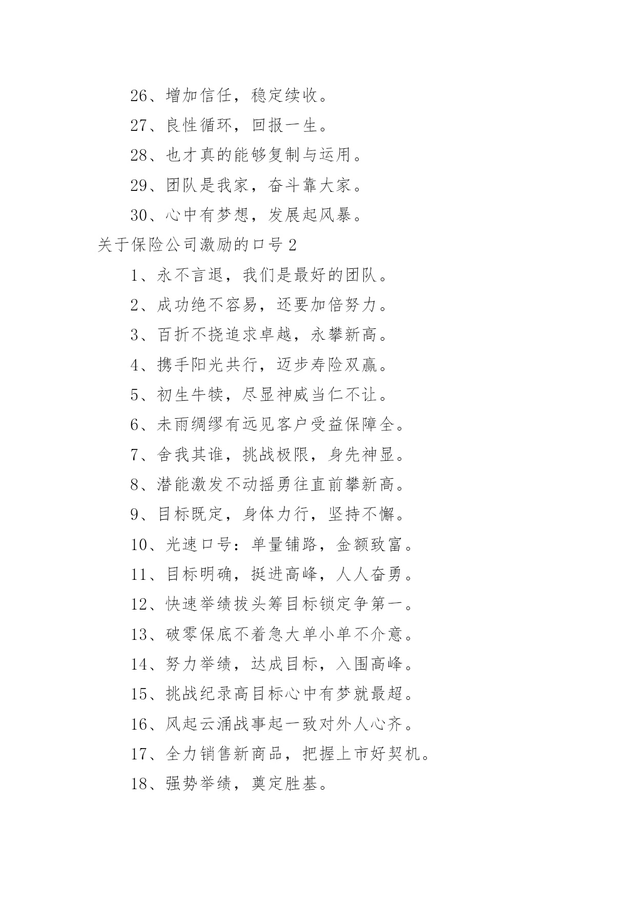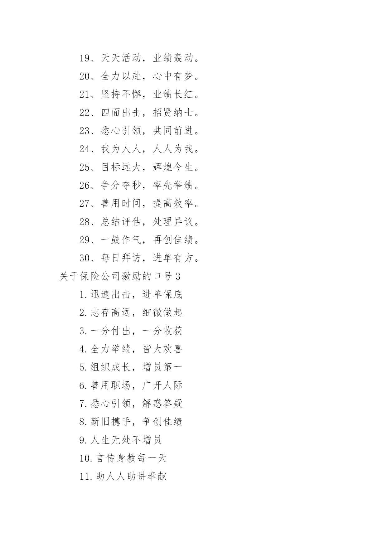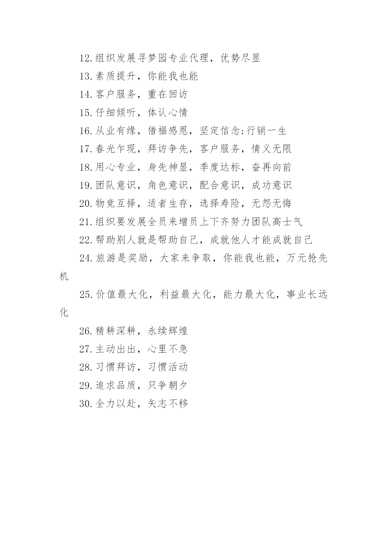保险公司激励的口号关于保险公司激励的口号在平日的学习、工作和生活里,大家总免不了要接触或使用口号吧,口号要在受众的心目中形成一定程度的印记,就要使之句式简短,容易记忆。你所见过的口号是什么样的呢?以下是小编收集整理的关于保险公司激励的口号,仅供参考,希望能够帮助到大家。关于保险公司激励的口号11、荣辱与共多举绩,信心百倍比高低。2、破零保底不着急,大单小单不介意。3、因为有缘我们相聚,成功靠大家努力。4、成功就是:相信,行动,坚持,快乐。5、单枪匹马人孤势单,招兵买马人多势众。6、长期经营,积累客户充分准备,伺机而行。7、稳定市场,重在回访精心打理,休养生息。8、全员实动,八周破零加大拜访,业绩攀新。9、追求卓越,挑战自我全力以赴,目标达成。10、今天付出,明天收获,全力以赴,事业辉煌。11、美好的事业,希望的事业,团队的'事业,永久的事业。12、寿险事业,有你有我有他;营销职涯,为己为人为司。13、有木才有材,有人才有财;育才如增财,育才如置产。14、旅游是奖励,大家来争取,你能我也能,万元抢先机。15、推销始于拜访,活动要有方向,拒绝不必沮丧,专业行销路长。16、人是群体动物,一群人比个人有力量及潜力做更多的互动工作。17、推销始于拜访,活动要有方向,拒绝不必沮丧,专业行销路长。18、目标锁定荣誉餐,积极拜访不怕难,激发潜能多签单,吃定经理荣誉餐。19、自闭门户的经营时代已落伍,走团体组织的策略是迎向国际化前进的驱动力。20、初生牛犊,尽显神威,当仁不让,舍我其谁,挑战极限,身先神显,风光正茂,出类扰萃。21、目标明确,挺进高峰,人人奋勇,个个争先,把握机会,努力举绩,达成目标,入围高峰。22、组织成长,增员第一;善用职场,广开人际;悉心引领,解惑答疑;新旧携手,争创佳绩。23、索取介绍,功夫老道。24、热忱为本,永续经营。25、服务客户,播种金钱。26、增加信任,稳定续收。27、良性循环,回报一生。28、也才真的能够复制与运用。29、团队是我家,奋斗靠大家。30、心中有梦想,发展起风暴。关于保险公司激励的口号21、永不言退,我们是最好的团队。2、成功绝不容易,还要加倍努力。3、百折不挠追求卓越,永攀新高。4、携手阳光共行,迈步寿险双赢。5、初生牛犊,尽显神威当仁不让。6、未雨绸缪有远见客户受益保障全。7、舍我其谁,挑战极限,身先神显。8、潜能激发不动摇勇往直前攀新高。9、目标既定,身体力行,坚持不懈。10、光速口号:单量铺路,金额致富。11、目标明确,挺进高峰,人人奋勇。12、快速举绩拔头筹目标锁定争第一。13、破零保底不着急大单小单不介意。14、努力举绩,达成目标,入围高峰。15、挑战纪录高目标心中有梦就最超。16、风起云涌战事起一致对外人心齐。17、全力销售新商品,把握上市好契机。18、强势举绩,奠定胜基。19、天天活动,业绩轰动。20、全力以赴,心中有梦。21、坚持不懈,业绩长红。22、四面出击,招贤纳士。23、悉心引领,共同前进。24、我为人人,人人为我。25、目标远大,辉煌今生。26、争分夺秒,率先举绩。27、善用时间,提高效率。28、总结评估,处理异议。29、一鼓作气,再创佳绩。30、每日拜访,进单有方。关于保险公司激励的口号31.迅速出击,进单保底2.志存高远,细微做起3.一分付出,一分收获4.全力举绩,皆大欢喜5.组织成长,增员第一6.善用职场,广开人际7.悉心引领,解惑答疑8.新旧携手,争创佳绩9.人生无处不增员10.言传身教每一天11.助人人助讲奉献12.组织发展寻梦园专业代理,优势尽显13.素质提升,你能我也能14.客户服务,重在回访15.仔细倾听,体认心情16.从业有缘,借福感恩,坚定信念;行销一生17.春光乍现,拜访争先,客户服务,情义无限18.用心专业,身先神显,季度达标,奋再向前19.团队意识,角色意识,配合意识,成功意识20.物竞互择,适者生存,选择寿险,无怨无悔21.组织要发展全员来增员上下齐努力团队高士气22.帮助别人就是帮助自己,成就他人才能成就自己24.旅游是奖励,大家来争取,你能我也能,万元抢先机25.价值最大化,利益最大化,能力最大化,事业长远化26.精耕深耕,永续辉煌27.主动出出,心里不急28.习惯拜访,习惯活动29.追求品质,只争朝夕30.全力以赴,矢志不移