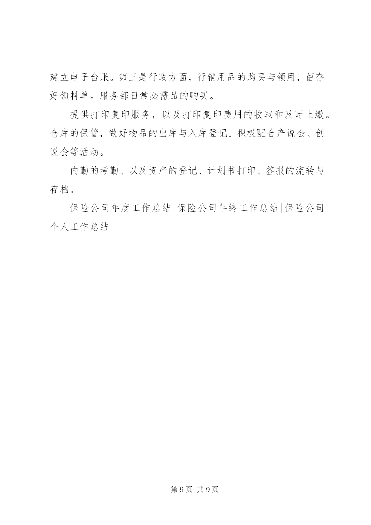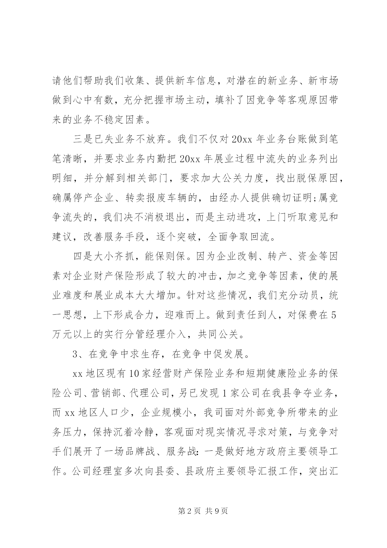 第PAGE\*Arabic\*MERGEFORMAT9页共NUMPAGES\*MERGEFORMAT9页保险内勤的心得体会保险公司内勤的工作总结1、计划落实早、措施实20xx年初,我司经理室就针对xx地区保险市场变化及20xx年全年保费收入情况进行综合分析,将上级公司下达我司的各项指标进行层层分解,把计划分解成月计划,月月盘点、月月落实,有效的保证了对计划落实情况及时的进行监控和调整。在制定全年任务时充分考虑险种结构优化和业务承保质量,进一步明确了考核办法,把综合赔付率作为年终测评的重要数据。2、抢占车险市场,加大新工程、新项目的拓展力度,坚决的丢弃“垃圾保费”今年来,我们把稳固车险和企业财产保险,拓展新车市场和新工程新项目作为业务工作数量的基础上,坚决的丢弃屡保屡亏的“垃圾”业务一是确保续保业务及时回笼,我们要求各业务部门按月上报续保业务台帐,由经理室督促考核,并要求提前介入公关。一旦出现脱报,马上在全司公布,其他人员可以参与竞争,从而巩固了原有业务,大大减少了业务的流失,保证了主要险种的市场份额占有率。二是与地方政府有关部门建立联系网络,提前获悉新上项目、新上工程名录,并和xxx部门、汽车销售商建立友好合作关系,请他们帮助我们收集、提供新车信息,对潜在的新业务、新市场做到心中有数,充分把握市场主动,填补了因竞争等客观原因带来的业务不稳定因素。三是已失业务不放弃。我们不仅对20xx年业务台账做到笔笔清晰,并要求业务内勤把20xx年展业过程中流失的业务列出明细,并分解到相关部门,要求加大公关力度,找出脱保原因,确属停产企业、转卖报废车辆的,由经办人提供确切证明;属竞争流失的,我们决不消极退出,而是主动进攻,上门听取意见和建议,改善服务手段,逐个突破,全面争取回流。四是大小齐抓,能保则保。因为企业改制、转产、资金等因素对企业财产保险形成了较大的冲击,加之竞争等因素,使的展业难度和展业成本大大增加。针对这些情况,我们充分动员,统一思想,上下形成合力,迎难而上。做到责任到人,对保费在5万元以上的实行分管经理介入,共同公关。3、在竞争中求生存,在竞争中促发展。xx地区现有10家经营财产保险业务和短期健康险业务的保险公司、营销部、代理公司,另已发现1家公司在我县争夺业务,而xx地区人口少,企业规模小,我司面对外部竞争所带来的业务压力,保持沉着冷静,客观面对现实情况寻求对策,与竞争对手们展开了一场品牌战、服务战:一是做好地方政府主要领导工作。公司经理室多次向县委、县政府主要领导汇报工作,突出汇报我司是如何加大对xx地方经济建设支持力度,是如何围绕地方政府中心开展工作的,我司积极参与了全民创业调研活动,与县领导一道走访个体、私营经济企业,不仅使县委、县政府对我司热心参与地方政府工作表示满意,还对我司正确调整业务发展方向,向中小企业,到银行进帐、取银行对帐单、回单、利息单等相关事宜工作,每月15日之前做好申报税款的有关手续工作。五是做好每个月职工工资薪酬发放和办公室各种文档打印工作。2011年2月至今,我主要做以下日常工作:一是负责每一天的pos机刷卡保费收入,统计上报当日任务,负责做业务周报表、月报表。二是做好应收保费的核对催收,对每一天的保费收入做日清日结的收付。三是做好财务单证的领取、登记、发放、回收和档案装订管理工作,做好每个月代理手续费的结算支付和发票开具工作。四是每月15日之前做好申报税款的有关手续工作。五是做好每个月职工工资薪酬发放和办公室各种文档打印工作。2、严格要求提高工作质量我的工作范围广,时间紧,要求高,我严格要求自己,务必按照支公司的工作精神和工作要求,认真细致地在规定的工作时间内、高质量地完成工作任务,为支公司的经营业务发展作贡献。一是明确工作目标。我以支公司的工作需求作为自己的努力方向,以工作的准确与高质量作为自己的奋斗目标,始终把自己的利益和支公司的利益结合在一起,把自己的荣辱和支公司的荣辱结合在一起,从支公司的利益出发认真做好工作,切实维护支公司的整体利益。二是发扬刻苦精神。我发扬支公司“团结、务实、严谨、拼搏、奉献”的时代精神,做到爱岗敬业、履行职责,吃苦在前,享乐在后,要求自己该日清的工作,一定要做到当日工作当日完毕,该月清的工作,一定要做到当月工作当月完毕。碰到任务重、时间急的时候,我自觉加班加点,那怕直至深夜也要把工作做完。由于始终严格要求自己,参加工作5年来,我全部按时完成工作任务,决没有因自己工作的延误,而影响支公司的整体工作和大局工作。三是讲究工作质量。我切实把好各项工作关,注重各个环节,抓住每个细节,认真细致做好各项工作,对每份单据、每张报表、每个资料,都认真做、仔细核对,确保正确不出差错,确保不能损害支公司和每个职工的利益,使自己所做的每一项工作经得起上级领导的检查和