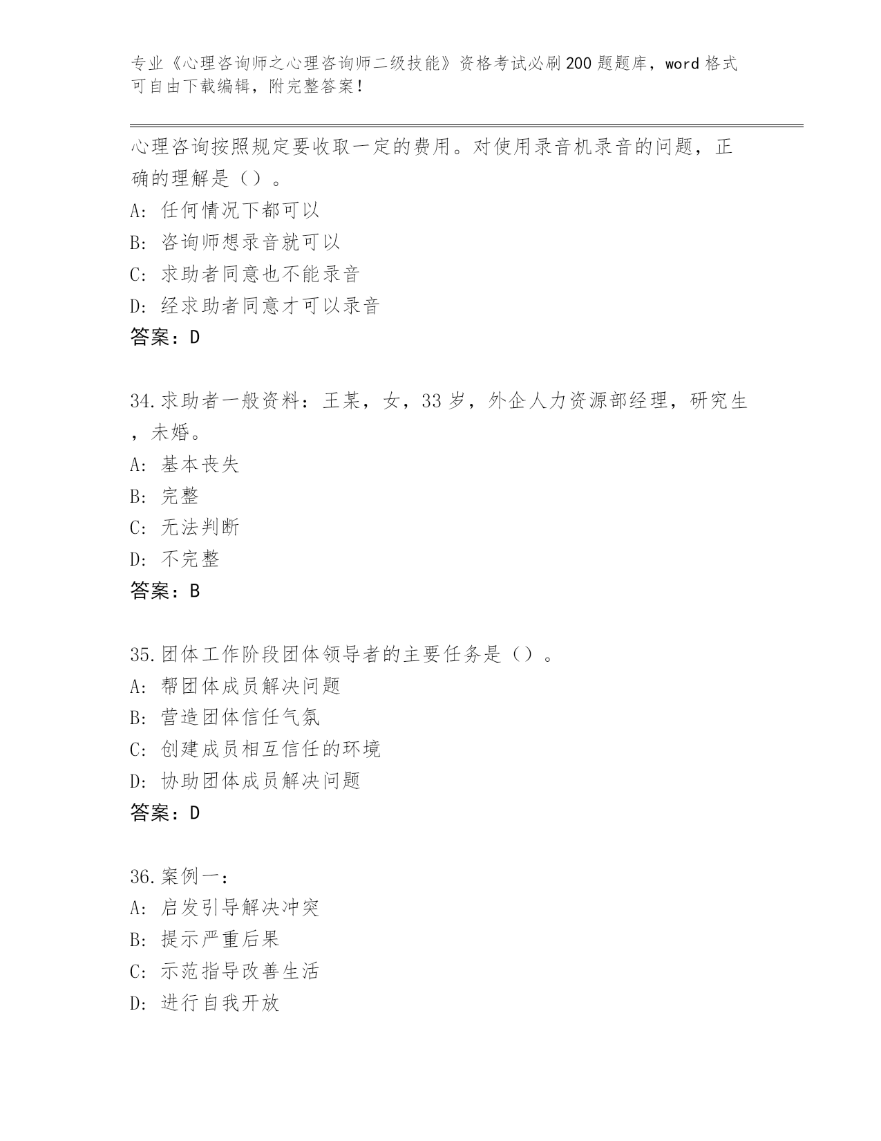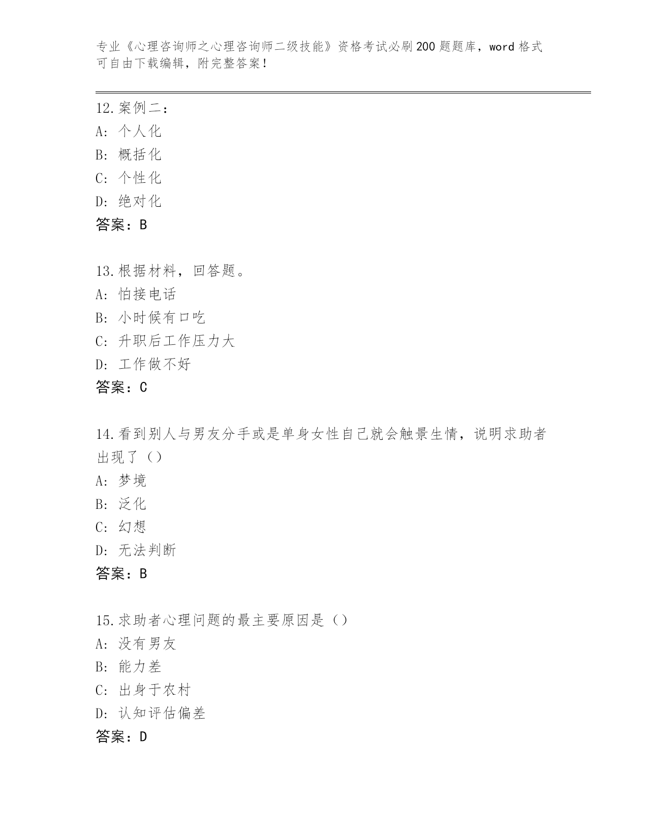 北京市通州区《心理咨询师之心理咨询师二级技能》资格考试必刷200题完整版附答案【预热题】