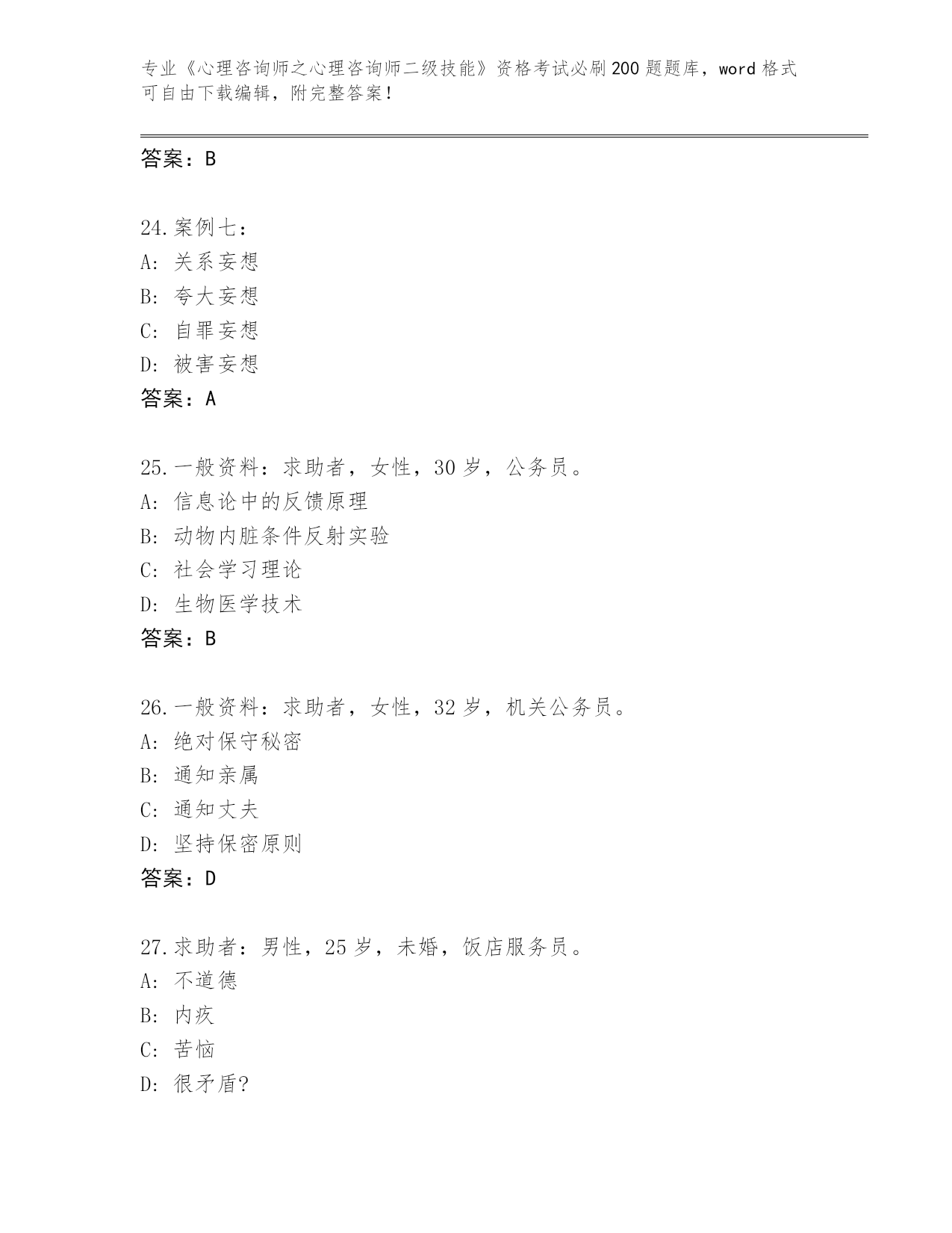 江苏省通州区2024年《心理咨询师之心理咨询师二级技能》资格考试必刷200题真题(名师系列)