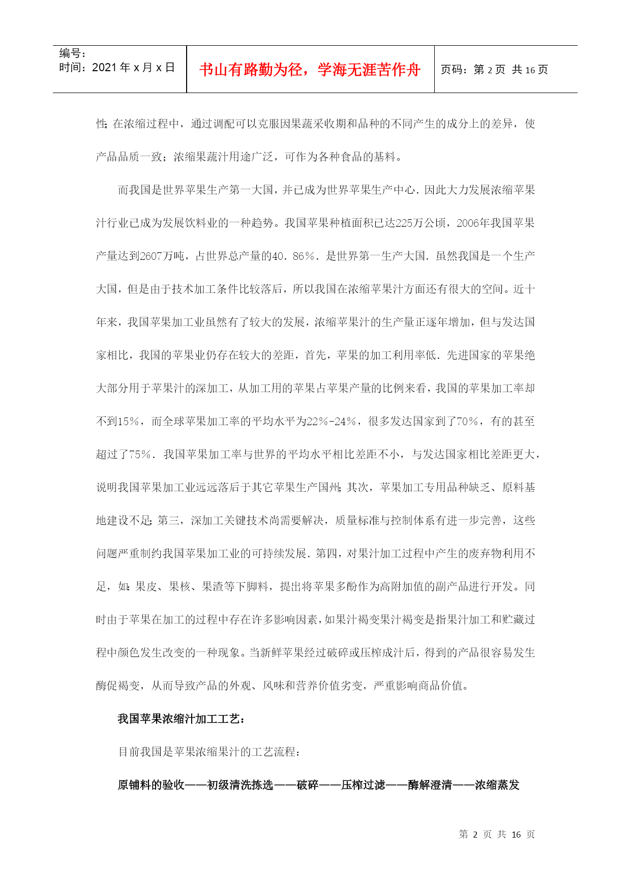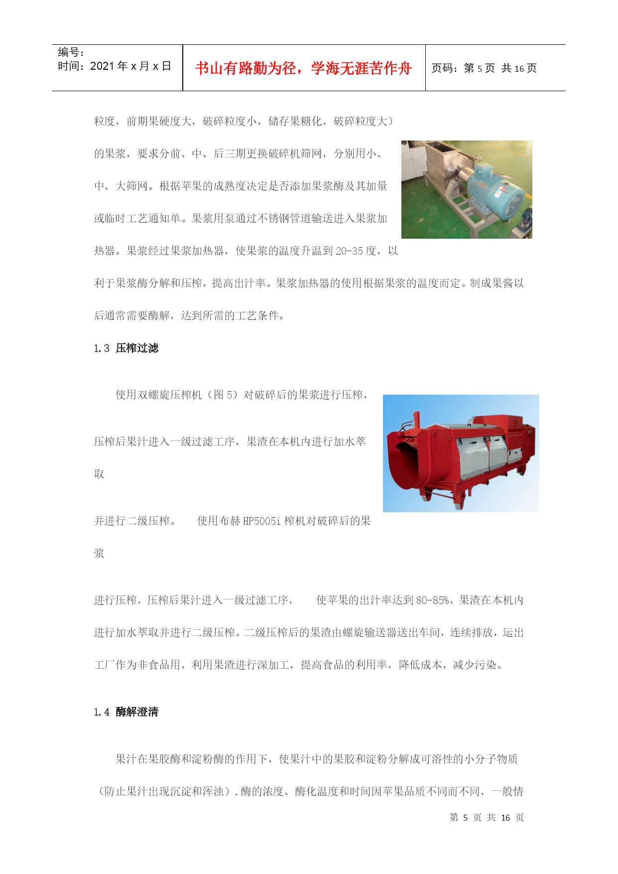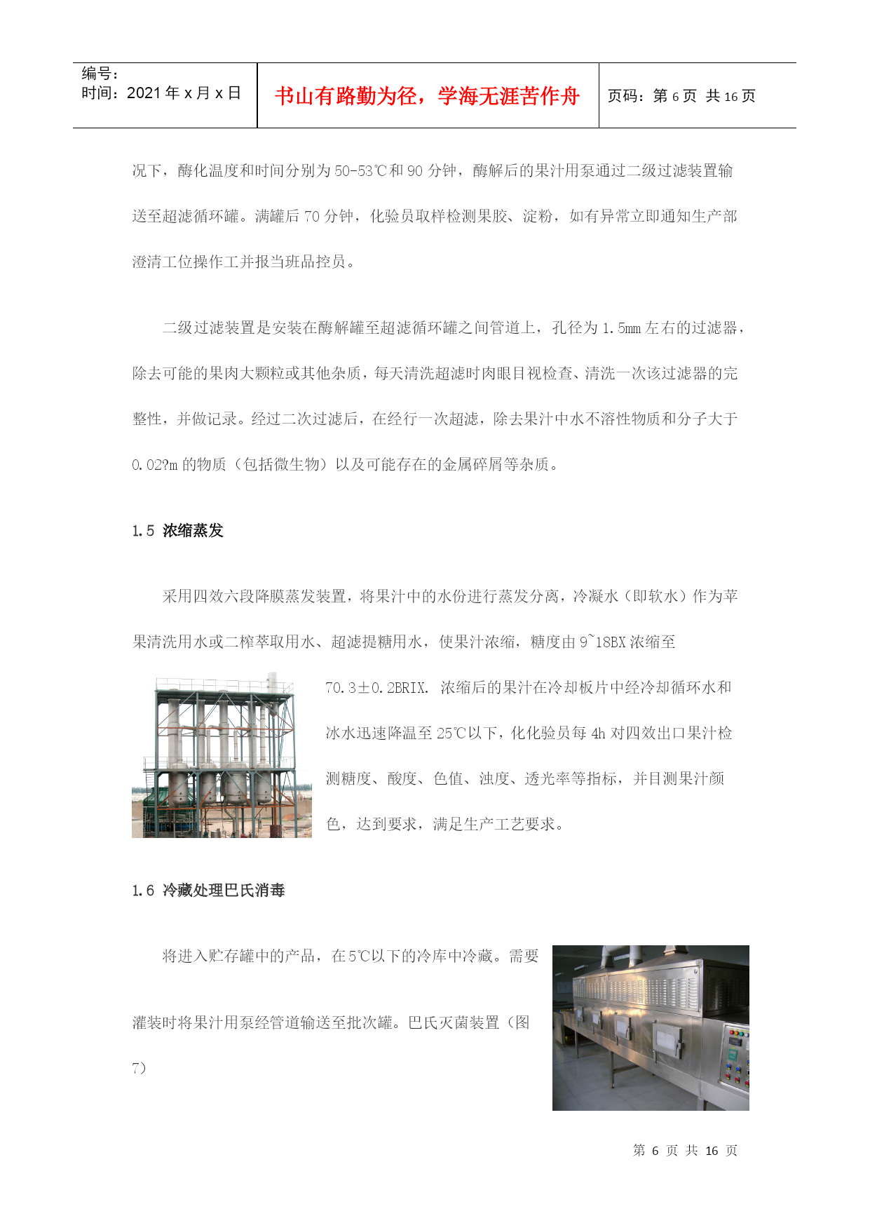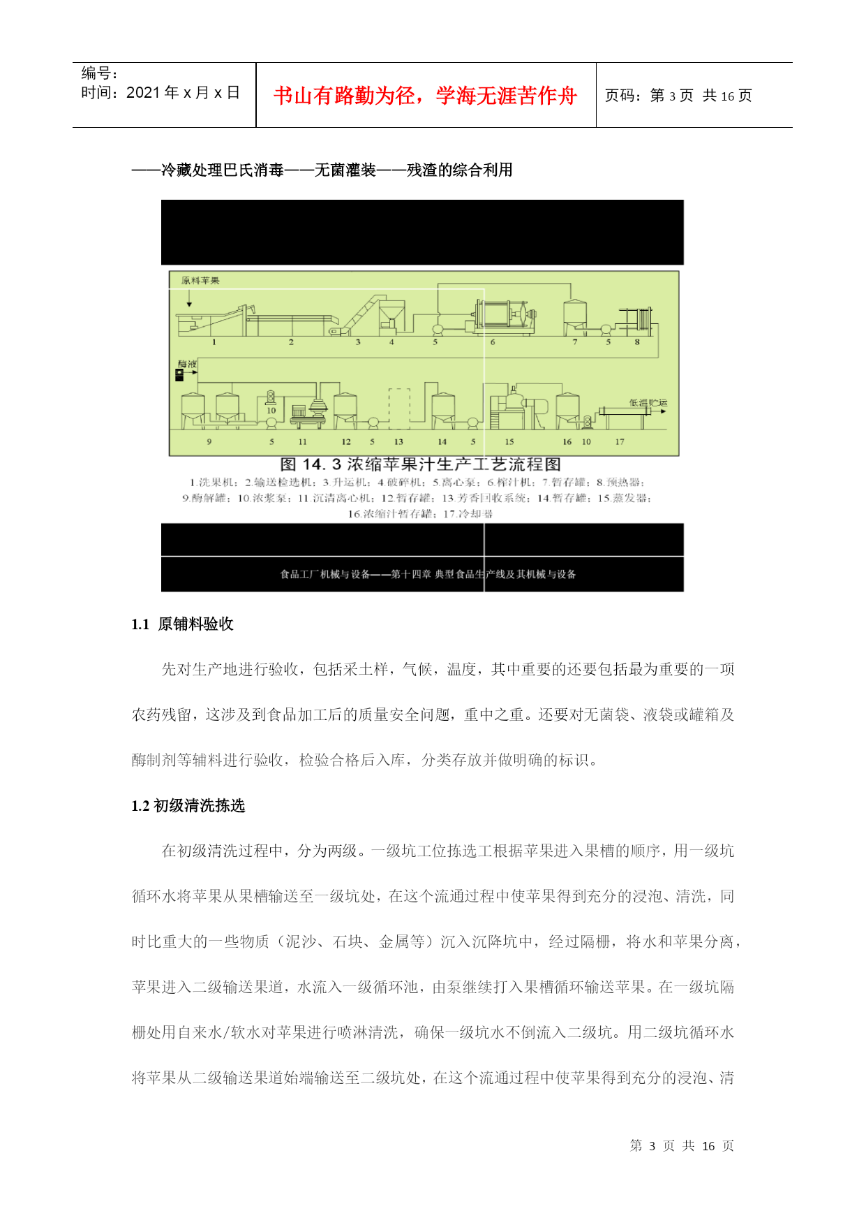 编号:时间:2021年x月x日书山有路勤为径,学海无涯苦作舟页码:第PAGE16页共NUMPAGES16页第PAGE\*MERGEFORMAT16页共NUMPAGES\*MERGEFORMAT16页浓缩苹果汁加工工艺及生产线设备摘要:近年来,我国水果产量大幅度增长,2007年总产量达5200万吨,人均占有量达40千克。加快发展苹果汁已势在必行。本文以浓缩苹果汁生产线为主,对浓缩苹果汁生产过程中的主要技术装备做概括介绍。并对改善果汁浓缩方法提出自己的一些看法。关键词:浓缩,苹果汁,反渗透,无菌灌装ConcentratedapplejuiceprocessingtechnologyandproductionlineequipmentAbstract:Inrencentyears,thefruitproductionofourcountryhasincreasedsharply,withannualproductionhavingreached52milliontonsandpercapitabeingupto40kg.Sotospeedupthedevelopmentofapplejuiceisimperative.。Thearticlemailyconcentrateapplejuiceproductionline,andintroducethemainequipment.Inaddition,Ialsothinkofsomesuggestionstoimprovethemethodofconcentratingapplejuice.Keywords:concentrated,applesjuice,reverseosmosis,asepticfilling水果加工业是附加值很高的产业,从初级产品到深加工产品,增值潜力高达几十倍甚至几百倍。有关资料显示,我国水果业的深加工和市场开发每年都能带来几十亿元的收入。近年来,我国水果产量增长很快,但由于加工技术和产业化滞后,每年约有30%的水果因缺乏贮藏及加工手段而腐烂。而浓缩果汁则能在一定程度上有效的克服这一缺陷。它是将果蔬汁或果蔬原浆经浓缩脱水或干燥而制成的汁液,容量小,可溶性固形物可高达65%~70%,可节省包装和运输费用,便于贮运;果蔬汁的品质更加一致;浓缩后糖、酸含量均有所提高,增加了产品的保藏性;在浓缩过程中,通过调配可以克服因果蔬采收期和品种的不同产生的成分上的差异,使产品品质一致;浓缩果蔬汁用途广泛,可作为各种食品的基料。而我国是世界苹果生产第一大国,并已成为世界苹果生产中心.因此大力发展浓缩苹果汁行业已成为发展饮料业的一种趋势。我国苹果种植面积已达225万公顷,2006年我国苹果产量达到2607万吨,占世界总产量的40.86%.是世界第一生产大国.虽然我国是一个生产大国,但是由于技术加工条件比较落后,所以我国在浓缩苹果汁方面还有很大的空间。近十年来,我国苹果加工业虽然有了较大的发展,浓缩苹果汁的生产量正逐年增加,但与发达国家相比,我国的苹果业仍存在较大的差距,首先,苹果的加工利用率低.先进国家的苹果绝大部分用于苹果汁的深加工,从加工用的苹果占苹果产量的比例来看,我国的苹果加工率却不到15%,而全球苹果加工率的平均水平为22%-24%,很多发达国家到了70%,有的甚至超过了75%.我国苹果加工率与世界的平均水平相比差距不小,与发达国家相比差距更大,说明我国苹果加工业远远落后于其它苹果生产国州;其次,苹果加工专用品种缺乏、原料基地建设不足;第三,深加工关键技术尚需要解决,质量标准与控制体系有进一步完善,这些问题严重制约我国苹果加工业的可持续发展.第四,对果汁加工过程中产生的废弃物利用不足,如:果皮、果核、果渣等下脚料,提出将苹果多酚作为高附加值的副产品进行开发。同时由于苹果在加工的过程中存在许多影响因素,如果汁褐变果汁褐变是指果汁加工和贮藏过程中颜色发生改变的一种现象。当新鲜苹果经过破碎或压榨成汁后,得到的产品很容易发生酶促褐变,从而导致产品的外观、风味和营养价值劣变,严重影响商品价值。我国苹果浓缩汁加工工艺:目前我国是苹果浓缩果汁的工艺流程:原铺料的验收——初级清洗拣选——破碎——压榨过滤——酶解澄清——浓缩蒸发——冷藏处理巴氏消毒——无菌灌装——残渣的综合利用1.1原铺料验收先对生产地进行验收,包括采土样,气候,温度,其中重要的还要包括最为重要的一项农药残留,这涉及到食品加工后的质量安全问题,重中之重。还要对无菌袋、液袋或罐箱及酶制剂等辅料进行验收,检验合格后入库,分类存放并做明确的标识。1.2初级清洗拣选在初级清洗过程中,分为两级。一级坑工位拣选工根据苹果进入果槽的顺序,用一级坑循环水将苹果从果槽输送