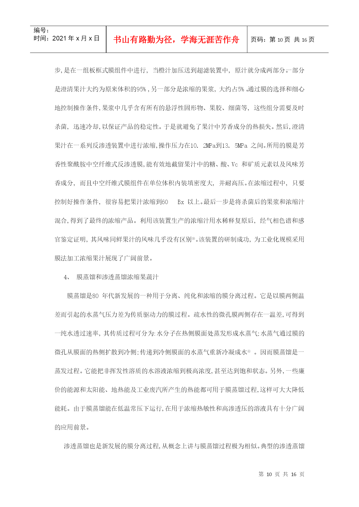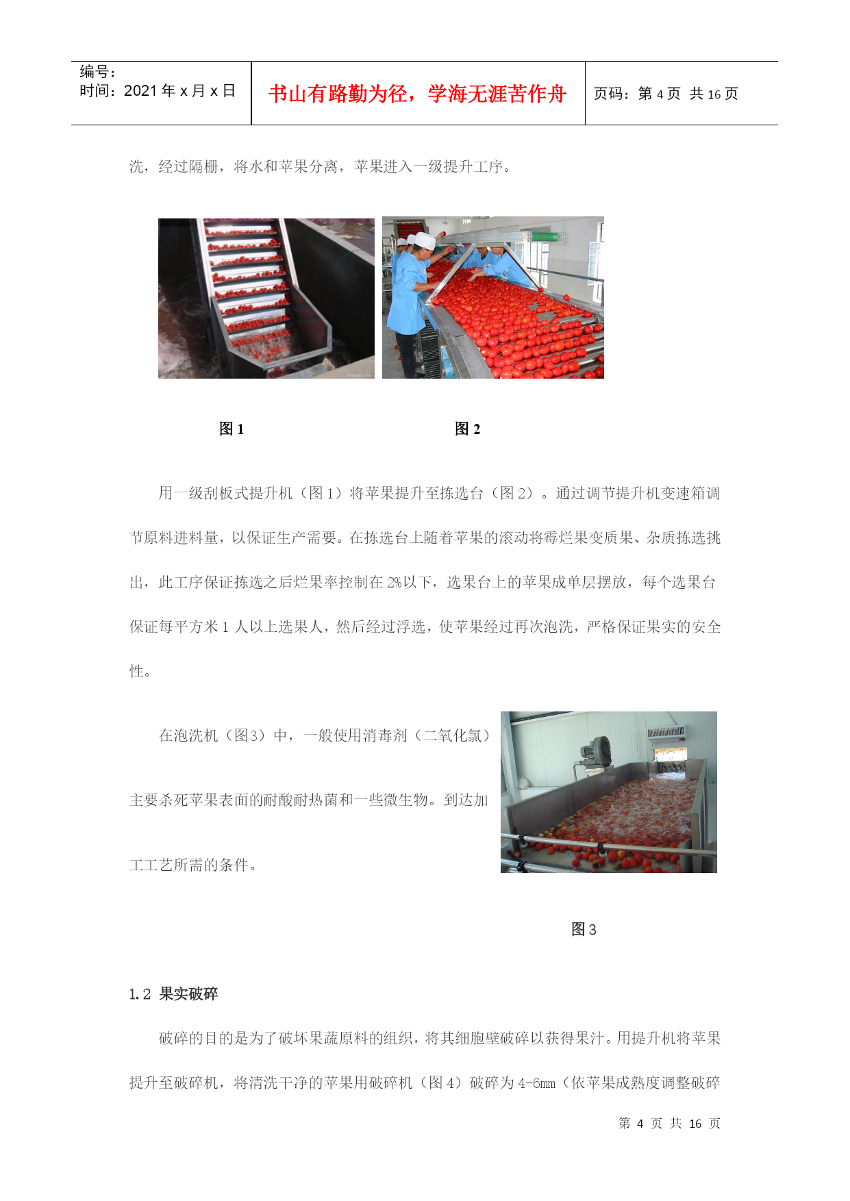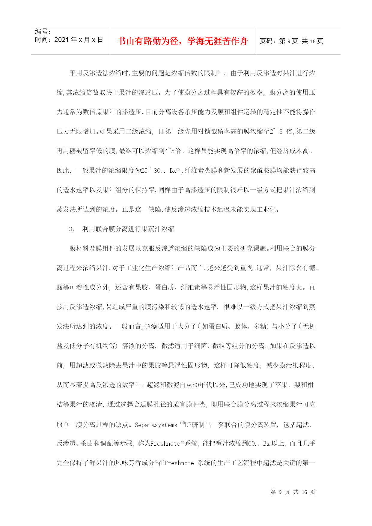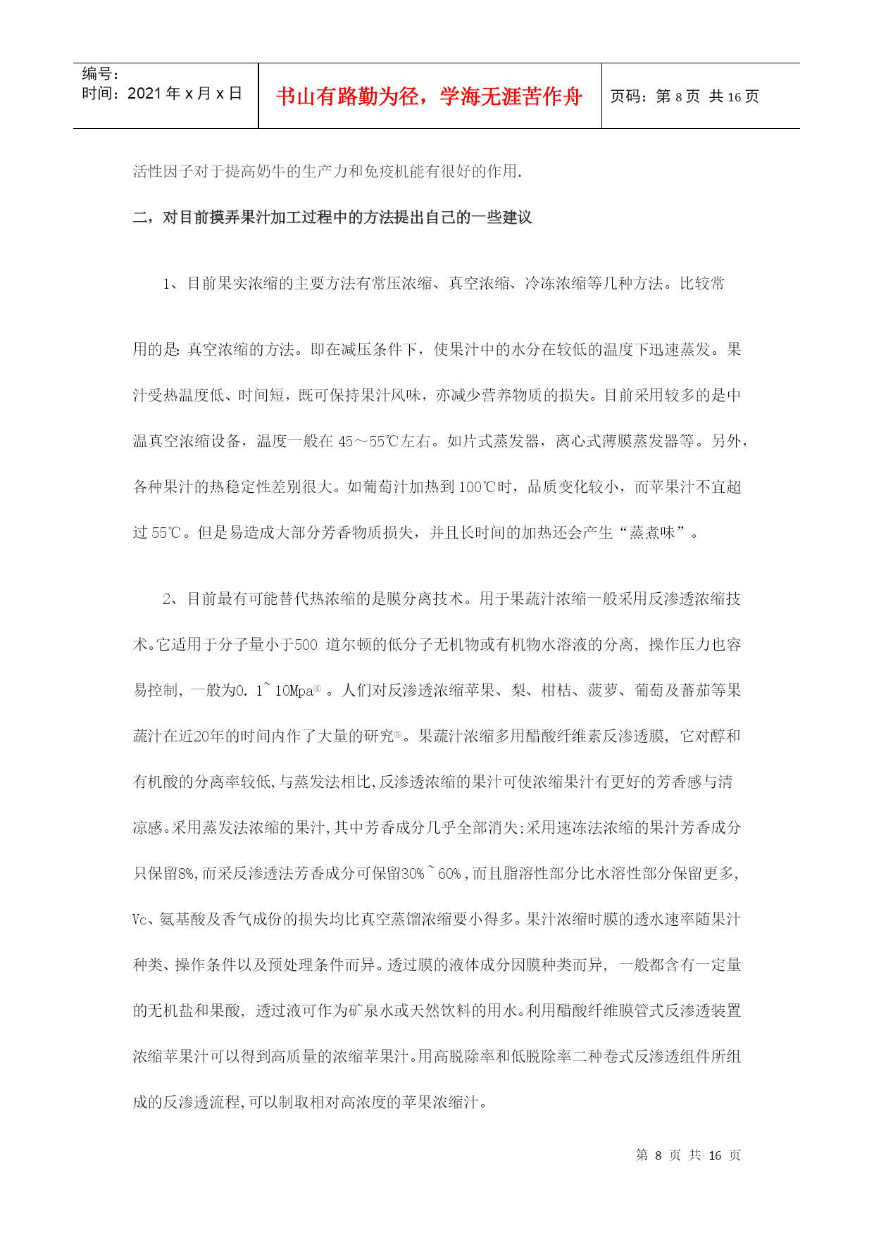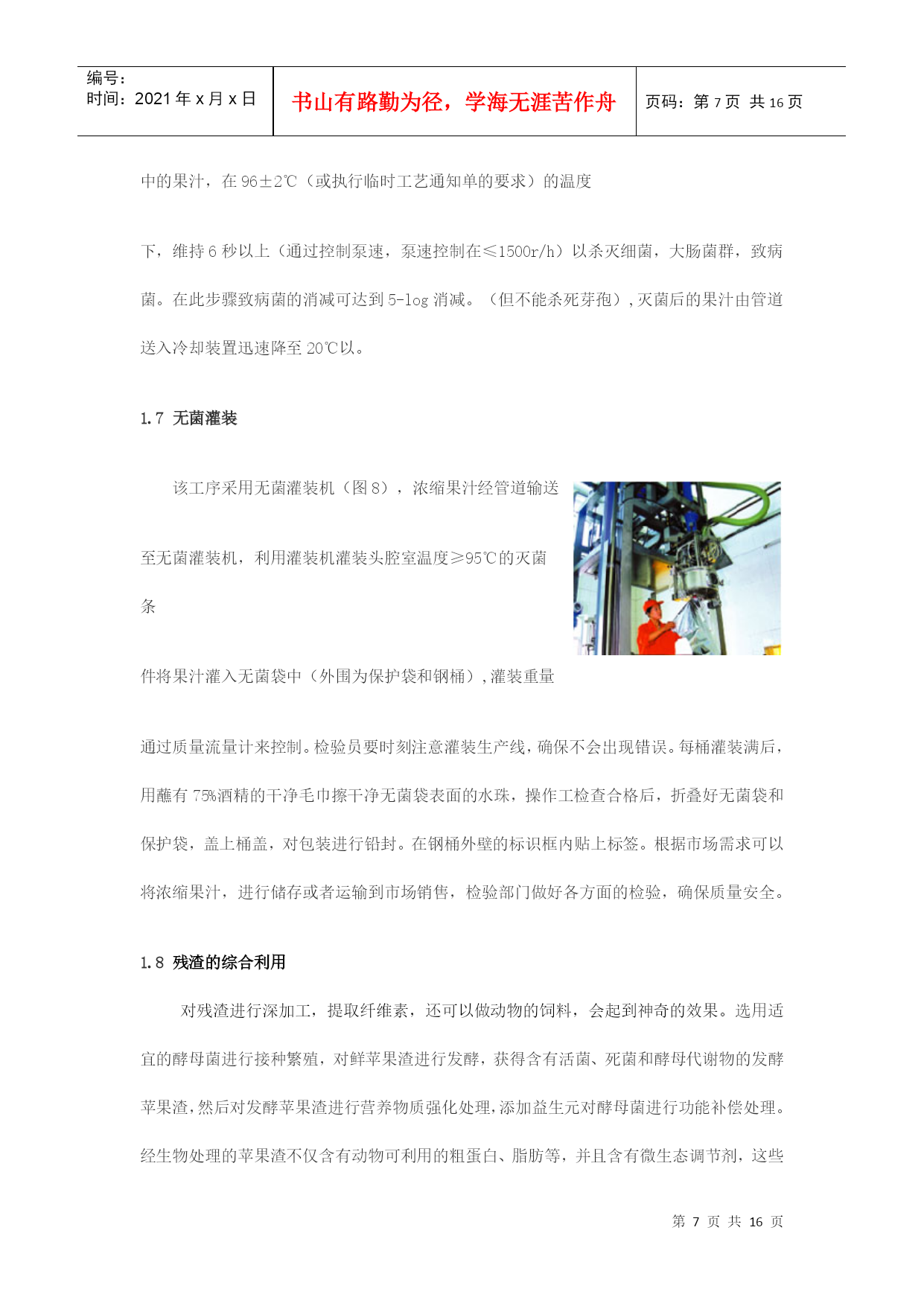 编号:时间:2021年x月x日书山有路勤为径,学海无涯苦作舟页码:第PAGE16页共NUMPAGES16页第PAGE\*MERGEFORMAT16页共NUMPAGES\*MERGEFORMAT16页浓缩苹果汁加工工艺及生产线设备摘要:近年来,我国水果产量大幅度增长,2007年总产量达5200万吨,人均占有量达40千克。加快发展苹果汁已势在必行。本文以浓缩苹果汁生产线为主,对浓缩苹果汁生产过程中的主要技术装备做概括介绍。并对改善果汁浓缩方法提出自己的一些看法。关键词:浓缩,苹果汁,反渗透,无菌灌装ConcentratedapplejuiceprocessingtechnologyandproductionlineequipmentAbstract:Inrencentyears,thefruitproductionofourcountryhasincreasedsharply,withannualproductionhavingreached52milliontonsandpercapitabeingupto40kg.Sotospeedupthedevelopmentofapplejuiceisimperative.。Thearticlemailyconcentrateapplejuiceproductionline,andintroducethemainequipment.Inaddition,Ialsothinkofsomesuggestionstoimprovethemethodofconcentratingapplejuice.Keywords:concentrated,applesjuice,reverseosmosis,asepticfilling水果加工业是附加值很高的产业,从初级产品到深加工产品,增值潜力高达几十倍甚至几百倍。有关资料显示,我国水果业的深加工和市场开发每年都能带来几十亿元的收入。近年来,我国水果产量增长很快,但由于加工技术和产业化滞后,每年约有30%的水果因缺乏贮藏及加工手段而腐烂。而浓缩果汁则能在一定程度上有效的克服这一缺陷。它是将果蔬汁或果蔬原浆经浓缩脱水或干燥而制成的汁液,容量小,可溶性固形物可高达65%~70%,可节省包装和运输费用,便于贮运;果蔬汁的品质更加一致;浓缩后糖、酸含量均有所提高,增加了产品的保藏性;在浓缩过程中,通过调配可以克服因果蔬采收期和品种的不同产生的成分上的差异,使产品品质一致;浓缩果蔬汁用途广泛,可作为各种食品的基料。而我国是世界苹果生产第一大国,并已成为世界苹果生产中心.因此大力发展浓缩苹果汁行业已成为发展饮料业的一种趋势。我国苹果种植面积已达225万公顷,2006年我国苹果产量达到2607万吨,占世界总产量的40.86%.是世界第一生产大国.虽然我国是一个生产大国,但是由于技术加工条件比较落后,所以我国在浓缩苹果汁方面还有很大的空间。近十年来,我国苹果加工业虽然有了较大的发展,浓缩苹果汁的生产量正逐年增加,但与发达国家相比,我国的苹果业仍存在较大的差距,首先,苹果的加工利用率低.先进国家的苹果绝大部分用于苹果汁的深加工,从加工用的苹果占苹果产量的比例来看,我国的苹果加工率却不到15%,而全球苹果加工率的平均水平为22%-24%,很多发达国家到了70%,有的甚至超过了75%.我国苹果加工率与世界的平均水平相比差距不小,与发达国家相比差距更大,说明我国苹果加工业远远落后于其它苹果生产国州;其次,苹果加工专用品种缺乏、原料基地建设不足;第三,深加工关键技术尚需要解决,质量标准与控制体系有进一步完善,这些问题严重制约我国苹果加工业的可持续发展.第四,对果汁加工过程中产生的废弃物利用不足,如:果皮、果核、果渣等下脚料,提出将苹果多酚作为高附加值的副产品进行开发。同时由于苹果在加工的过程中存在许多影响因素,如果汁褐变果汁褐变是指果汁加工和贮藏过程中颜色发生改变的一种现象。当新鲜苹果经过破碎或压榨成汁后,得到的产品很容易发生酶促褐变,从而导致产品的外观、风味和营养价值劣变,严重影响商品价值。我国苹果浓缩汁加工工艺:目前我国是苹果浓缩果汁的工艺流程:原铺料的验收——初级清洗拣选——破碎——压榨过滤——酶解澄清——浓缩蒸发——冷藏处理巴氏消毒——无菌灌装——残渣的综合利用1.1原铺料验收先对生产地进行验收,包括采土样,气候,温度,其中重要的还要包括最为重要的一项农药残留,这涉及到食品加工后的质量安全问题,重中之重。还要对无菌袋、液袋或罐箱及酶制剂等辅料进行验收,检验合格后入库,分类存放并做明确的标识。1.2初级清洗拣选在初级清洗过程中,分为两级。一级坑工位拣选工根据苹果进入果槽的顺序,用一级坑循环水将苹果从果槽输送