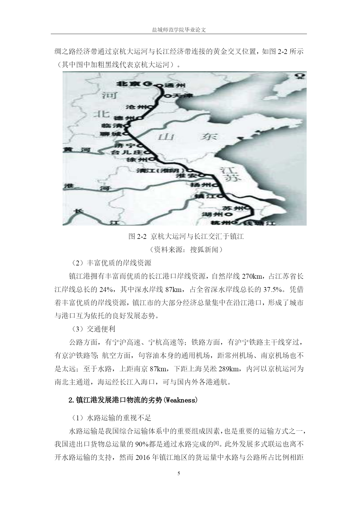 盐城师范学院毕业论文盐城师范学院毕业论文2016-2017学年度镇江港港口物流SWOT分析及对策研究学生姓名夏泳康学院商学院专业物流管理班级13(1)学号13318343指导教师霍伟伟2017年5月26日镇江港港口物流SWOT分析及对策研究摘要随着“十八大”以来,中央部署的长江经济带、“一带一路”等战略的大力推进以及互联网技术的迅速发展,沿江沿海港口的战略定定位就变得尤为重要。本文立足于镇江港,运用了SWOT分析法开展定性研究。研究首先对镇江港发展现状、自身优势、劣势进行了分析。研究发现镇江港在地理位置、港口岸线资源等方面享有内部优势,同时也具有政府扶持、航道条件改善等外部机遇。同时进一步得出镇江港应该采取开拓型战略,从而达到江海河联动,促进港产城融合。【关键词】镇江港;SWOT分析;港口物流theResearchonSWOTAnalysisandCountermeasureofZhenjiangPortLogisticsAbstractAlongwiththe"18thnationalcongress",thecentralgovernmenthasdeployedtheYangtzeeconomicbelt,the"OneBeltAndOneRoad"strategyandthedevelopmentofInternettechnologyisdeeprapid,thestrategicpositioningofthecoastalportsalongtheriverisparticularlyimportant.Thispaper,basedinzhenjiangport,USEStheSWOTanalysistoconductqualitativeresearch.Theresearchfirstlyanalyzesthedevelopmentstatus,advantagesanddisadvantagesofzhenjiangport.Studyfoundthatzhenjiangportinthegeographicalposition,enjoystheinternalportcoastlineresourcesadvantages,atthesametimealsohasthegovernmentsupport,suchaschannelconditiontoimprovetheexternalopportunities.Atthesametime,itisfurtherconcludedthatthezhenjiangportshouldadoptapioneeringstrategy,whichwillbringthejianghairivertogetherandpromotetheamalgamationoftheportcity.[Keywords]Zhenjiangport;SWOTanalysis;Portlogistics目录TOC\o"1-3"\h\z\uHYPERLINK\l"_Toc450382202"一、绪论1HYPERLINK\l"_Toc450382203"(一)研究背景、目的与意义PAGEREF_Toc450382203\h1HYPERLINK\l"_Toc450382206"(二)国内外研究综述PAGEREF_Toc450382206\h1HYPERLINK\l"_Toc450382212"二、镇江港港口物流发展概况及SWOT分析3HYPERLINK\l"_Toc450382213"(一)镇江港港口物流发展概况PAGEREF_Toc450382213\h3HYPERLINK\l"_Toc450382214"(二)镇江港港口物流的SWOT分析4HYPERLINK\l"_Toc450382219"三、镇江港港口物流发展战略8HYPERLINK\l"_Toc450382220"(一)战略定位8HYPERLINK\l"_Toc450382221"(二)战略制定8HYPERLINK\l"_Toc450382222"(三)战略实施9HYPERLINK\l"_Toc450382225"四、镇江港港口物流发展对策与建议11HYPERLINK\l"_Toc450382226"(一)依托地理位置优势,发展现代化港口物流11HYPERLINK\l"_Toc450382227"(二)合理利用丰富优质的岸线资源,产业结构重新布局11HYPERLINK\l"_Toc450382228"
